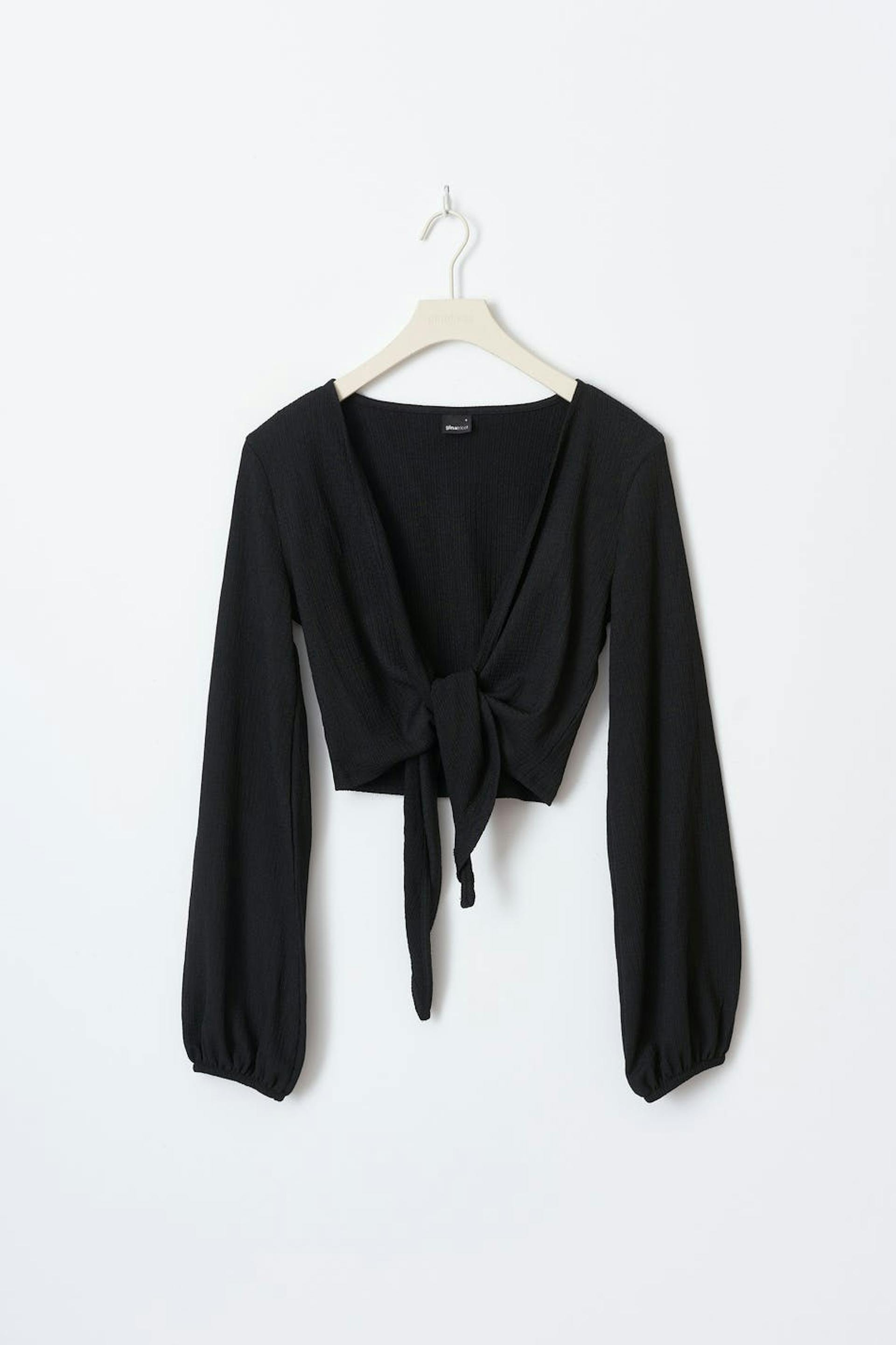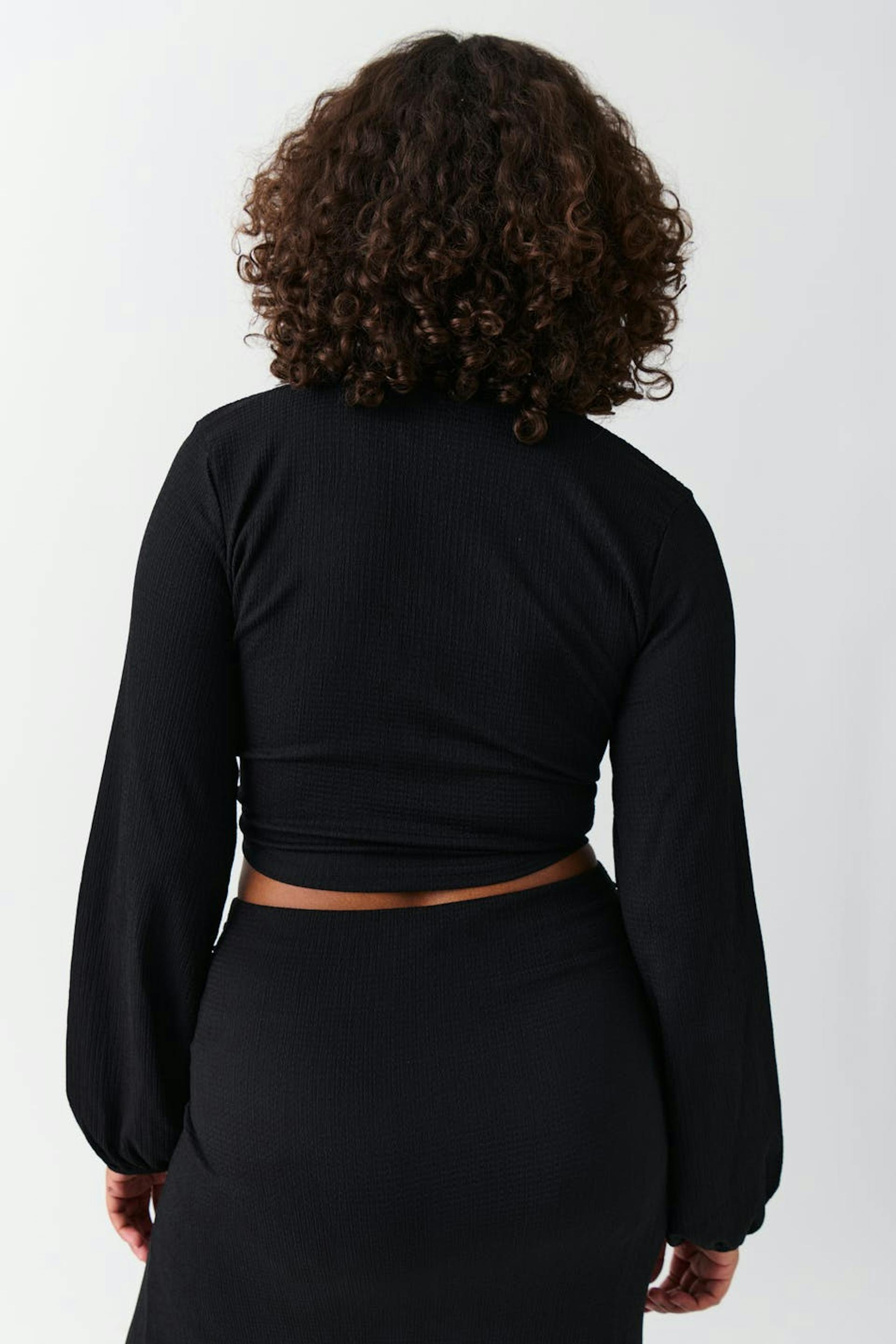 Long-sleeved top with self-tie at the front. The top is black and cropped and has regular fit. It has plunge neckline, structured material and elasticized cuffs.