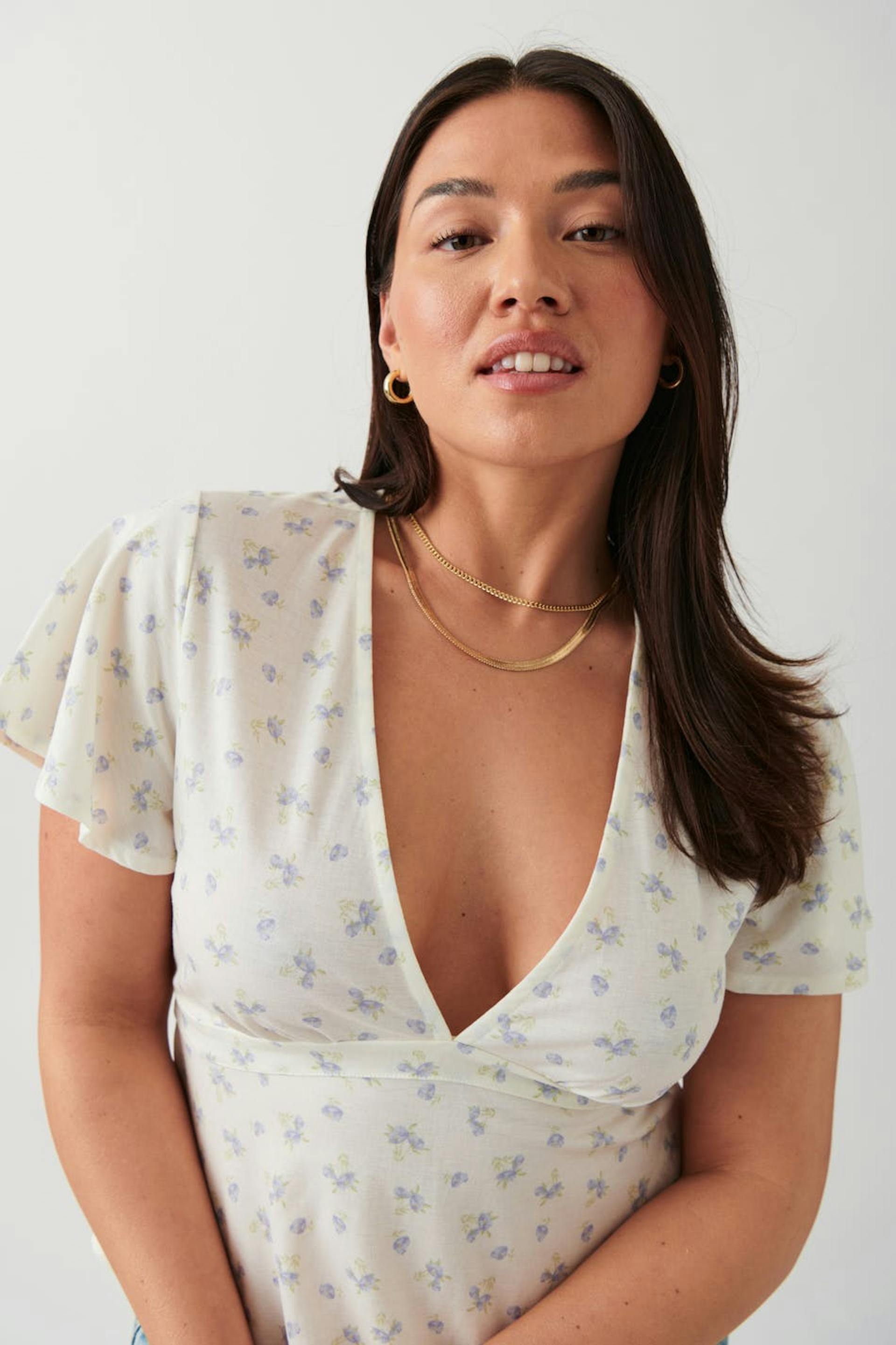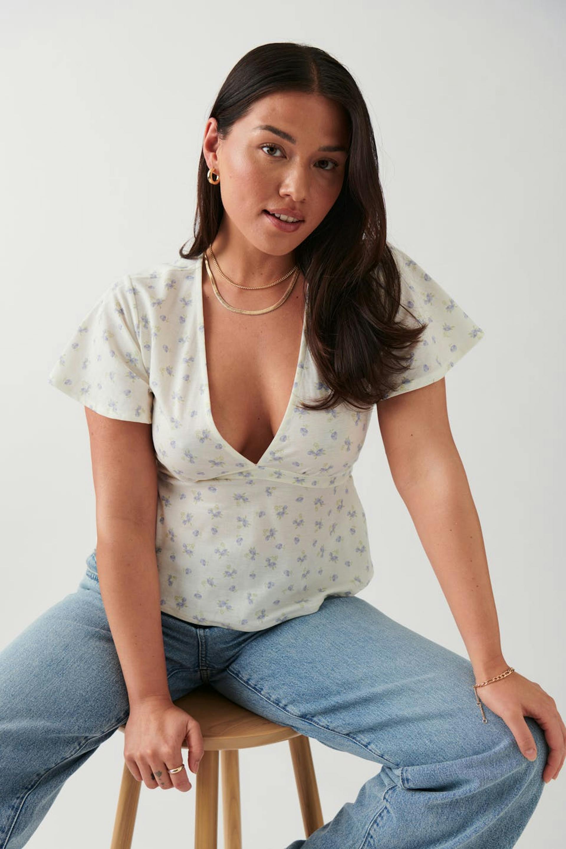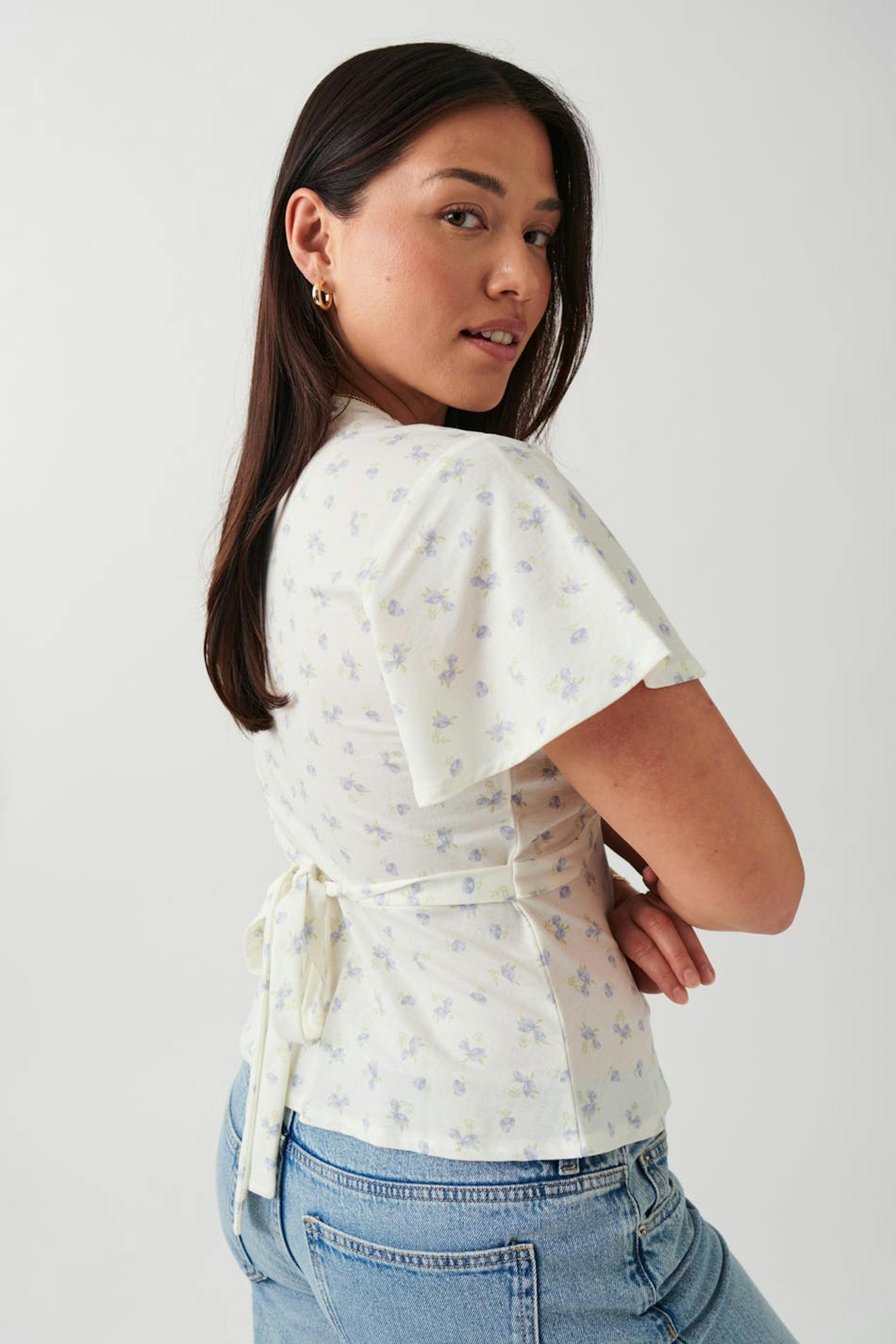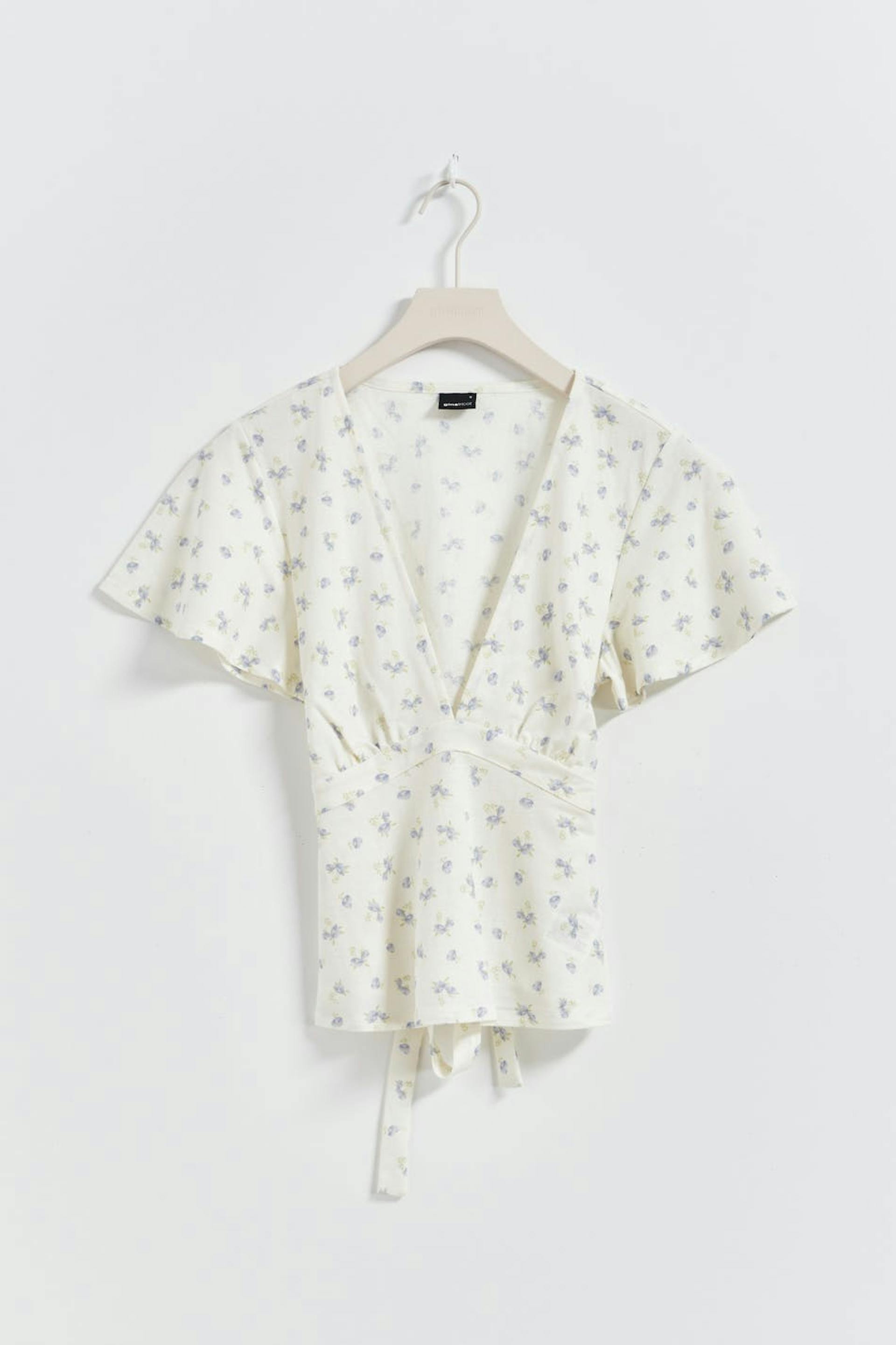 Floral tie top in jersey with short butterfly sleeve. The top is blue and has deep v-neck. It has regular fit, tie detail at the waist and cropped length.