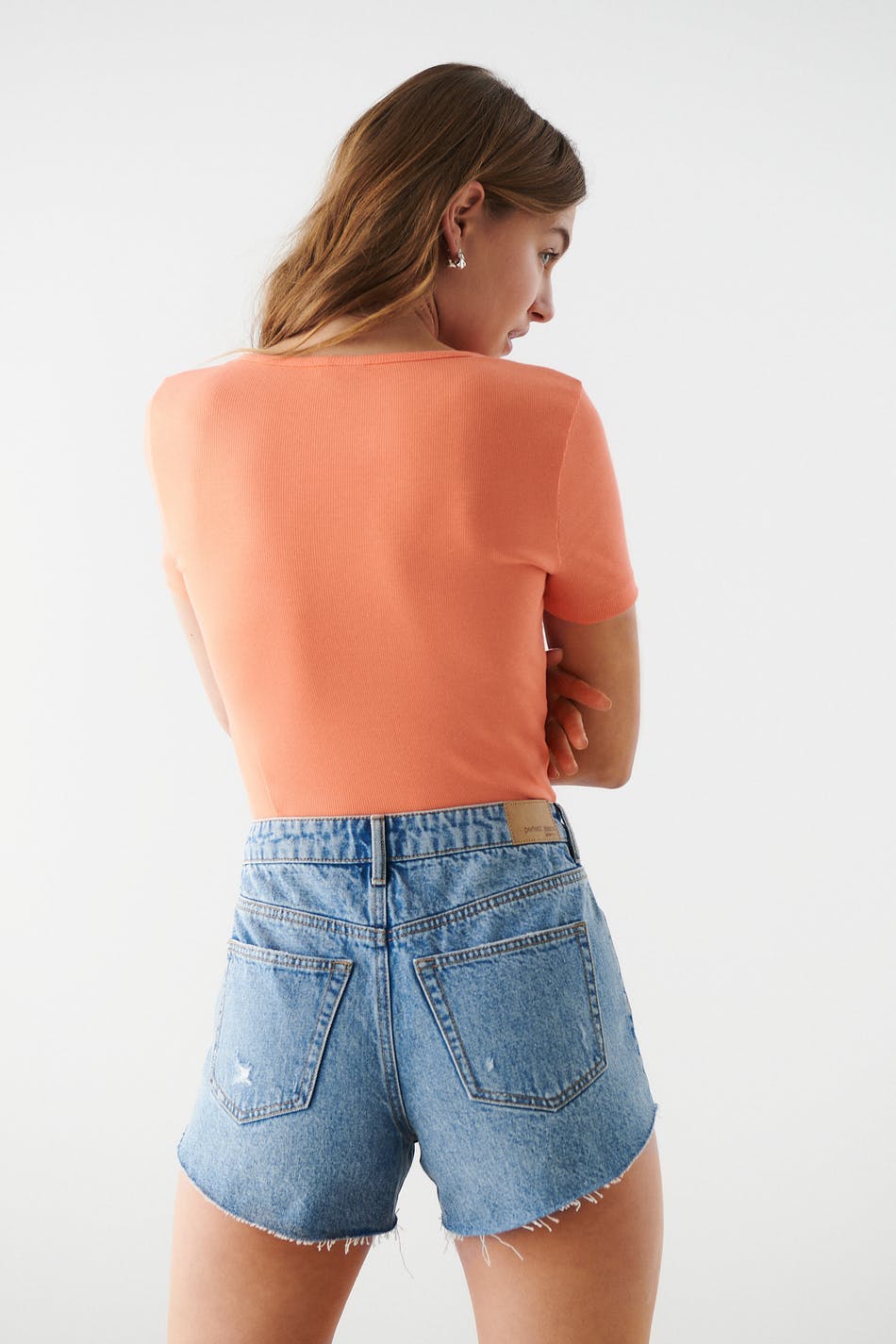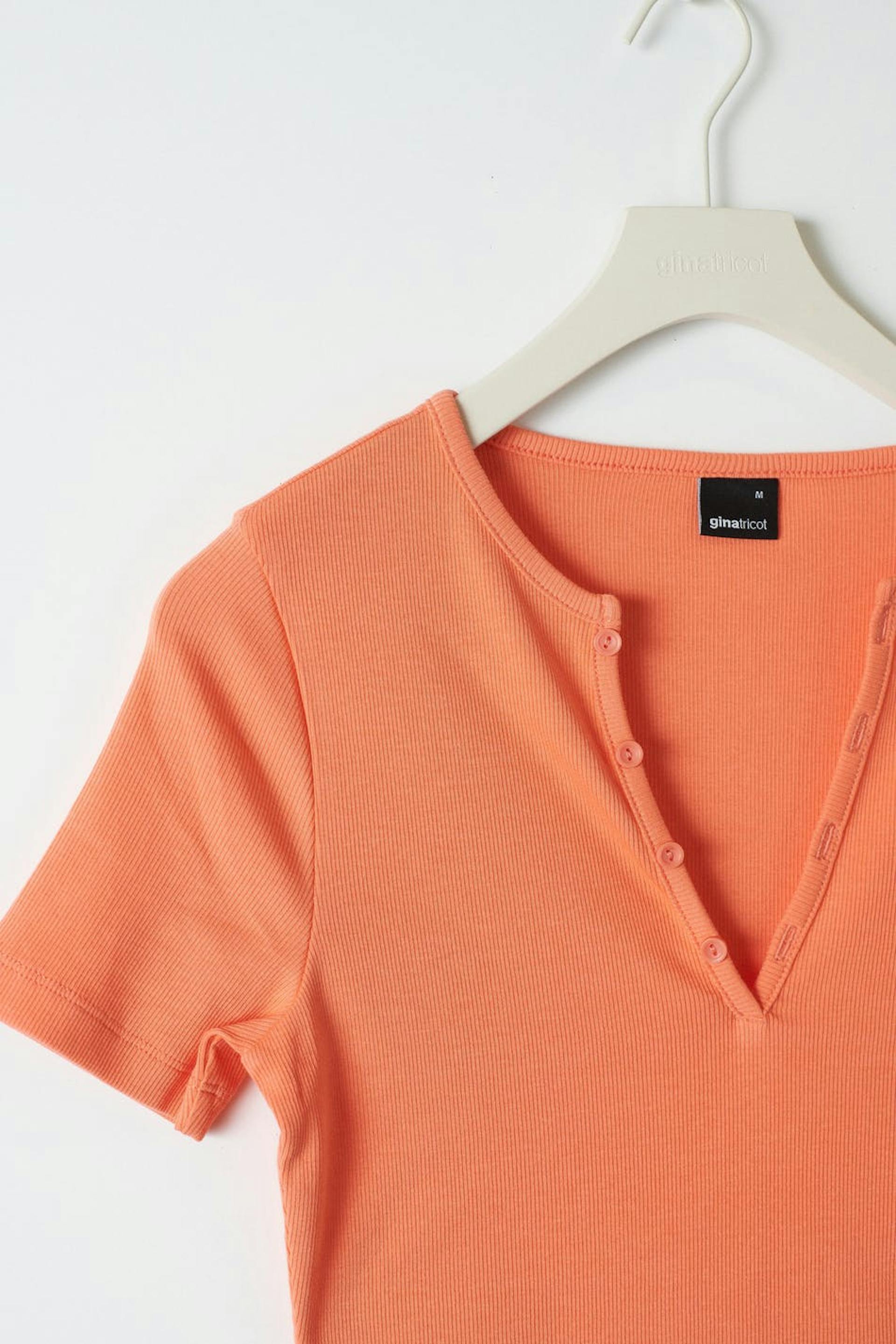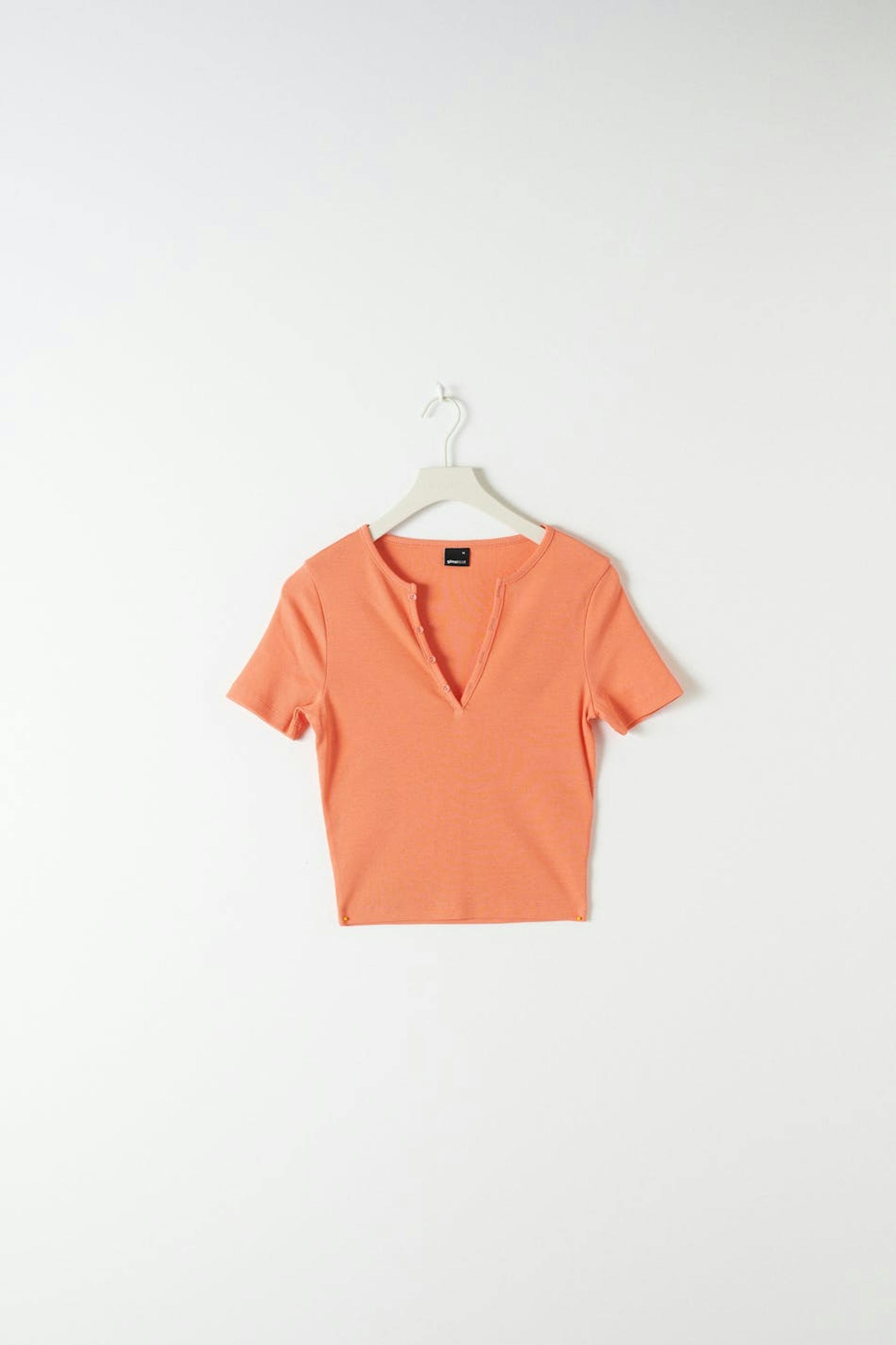 Short-sleeved top in jersey with fitted fit. The top is orange, ribbed and cropped. It has v-neck with buttons.