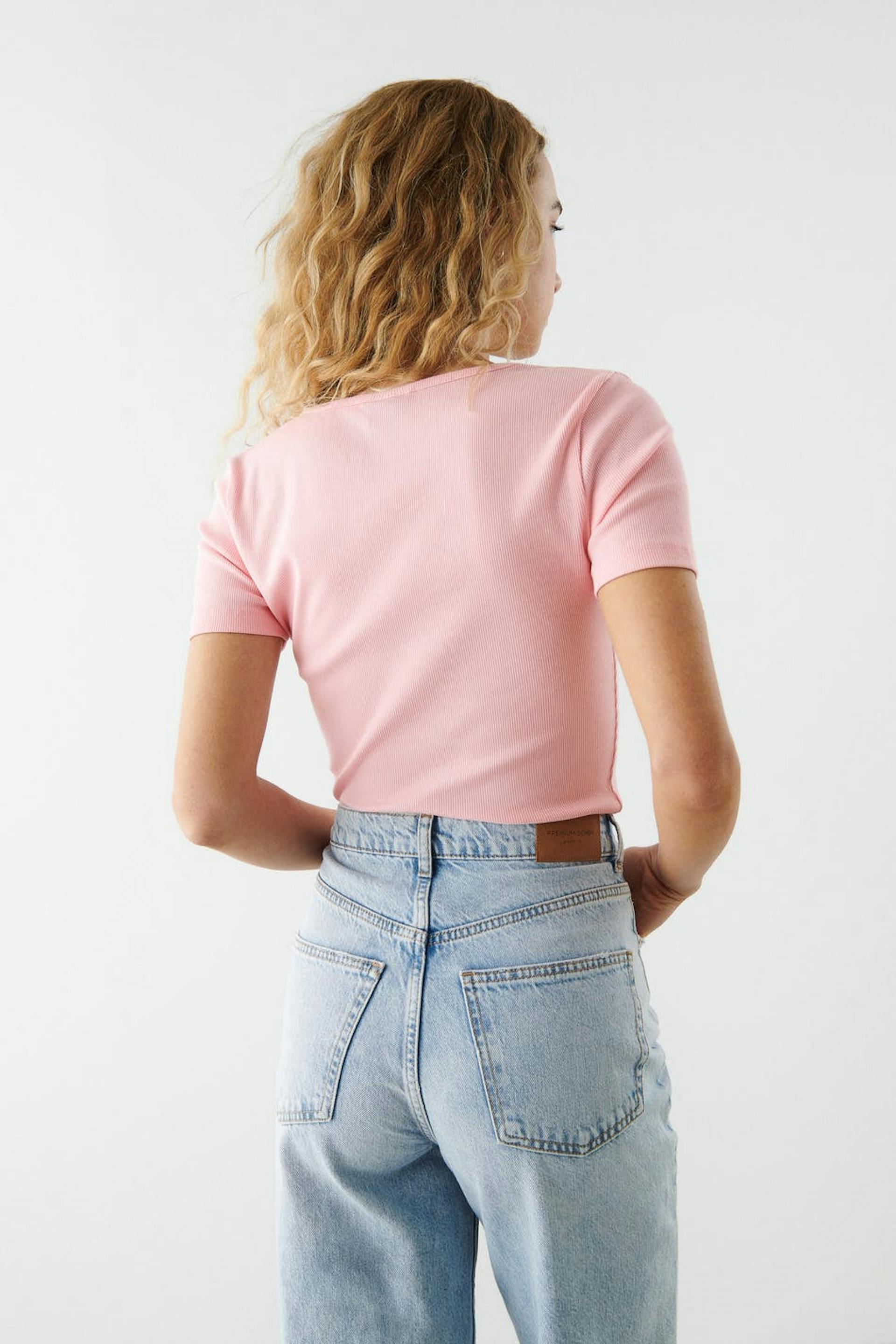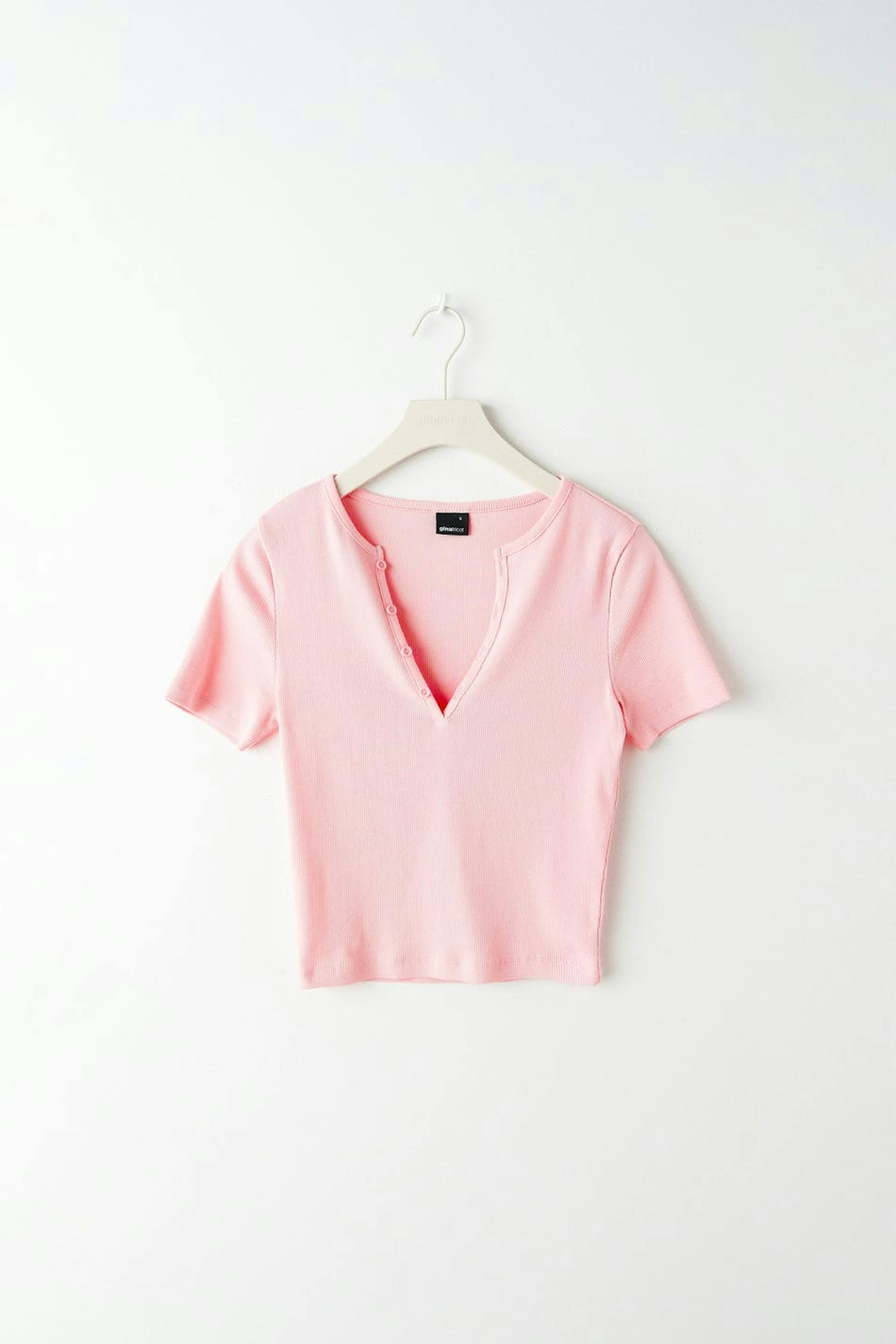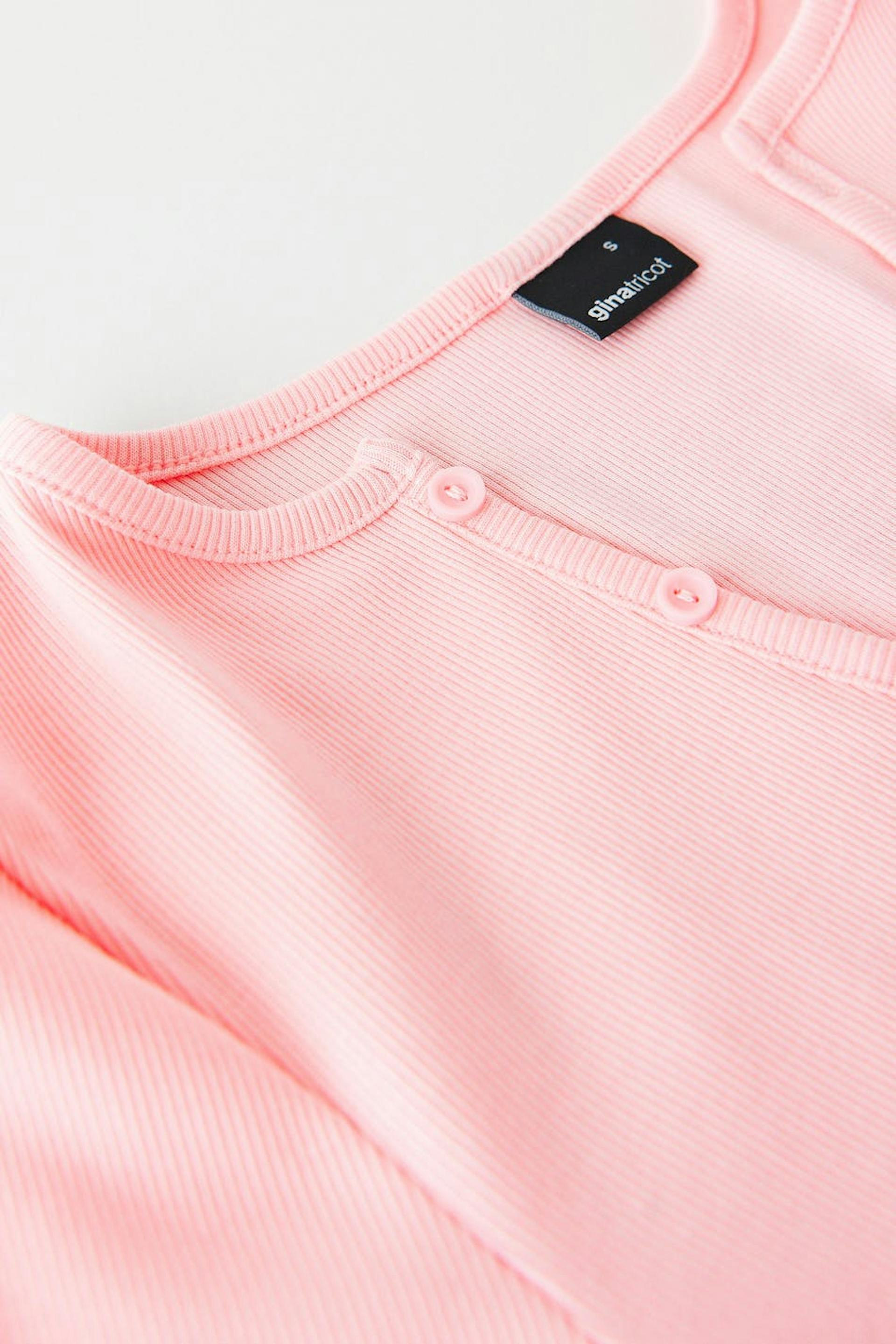 Short-sleeved top in jersey with fitted fit. The top is pink, ribbed and cropped. It has v-neck with buttons.