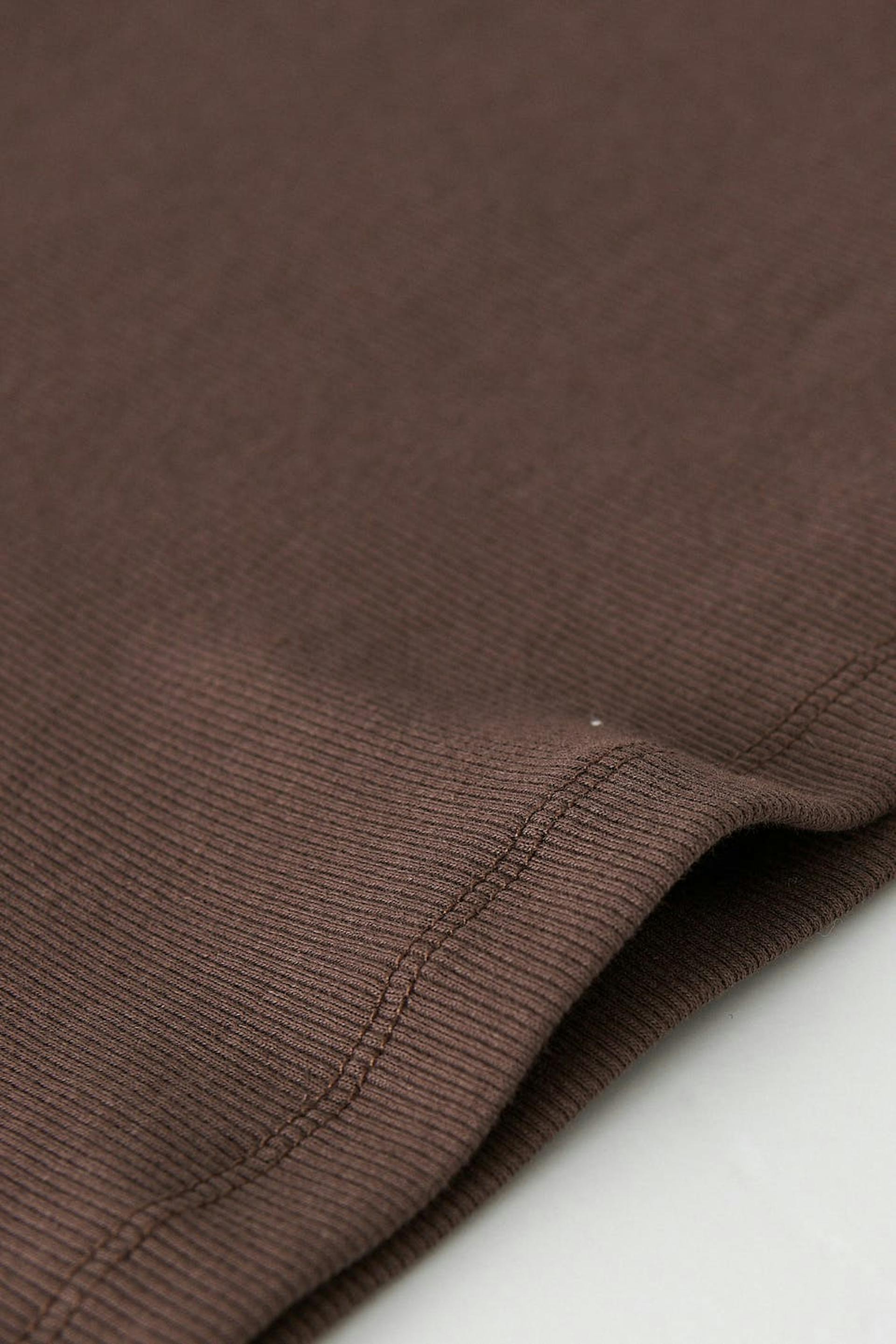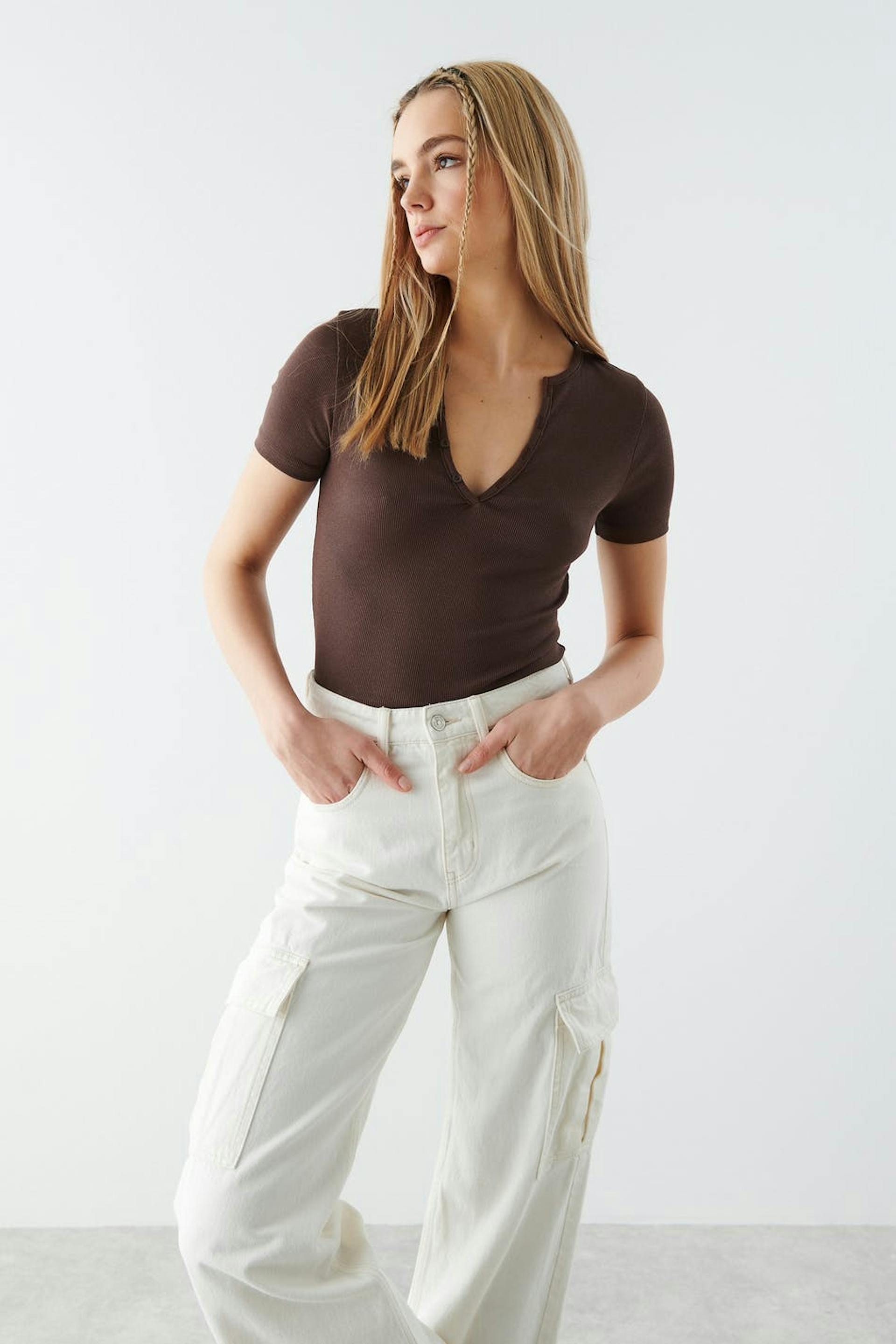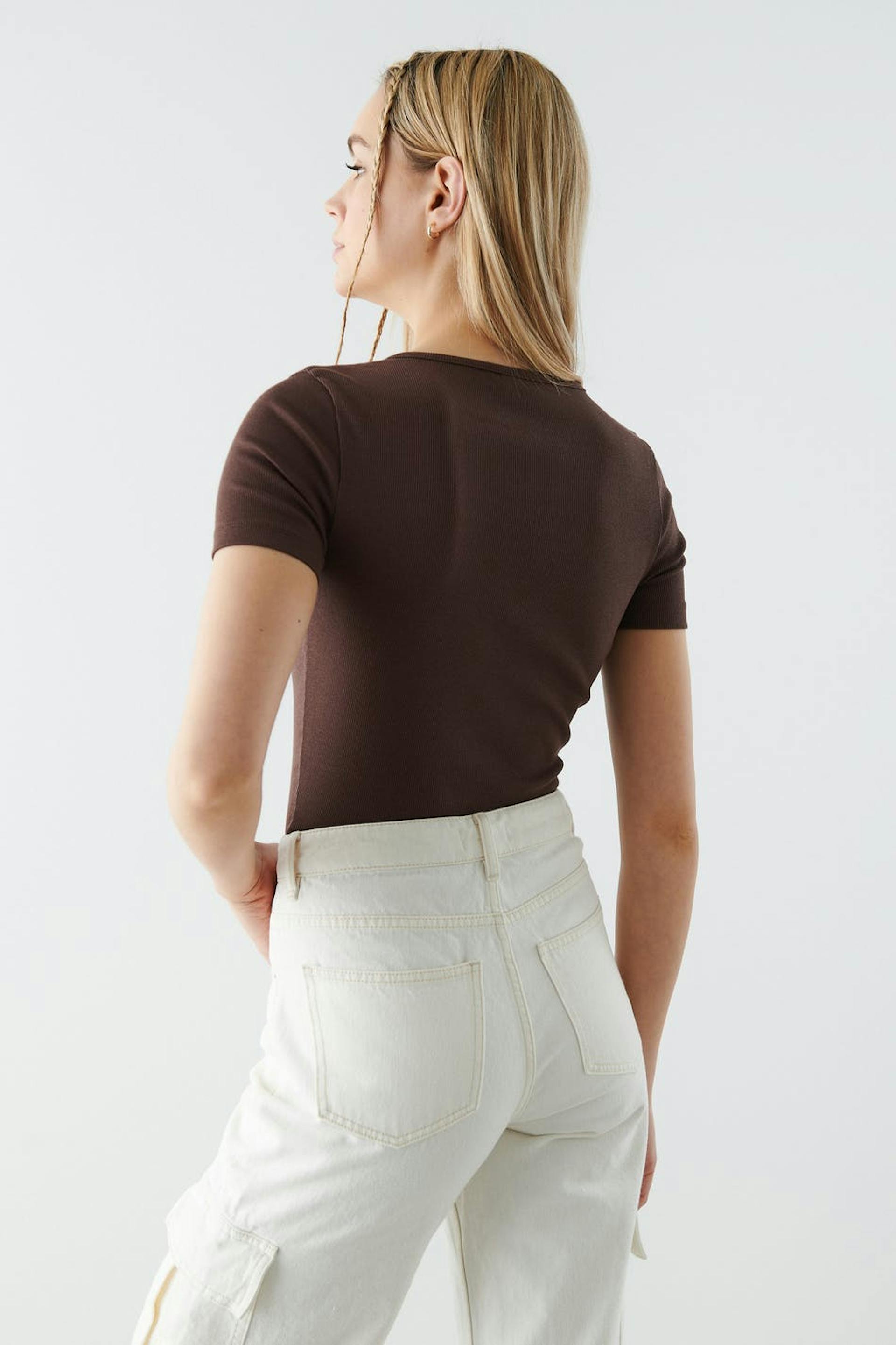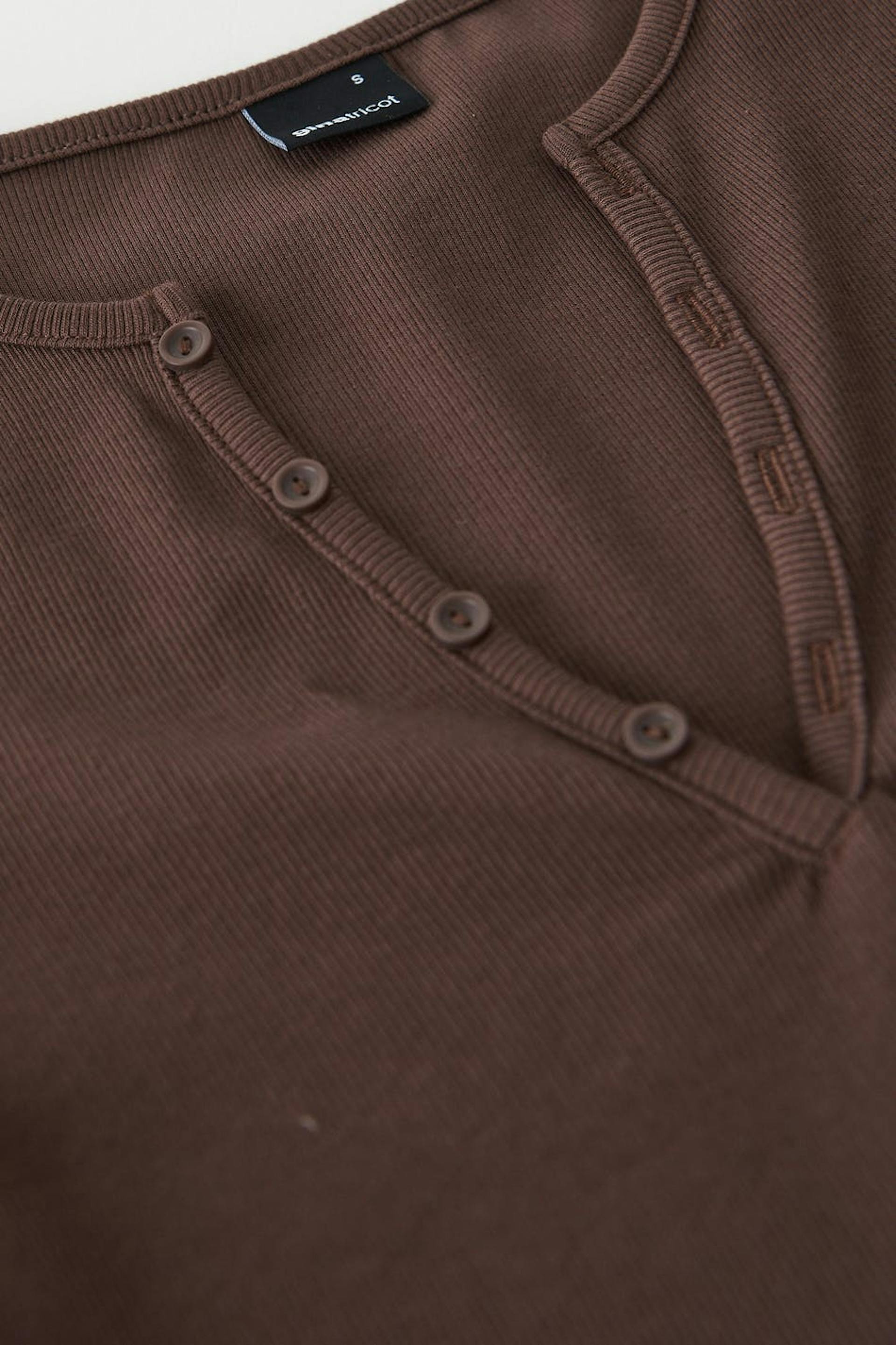 Short-sleeved top in jersey with fitted fit. The top is brown, ribbed and cropped. It has v-neck with buttons.