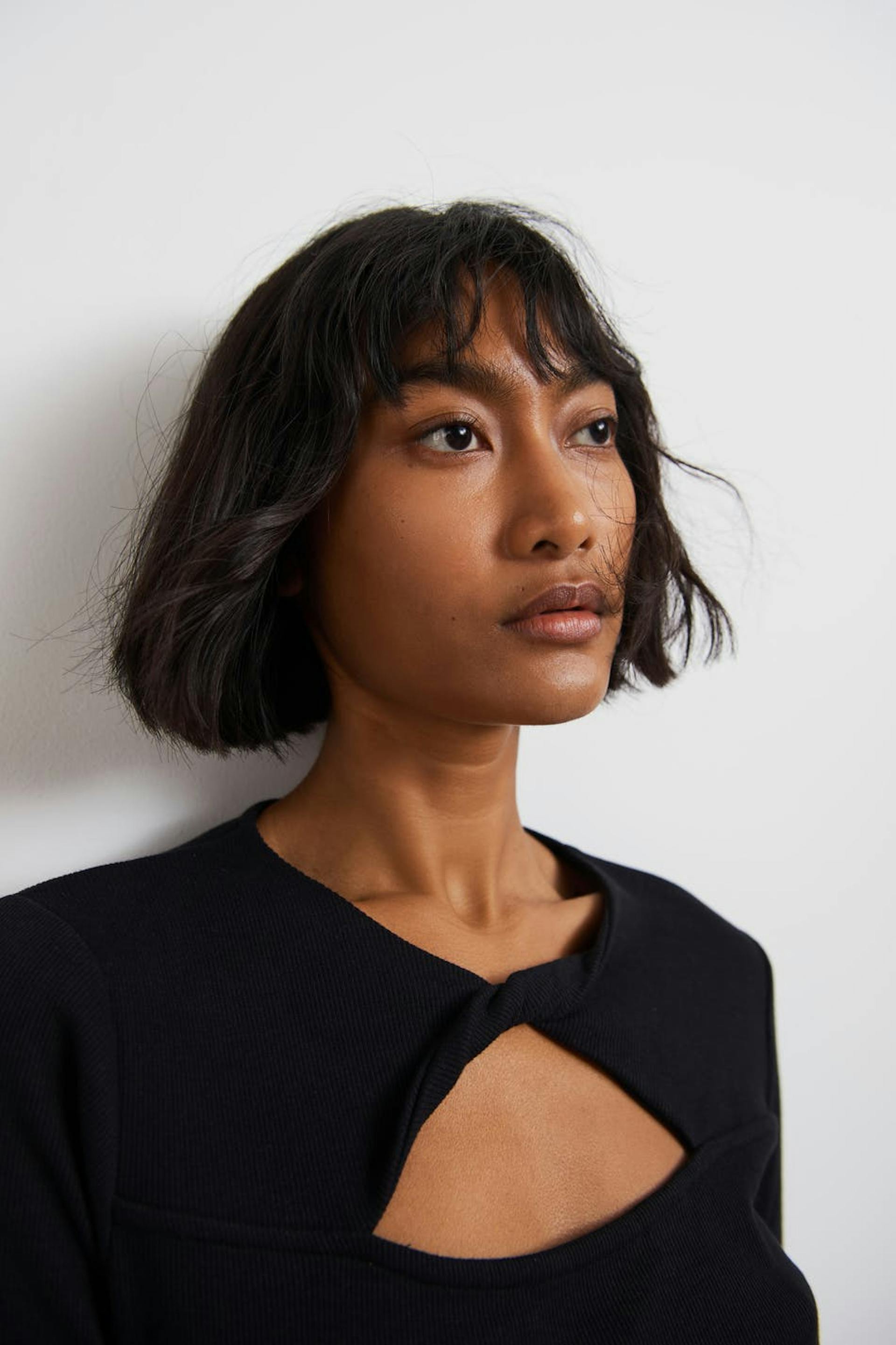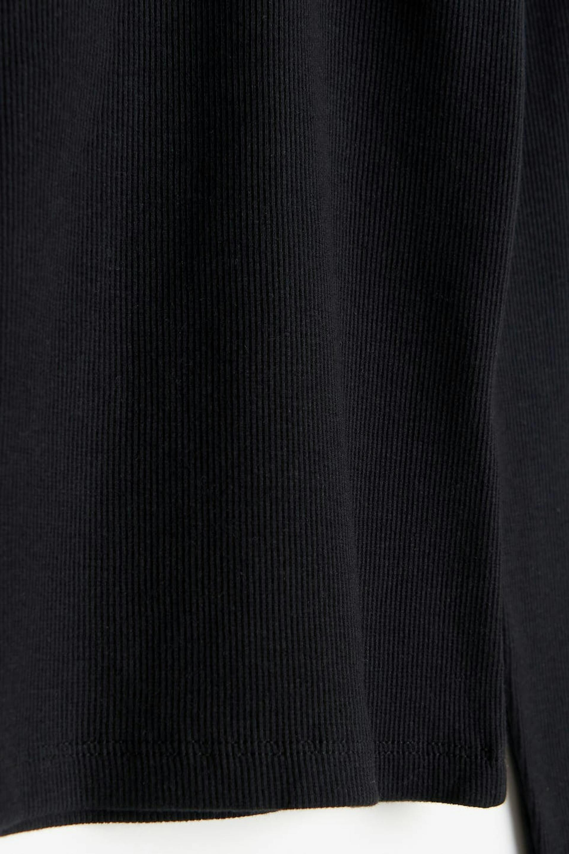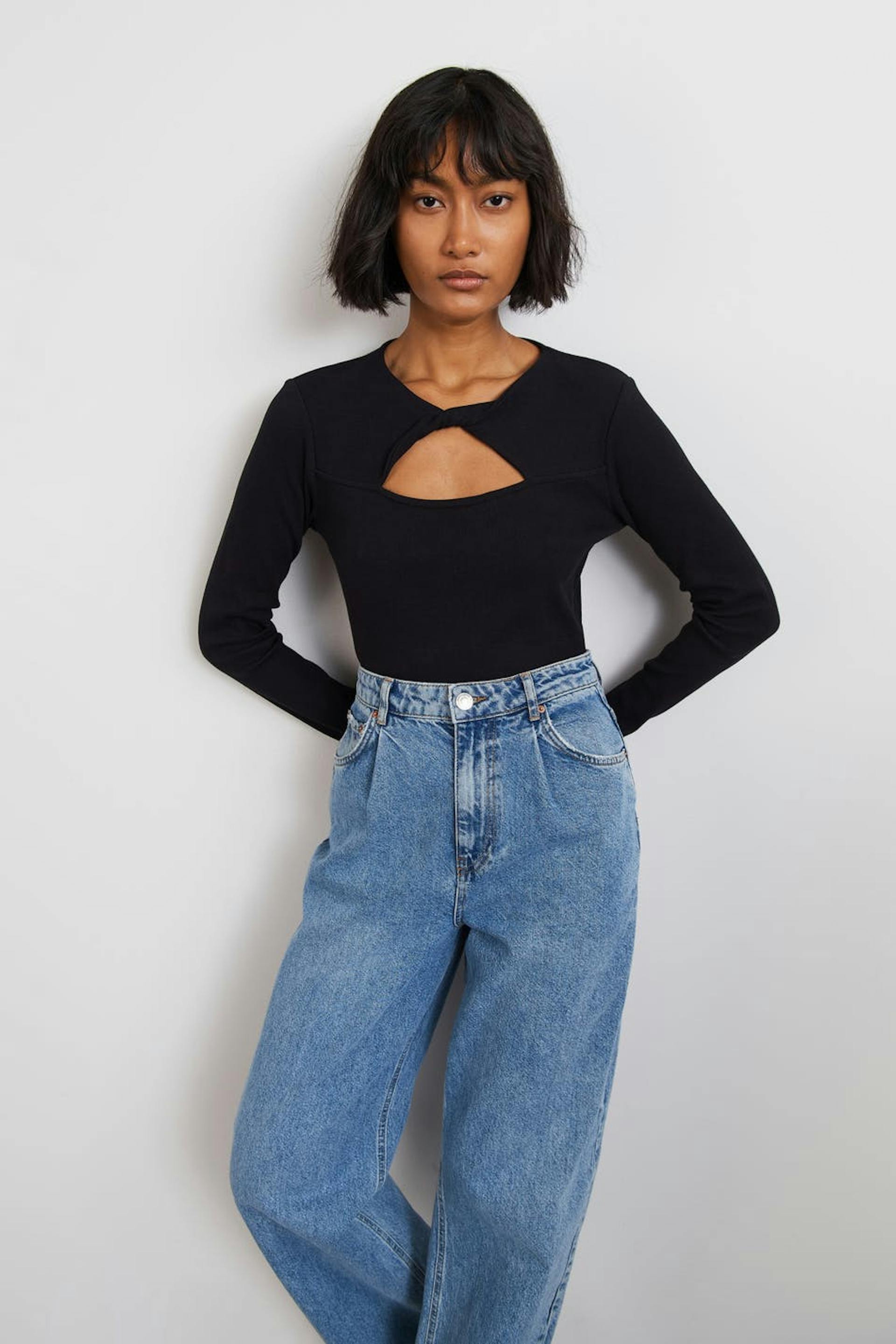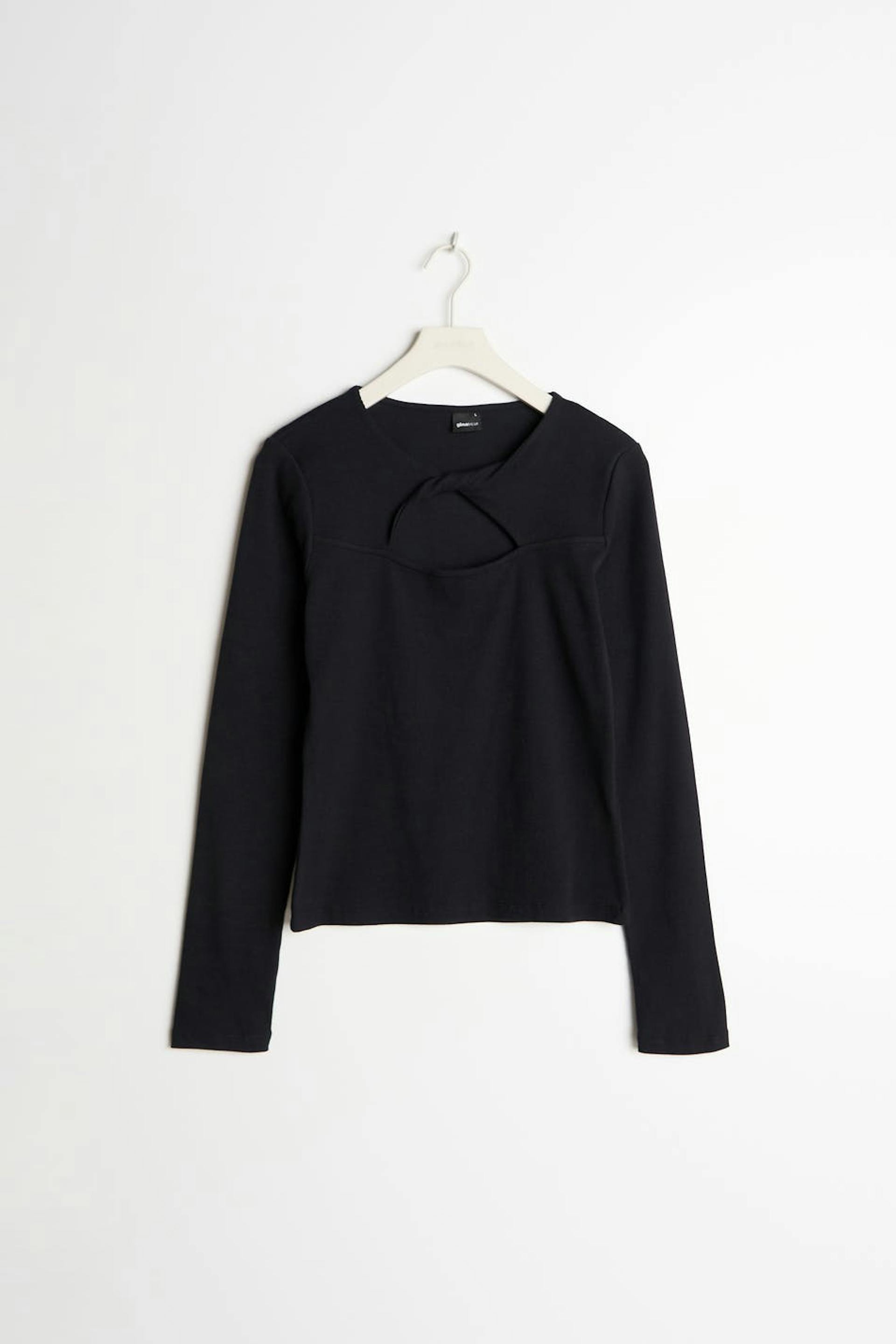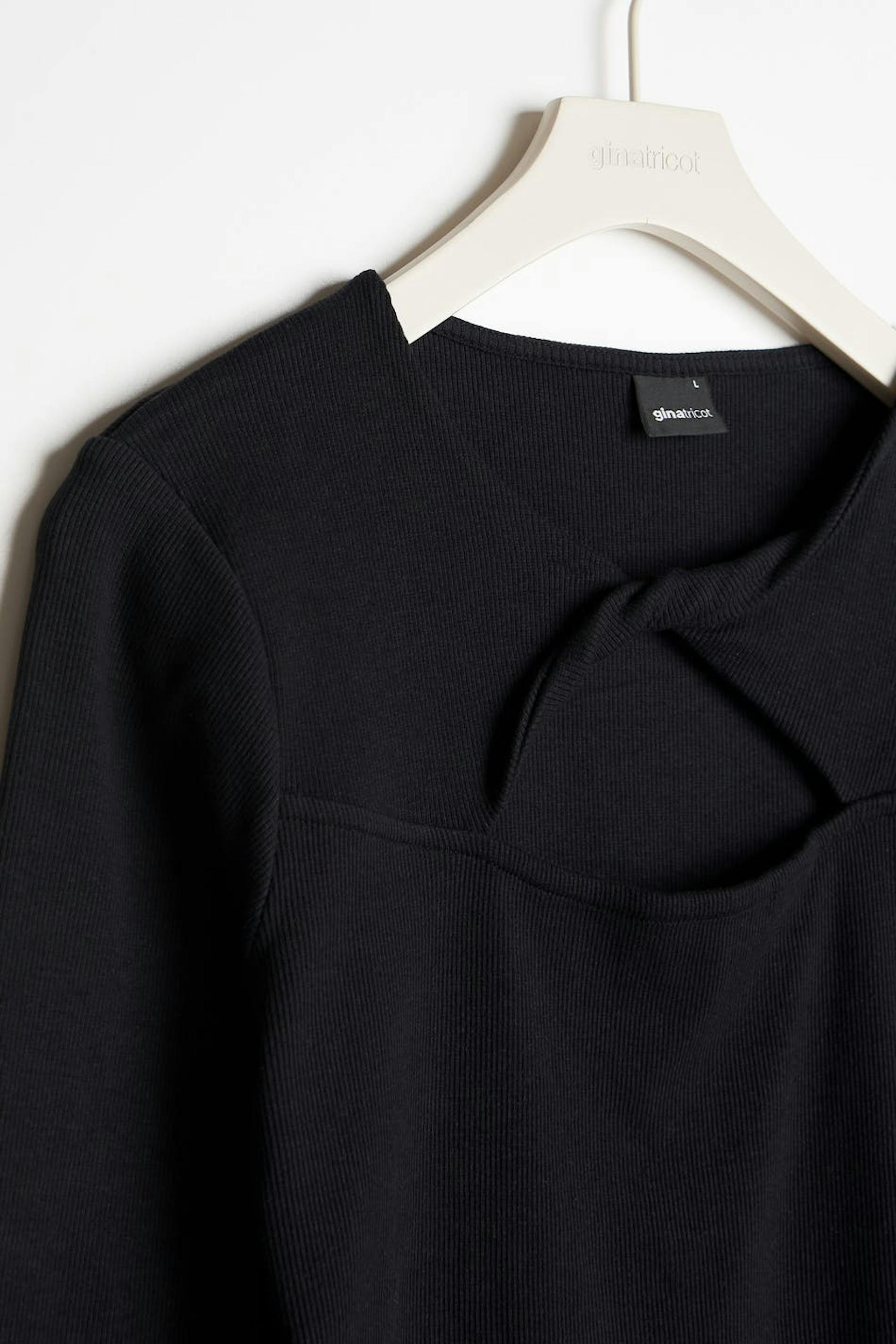 Long-sleeved top with a cutout detail at the front. The top is black and has a ribbed quality in jersey. It has a fitted fit and a twisted detail on the neckline.