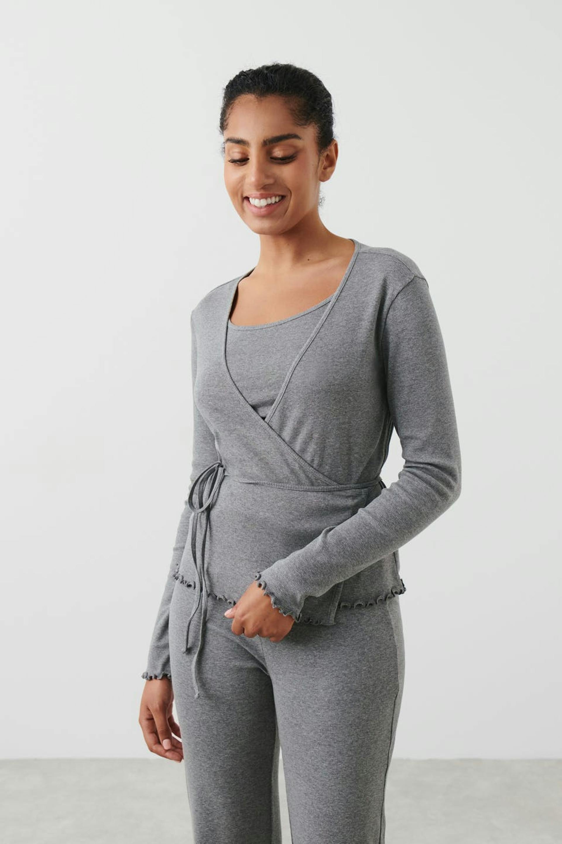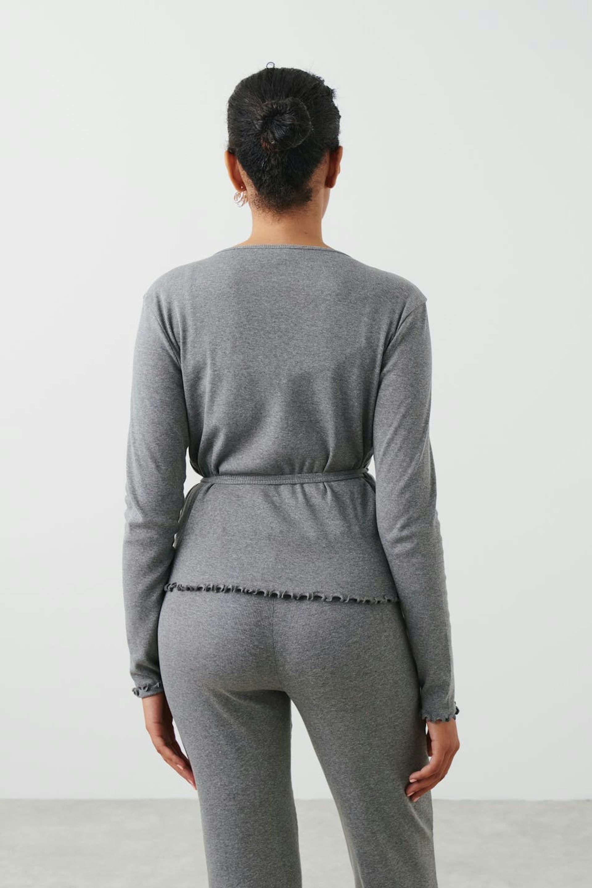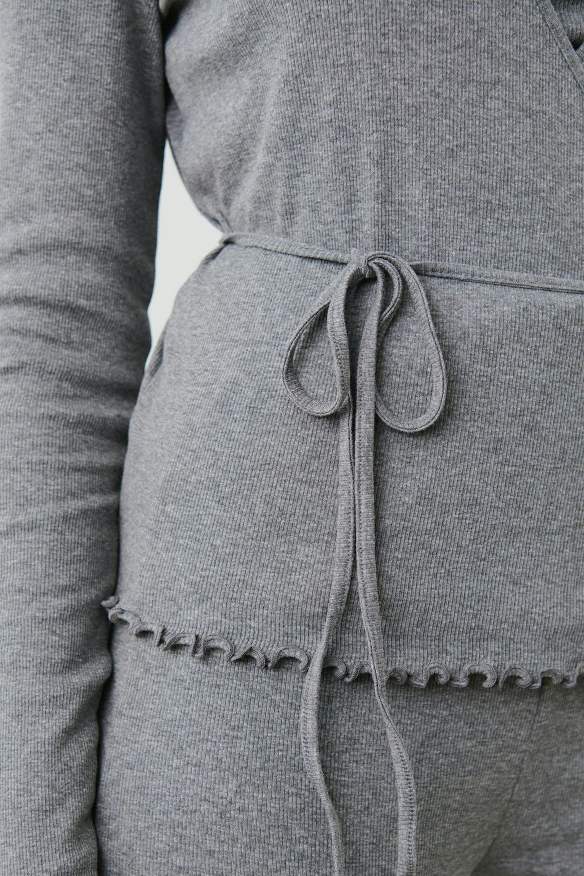 Ribbed top in soft jersey with wrap design. The top is grey and has long sleeve. It has lettuce hem.