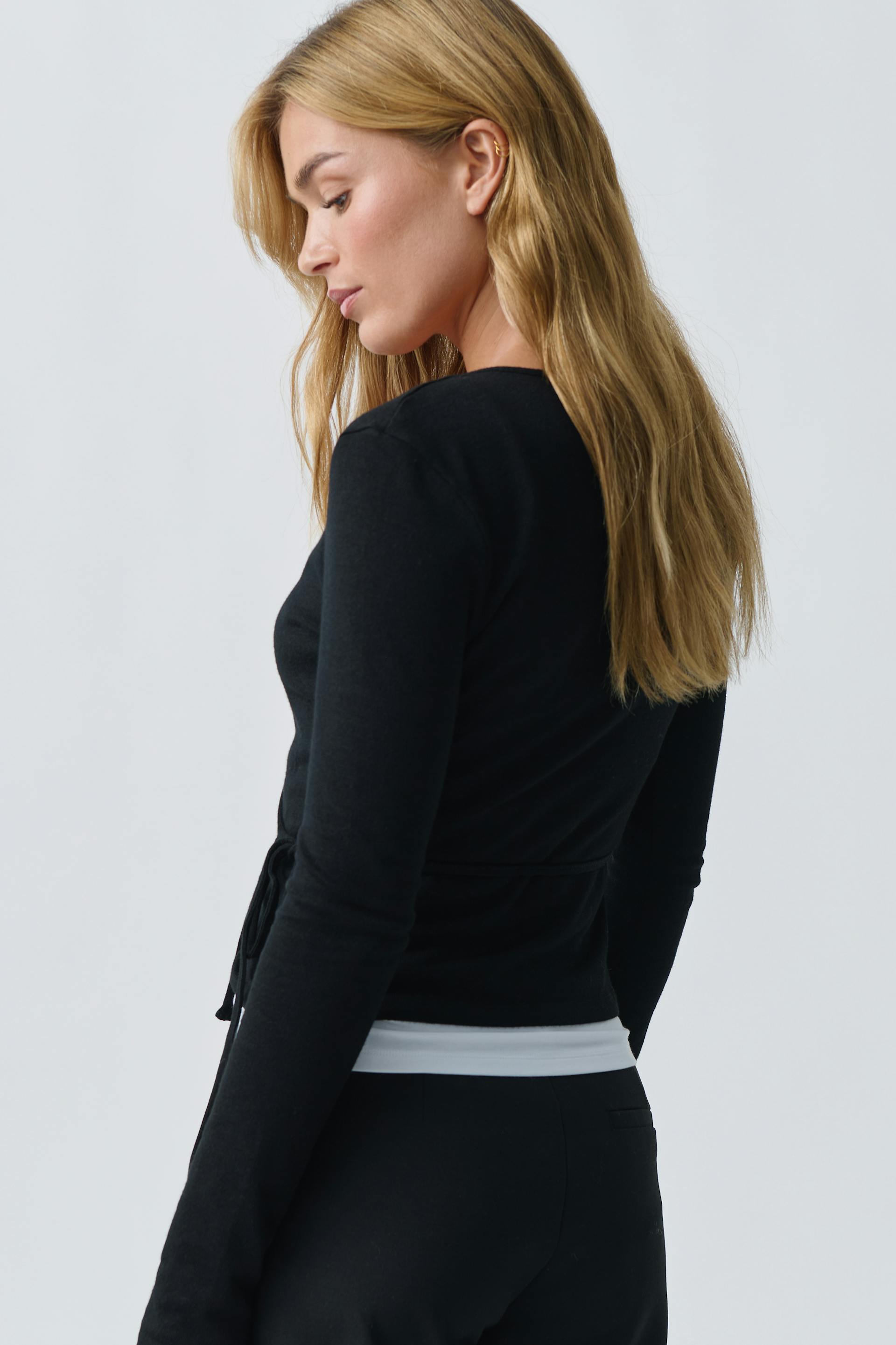 Wrap top with self-tie at the waist. The top is black and has V-neck. It has regular fit and long sleeve.