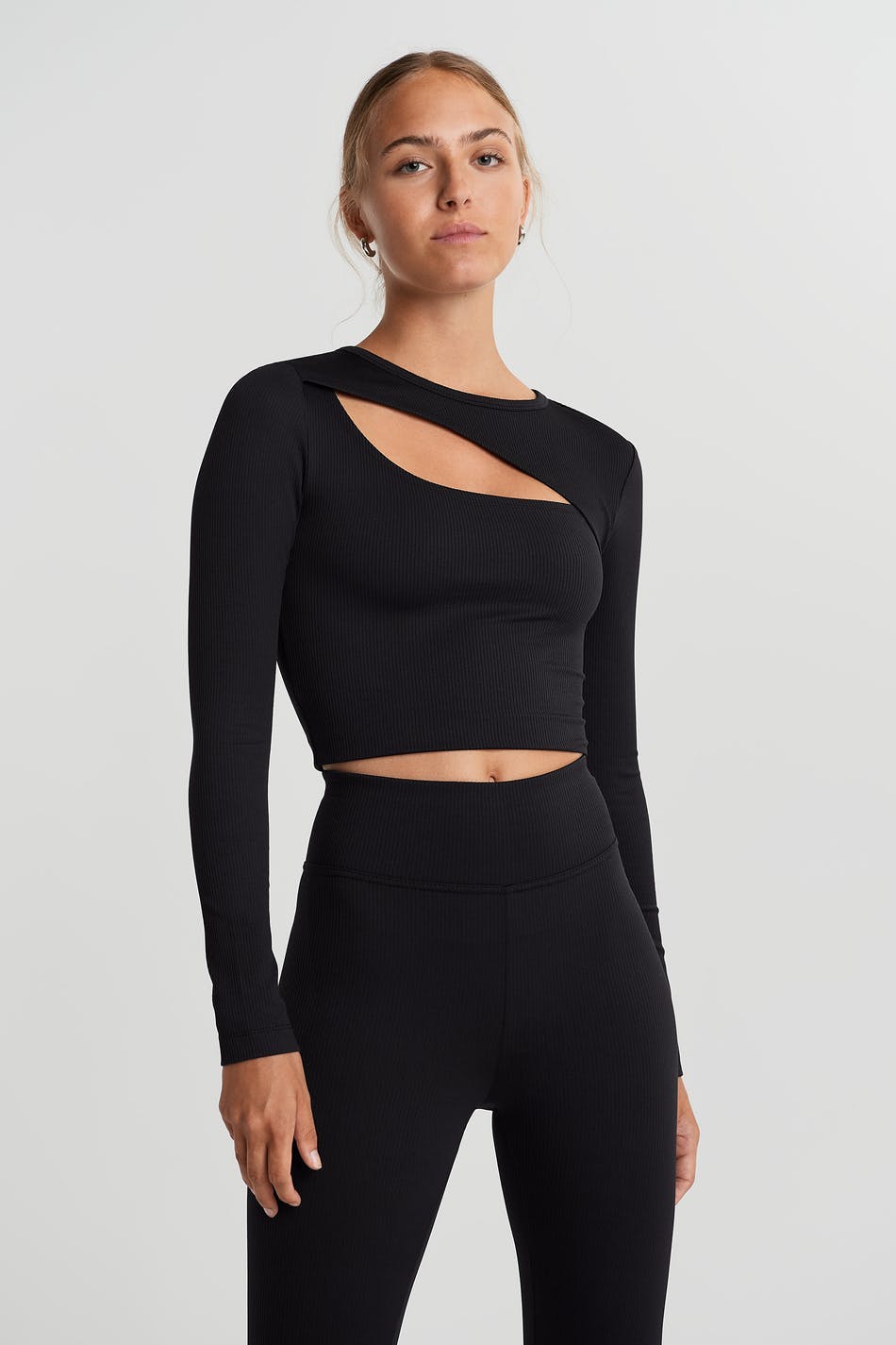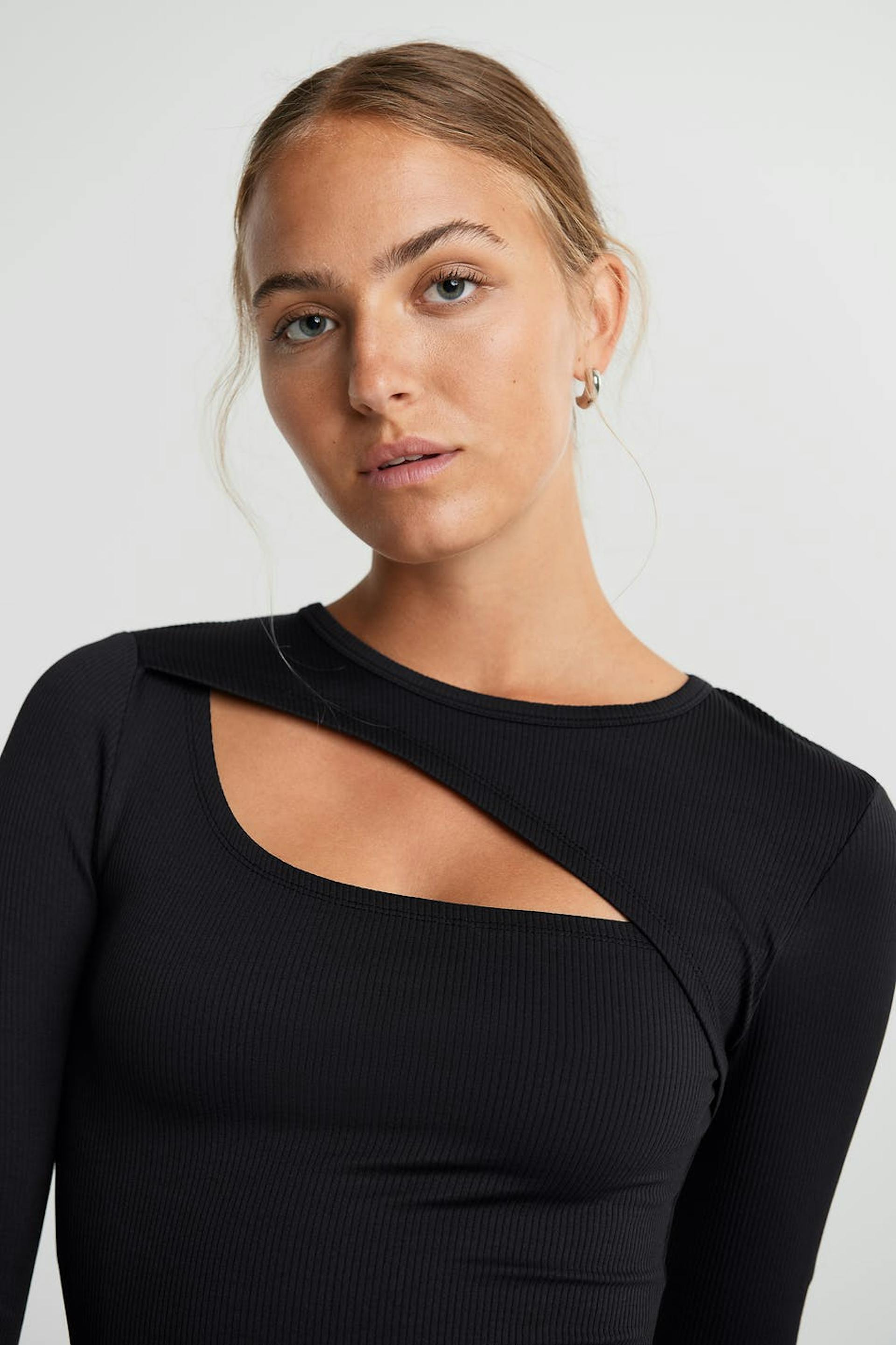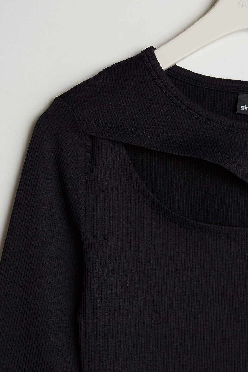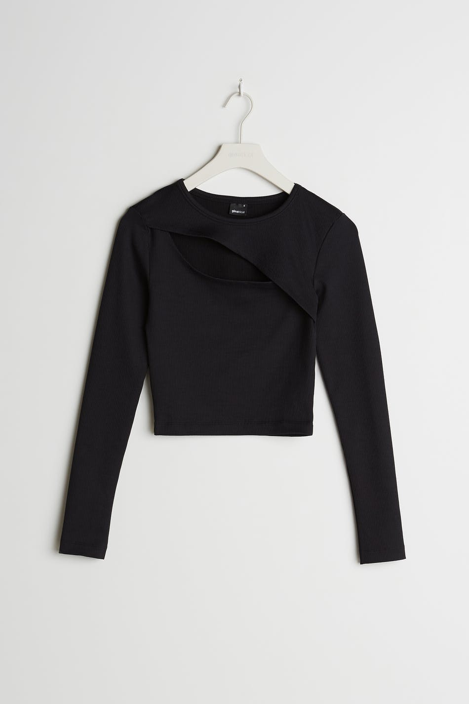Long-sleeved top with a fitted fit. The top is black and short and has a cutout detail above the bust. It is made of jersey.