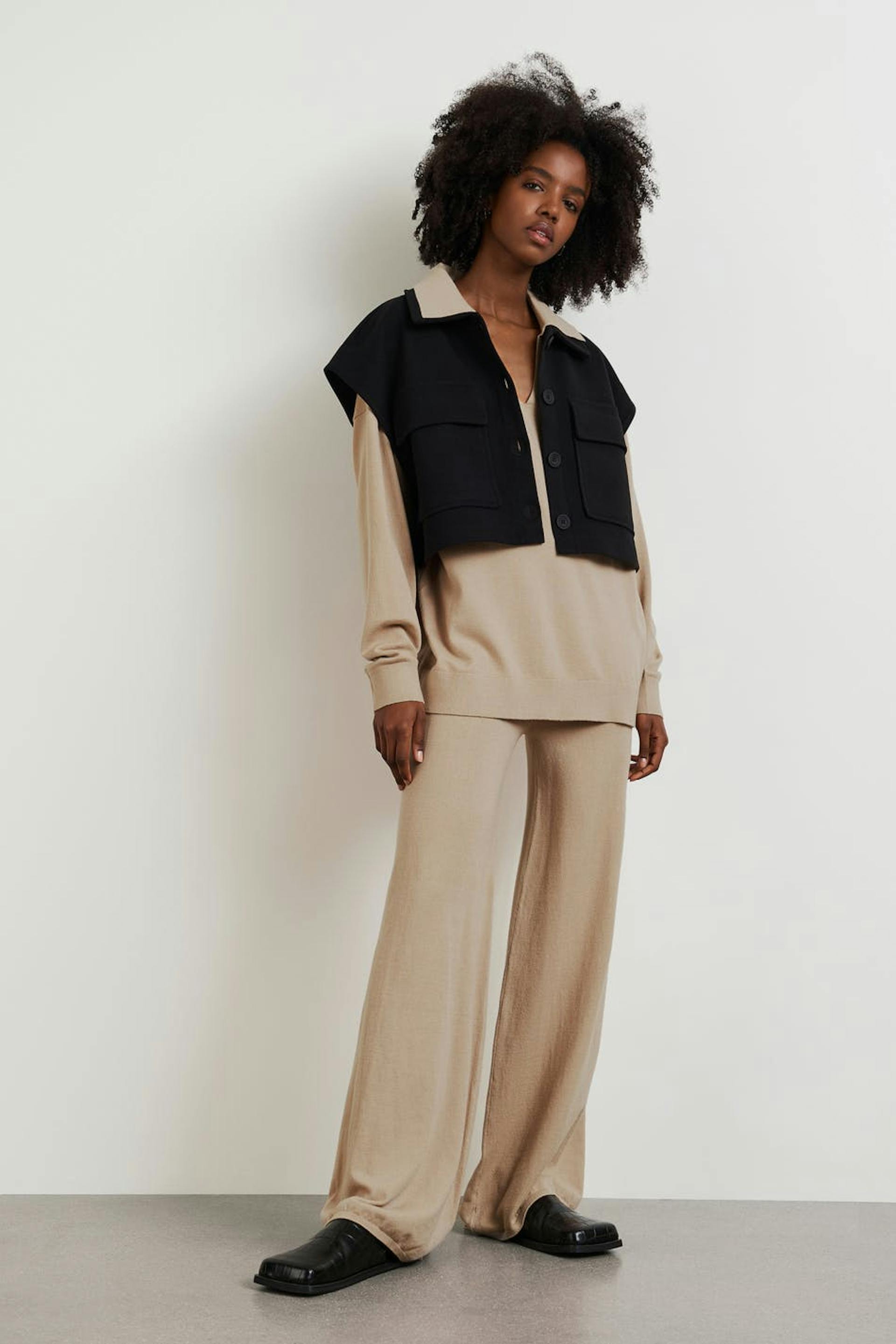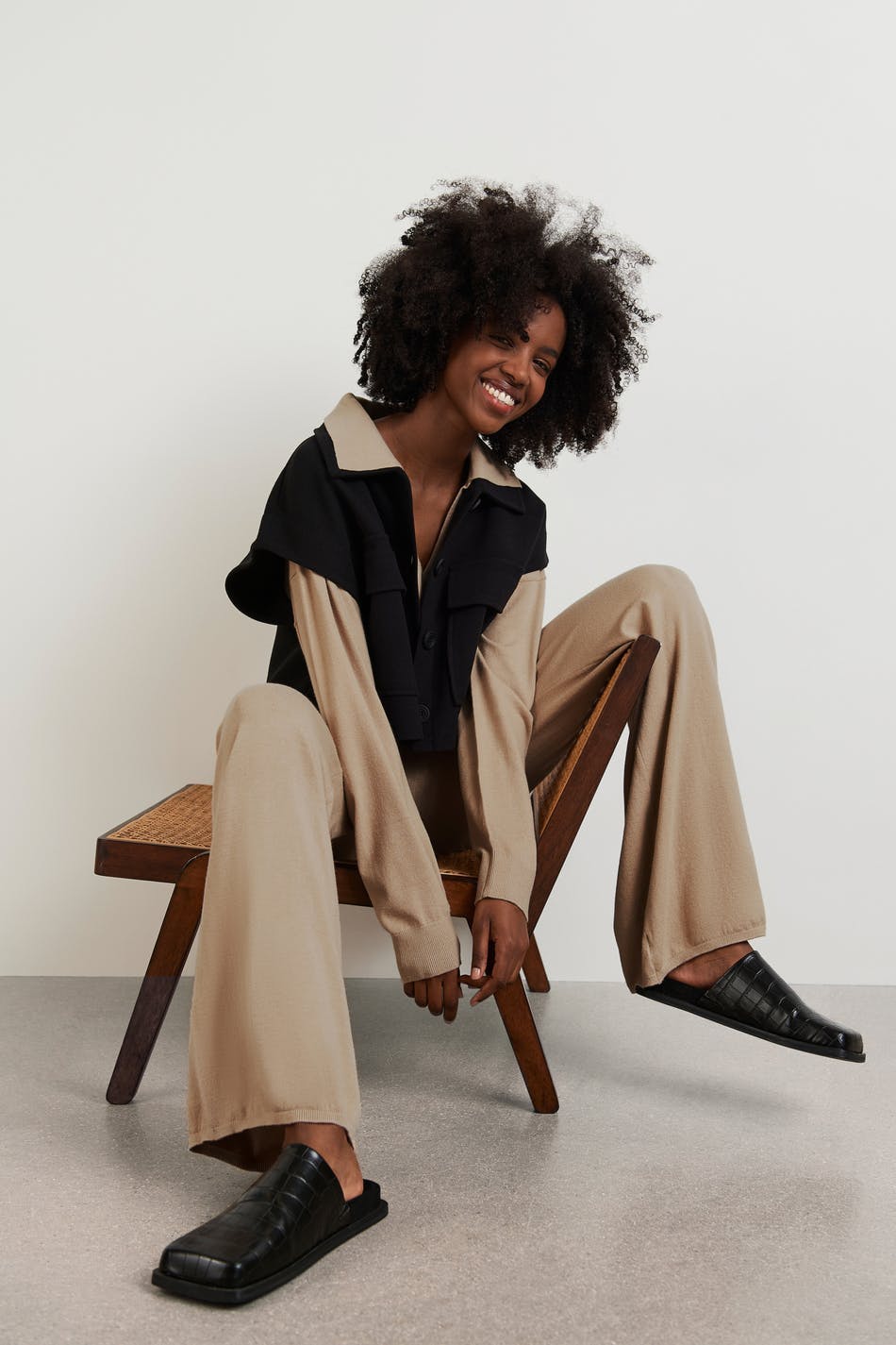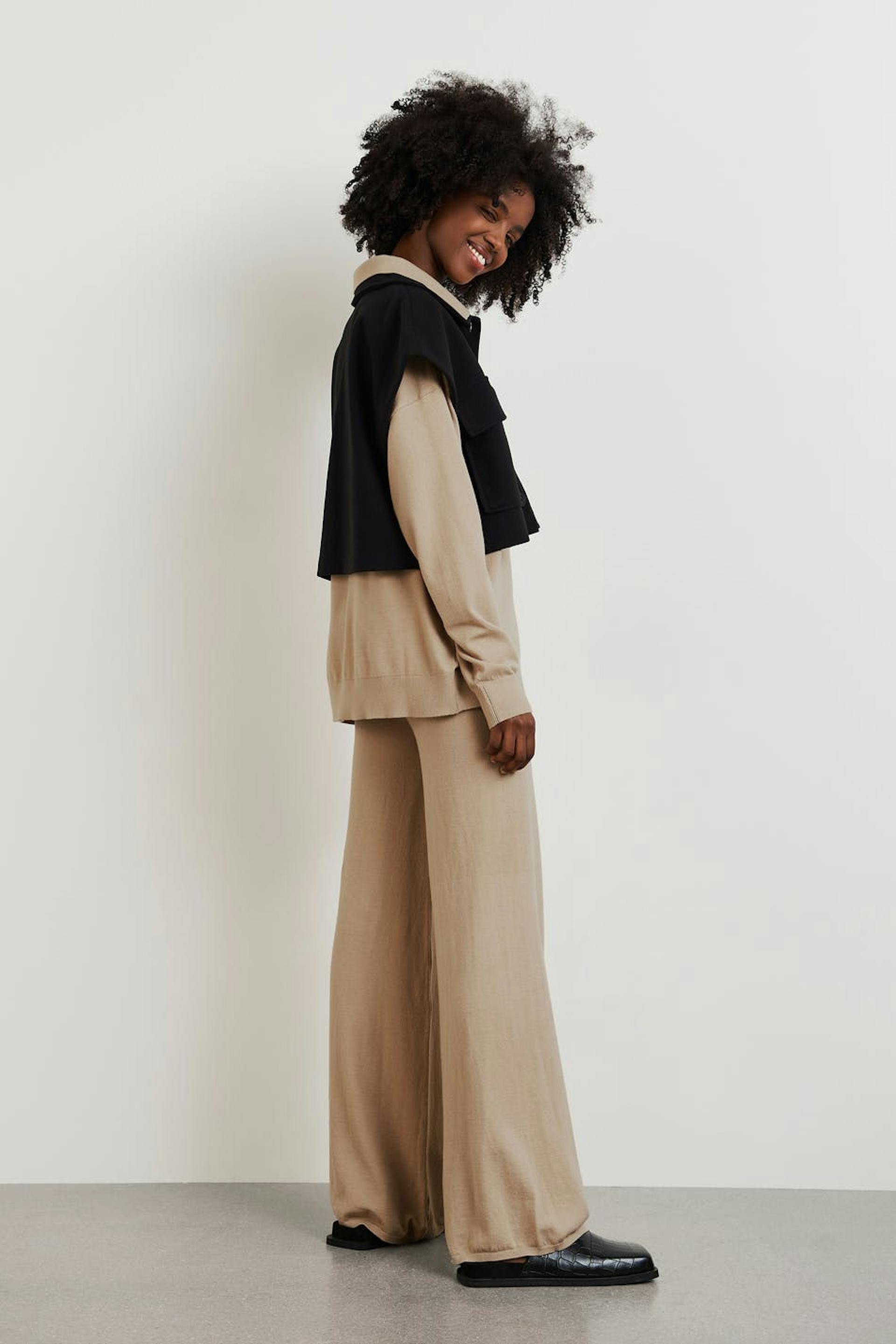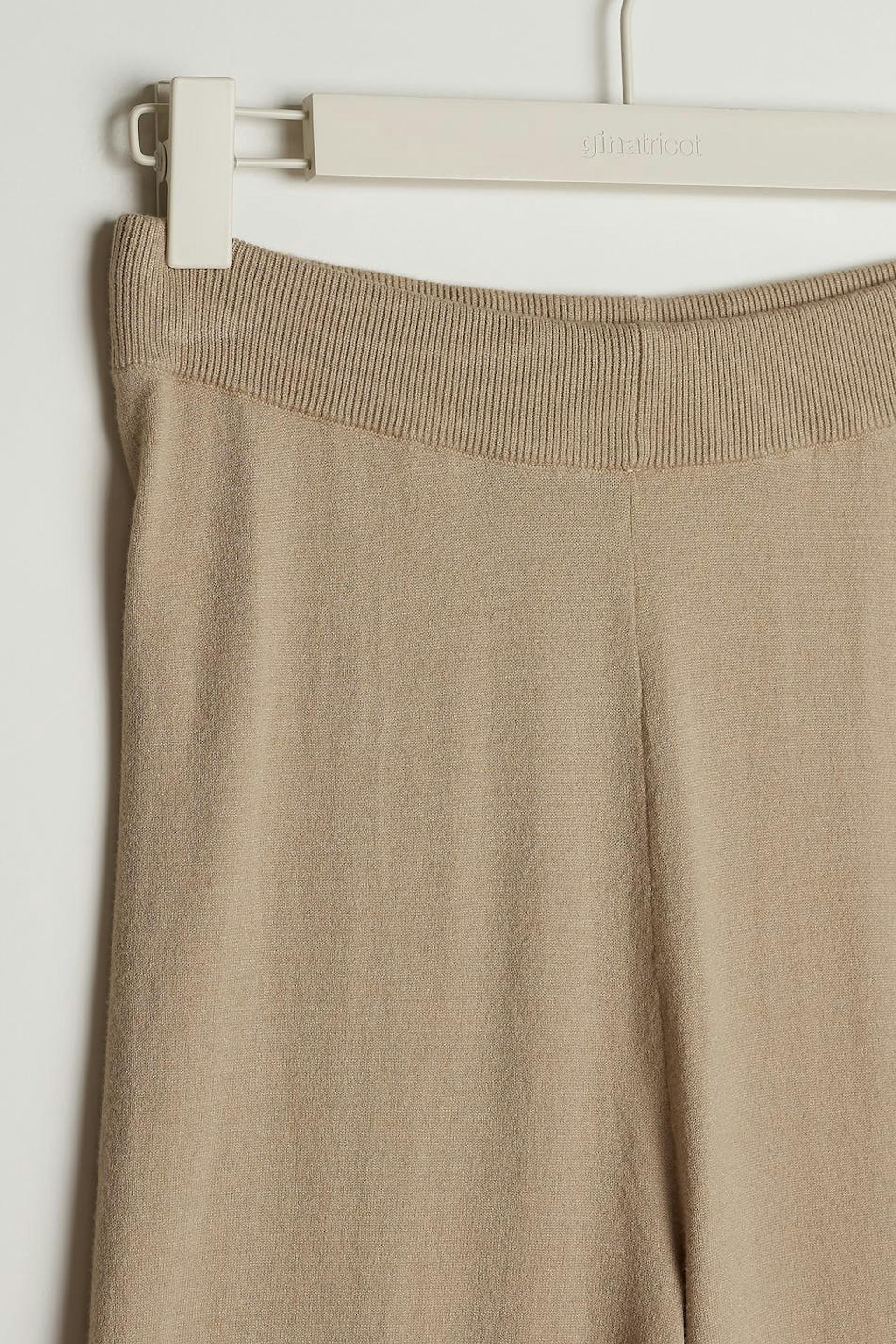 Knitted trousers with wide, full-length trouser legs. The trousers are beige and have a soft elastic band at the waist.