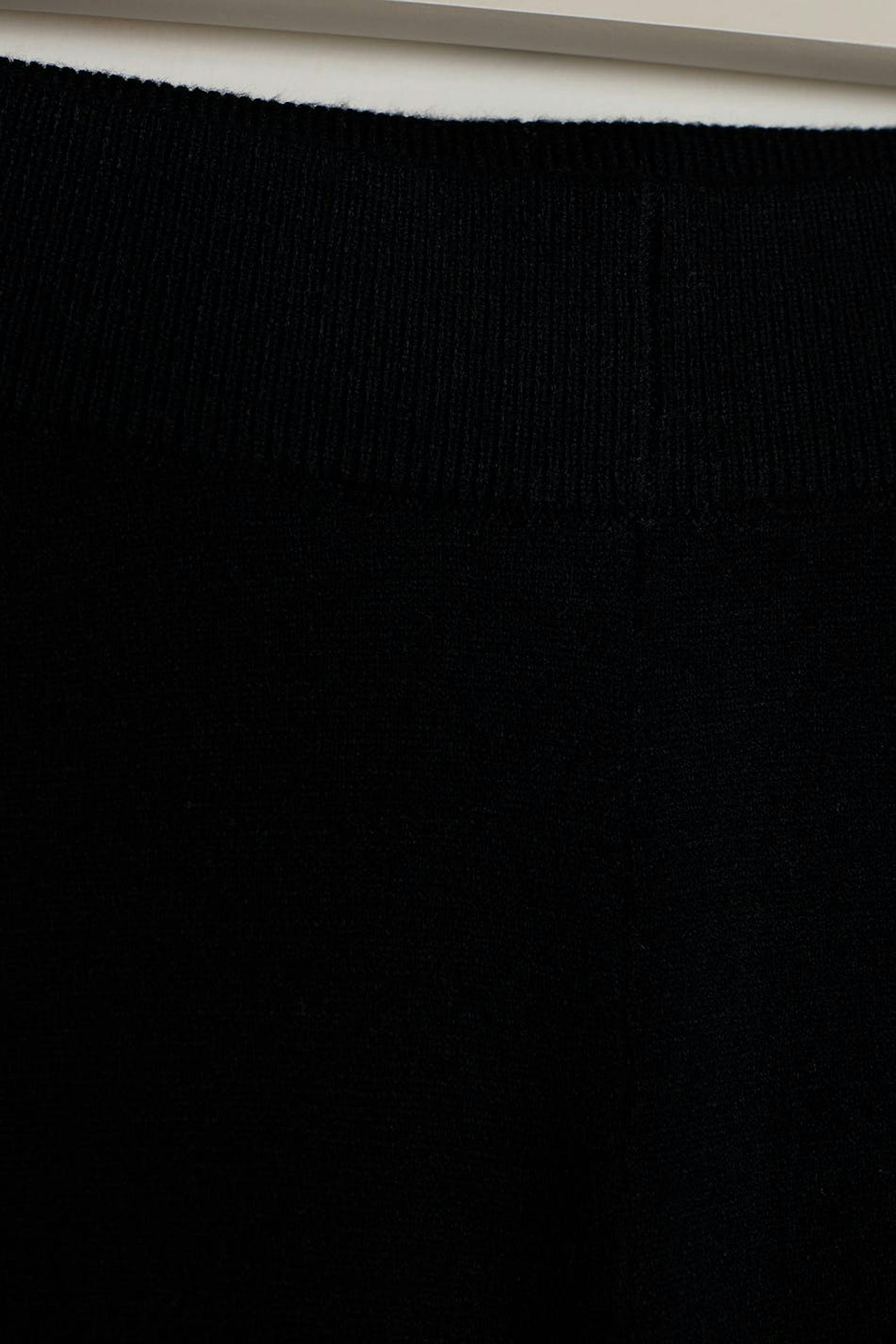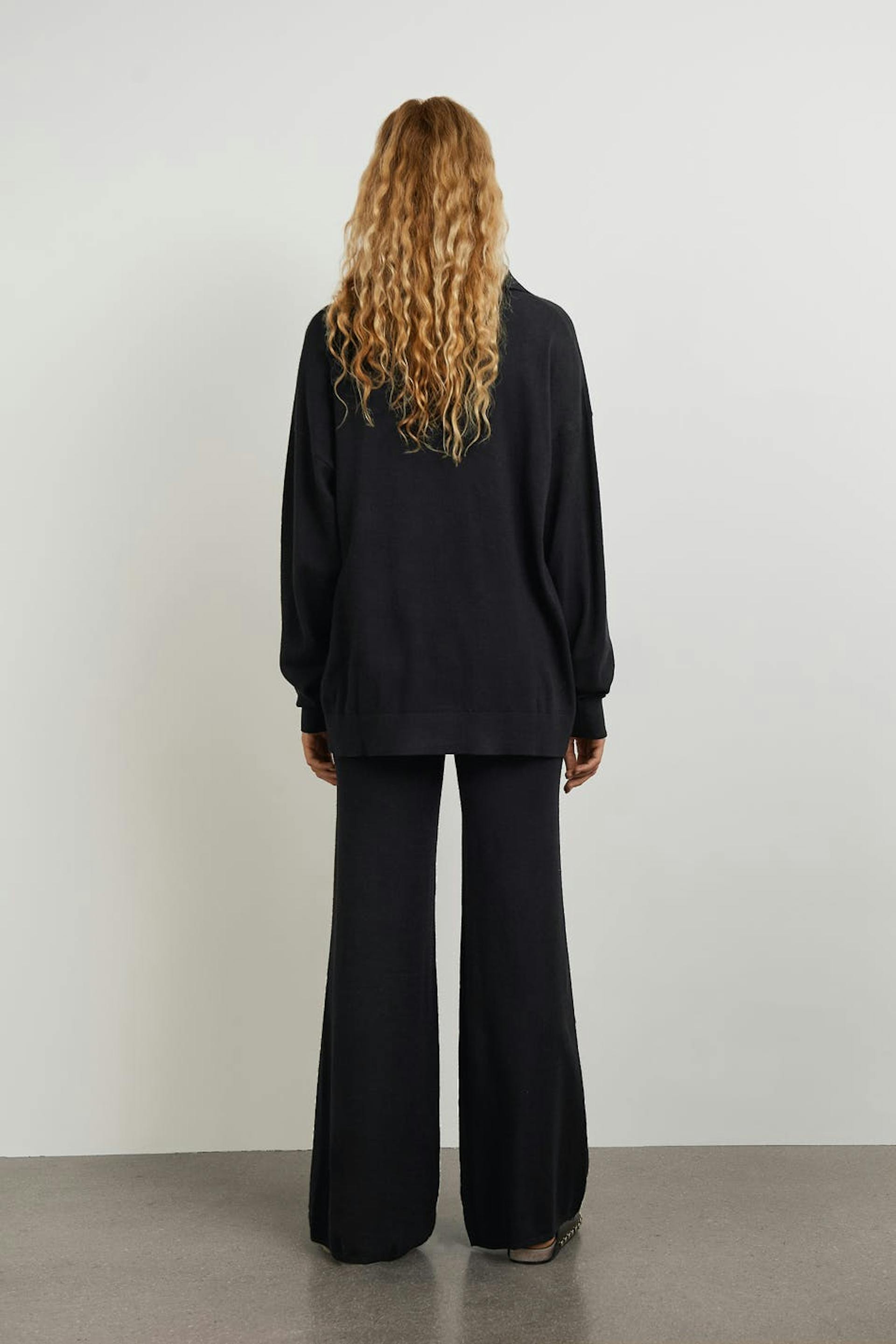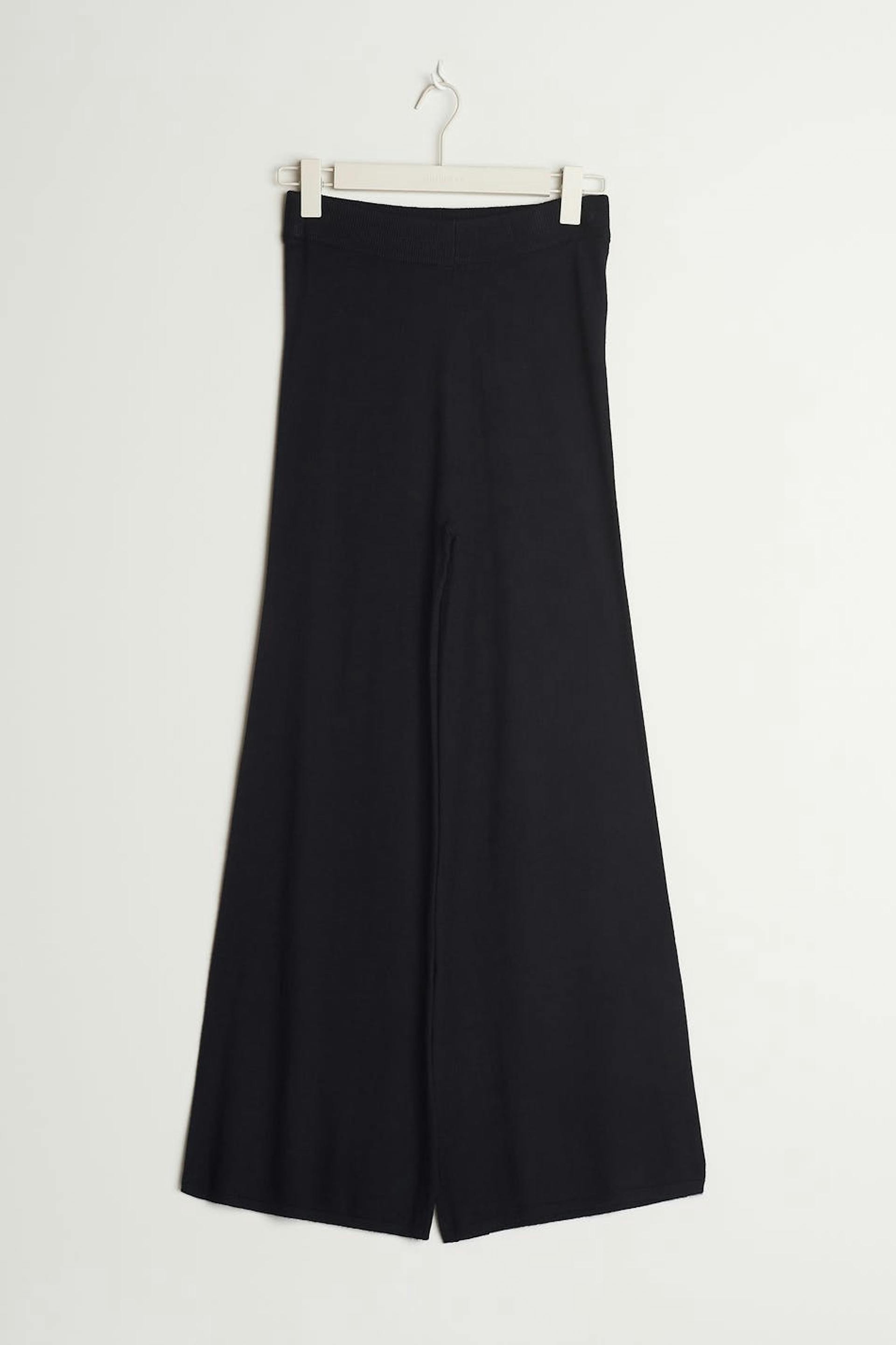 Knitted trousers with wide, full-length trouser legs. The trousers are black and have a soft elastic band at the waist.