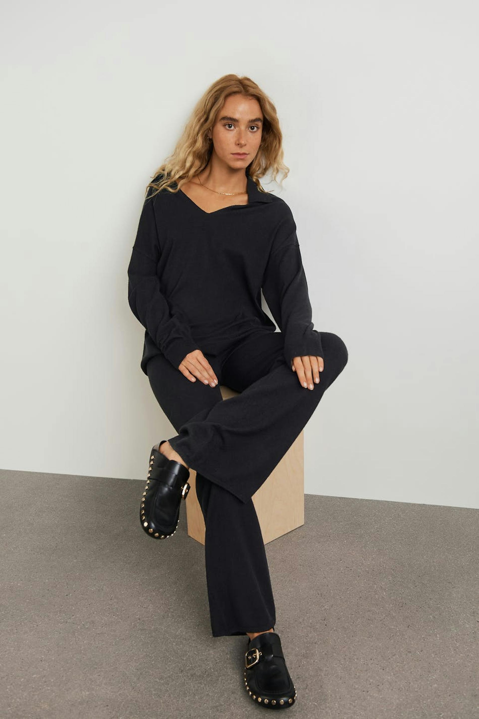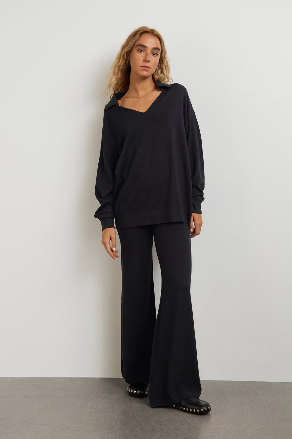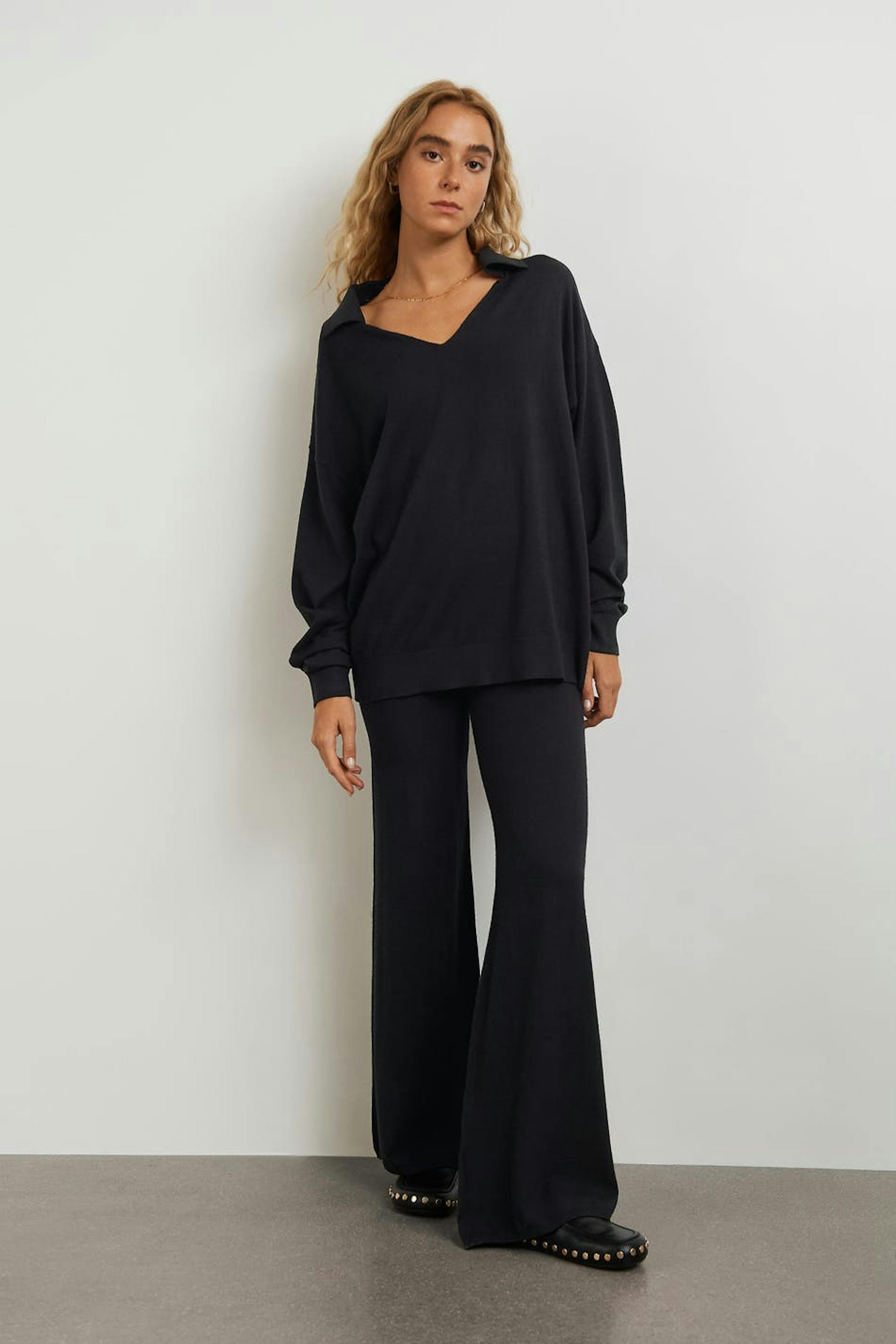 Knitted trousers with wide, full-length trouser legs. The trousers are black and have a soft elastic band at the waist.
