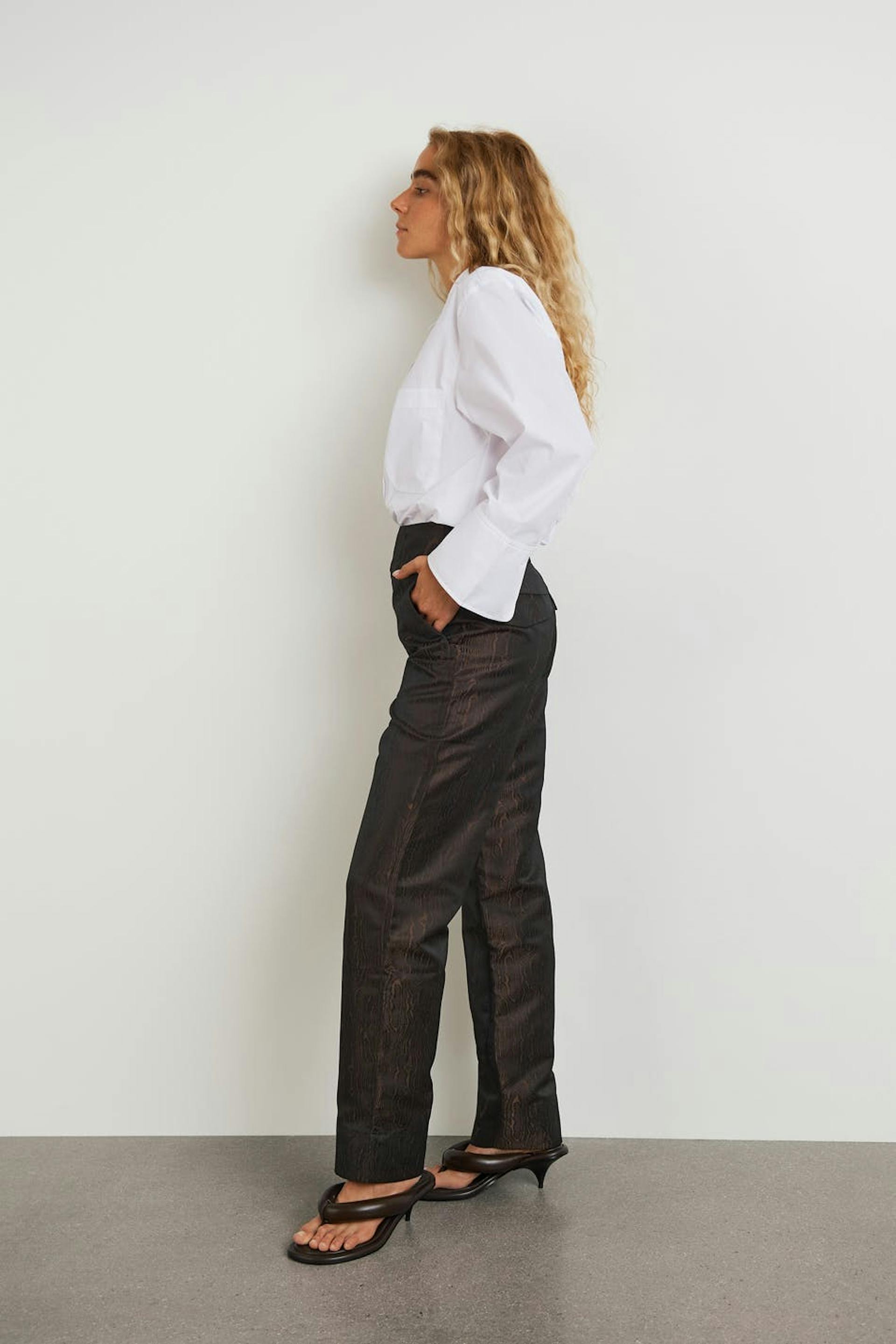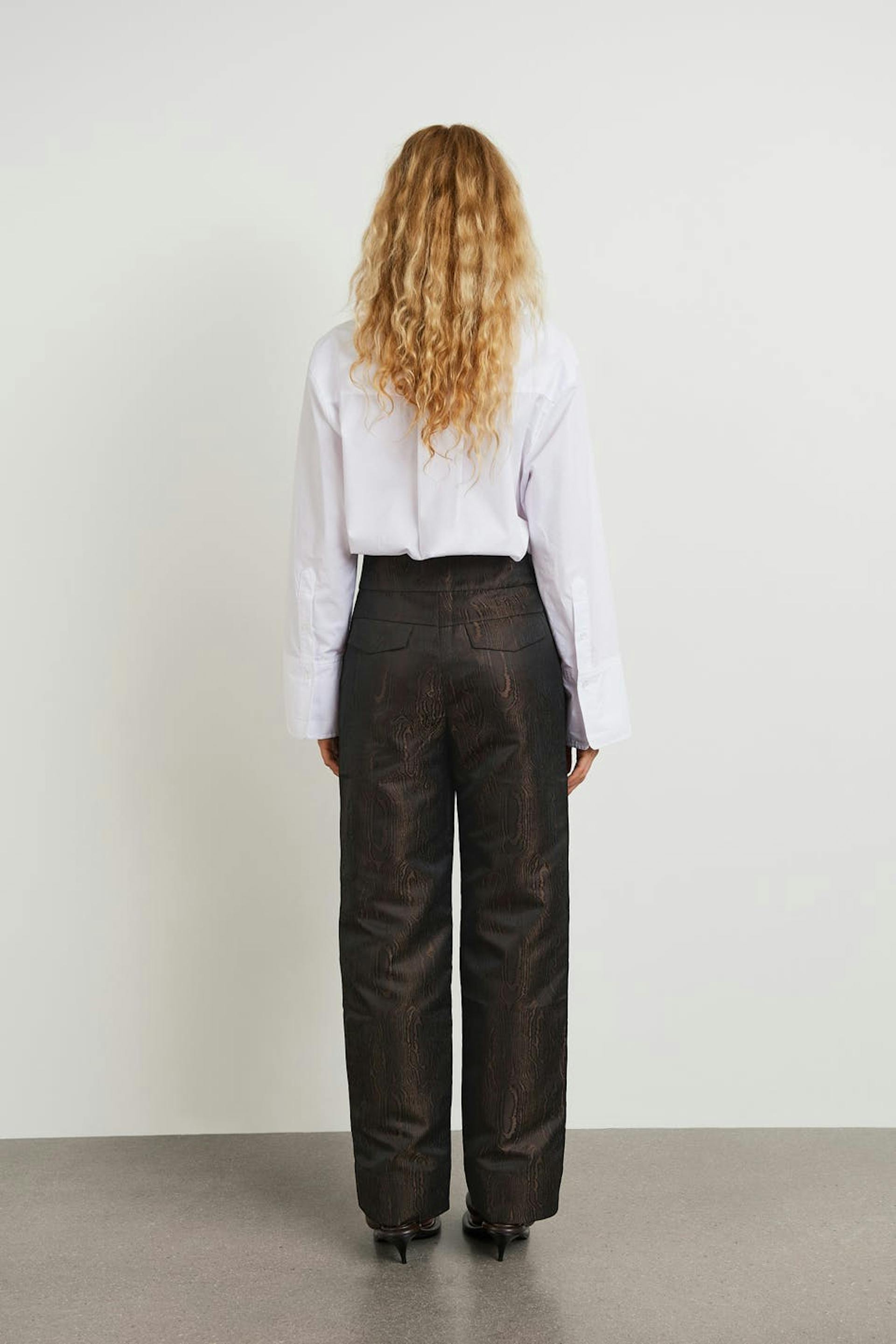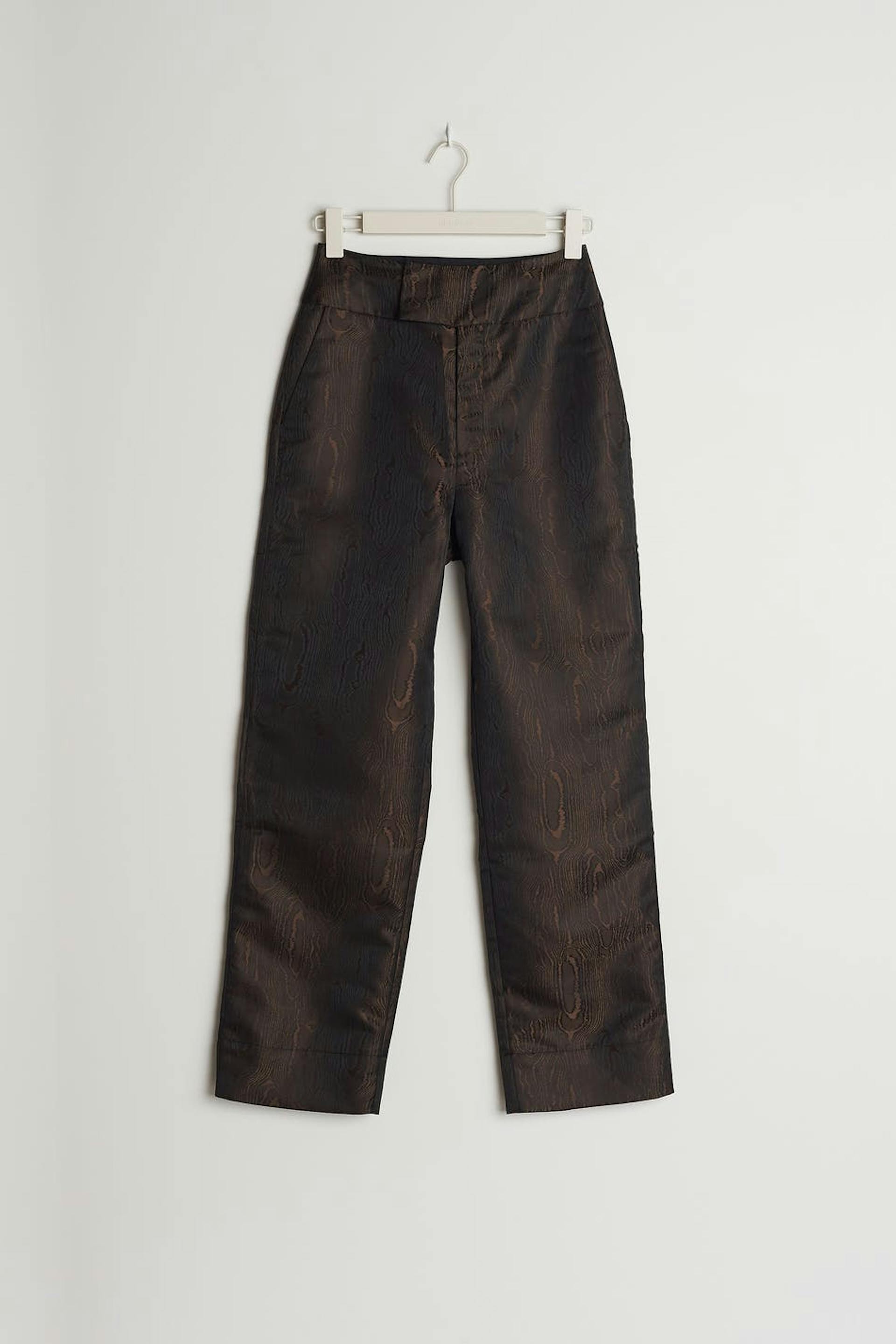Trousers with a high waist. The trousers are brown and have straight trouser legs with a full length. They have a broad waistband and slant pockets on the sides.