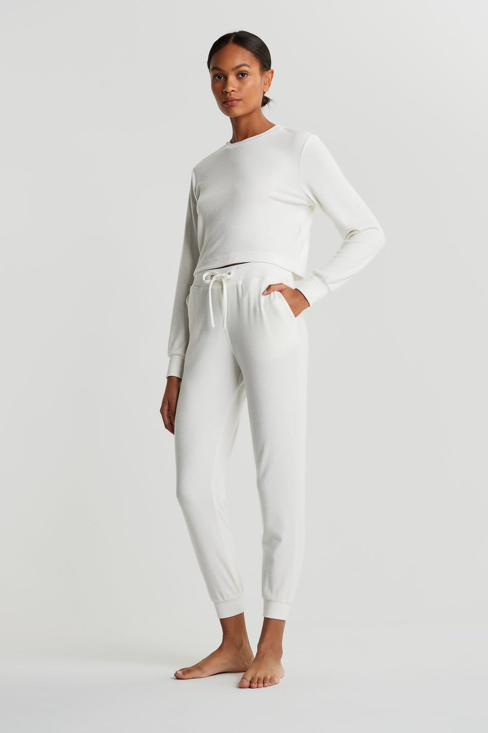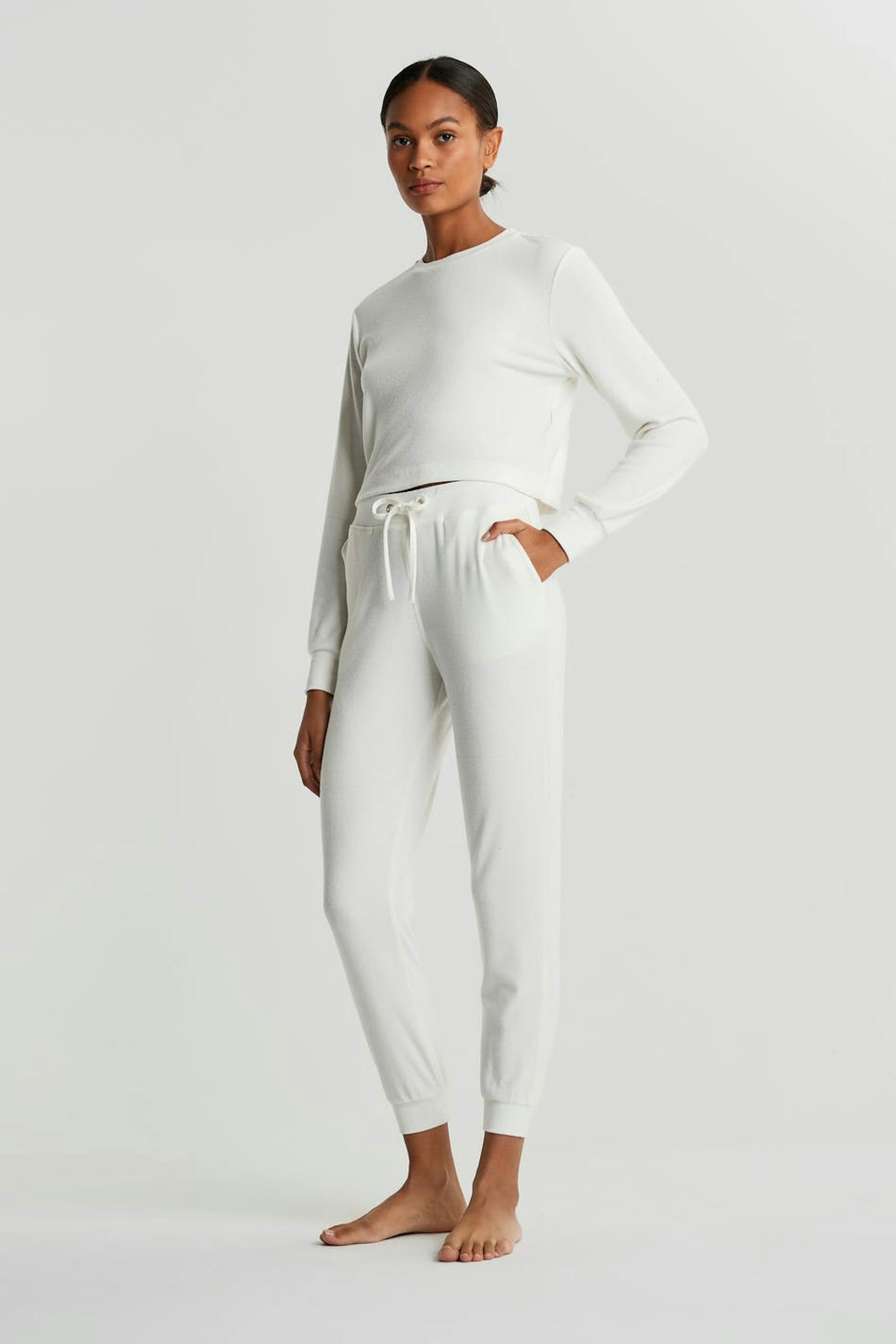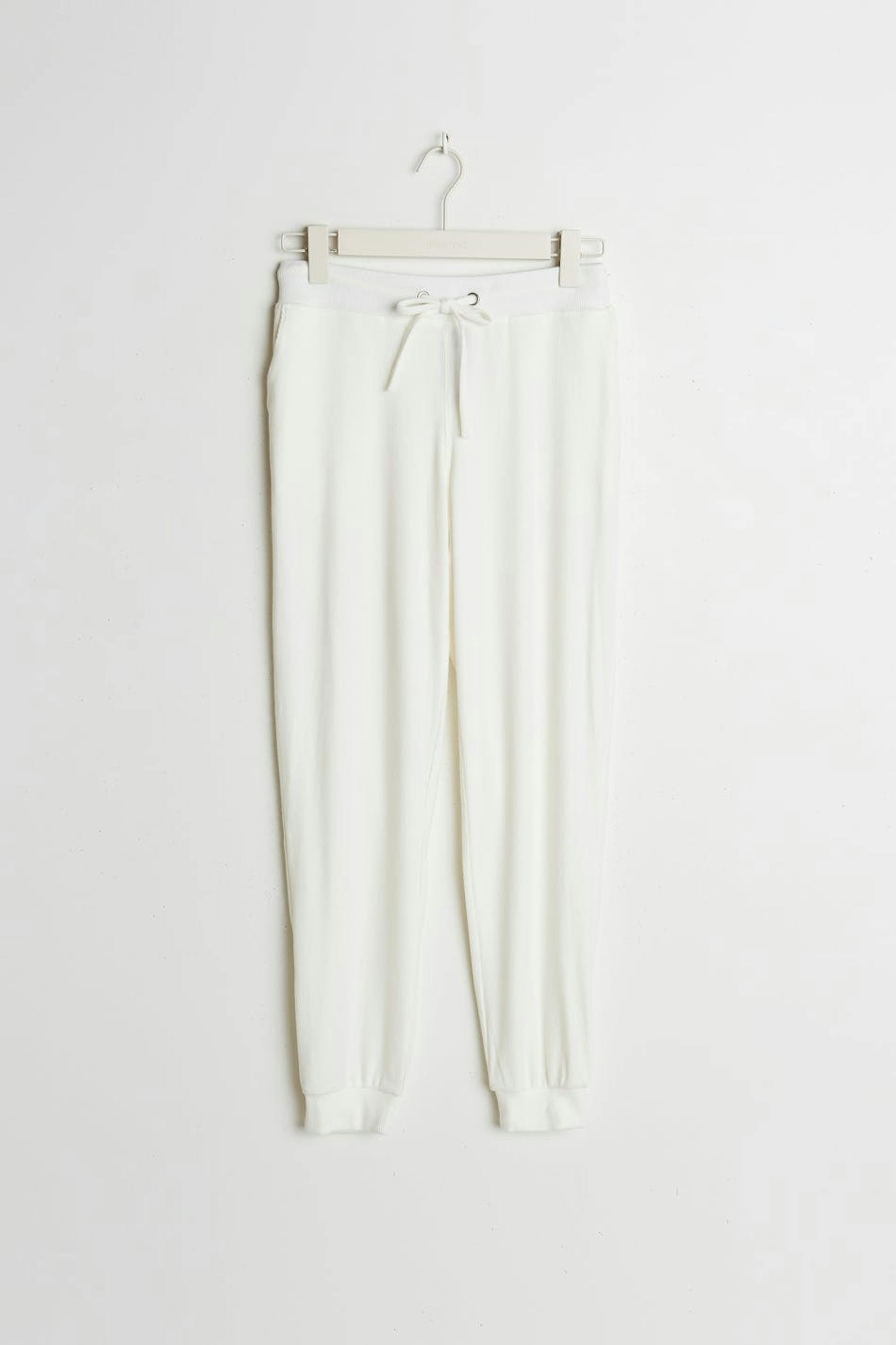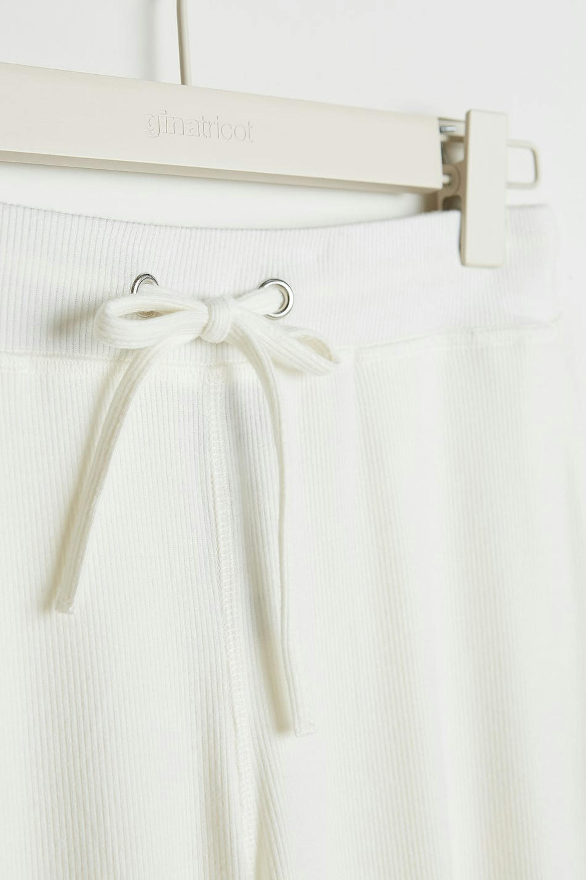 Ribbed tracksuit trousers with a regular fit. The trousers are white and smooth and have a cuff at the end of the legs. They have a waist in elastic with a drawstring.