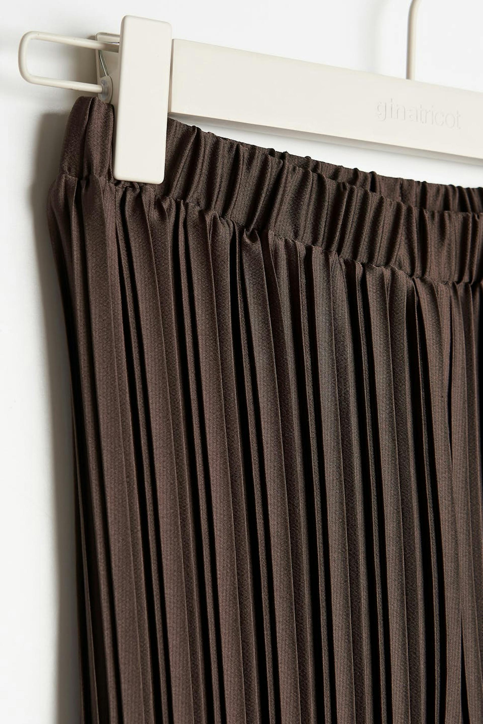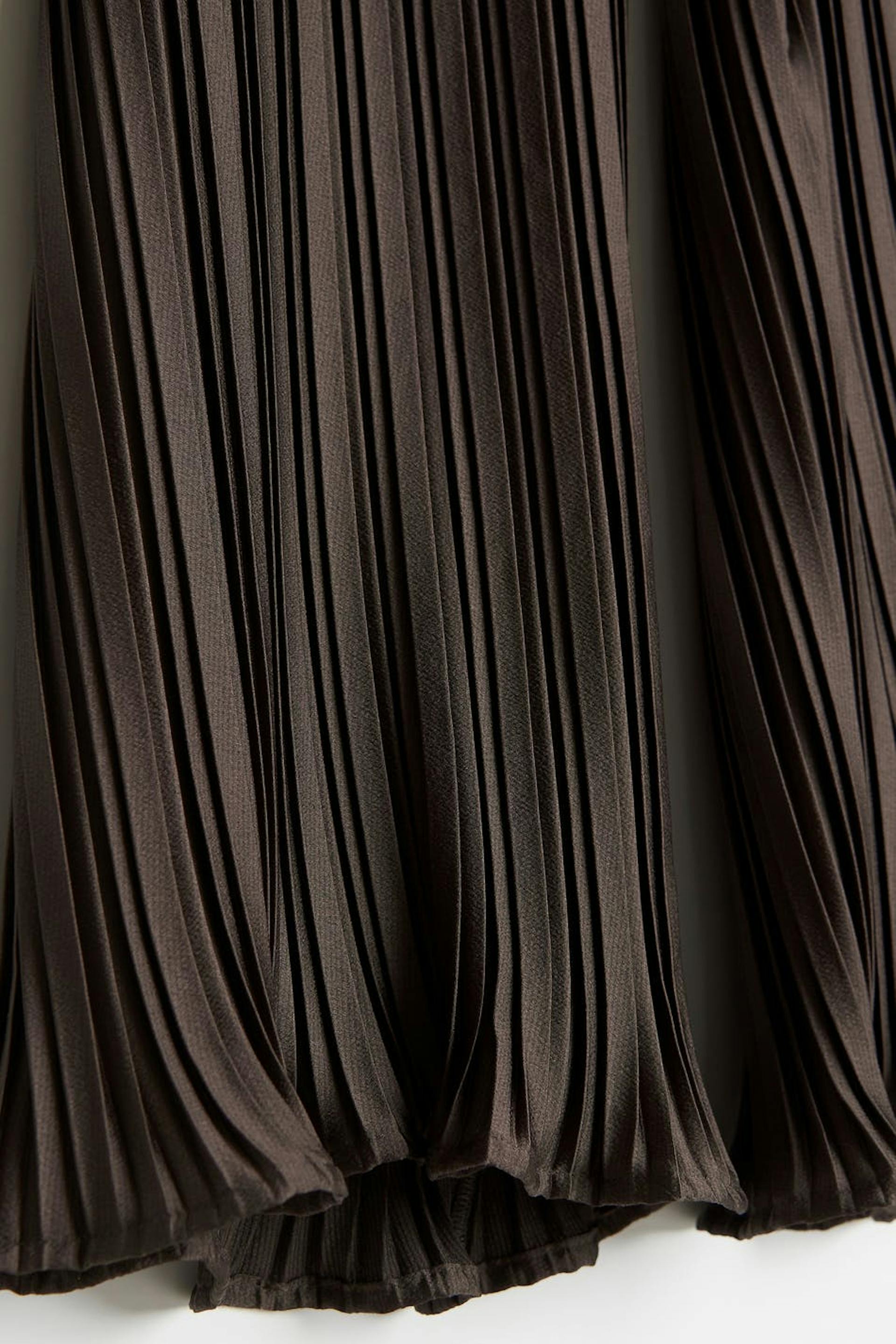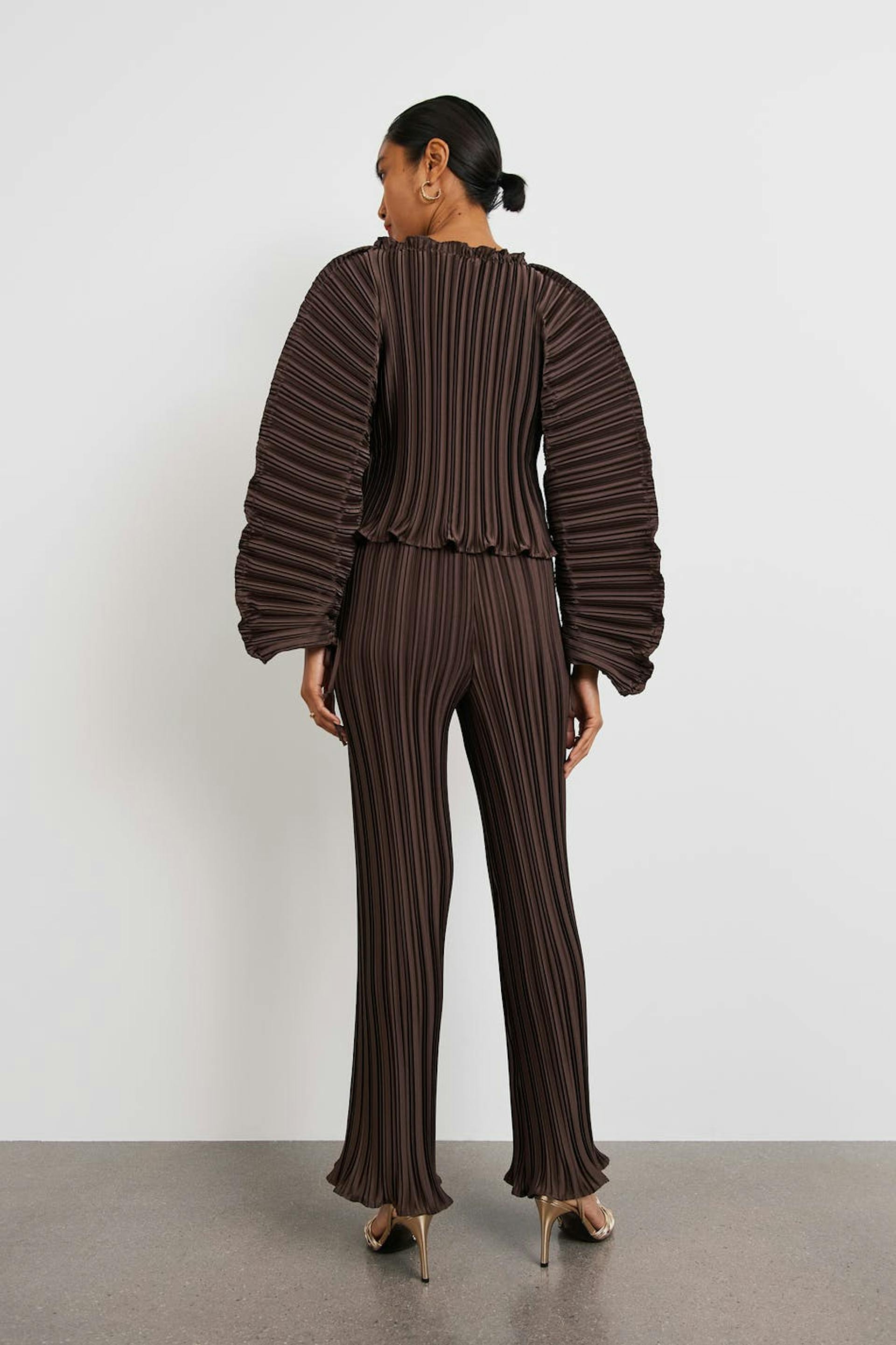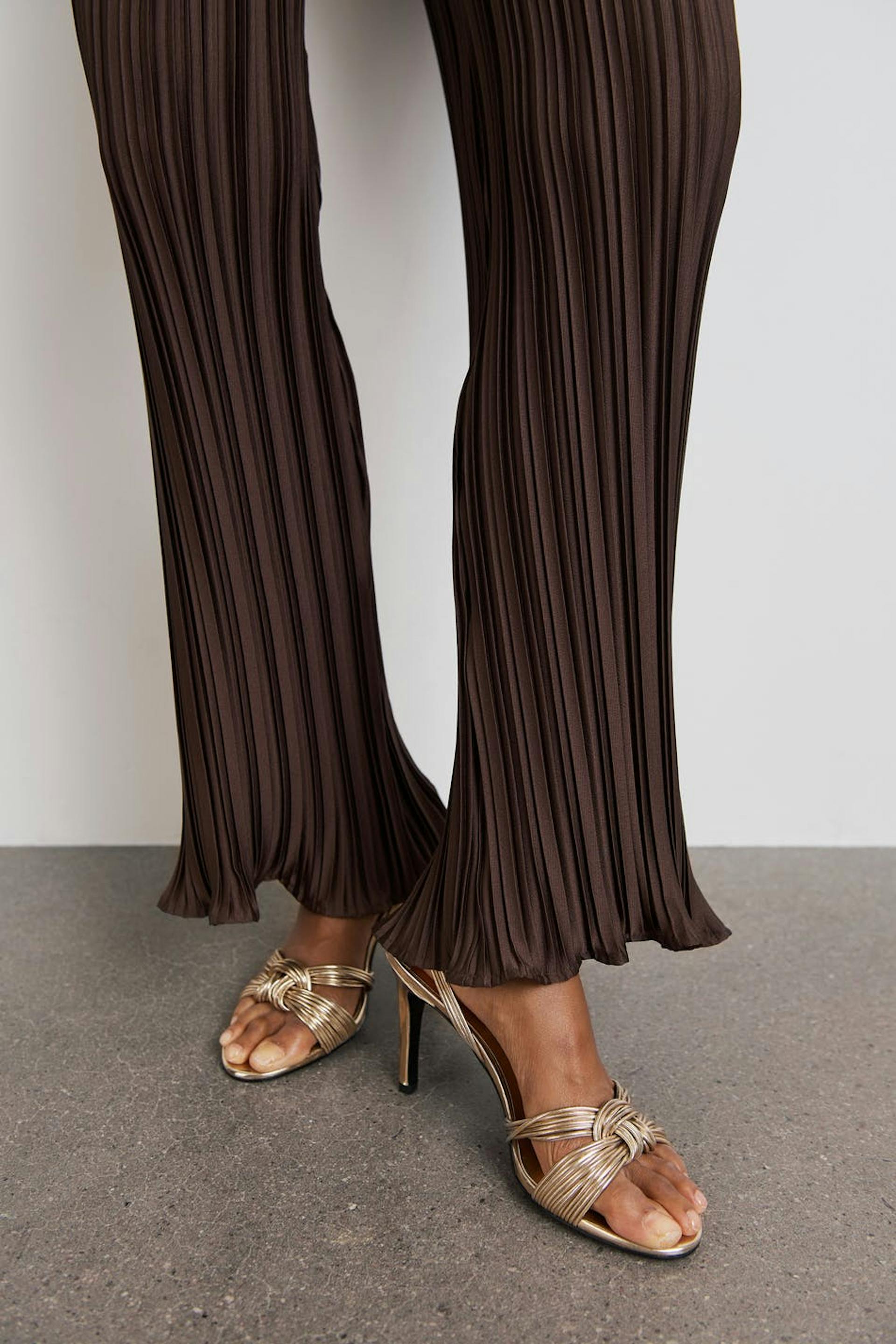 Pleated trousers with a relaxed fit. The trousers are perfect for the party and brown and have a soft elastic at the waist. They have straight trouser legs and small frills at the end of the legs.