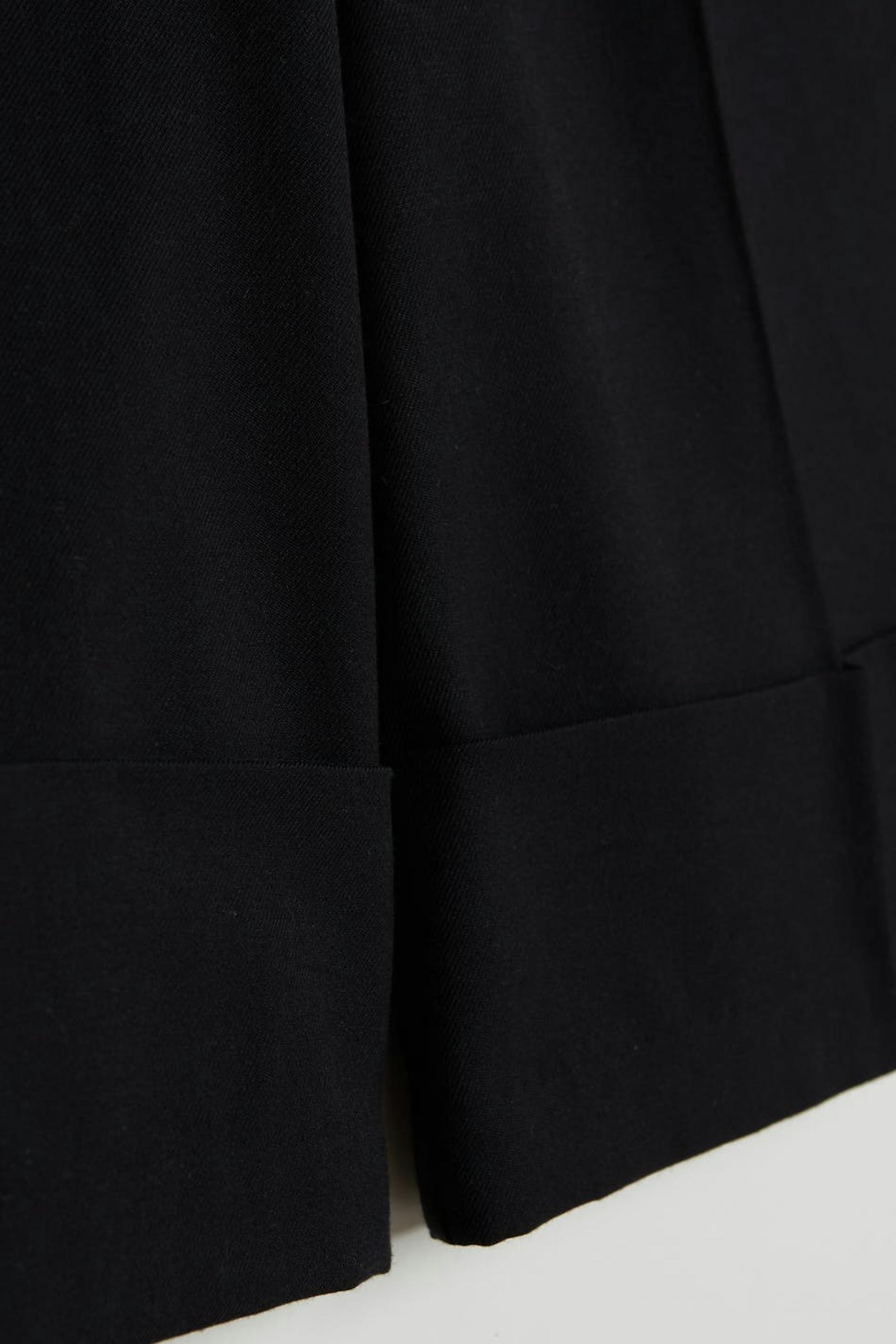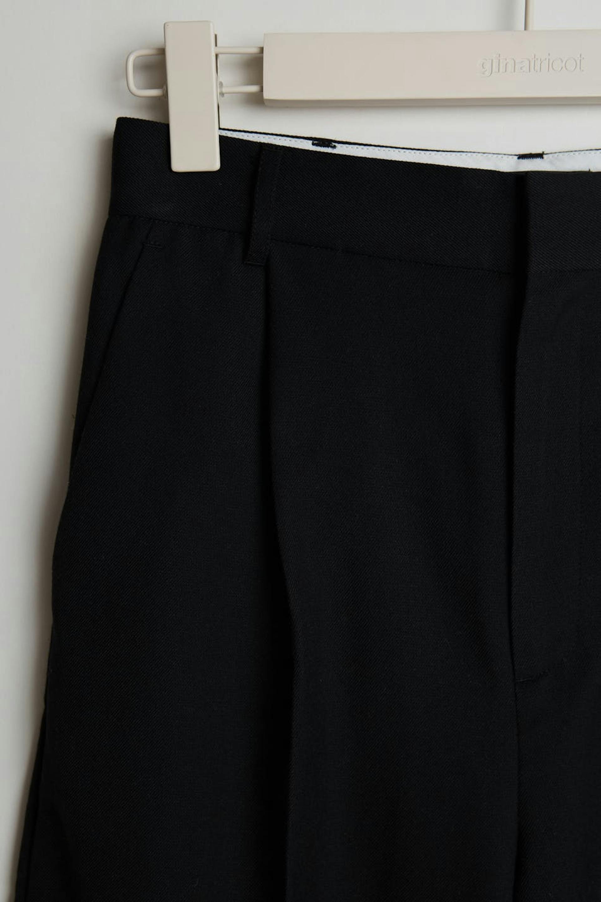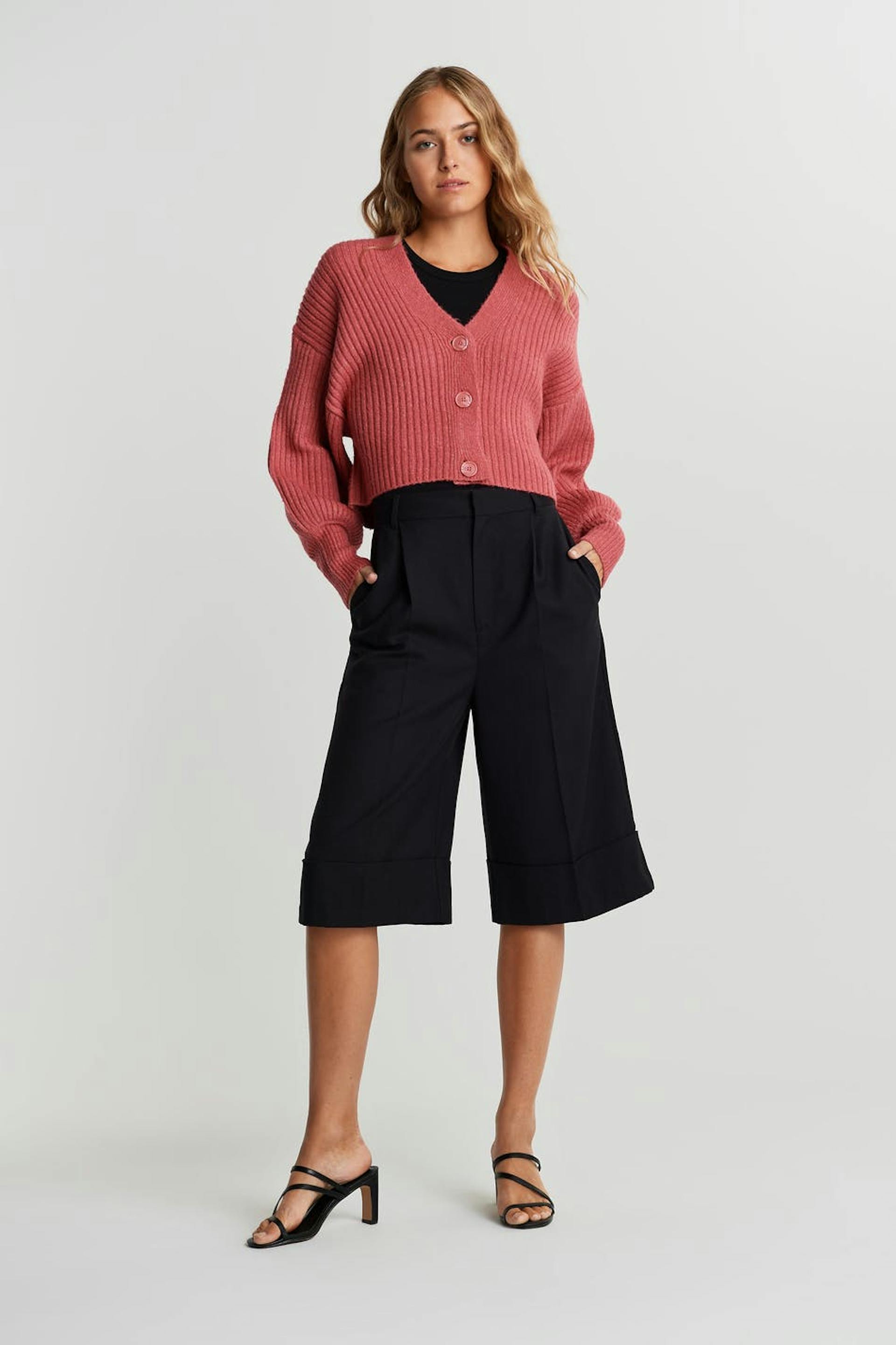 Knee length culottes with wide legs with creases. The culottes are black.