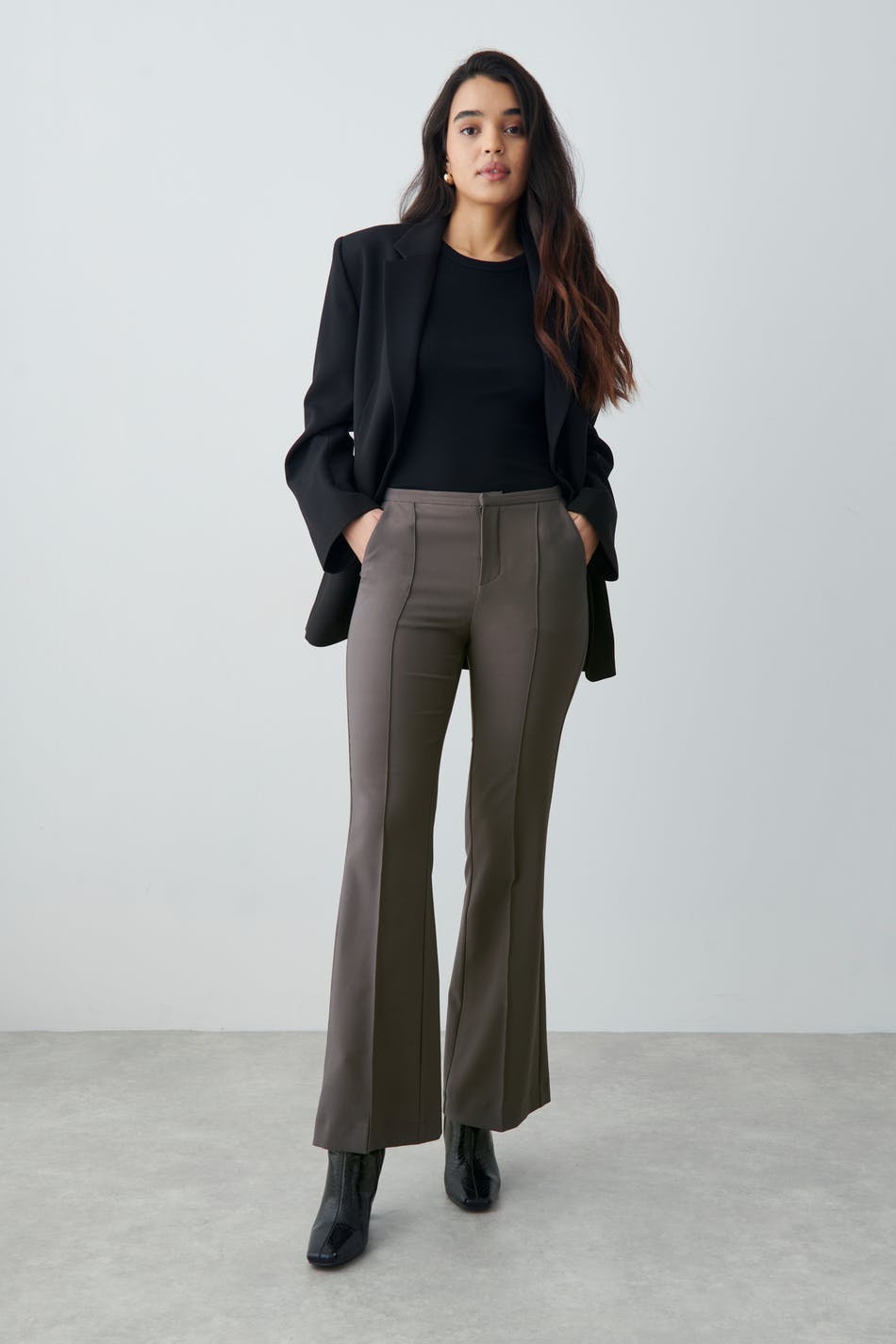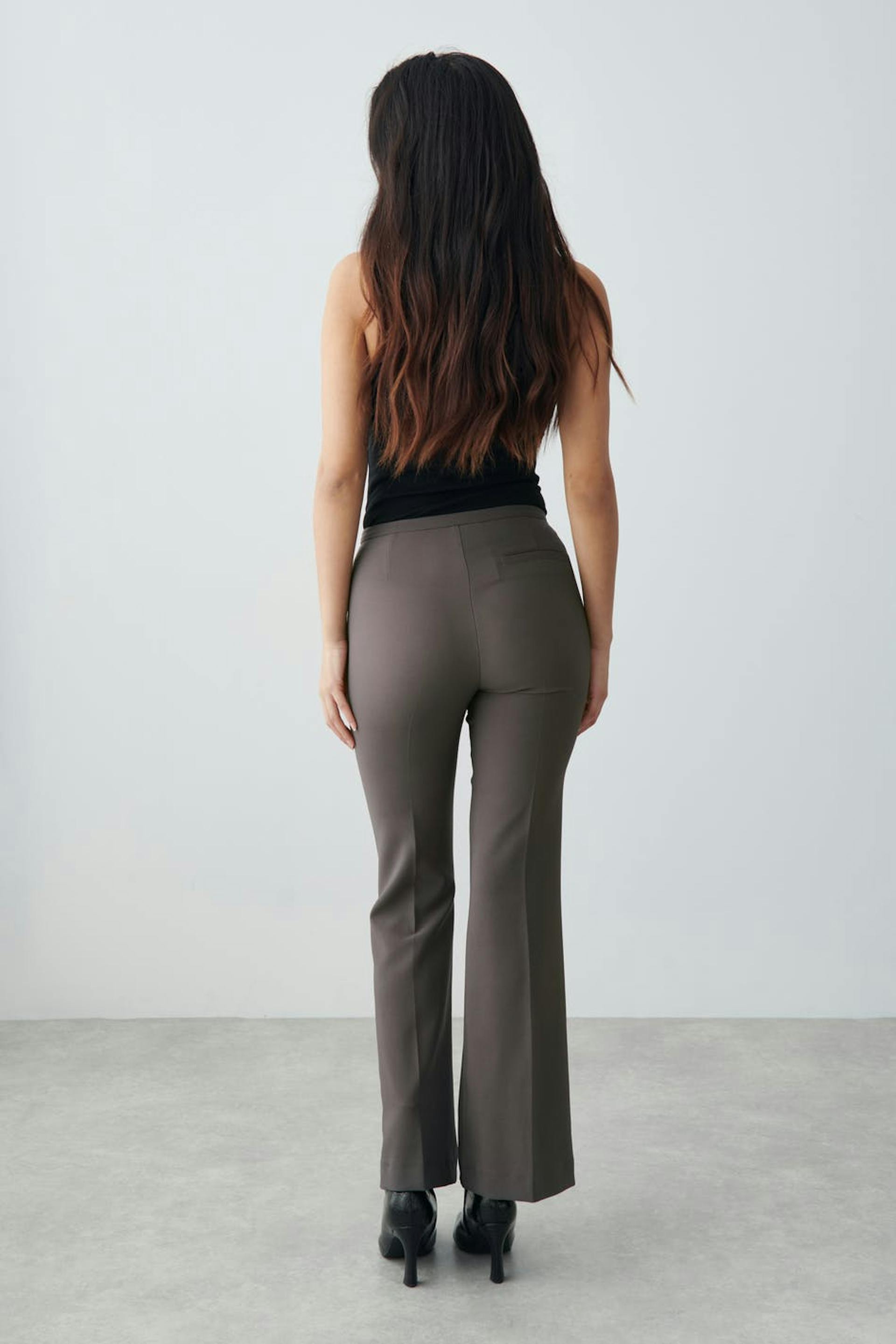 Trousers with a stretch and mid waist. The trousers are grey and have slim fit. They have flared legs, side pockets, fake pockets at the back and zip fly.