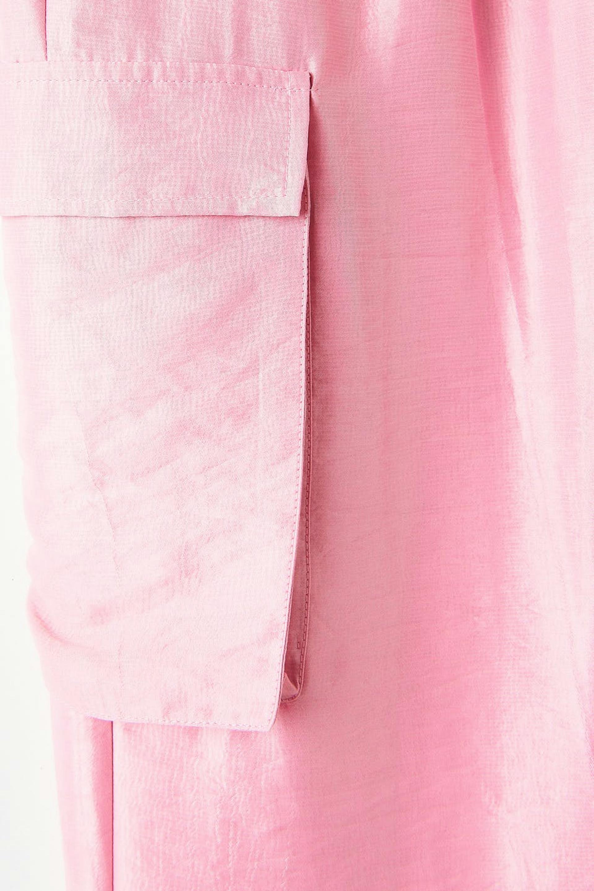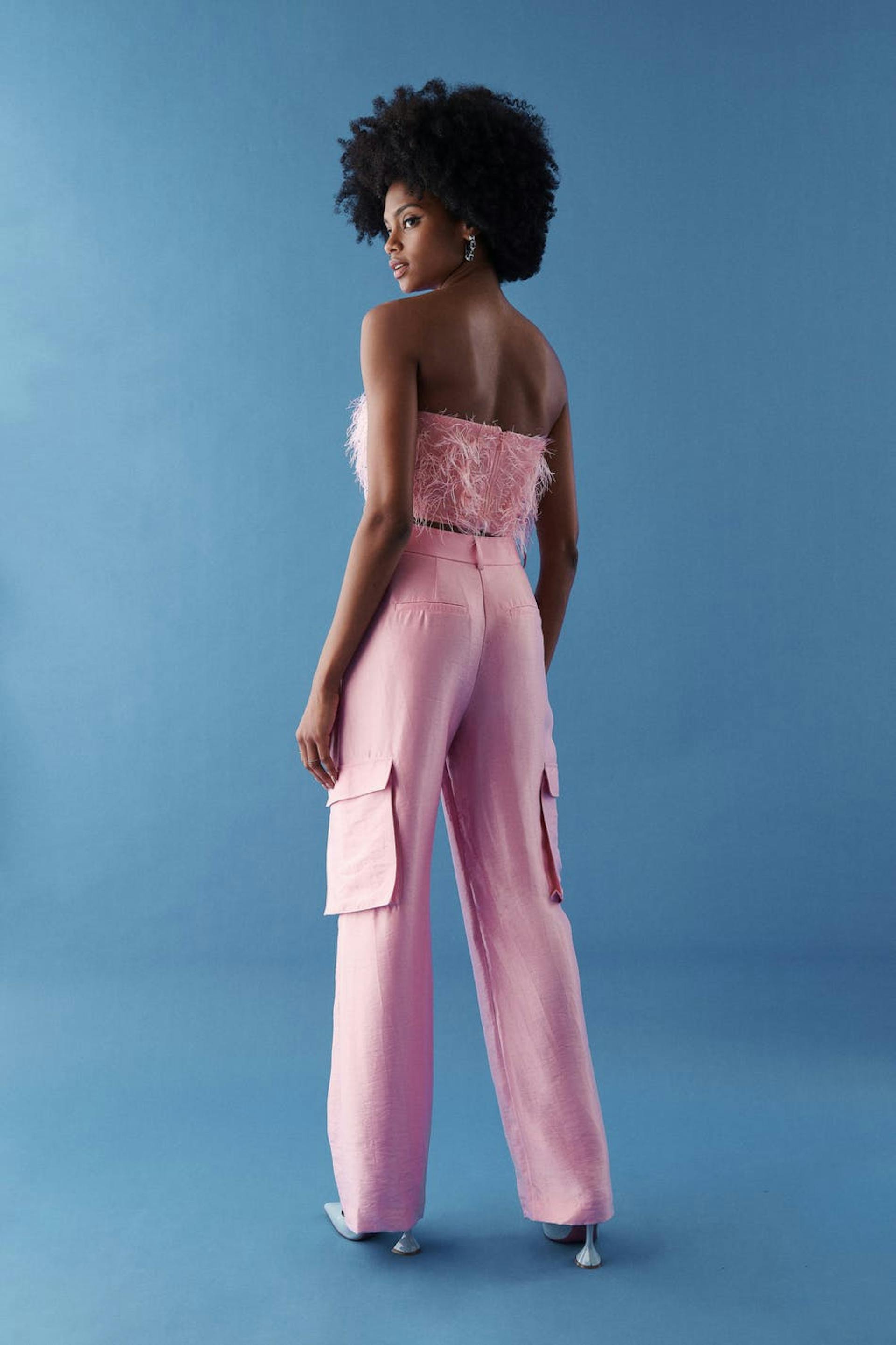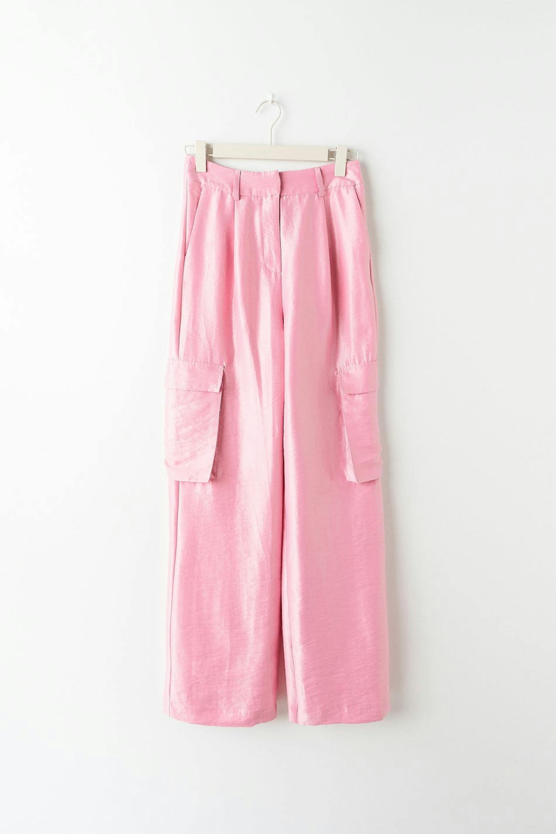 Cargo pants with high waist. The trousers are perfect for the party and pink and have flap pockets along each leg. They have pleats at the front, side pockets, slit pockets at the back and waistband with belt loops.