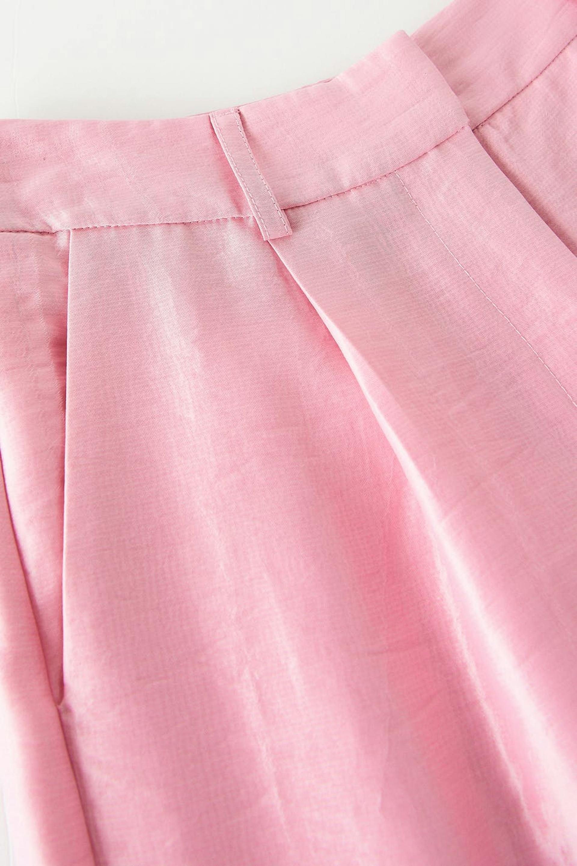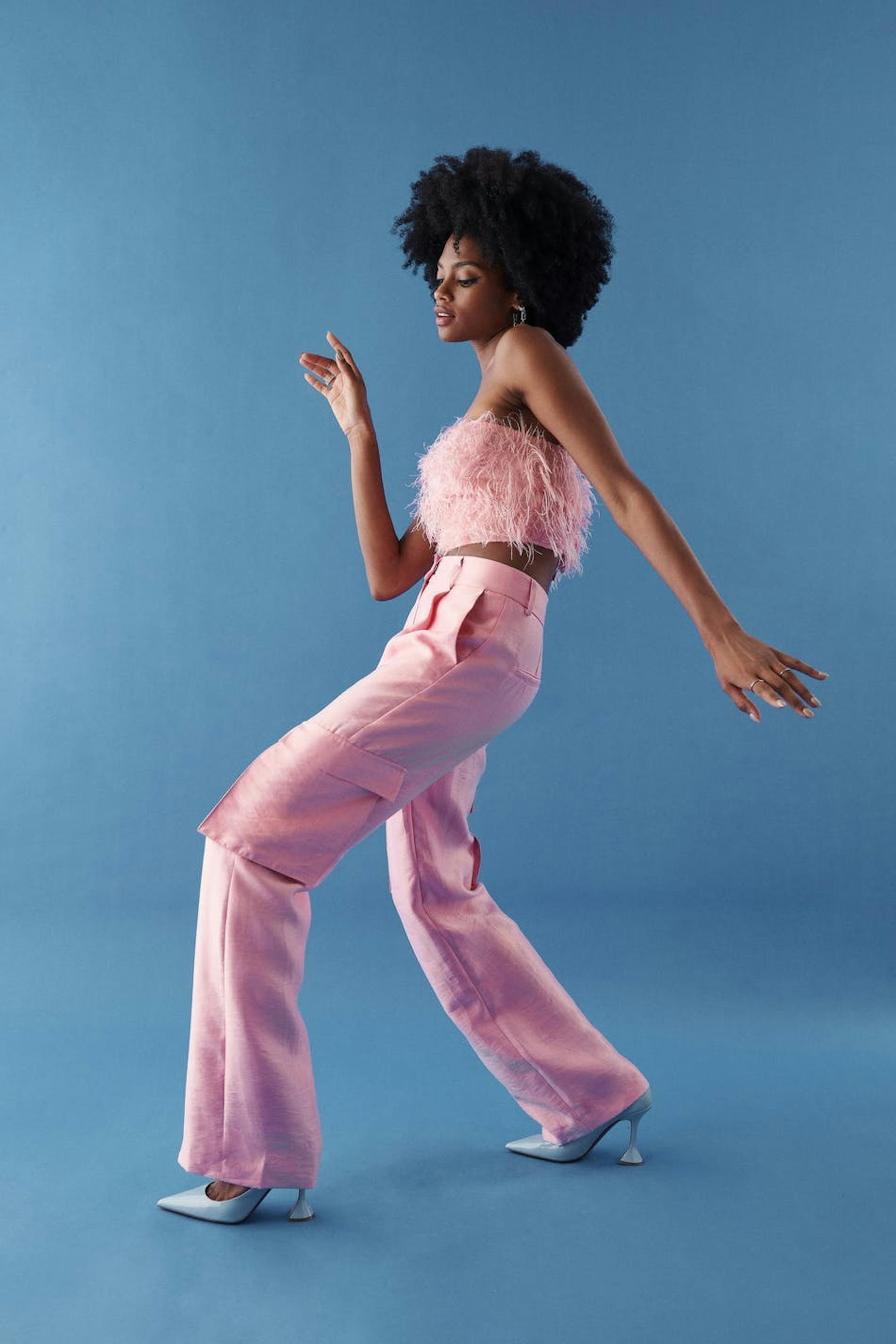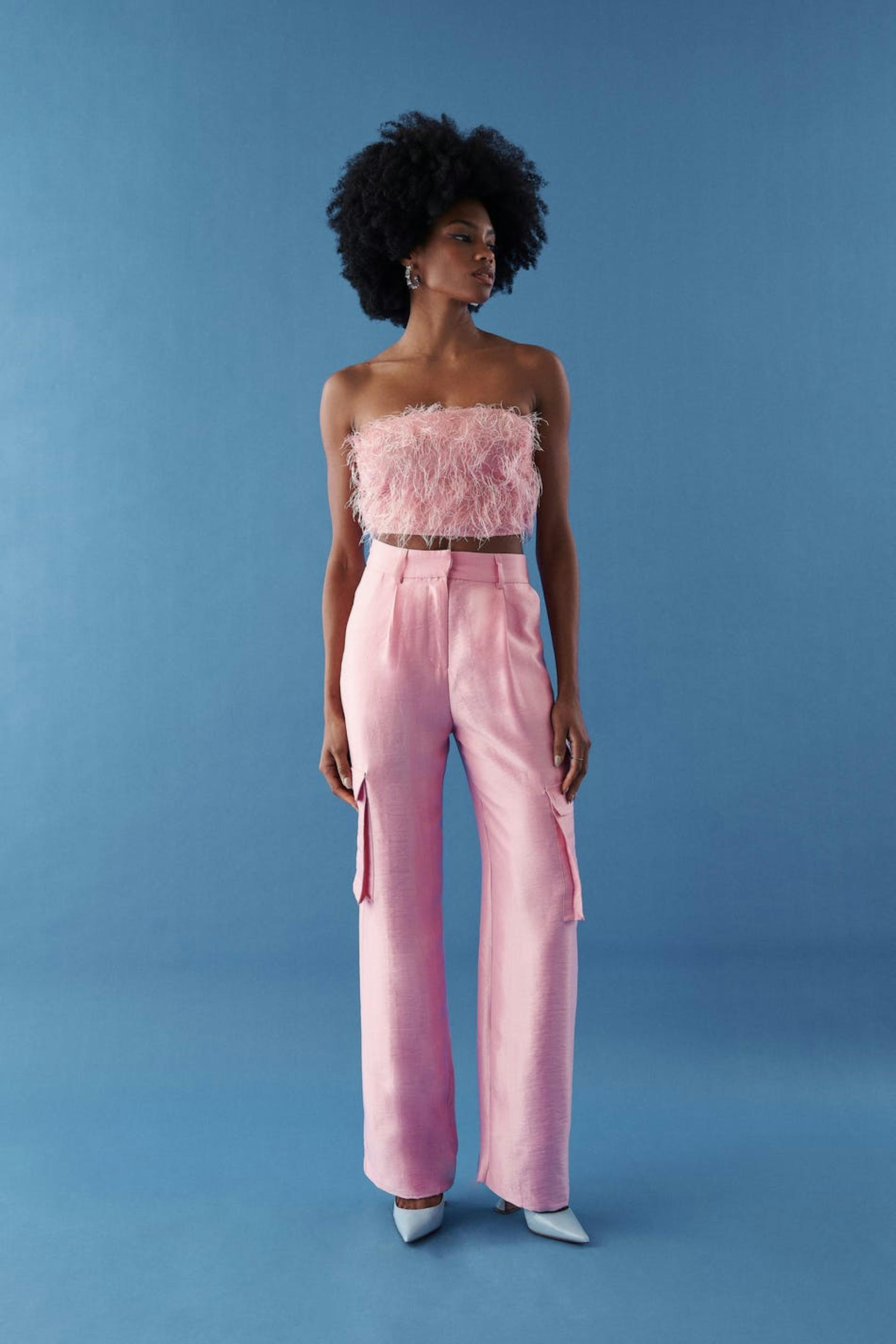 Cargo pants with high waist. The trousers are perfect for the party and pink and have flap pockets along each leg. They have pleats at the front, side pockets, slit pockets at the back and waistband with belt loops.
