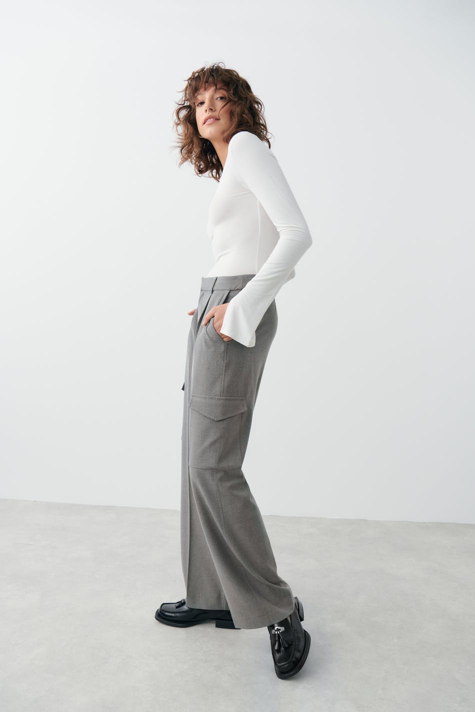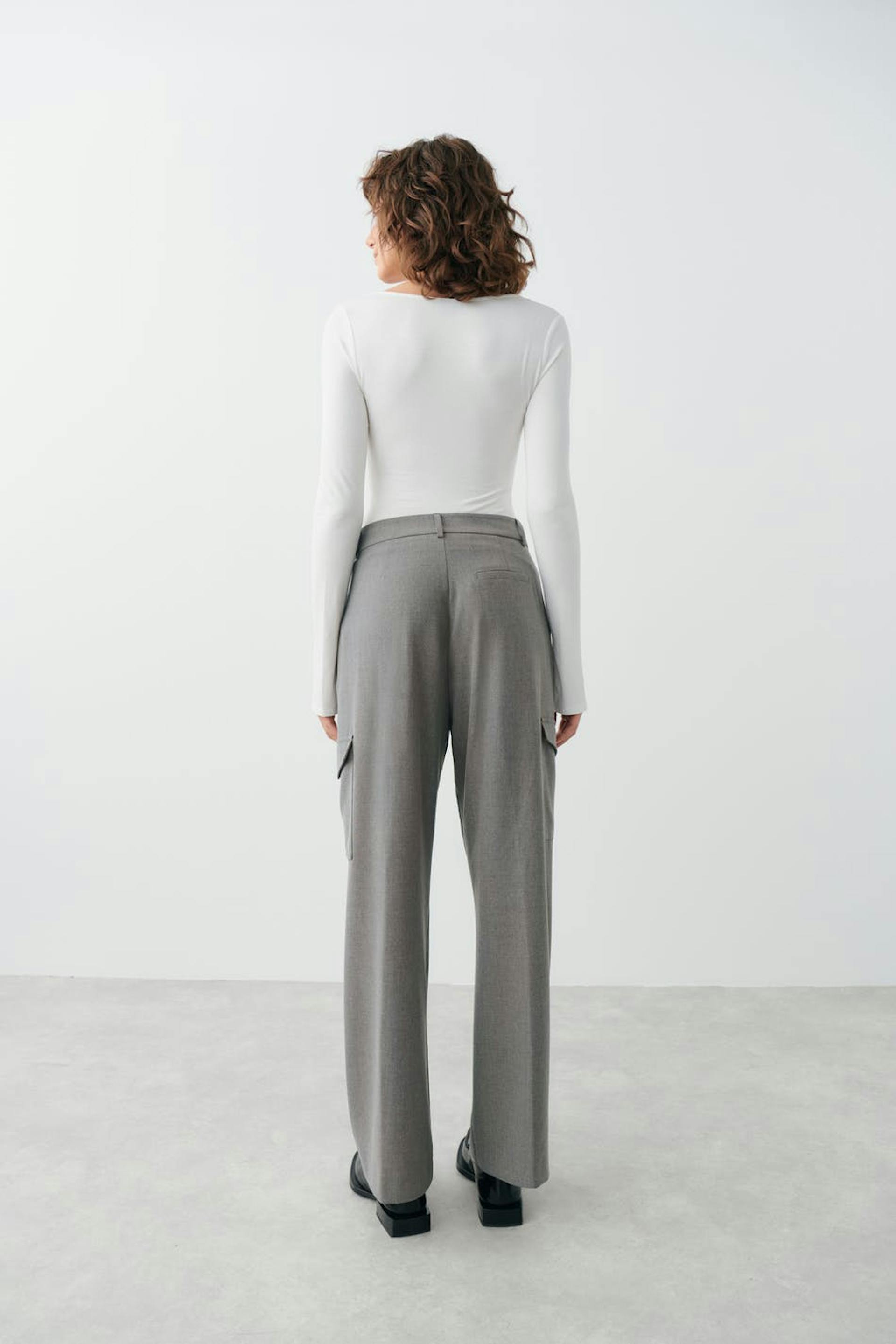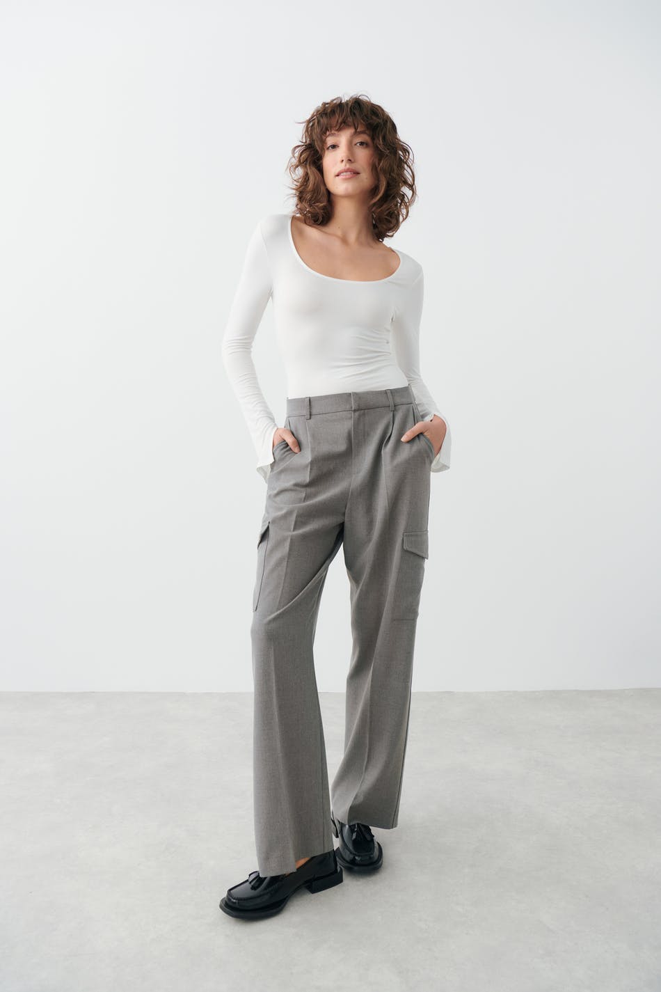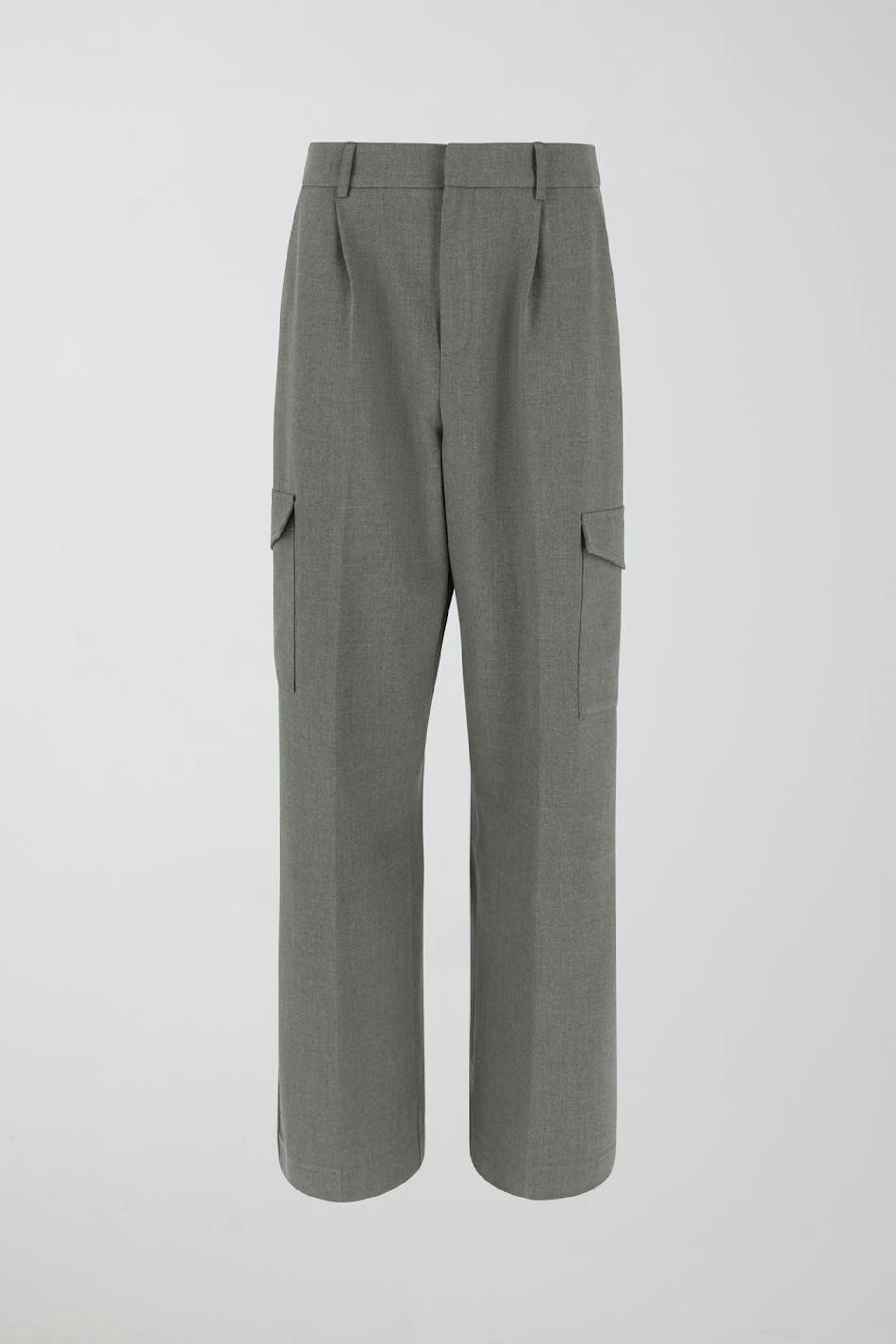 Tailored cargo pants in woven quality with creases at the front. The trousers are grey and have cargo pockets in the sides. They have straight legs, a mid waist, belt loops, side pockets and a welt pocket at the back.