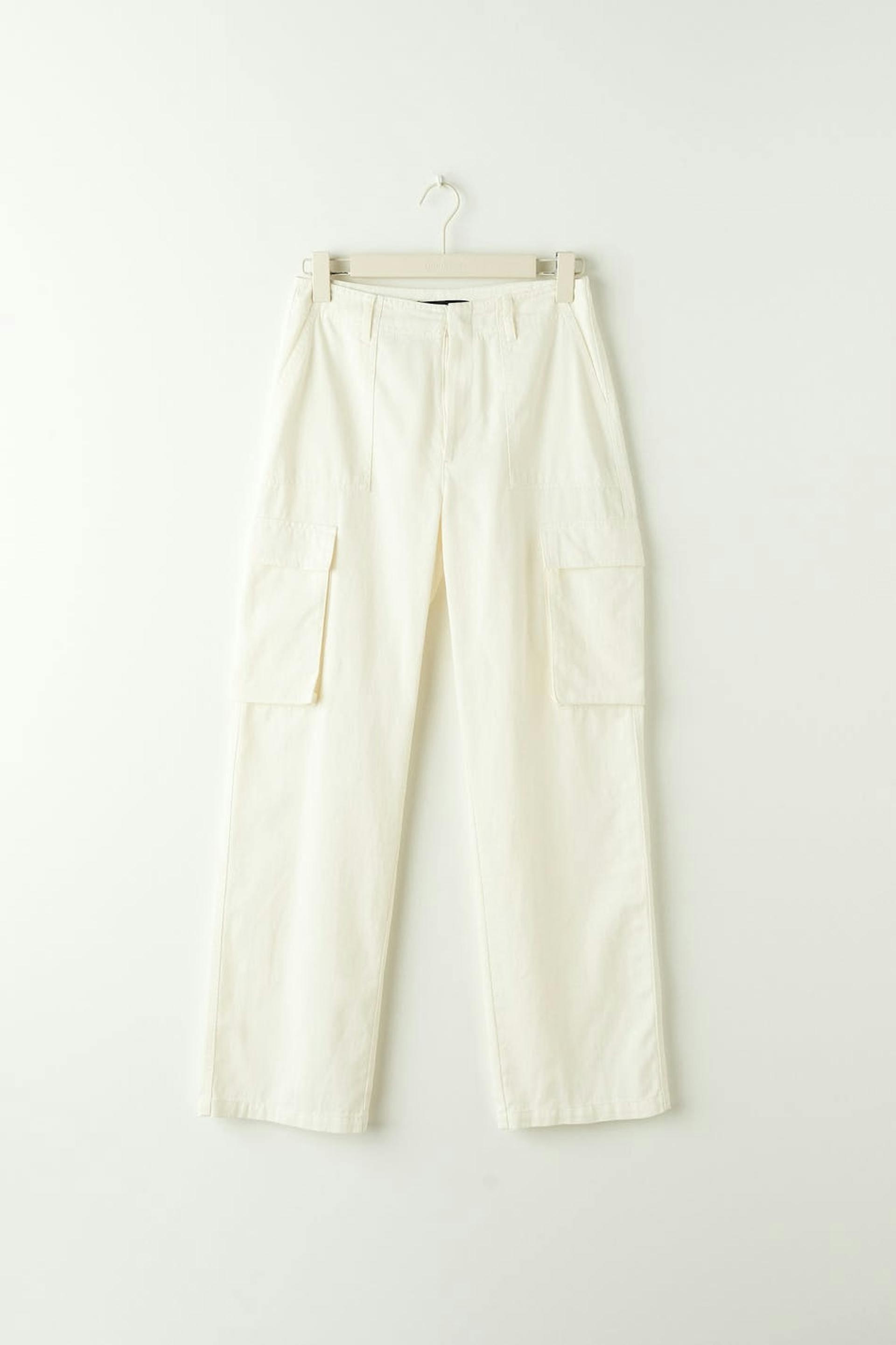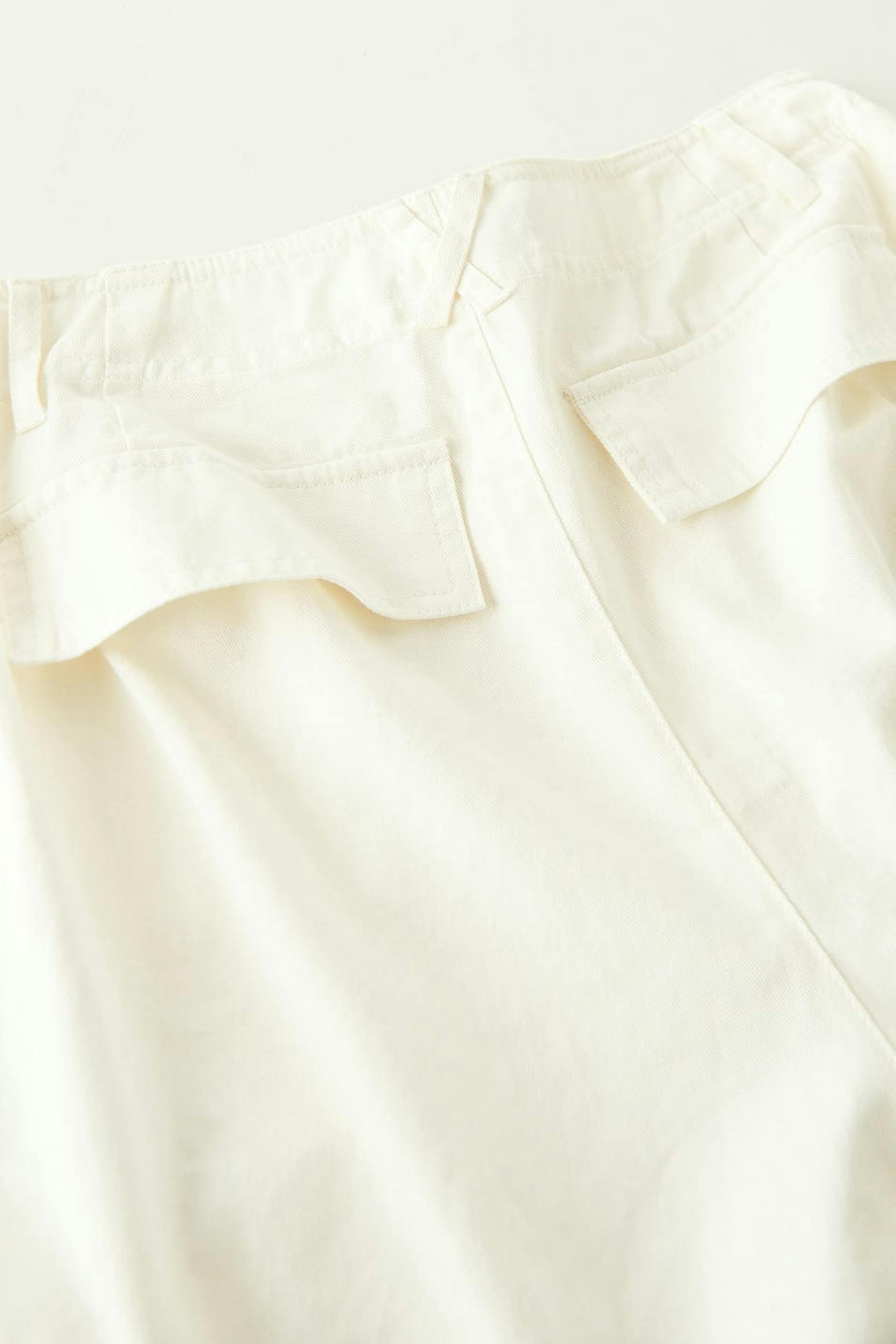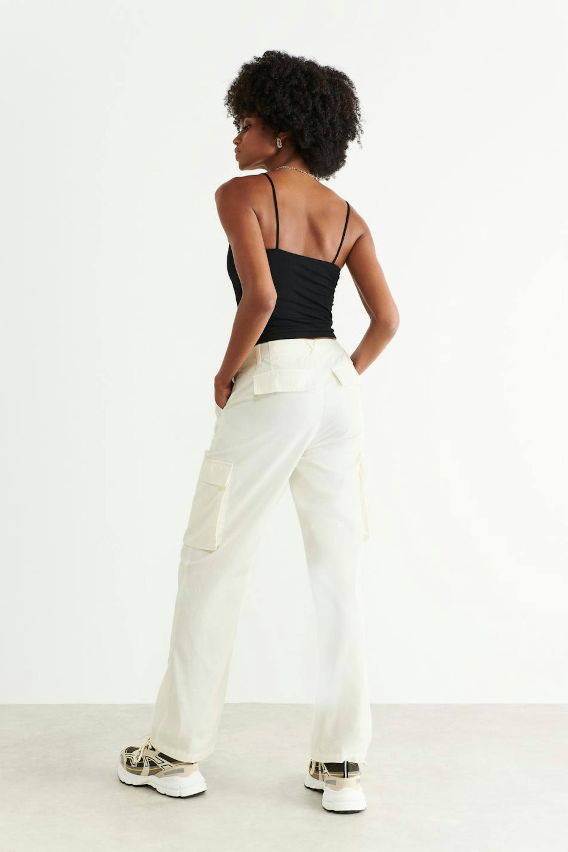 Low-waisted cargo pants with pockets along the sides. The trousers are white and have wide legs. They have zip fly and waistband with belt loops.