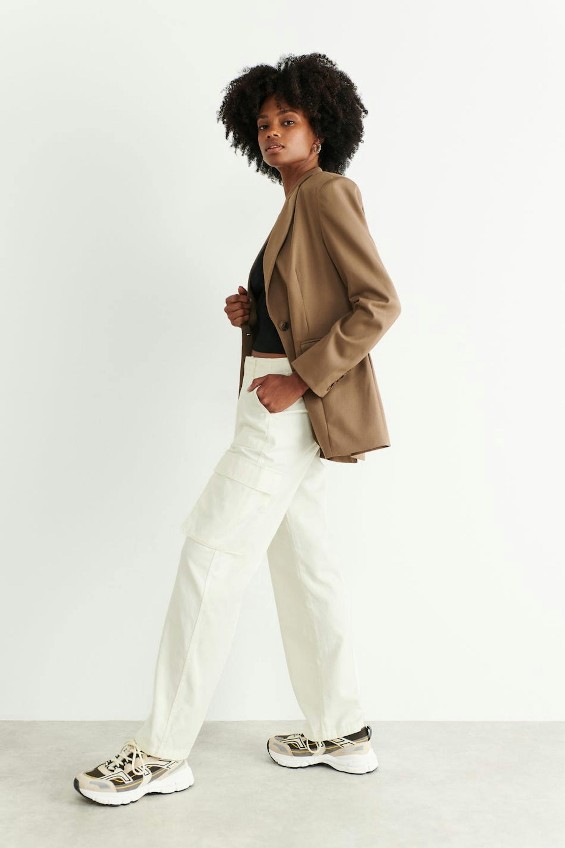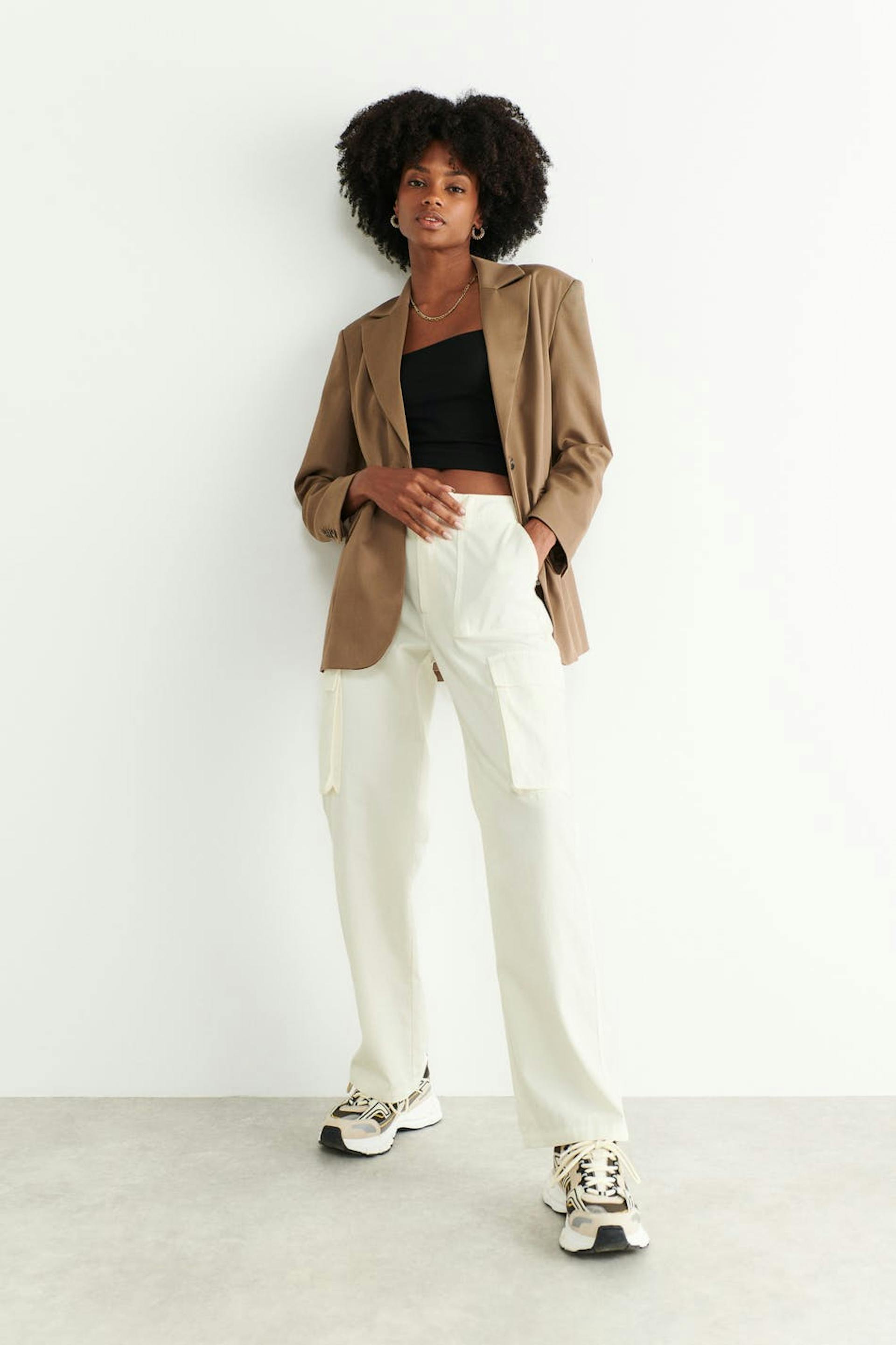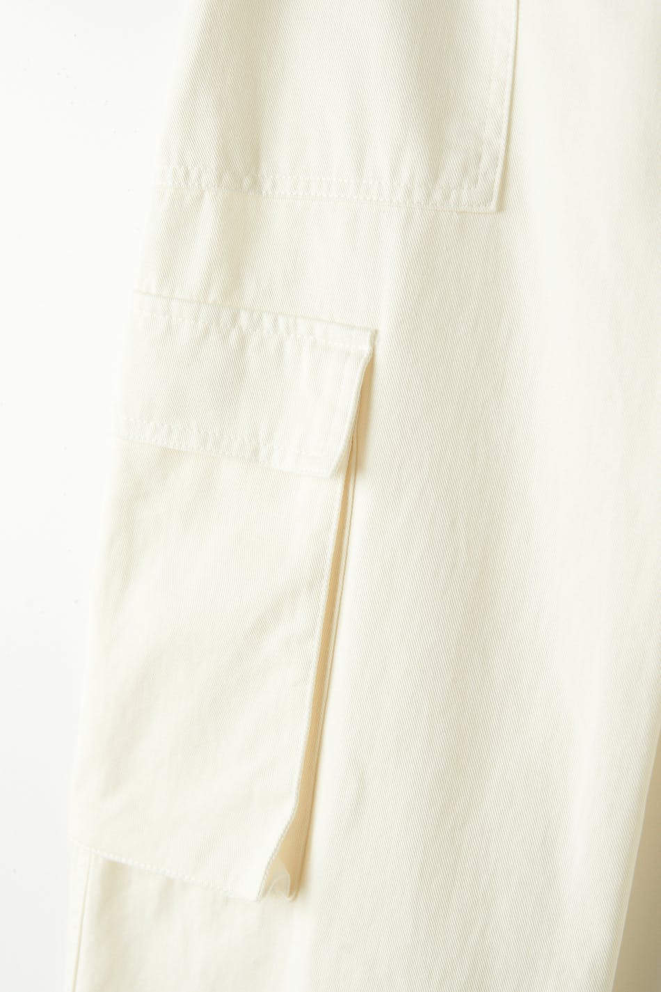 Low-waisted cargo pants with pockets along the sides. The trousers are white and have wide legs. They have zip fly and waistband with belt loops.