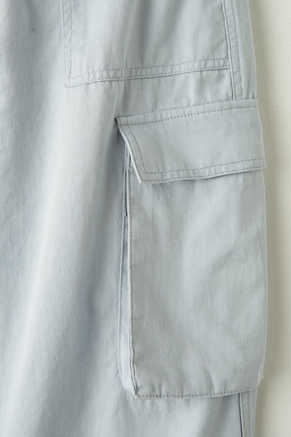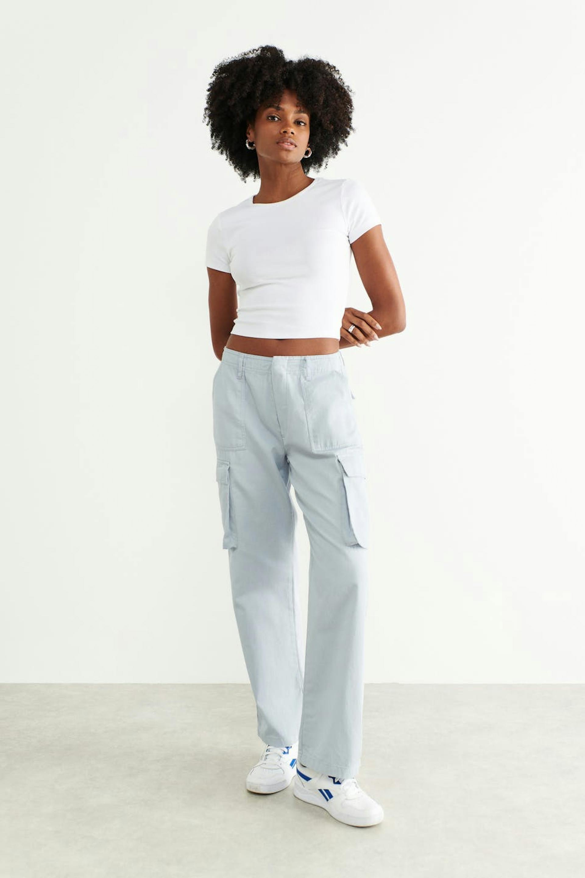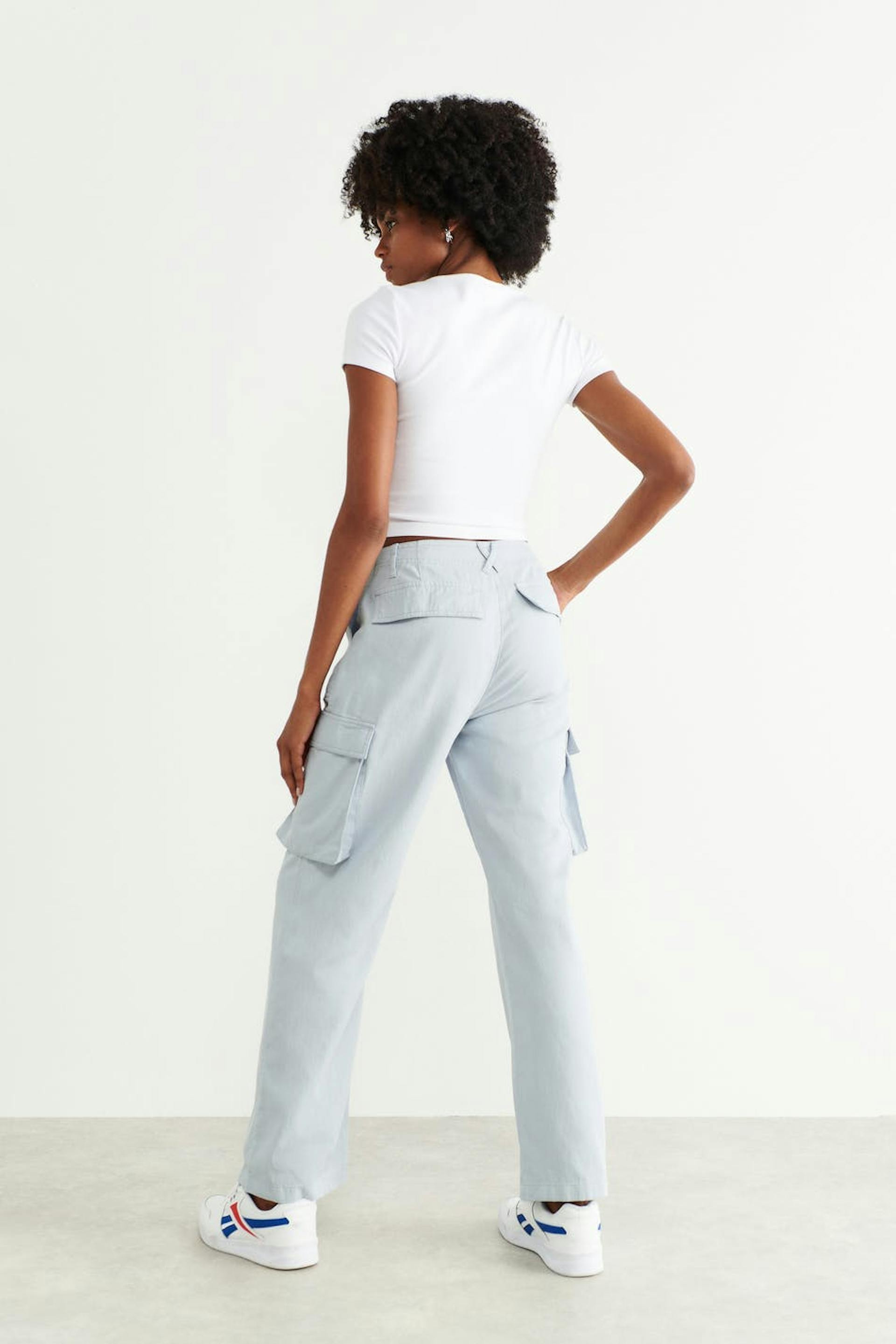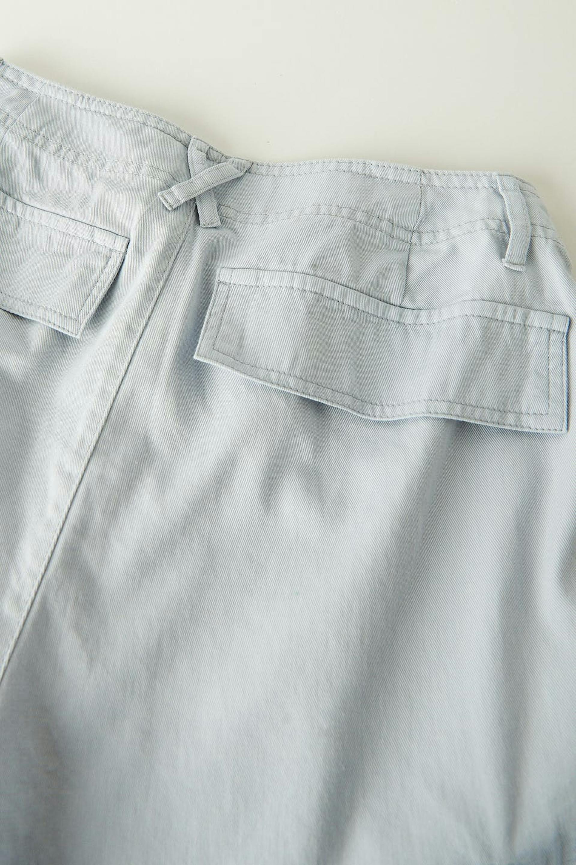 Low-waisted cargo pants with pockets along the sides. The trousers are blue and have wide legs. They have zip fly and waistband with belt loops.