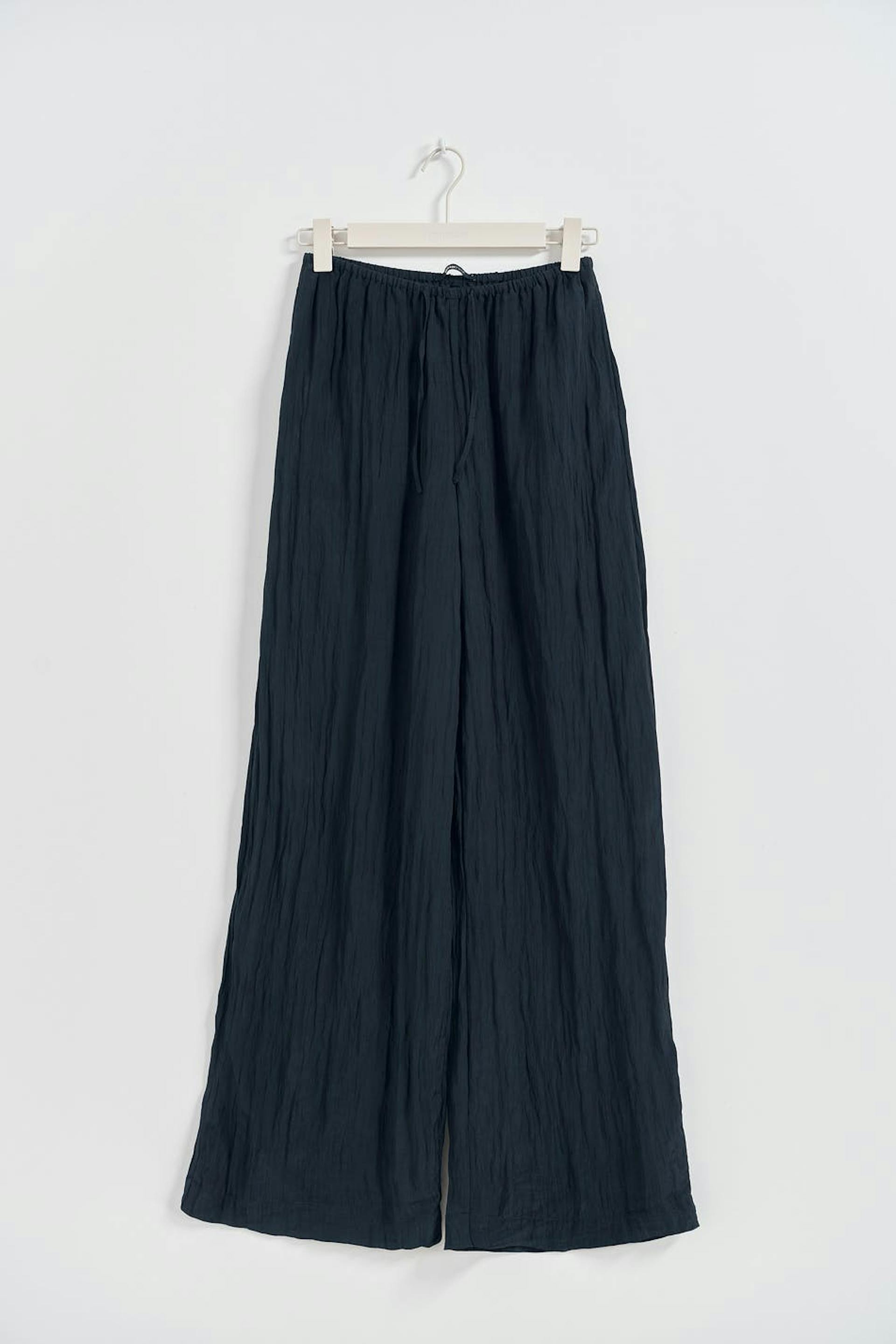 Crinkled trousers with relaxed fit. The trousers are marine and blue and have wide legs with full length. They have side pockets and elastic at the waist with self-tie at the front.