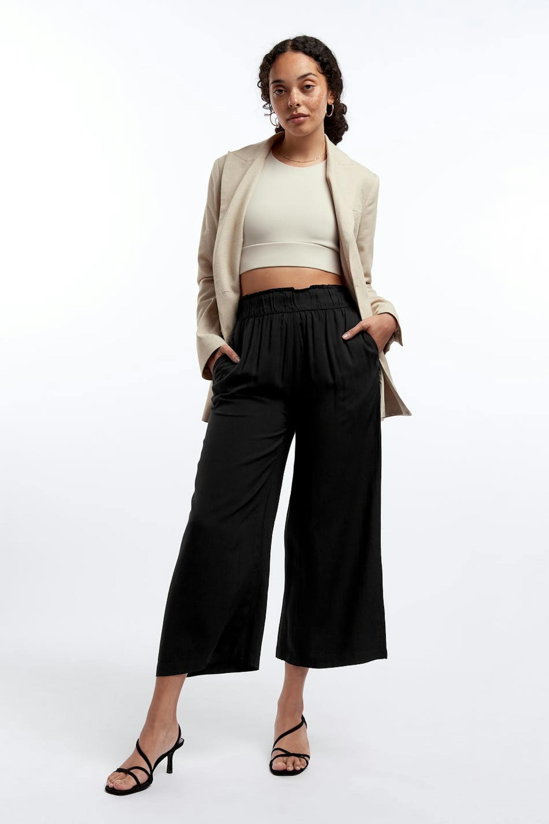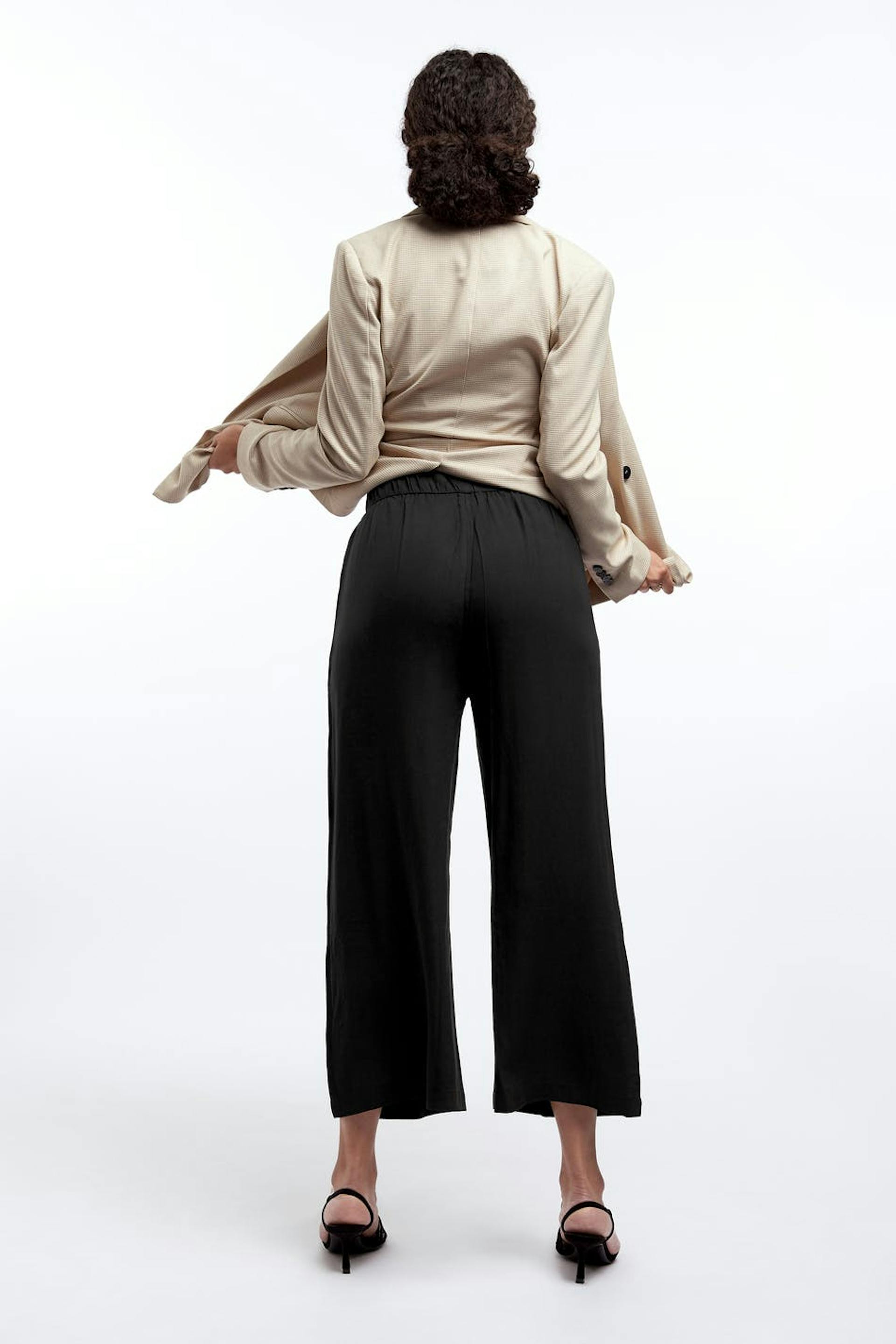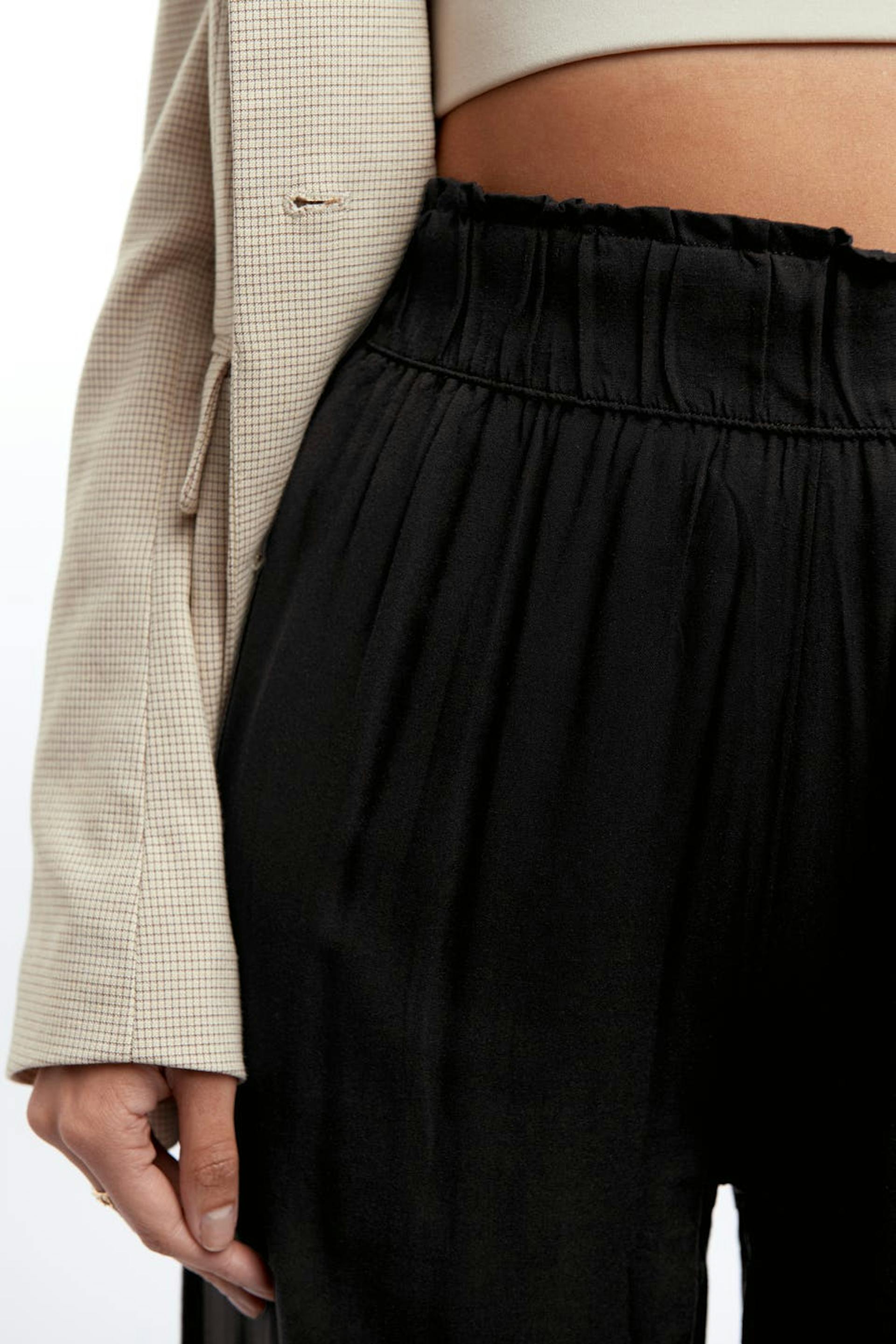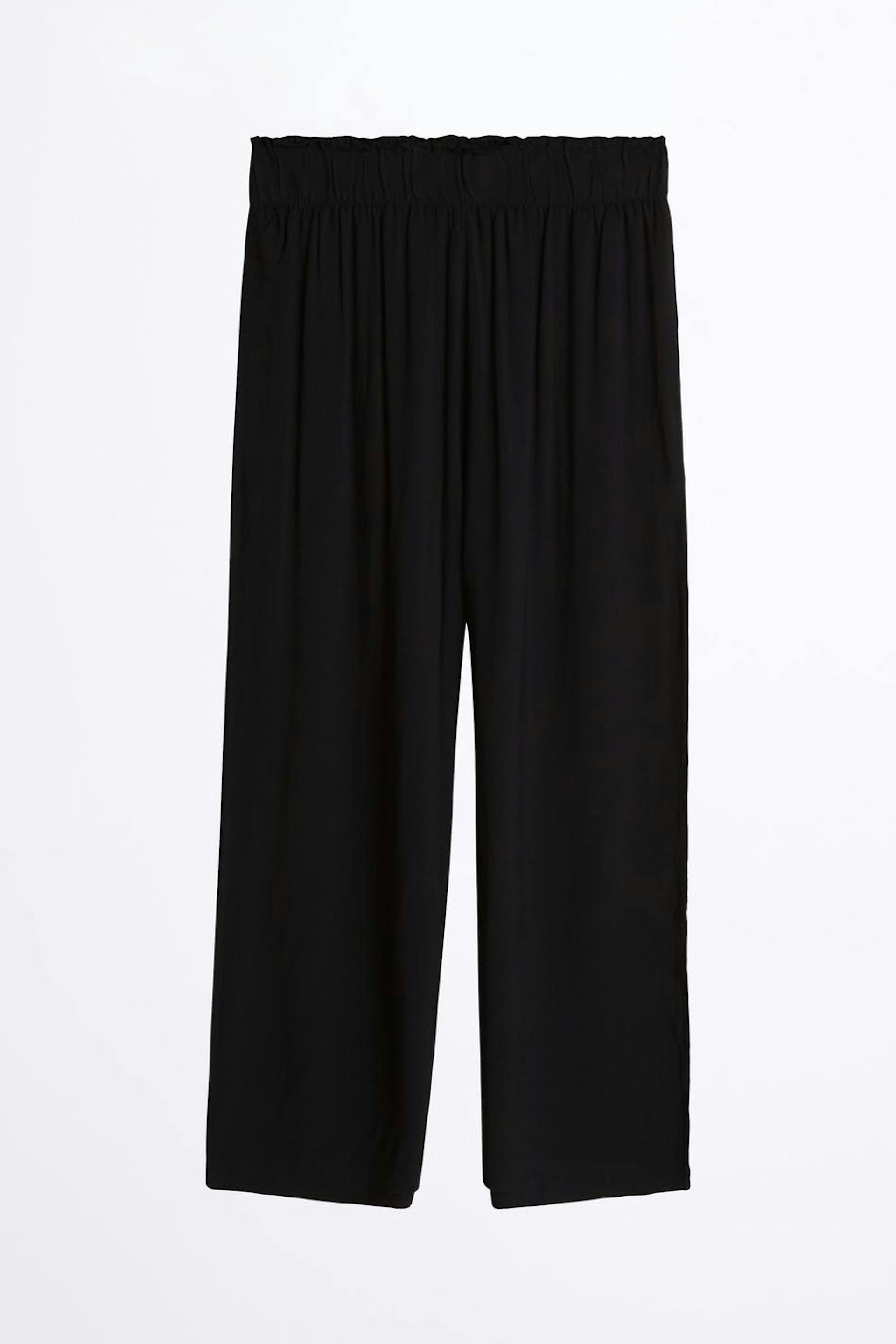 Culottes with wide, short trouser legs. The culottes are black and have a waist in elastic with a ruffle detail. They are made of viscose and have pockets.