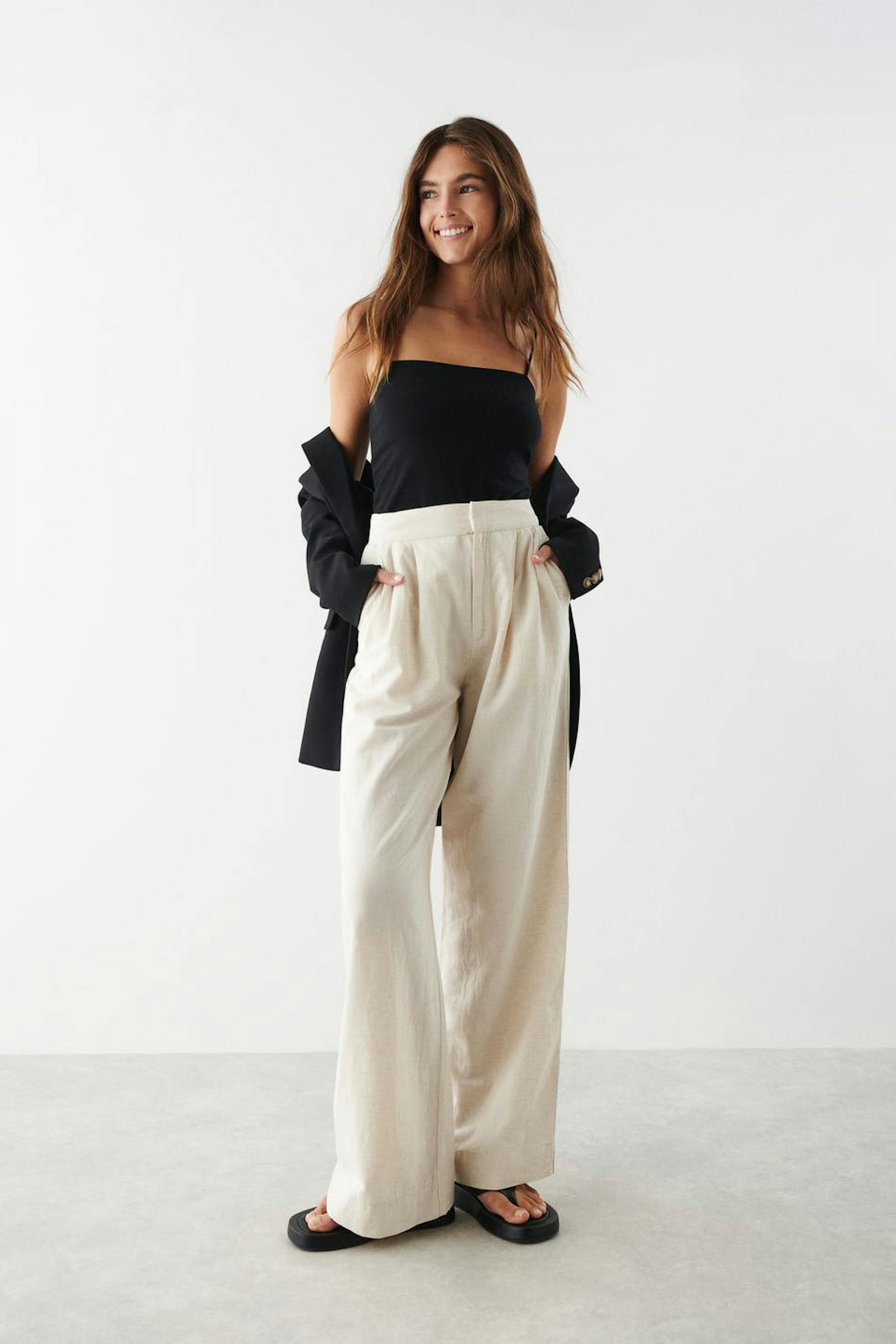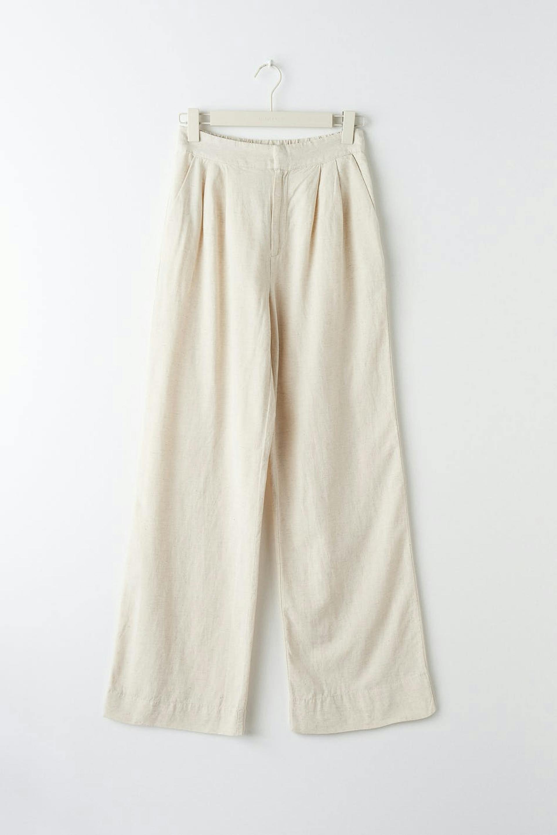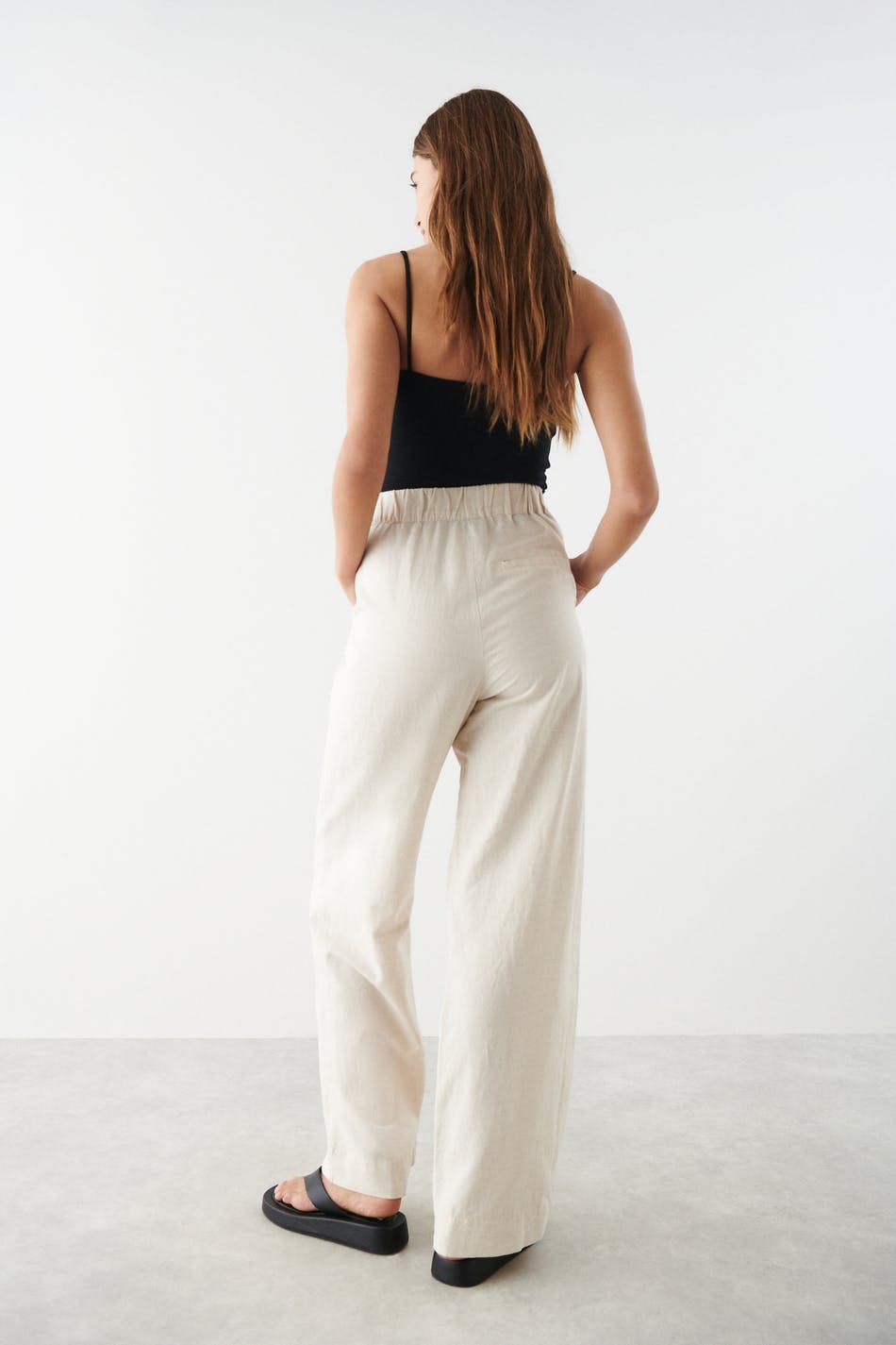 Trousers with pleats at the front. The trousers are beige and have a straight, loose fit. They have side pockets, elastic at the back of the waist and linen look.
