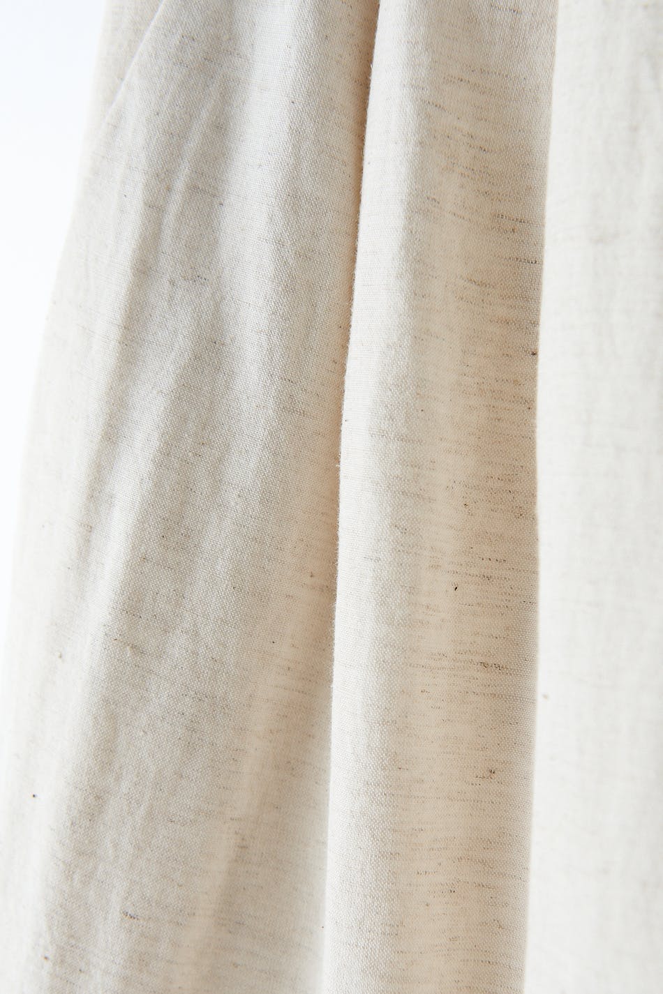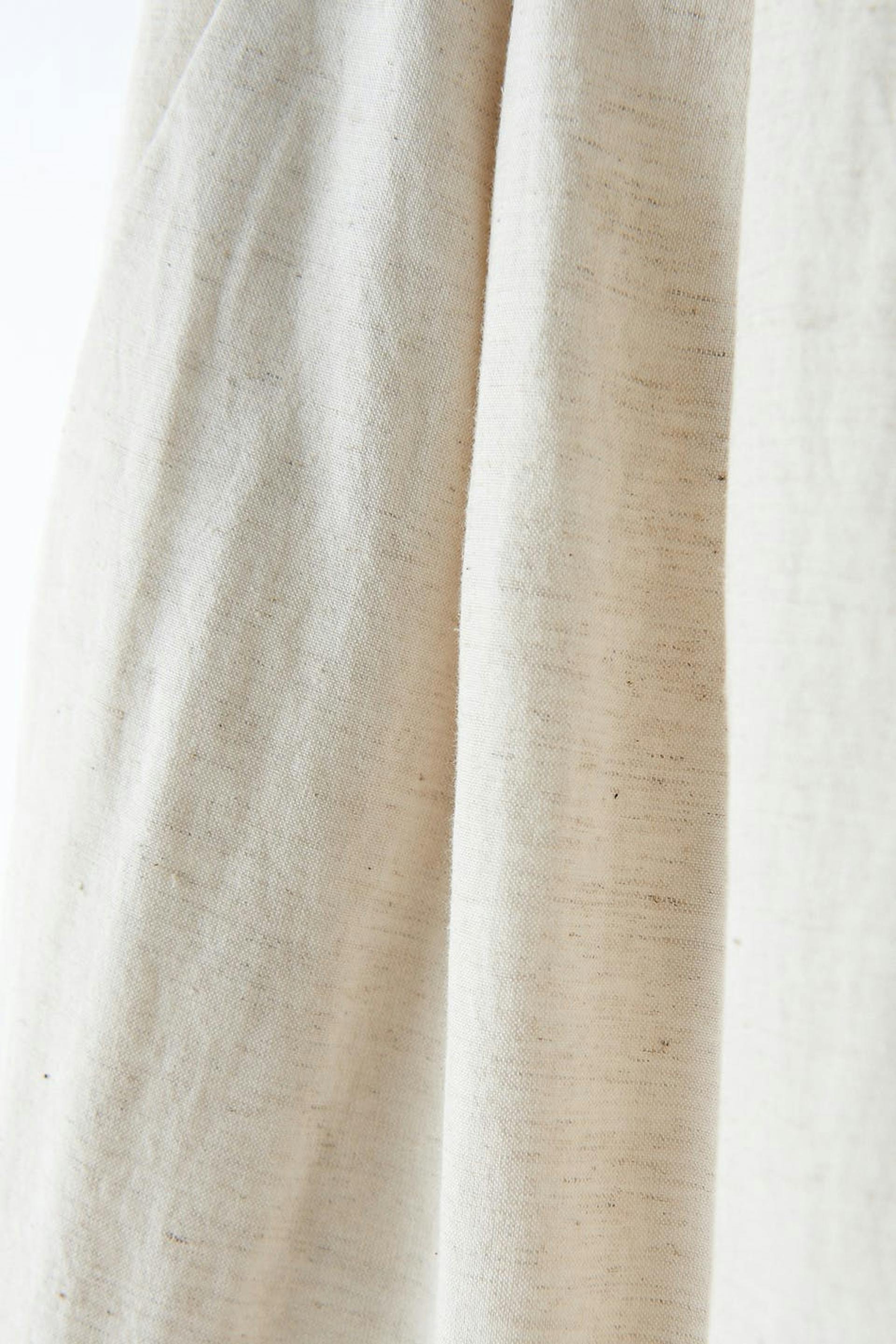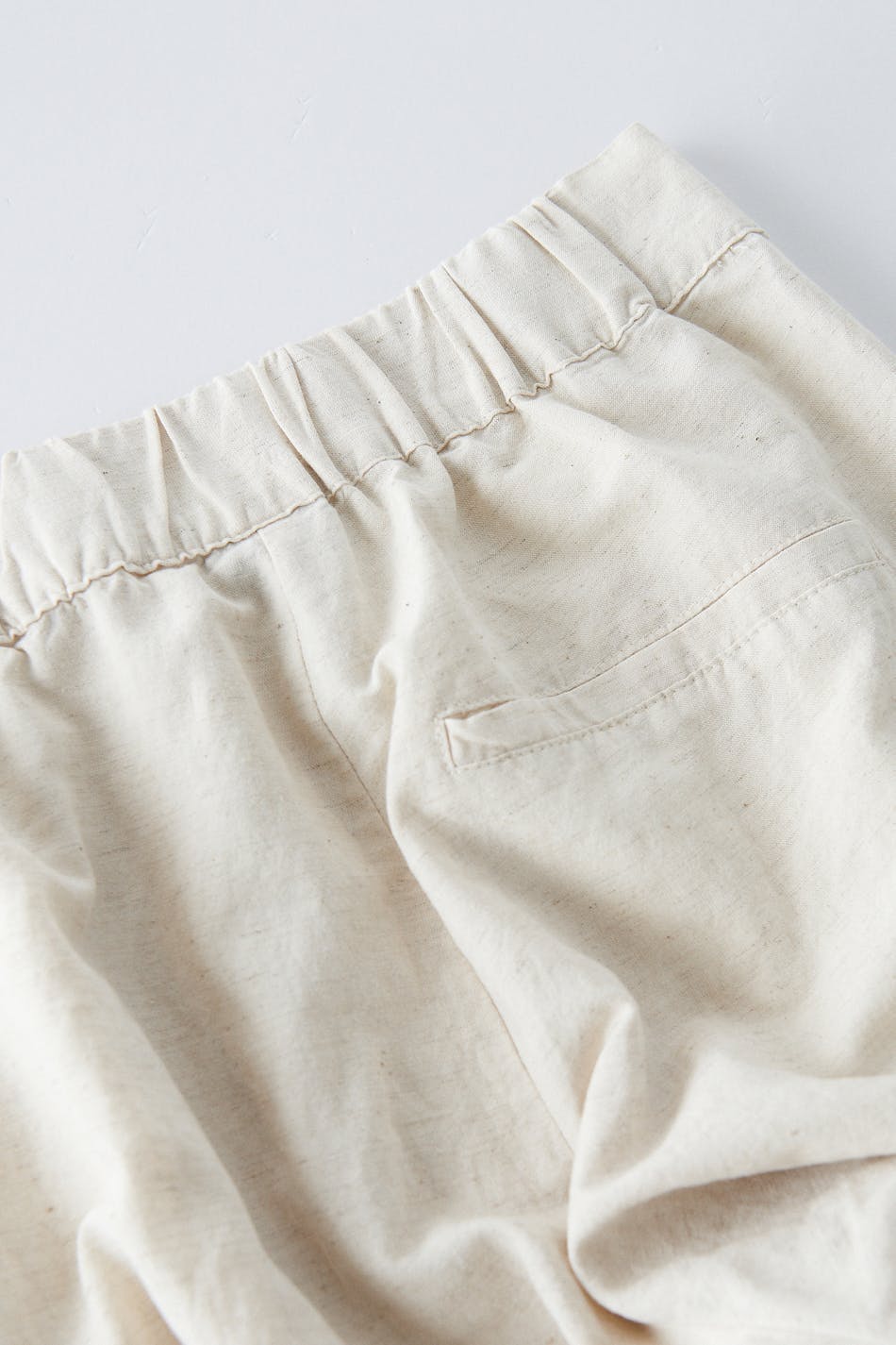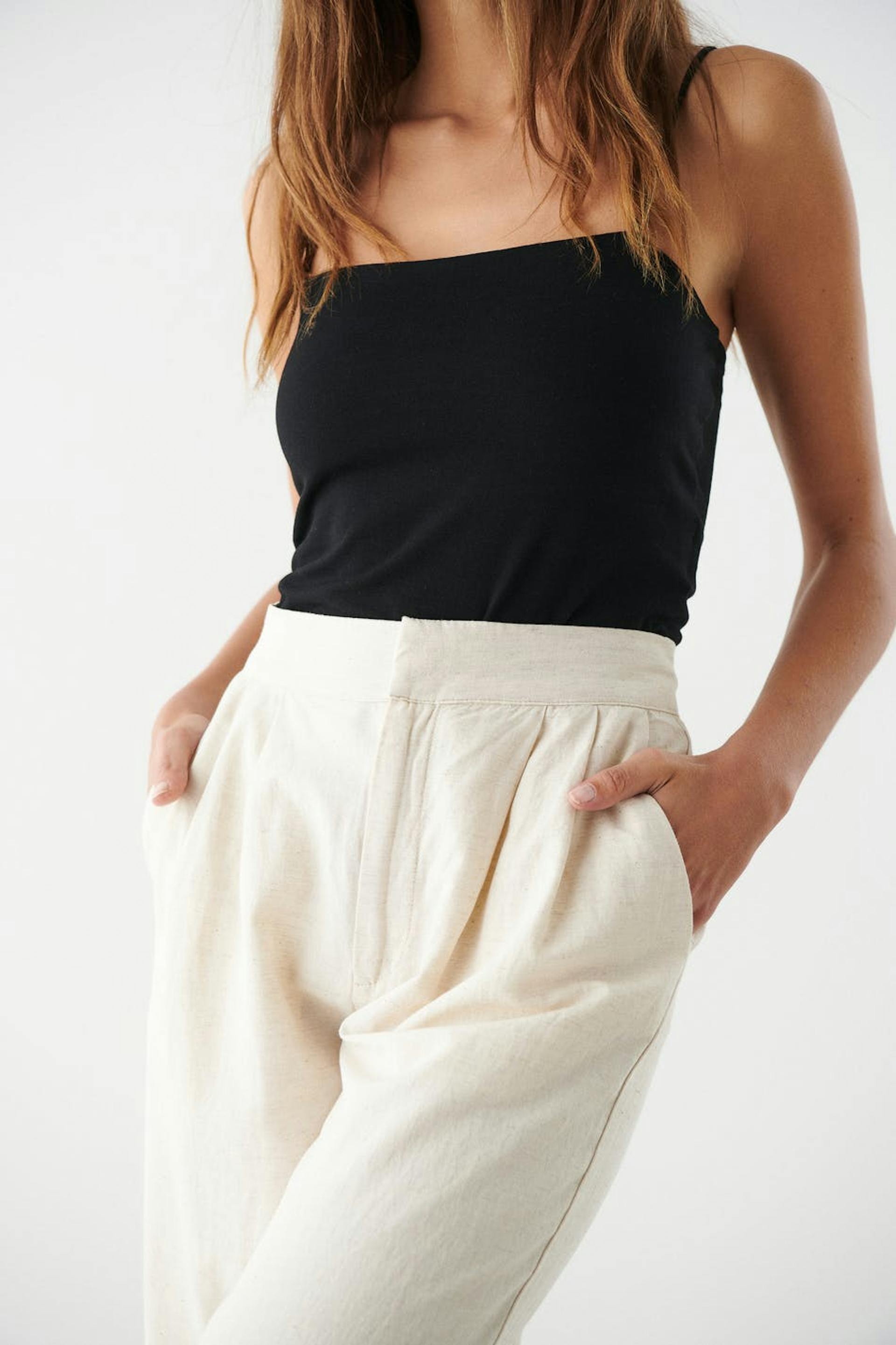 Trousers with pleats at the front. The trousers are beige and have a straight, loose fit. They have side pockets, elastic at the back of the waist and linen look.