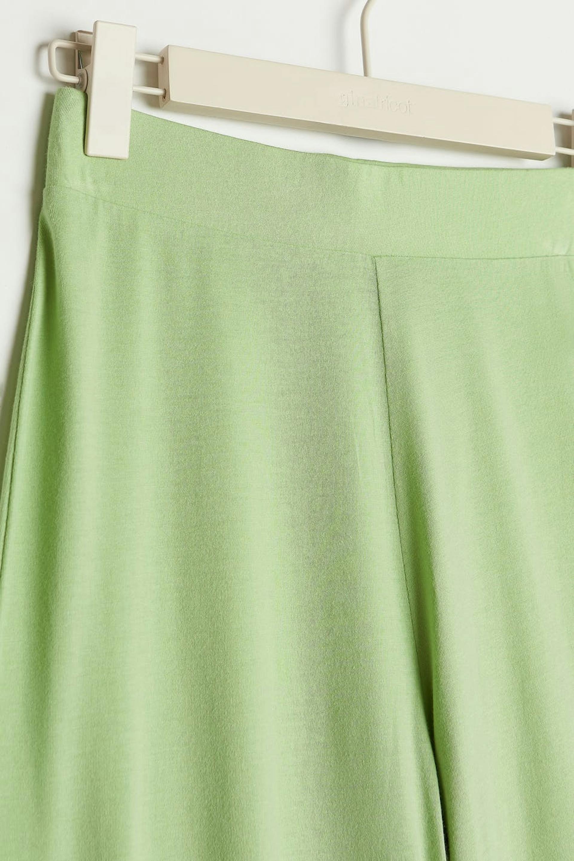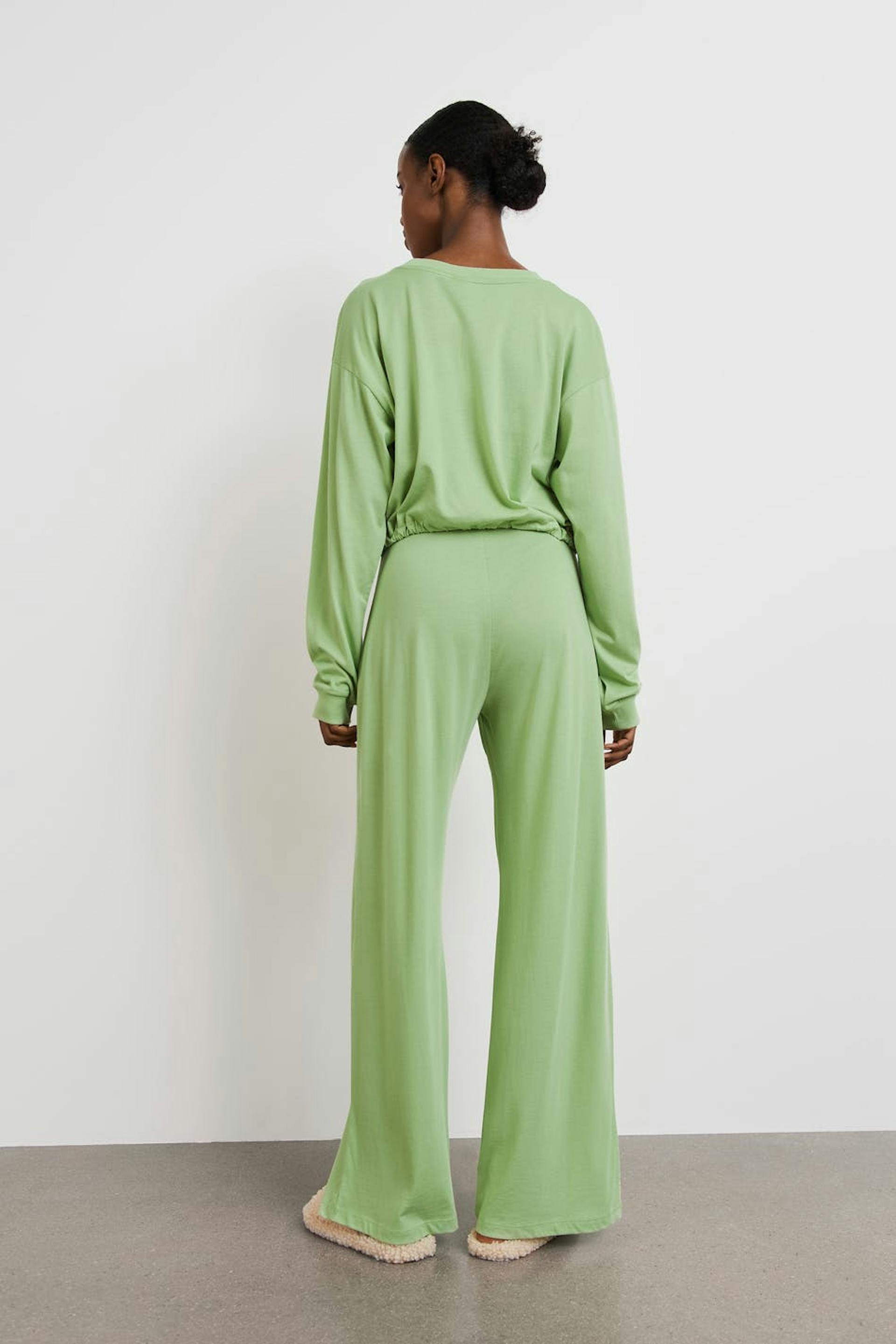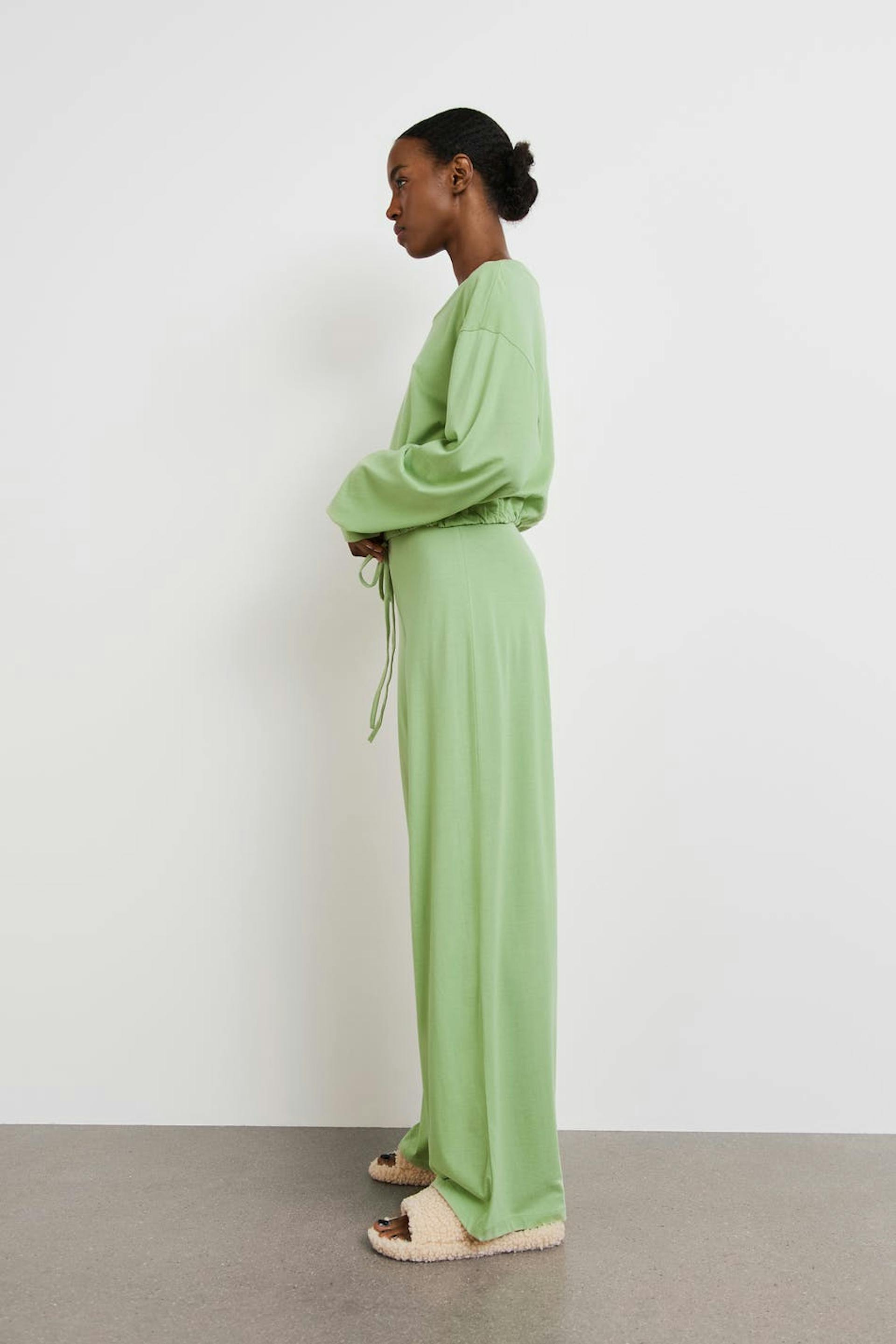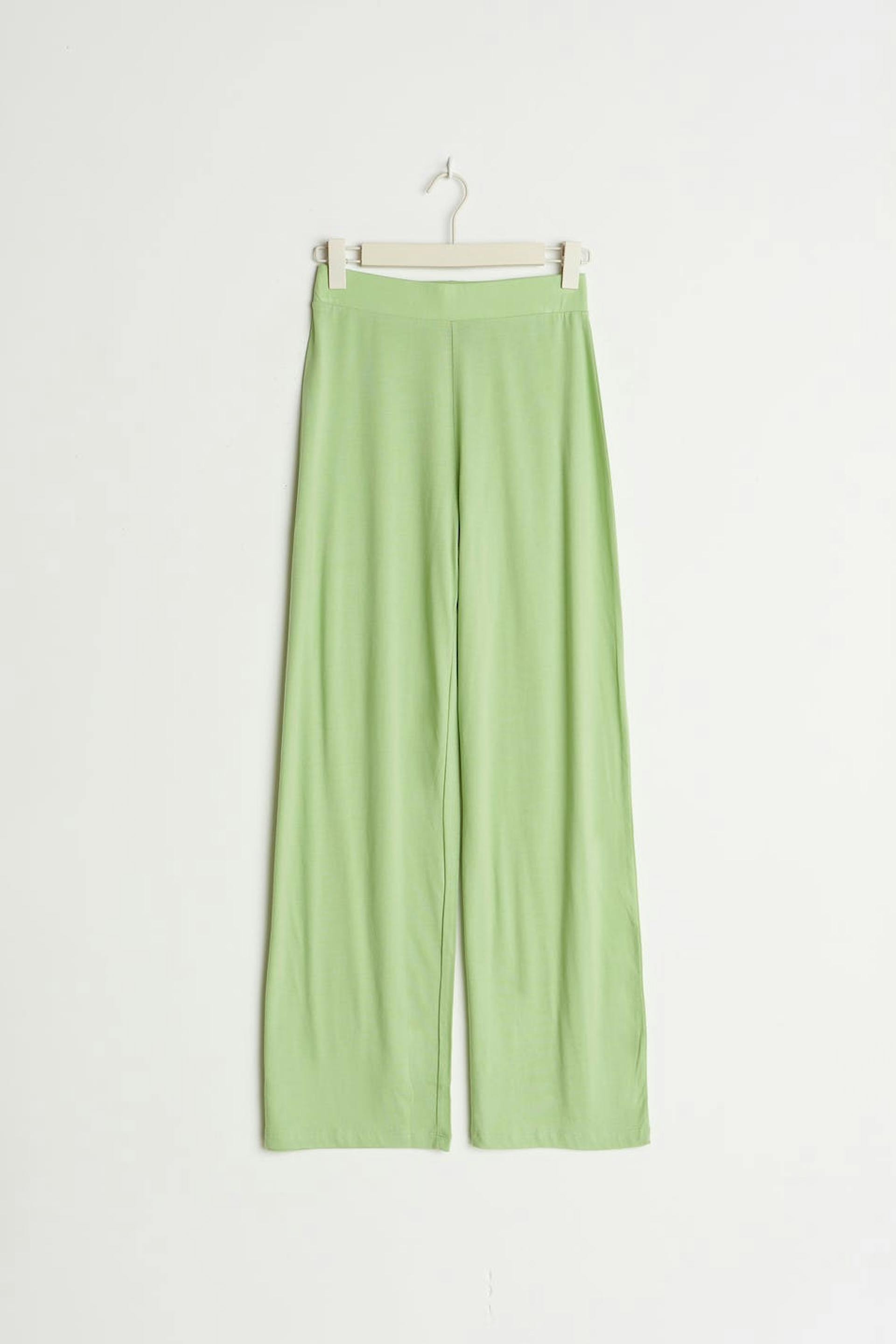 Lounge pants with a regular fit. The trousers are green and have straight, long trouser legs. They have an elastic at the waist and a soft quality.