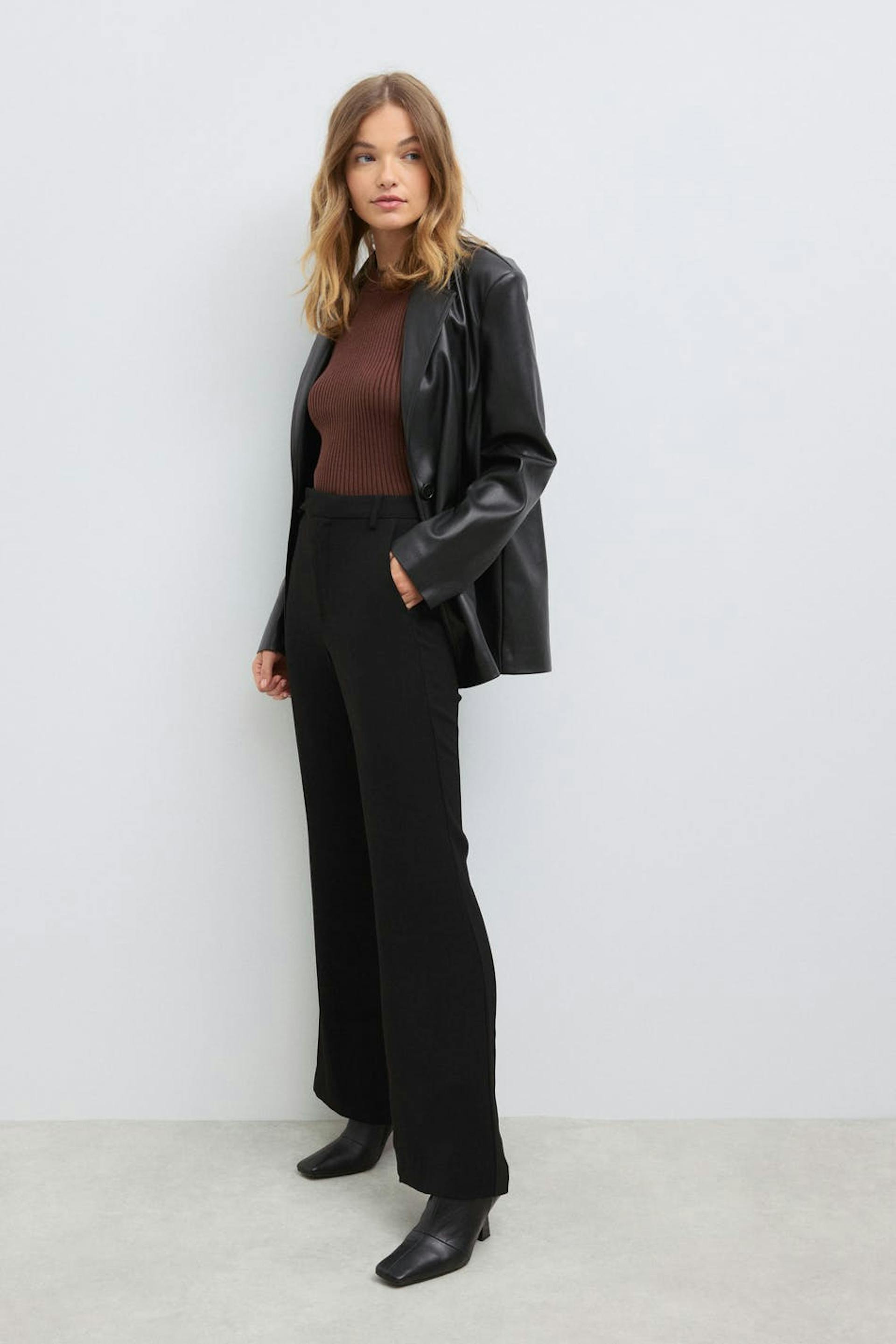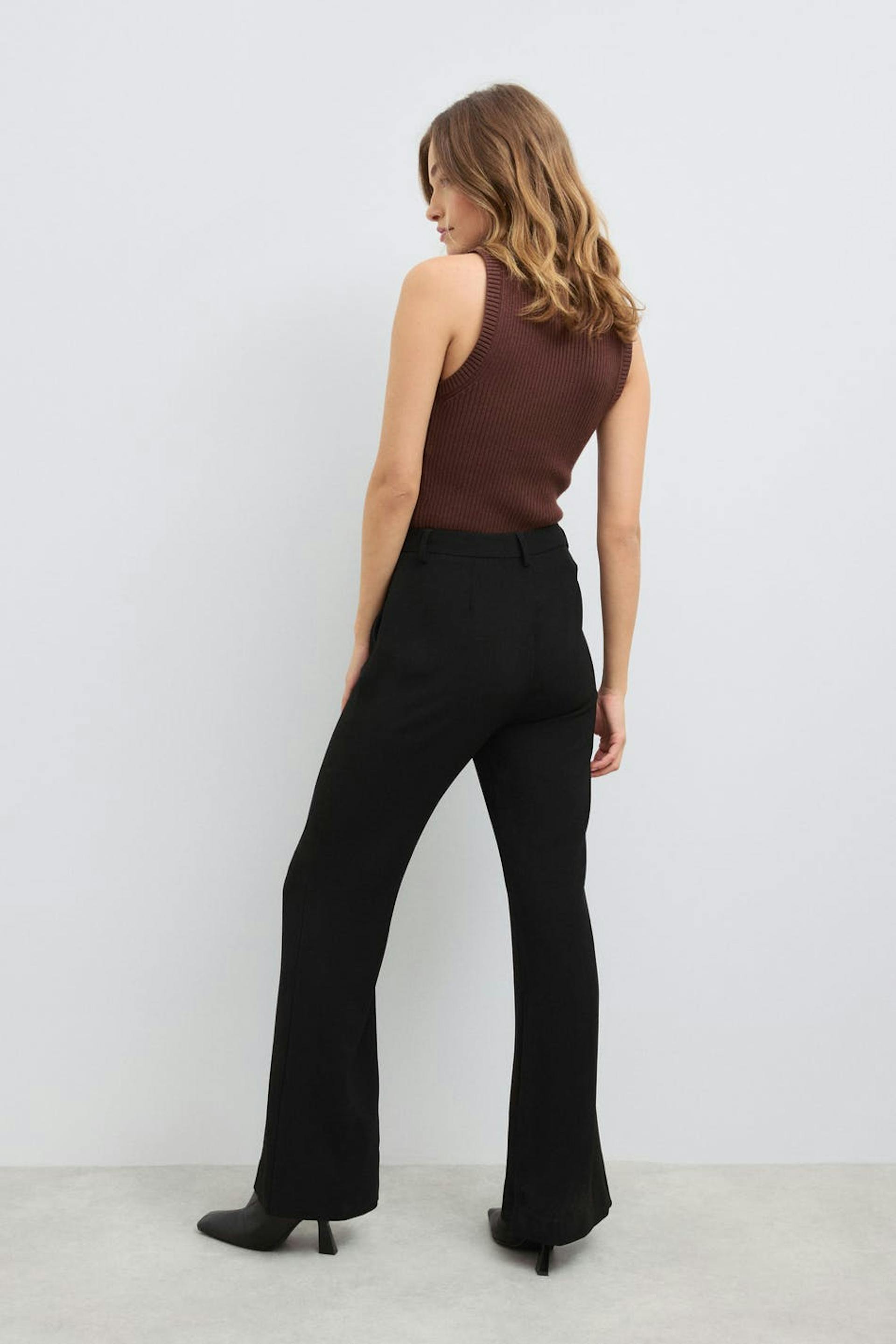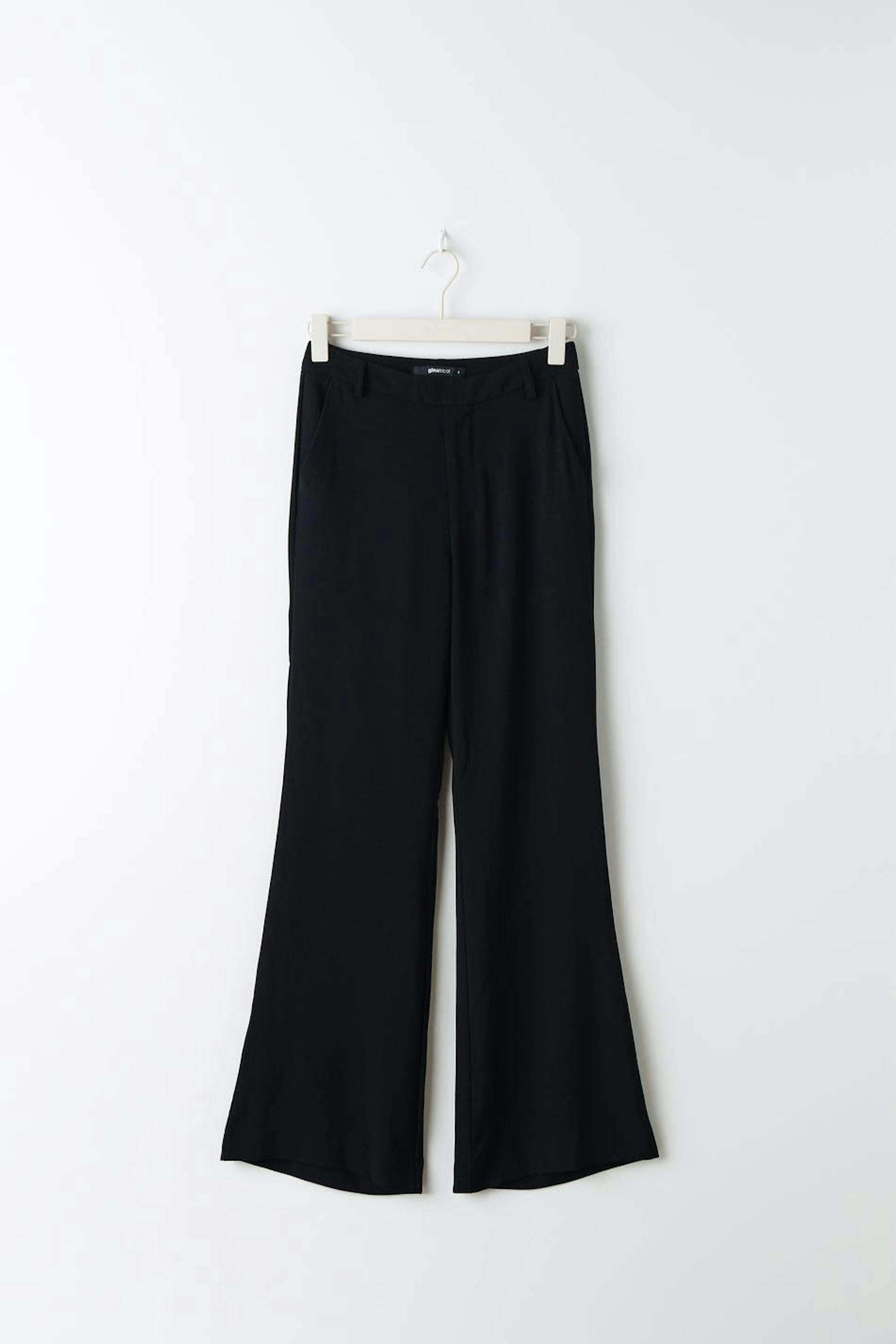 Trousers with flared legs. The trousers are black and have side pockets. They have belt loops, zip fly and long leg length.