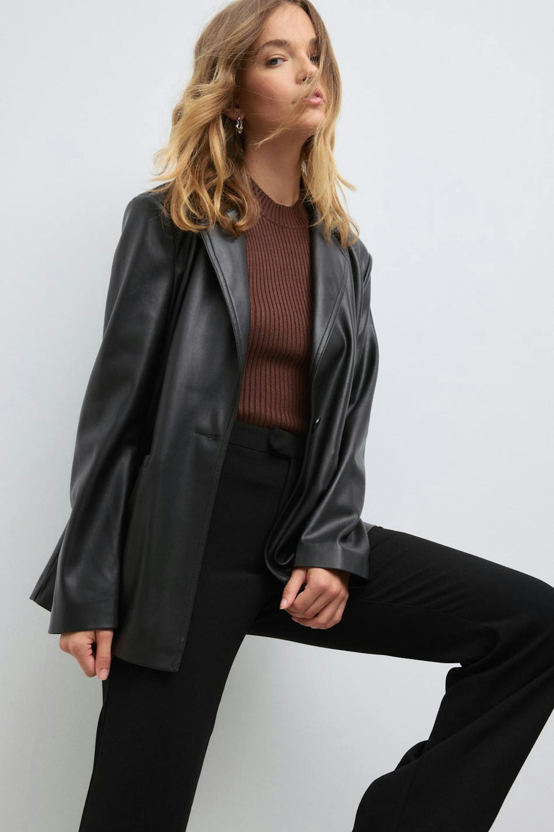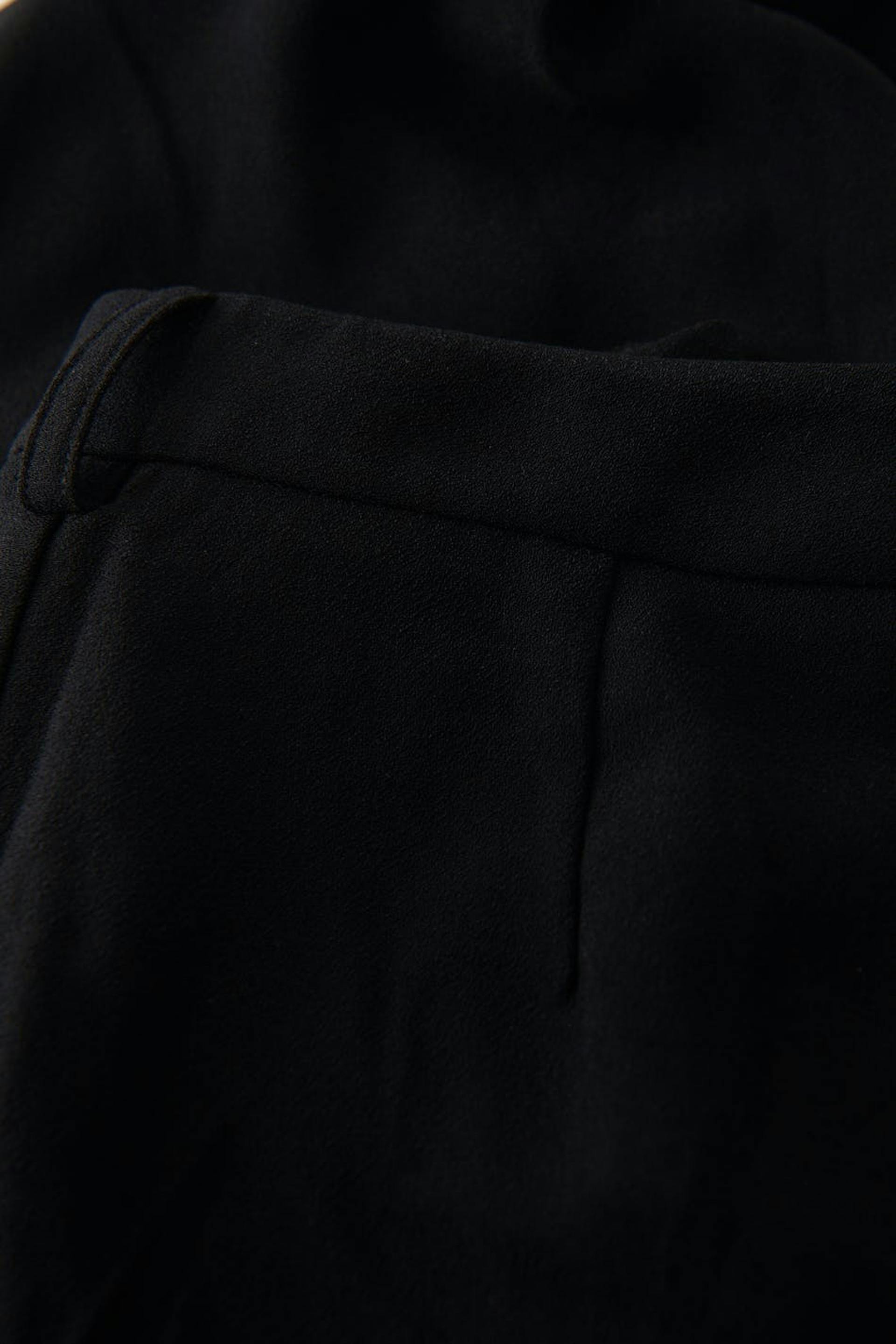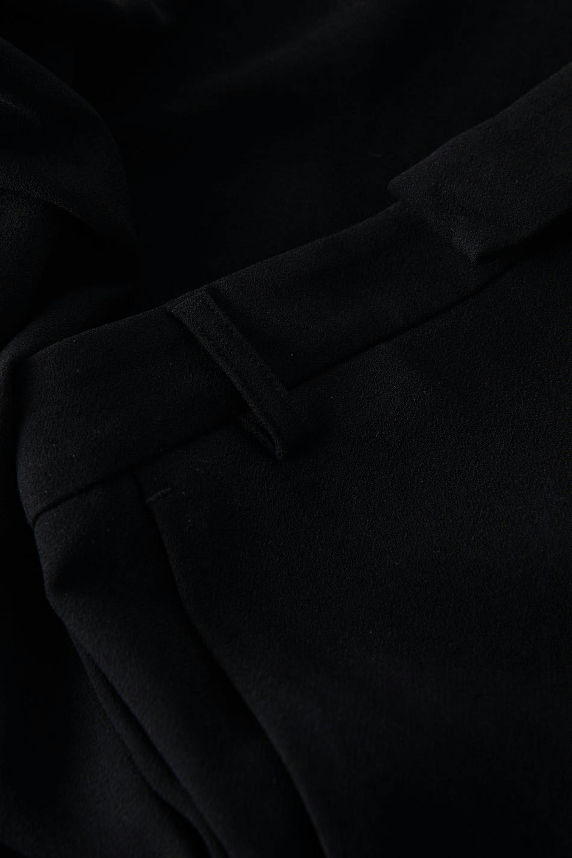 Trousers with flared legs. The trousers are black and have side pockets. They have belt loops, zip fly and long leg length.