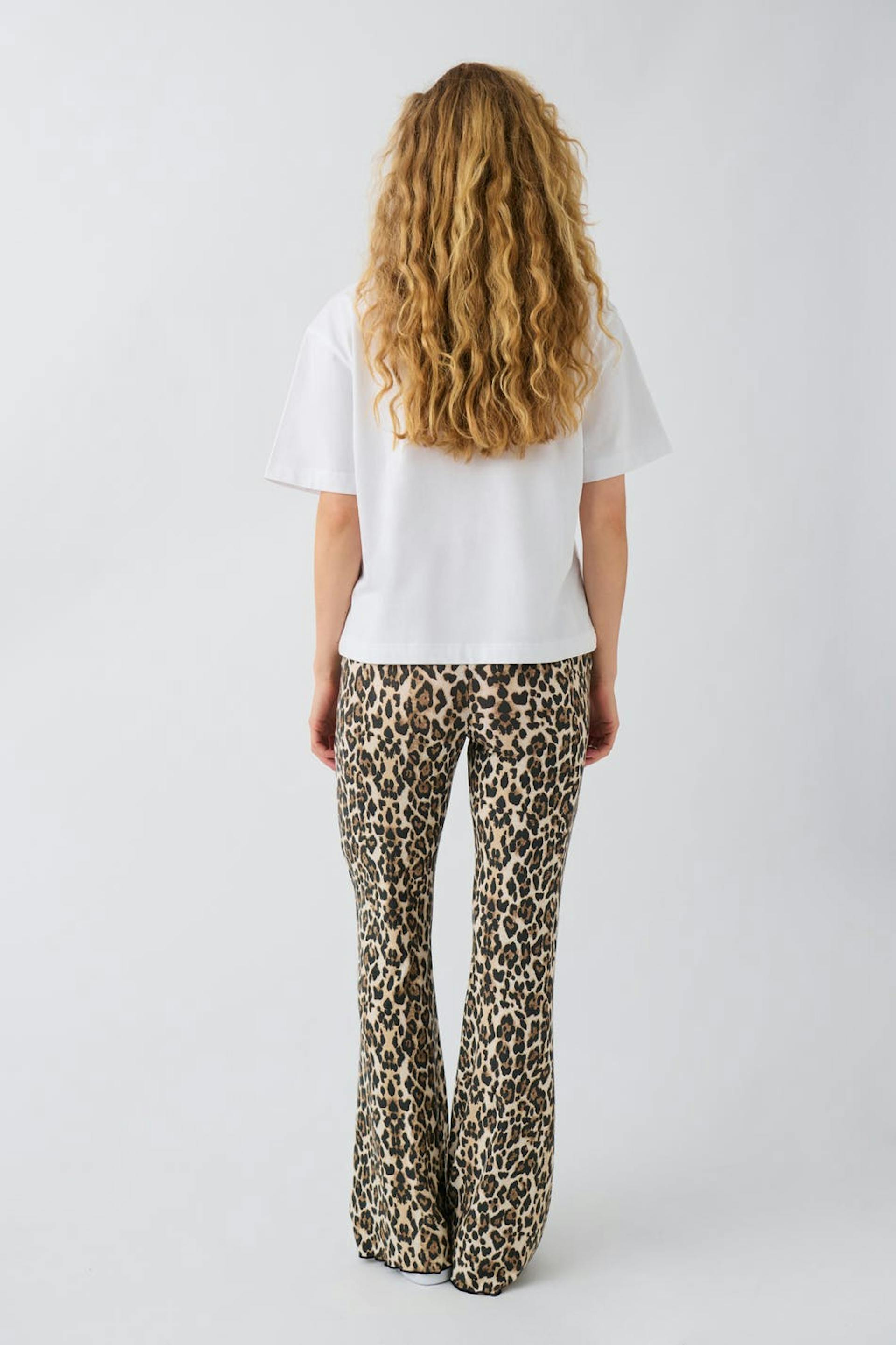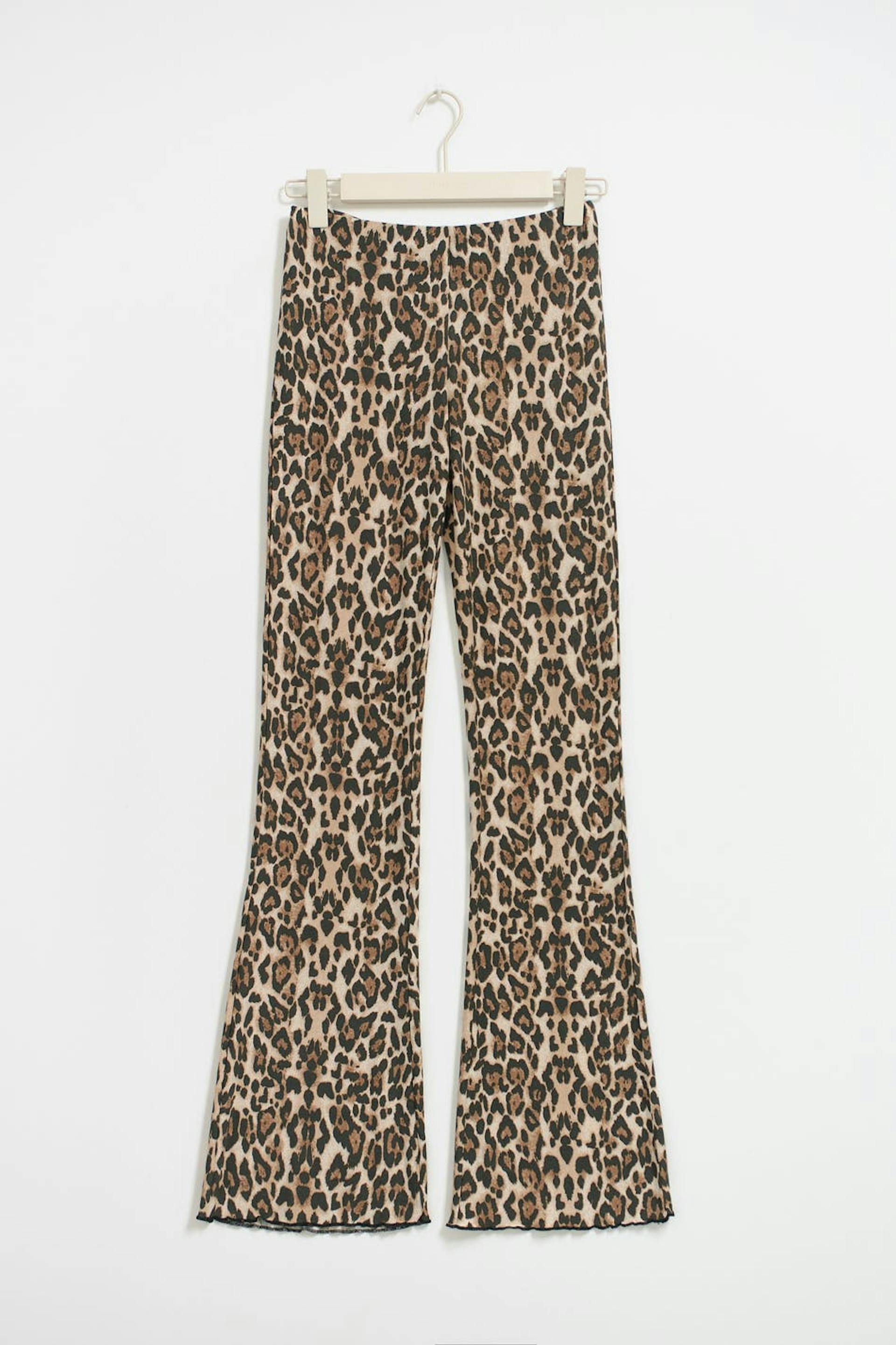 Leopard patterned trousers in jersey with flared legs. The trousers are brown and have elastic at the waist. They have overlocked hem.