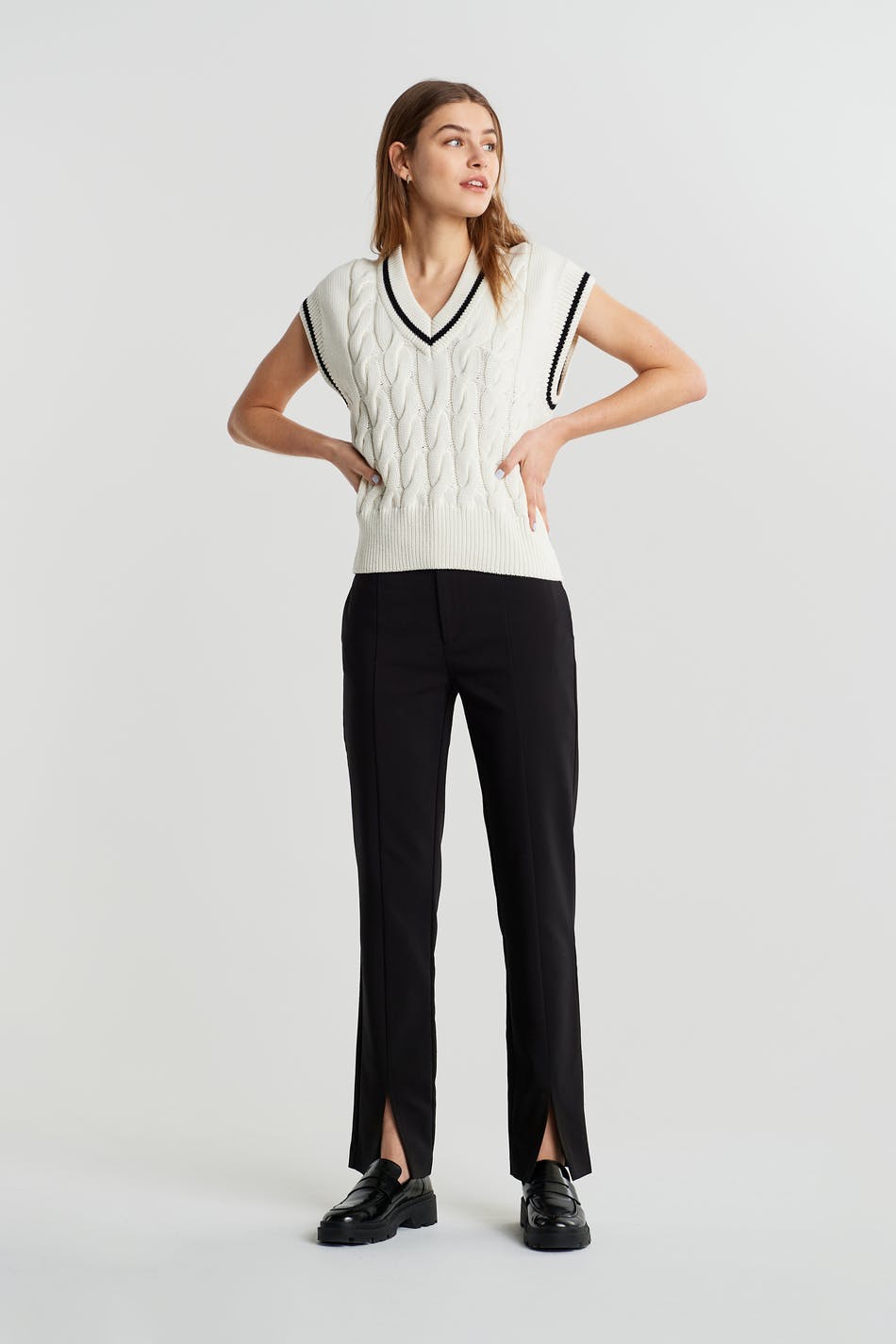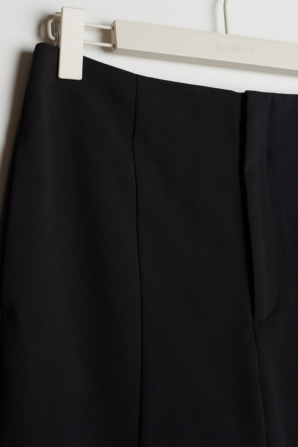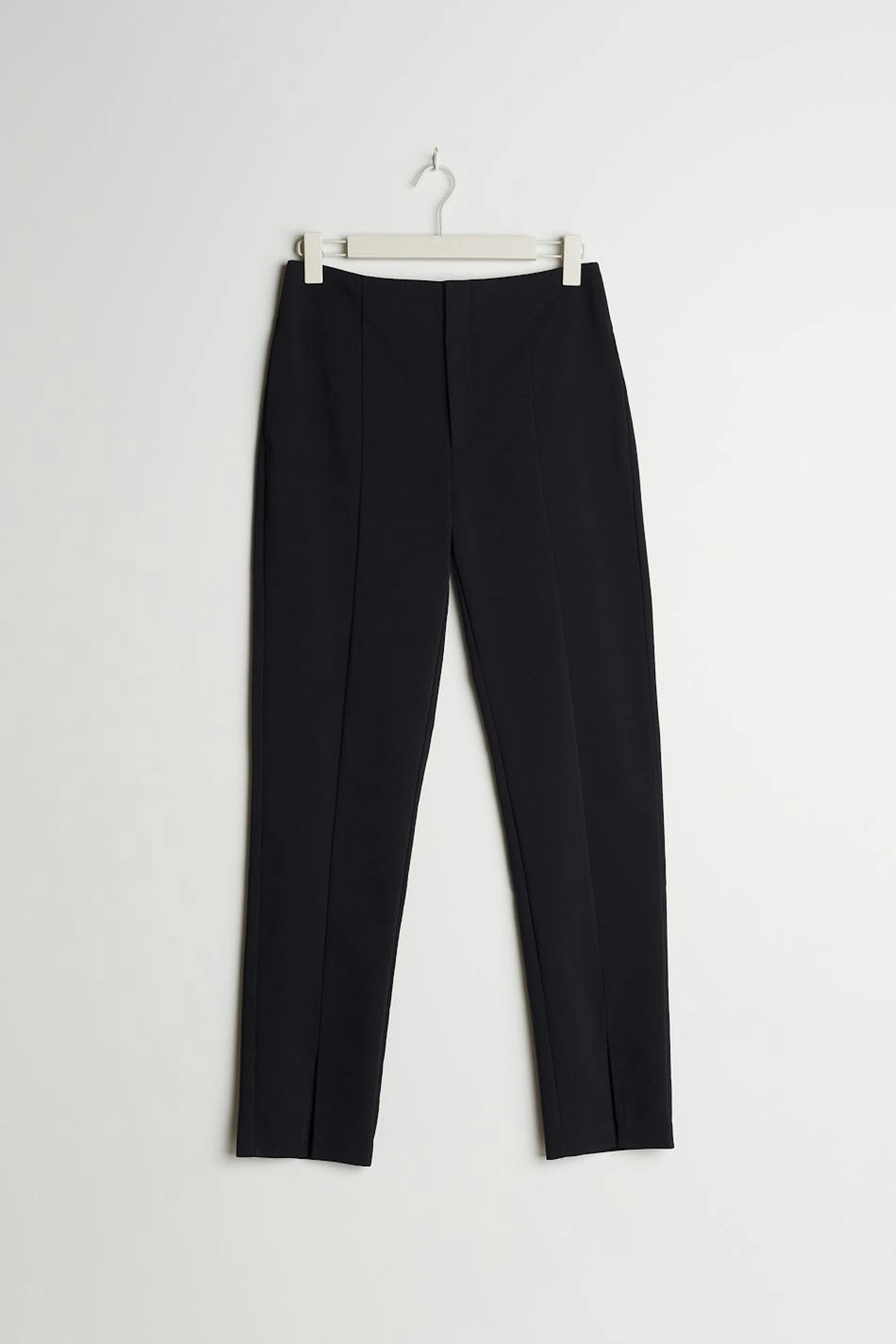 Trousers with a high waist. The trousers are black and have a slim fit. They have a seam detail down the front and a slit at the end of the legs.
