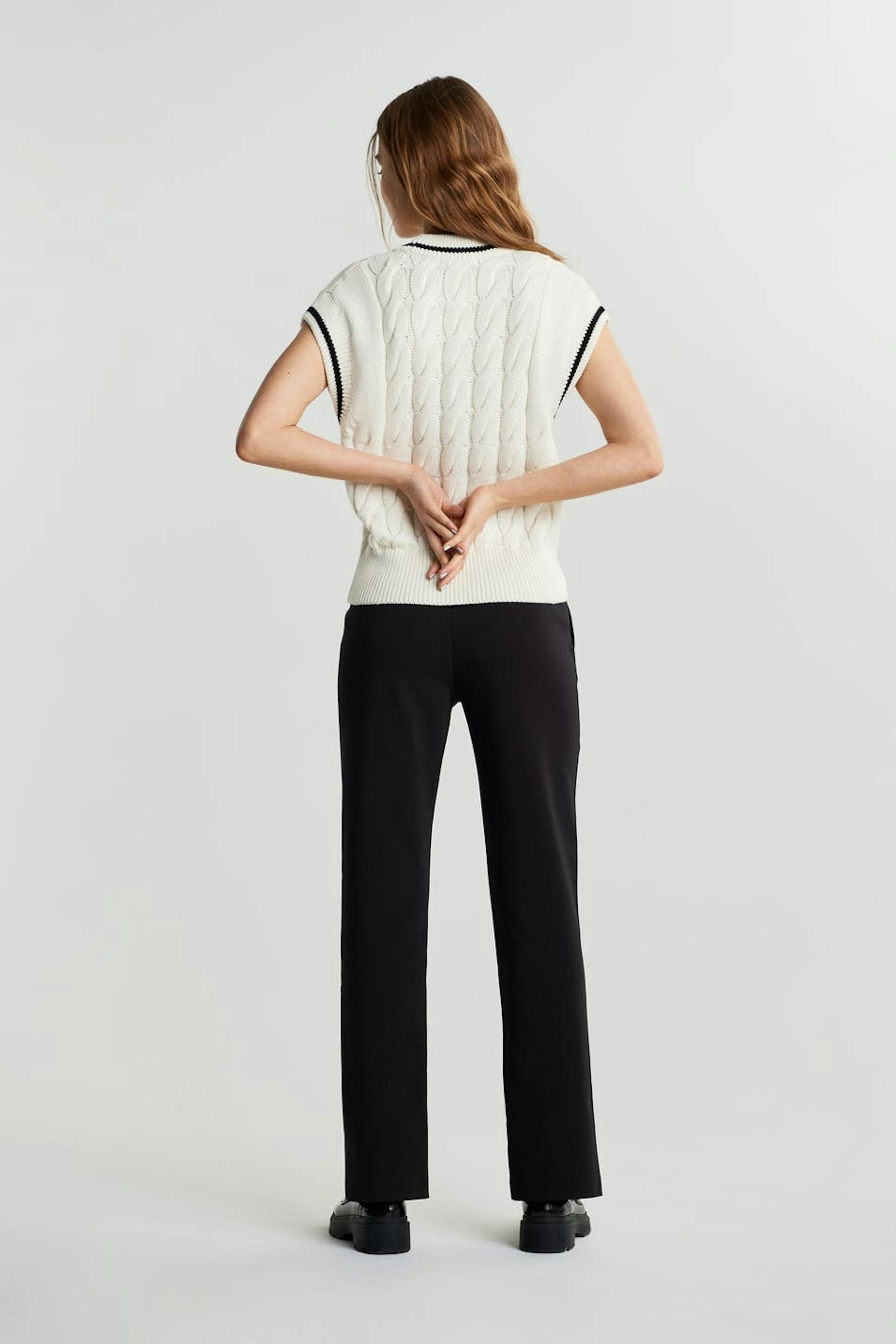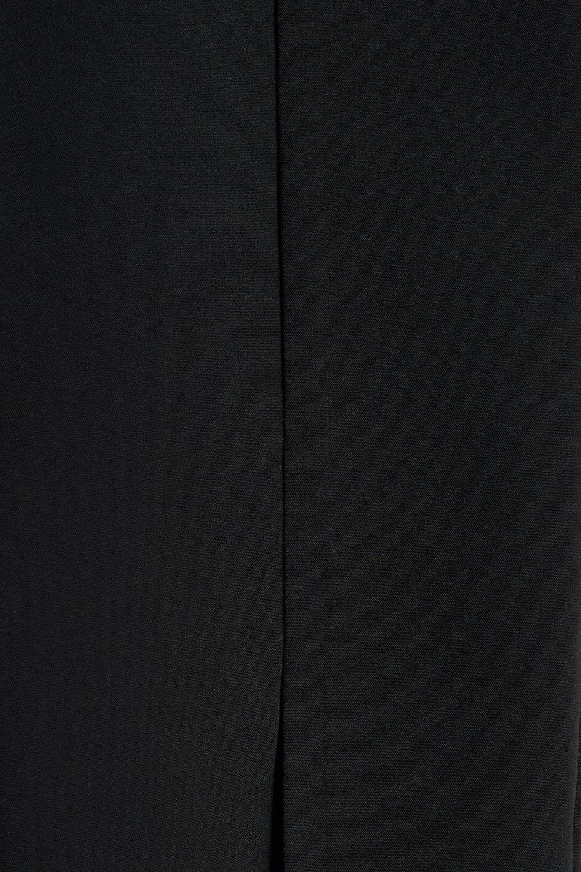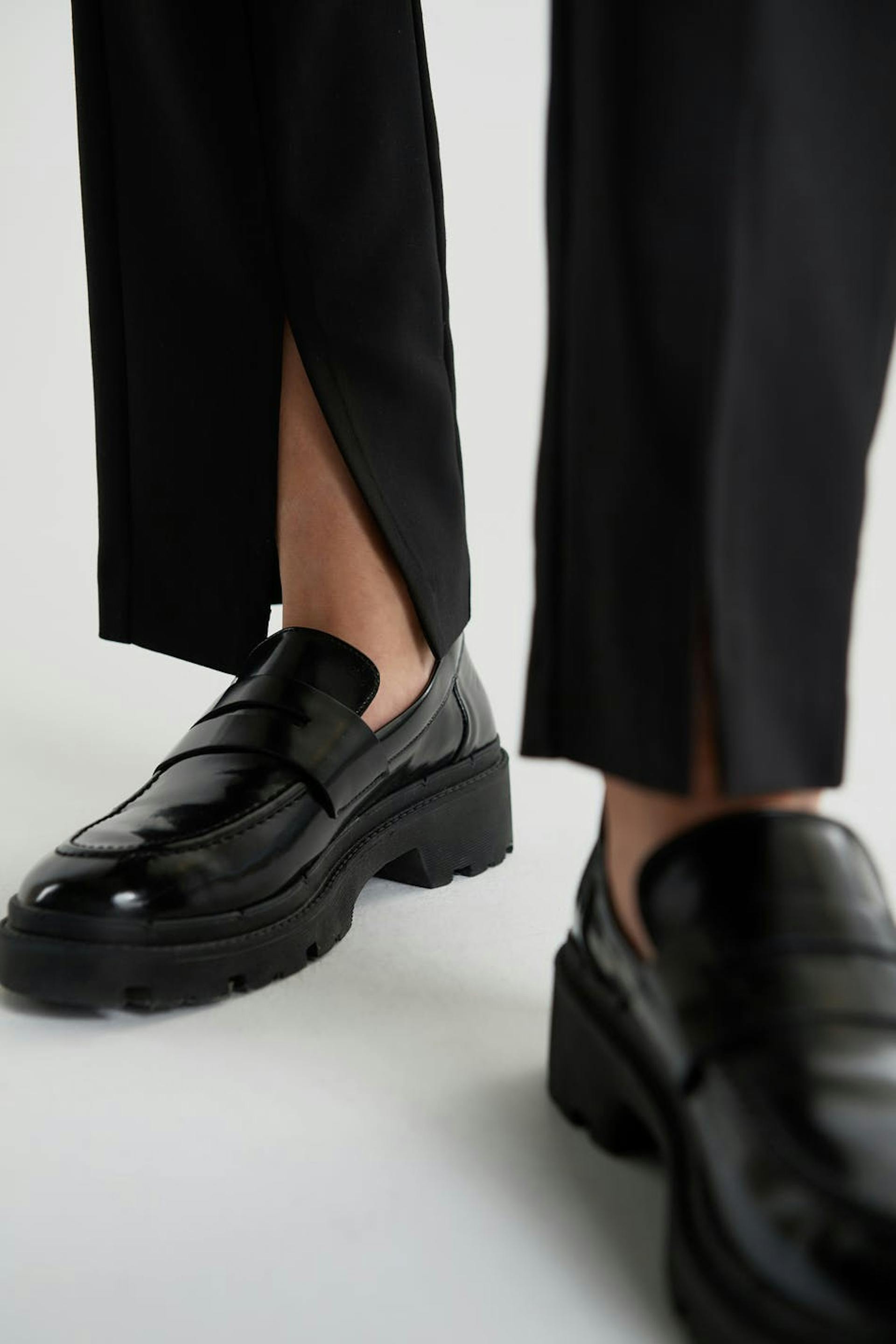 Trousers with a high waist. The trousers are black and have a slim fit. They have a seam detail down the front and a slit at the end of the legs.