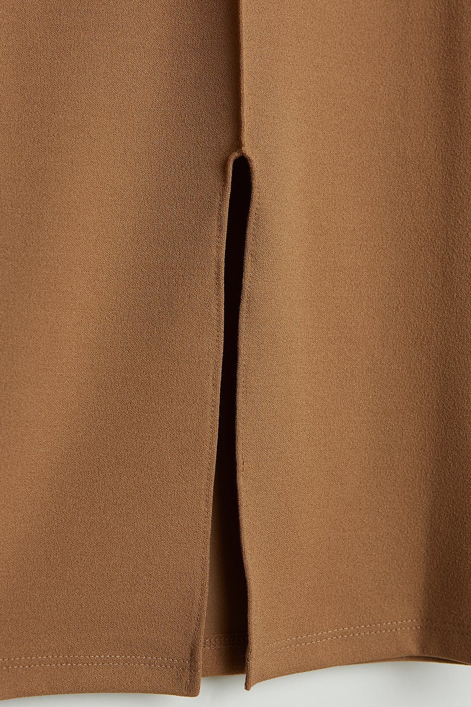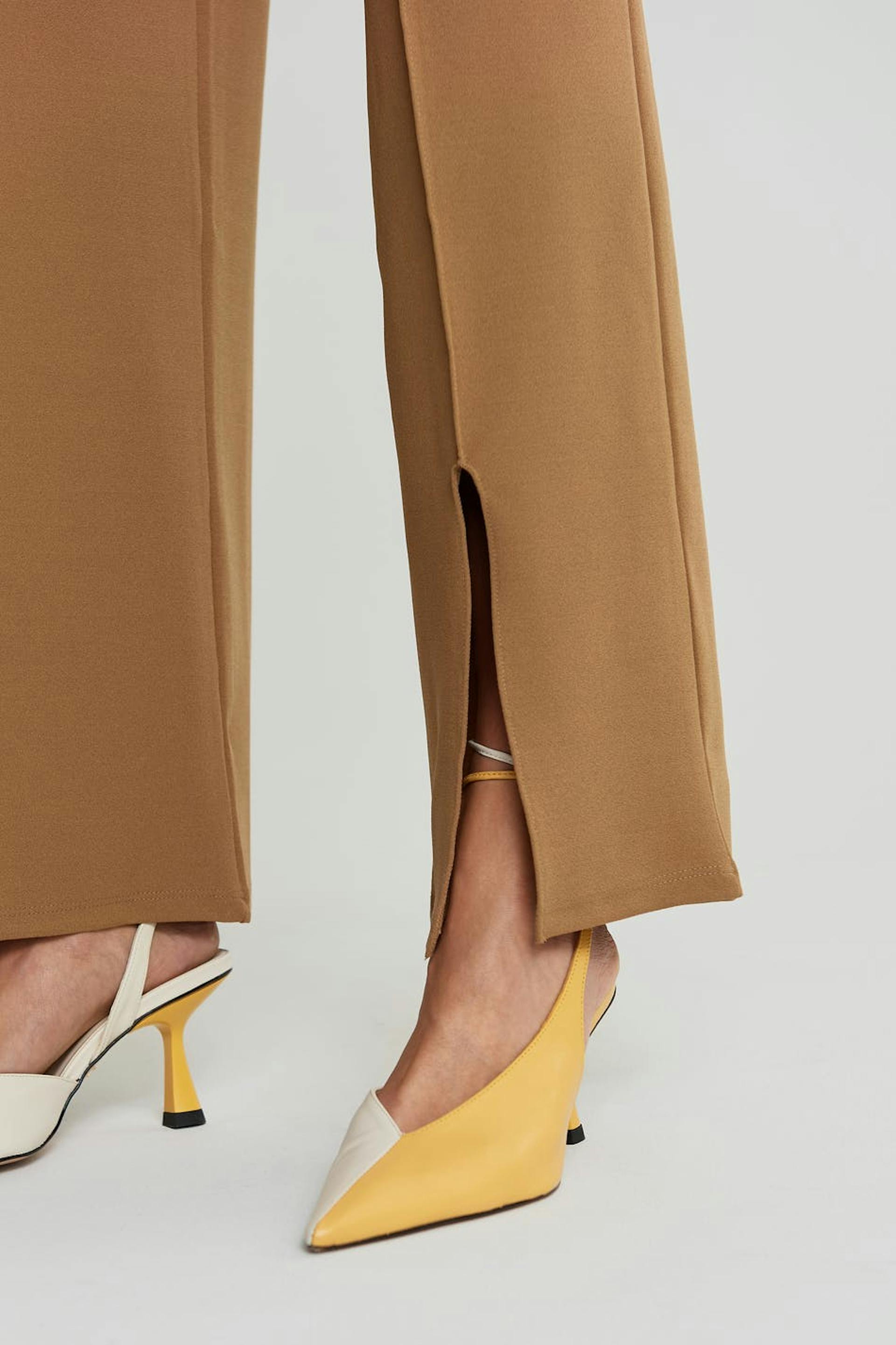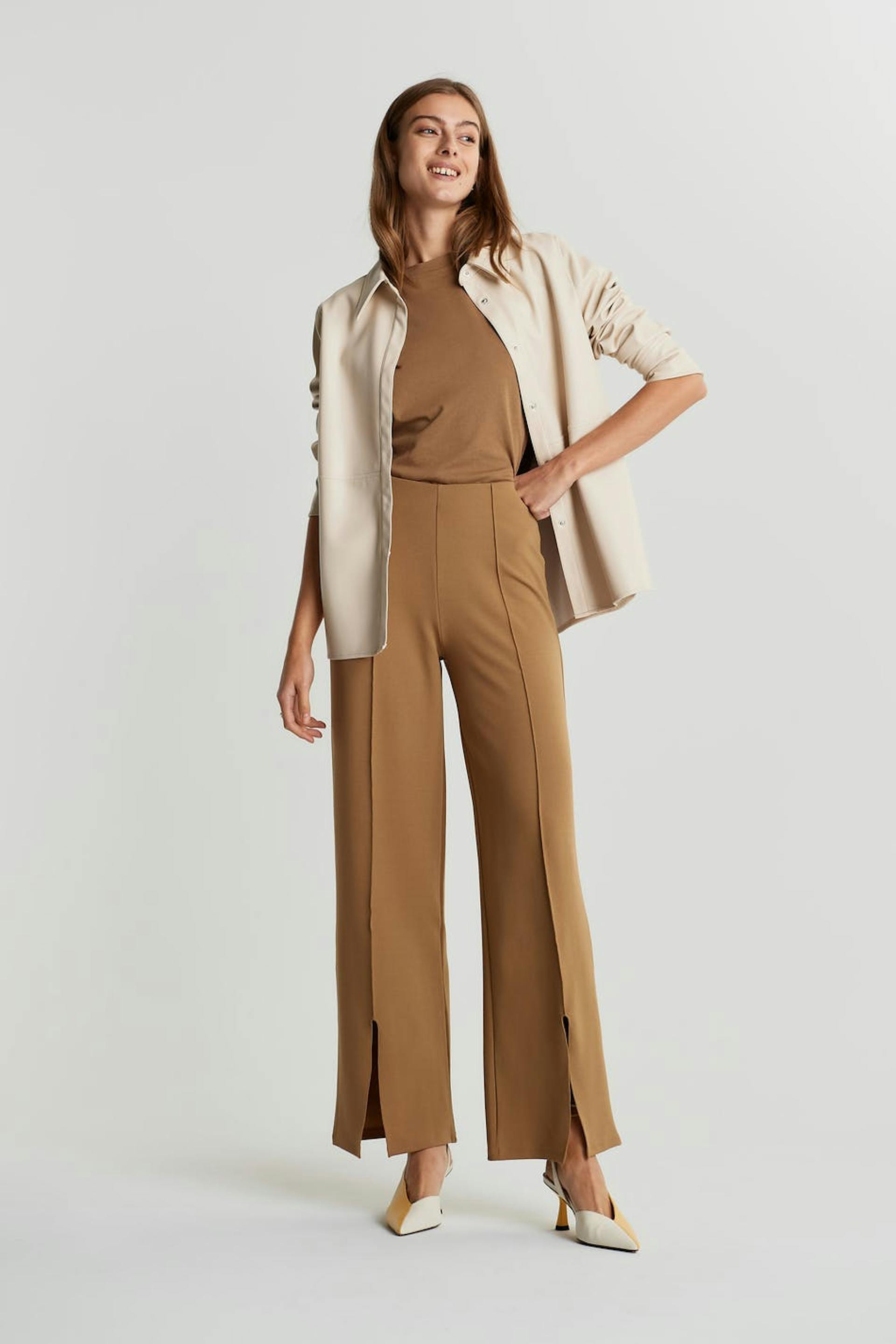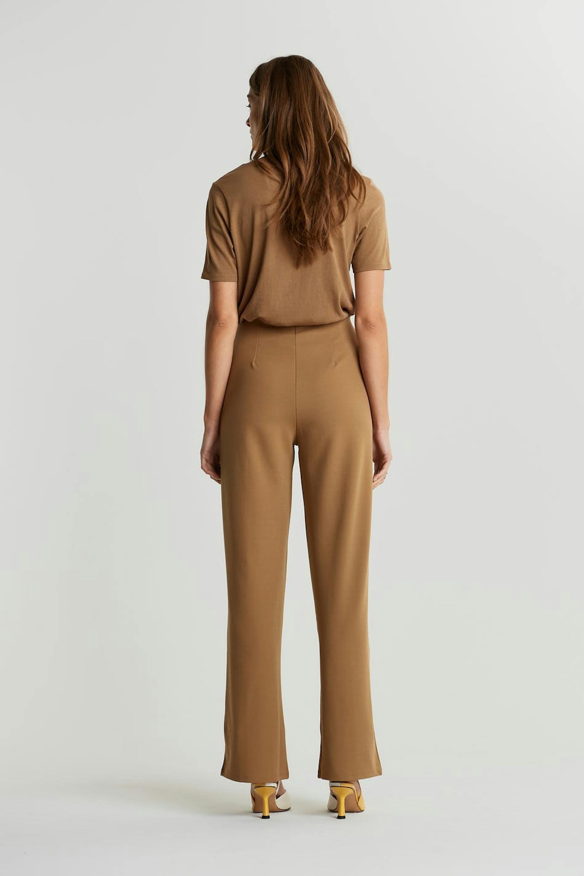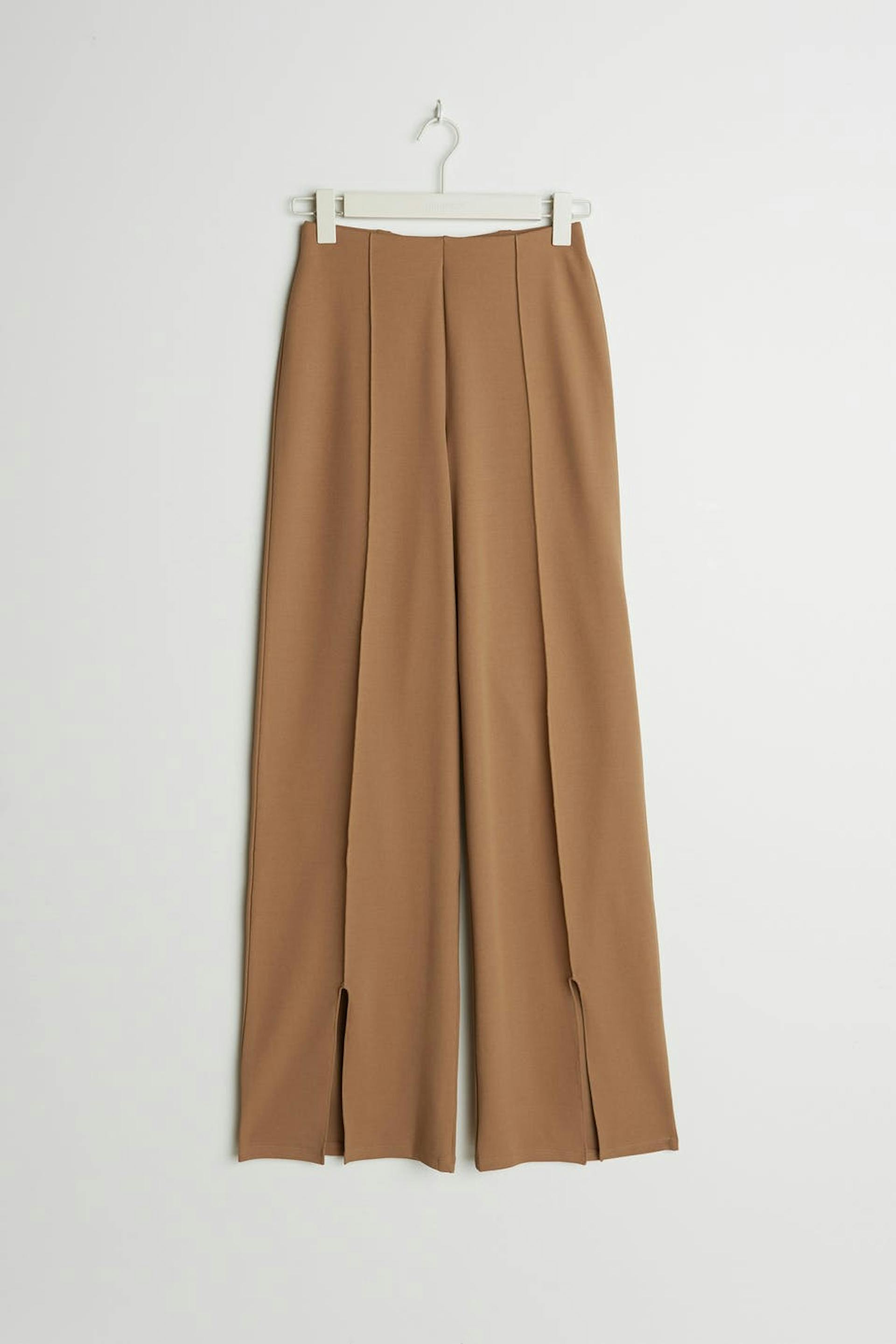 Suit trousers with a regular fit. The trousers are beige and have seam details down the front. They are made of jersey and have split at the end of the legs and an elastic band at the waist.