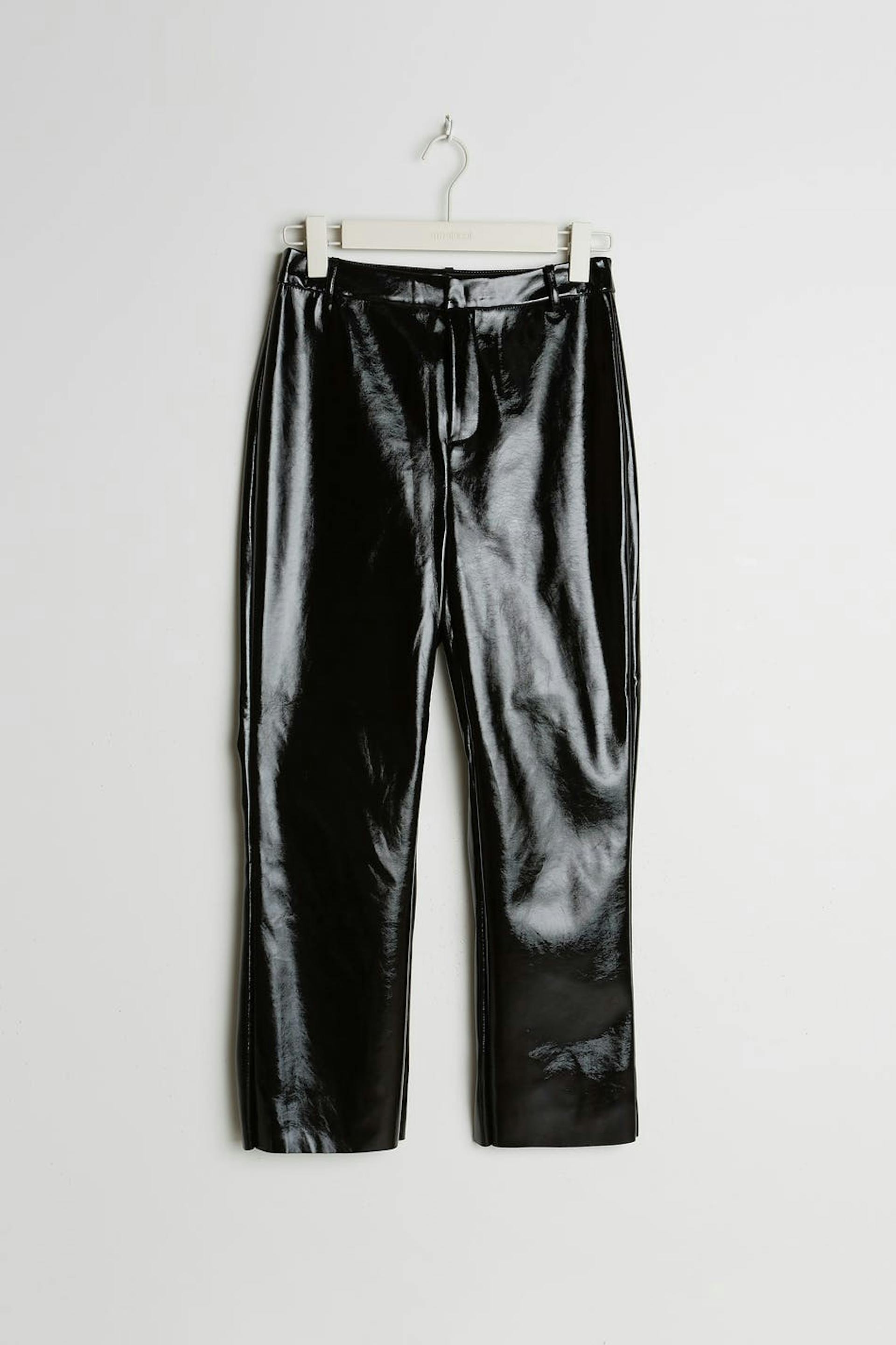 Straight trousers. The trousers are black. They are made of vinyl material.