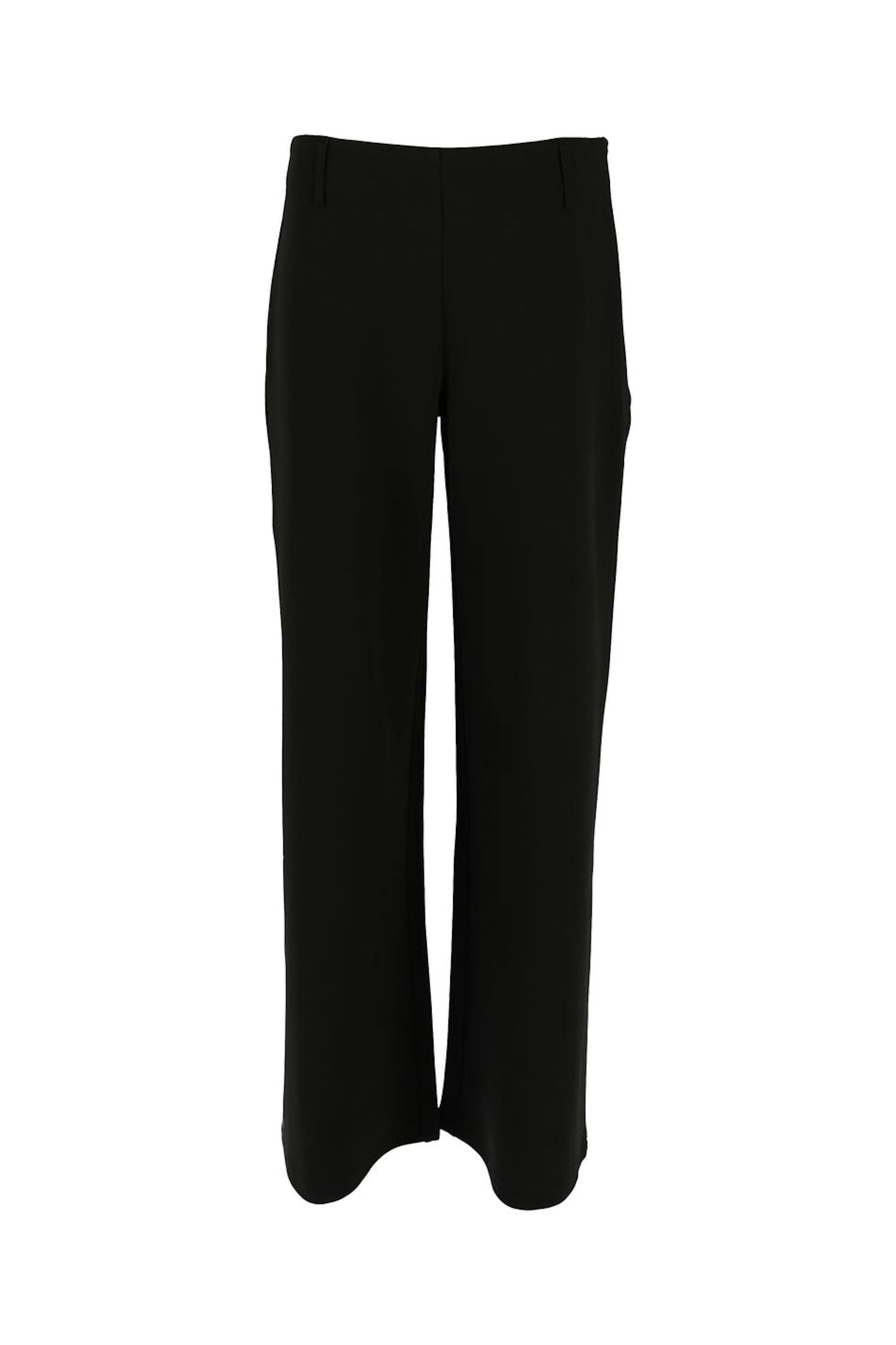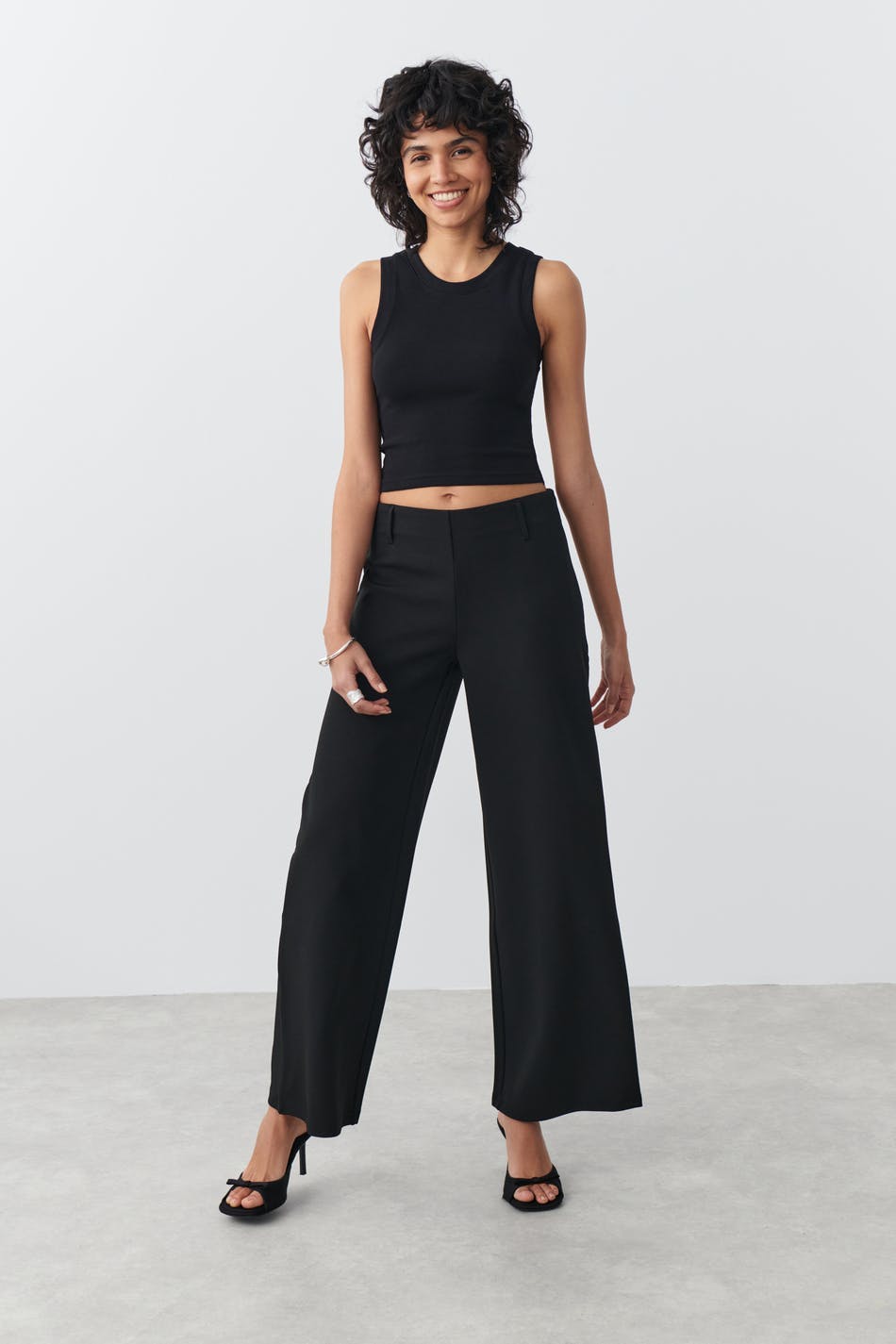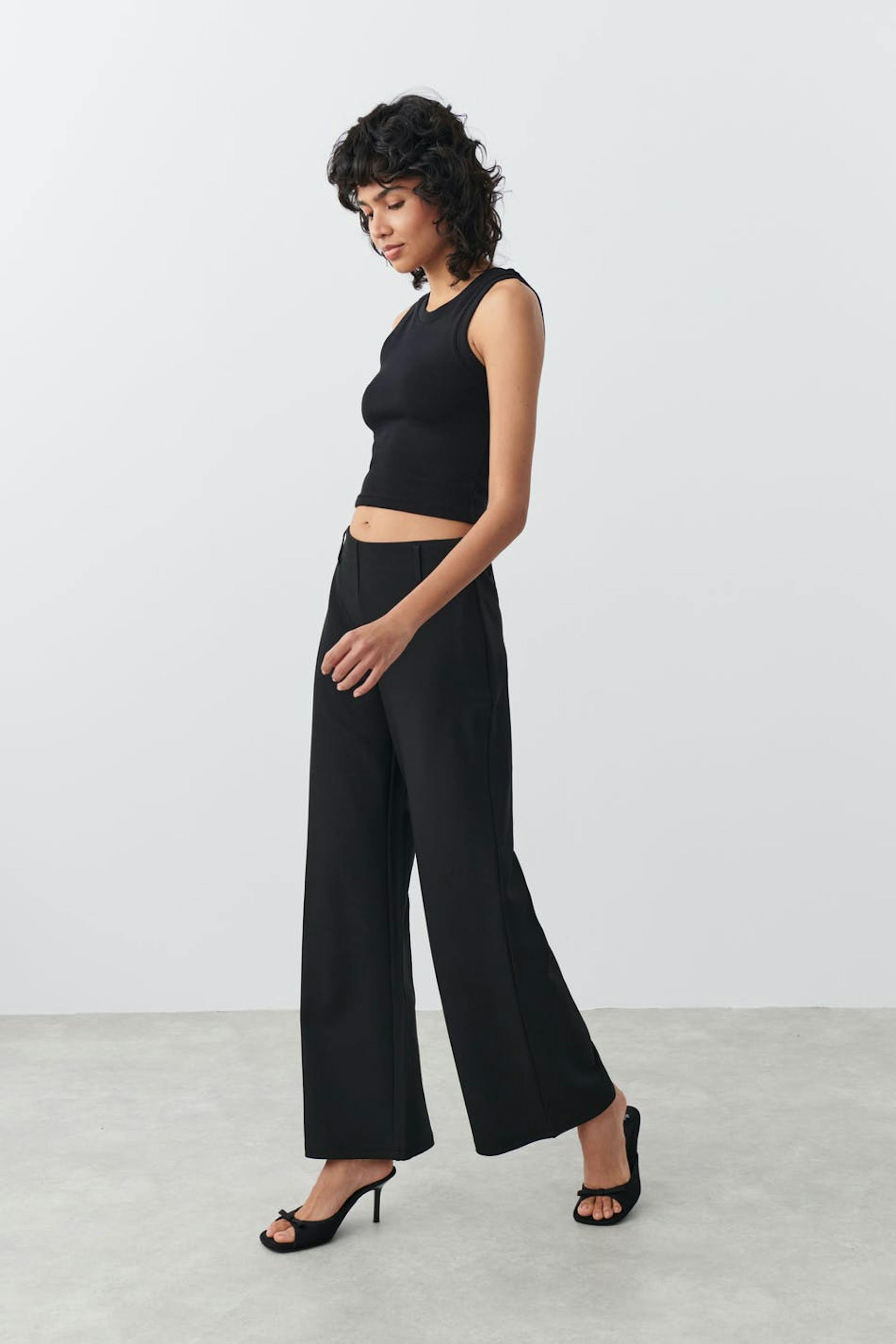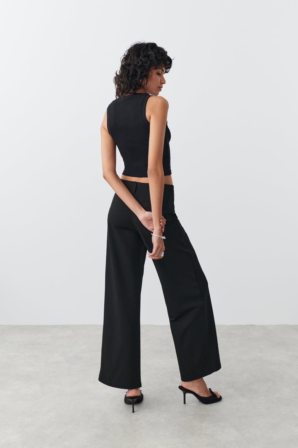 Wide trousers in jersey with regular waist. The trousers are black and have zip in the side seam. They have belt loops and welt pockets at the back.