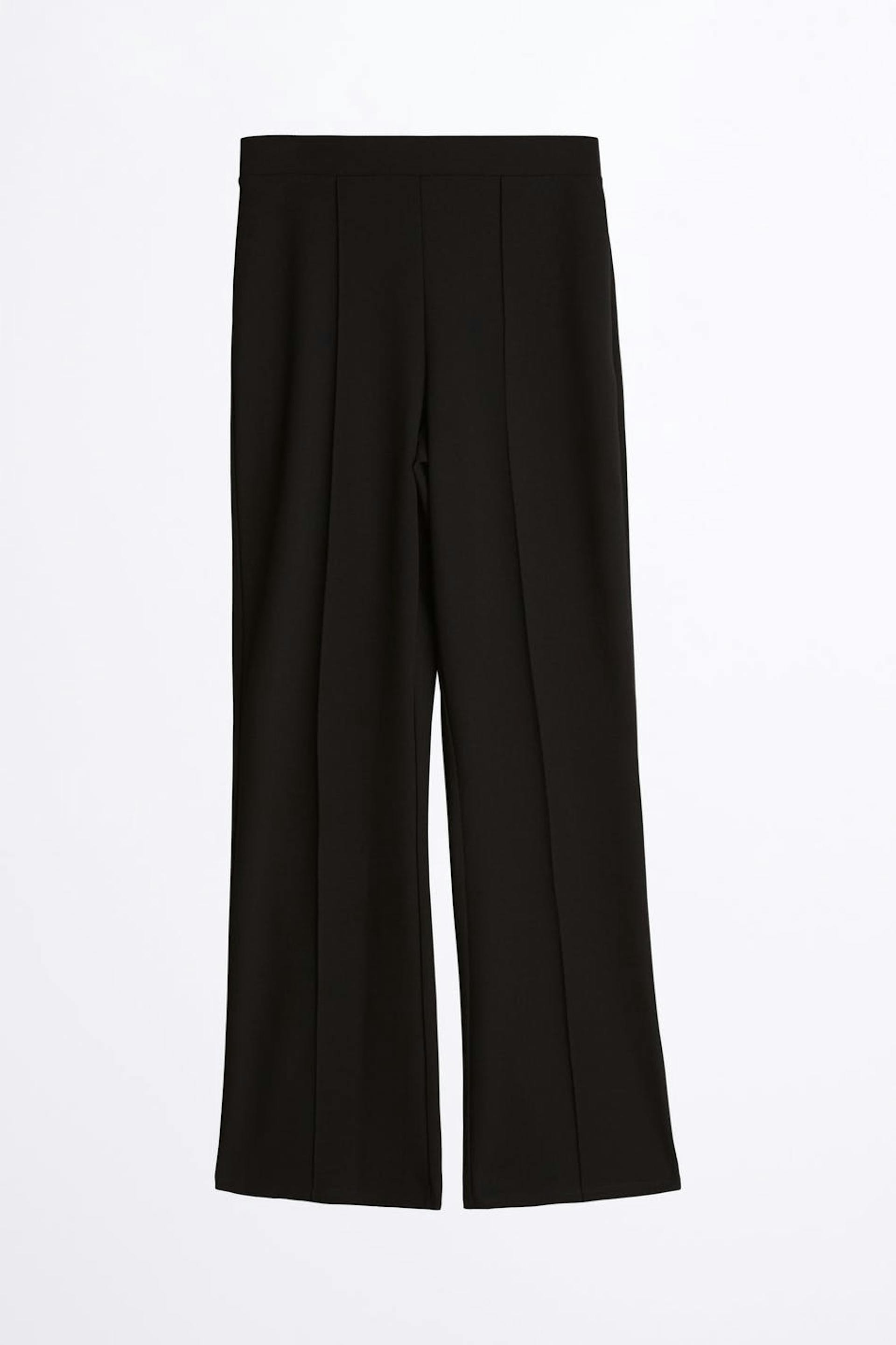 Straight trousers with a regular fit. The trousers are black and ankle-length and have a high waist. They have sewn creases on the front.