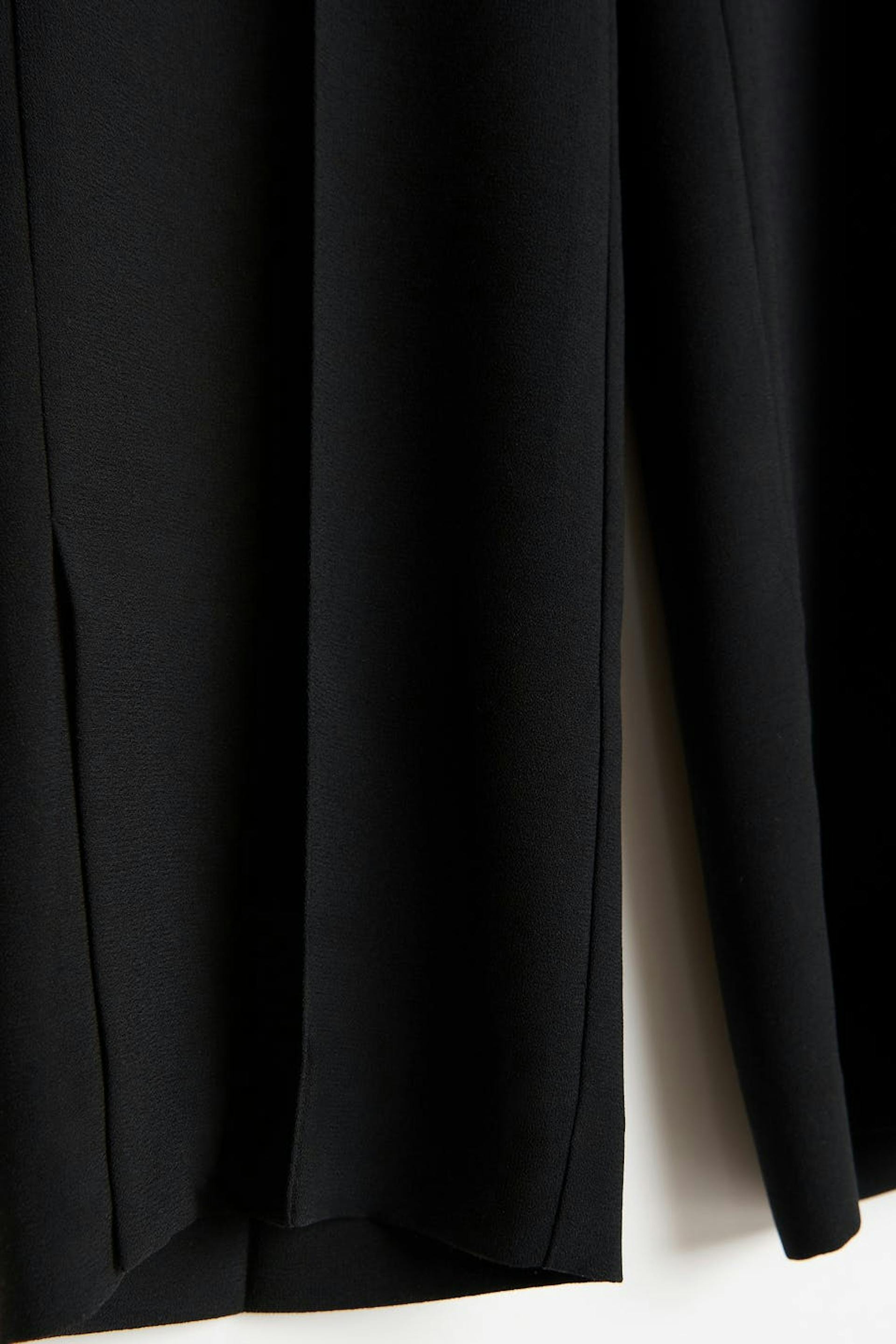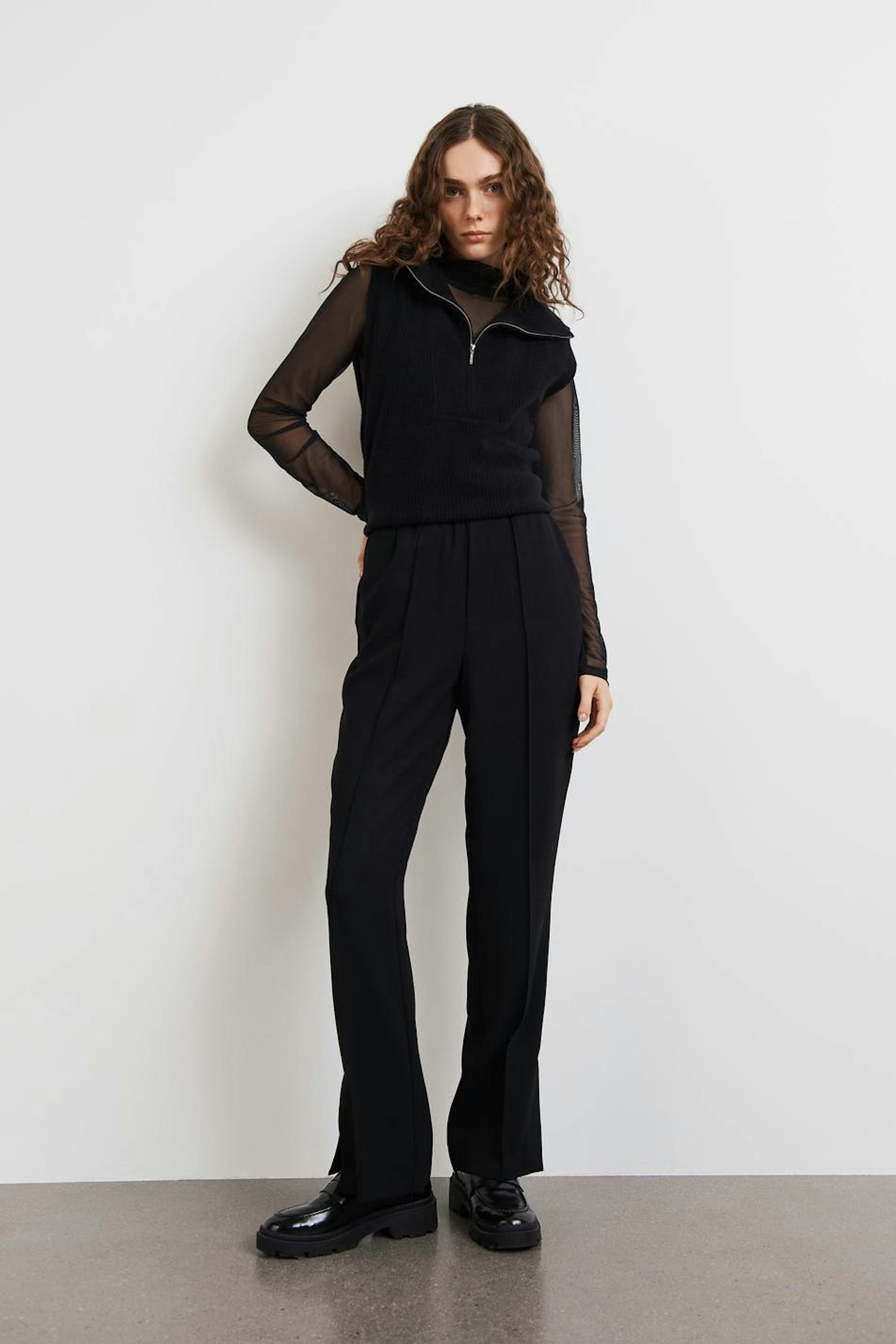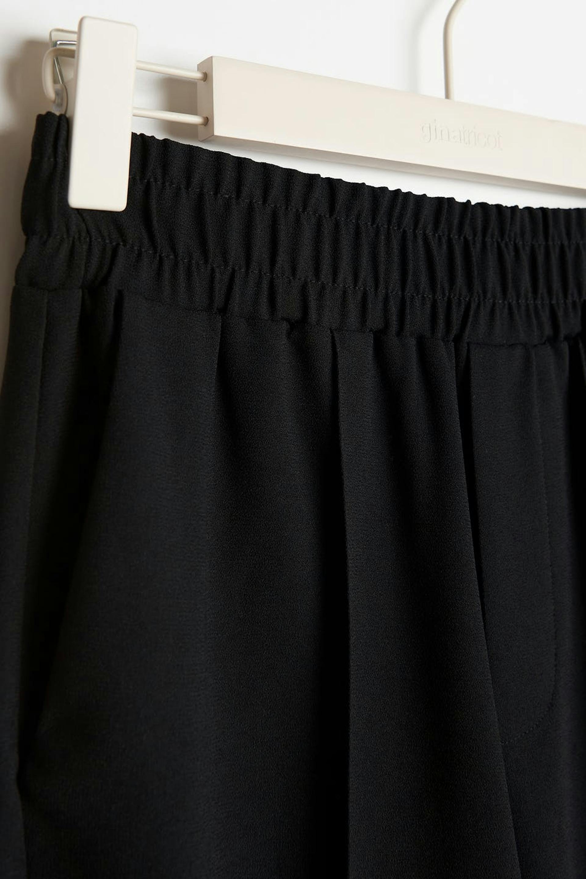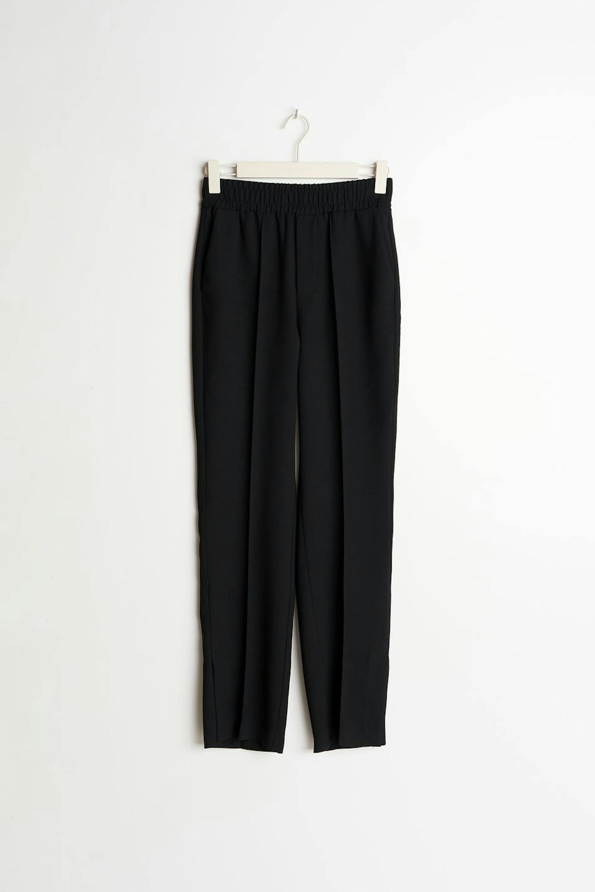 Woven trousers with crease. The trousers are black and have elastic at the waist.