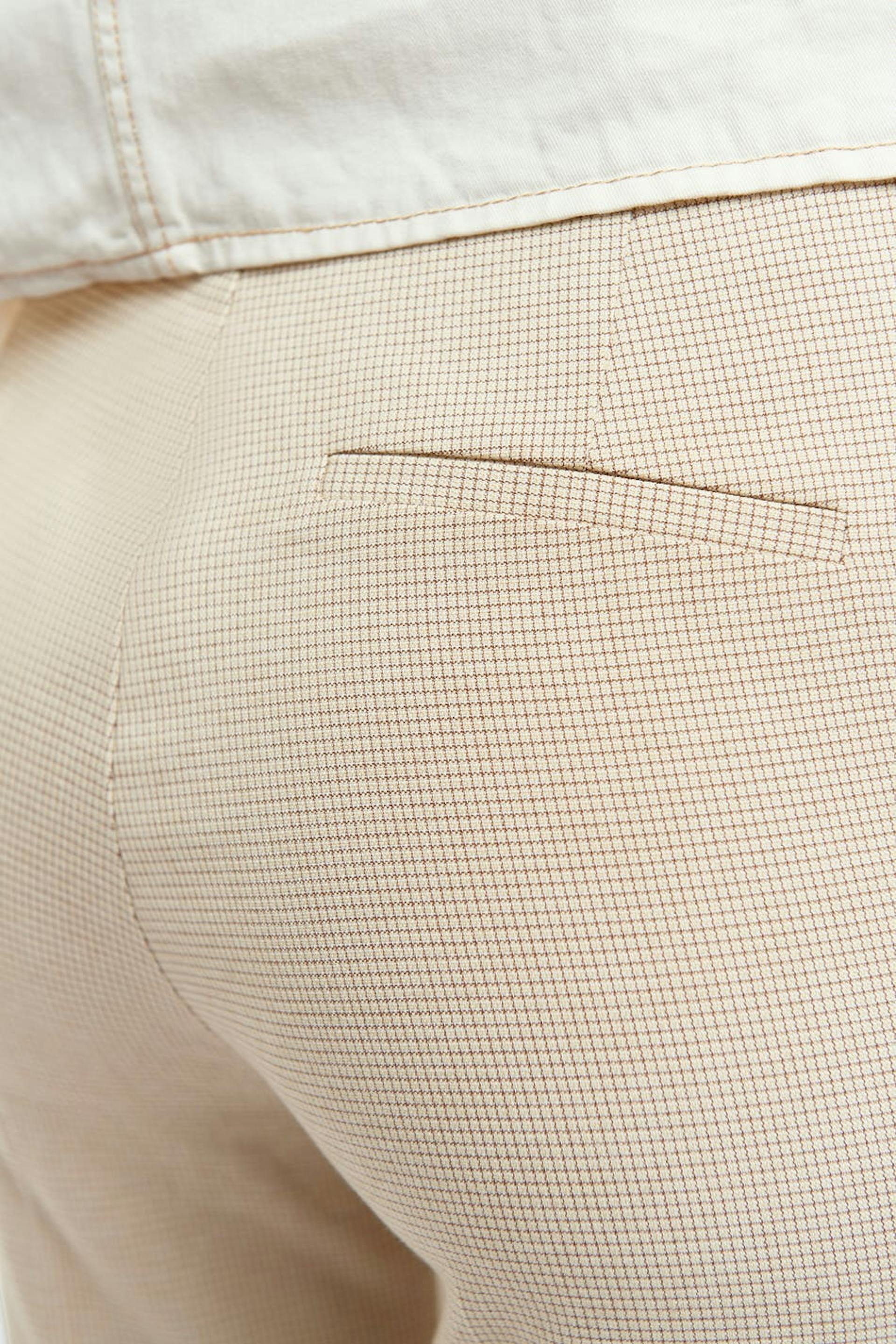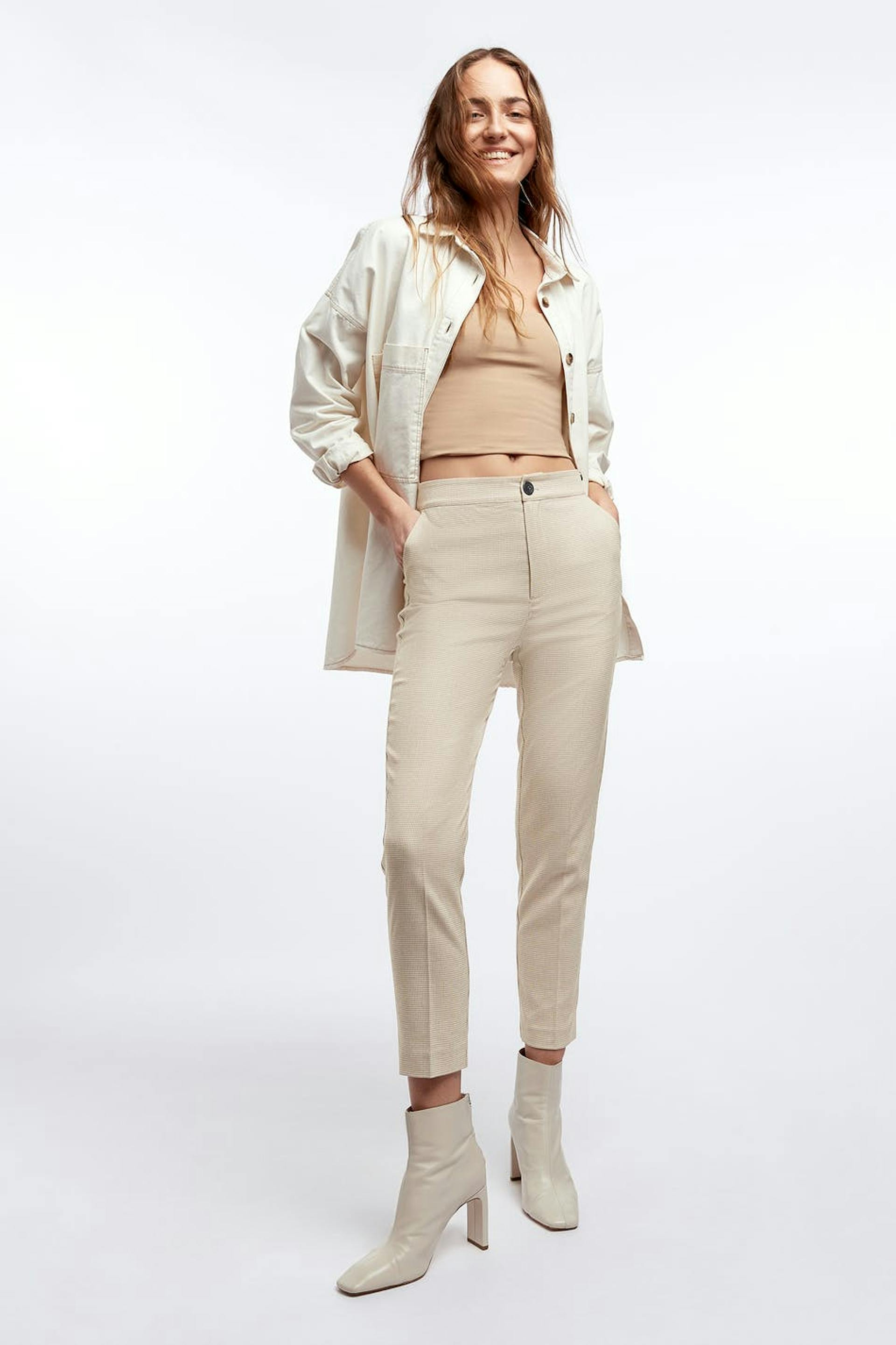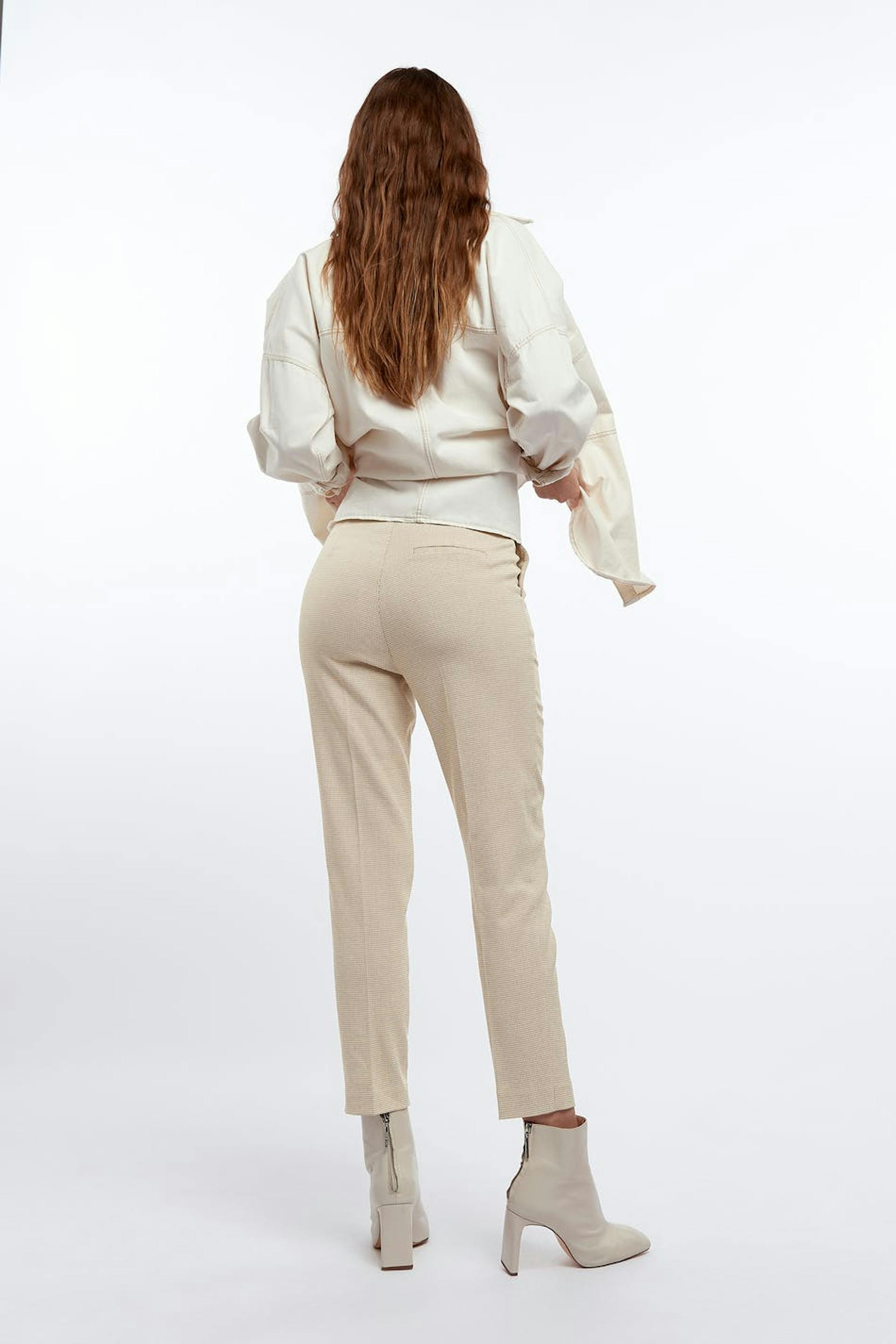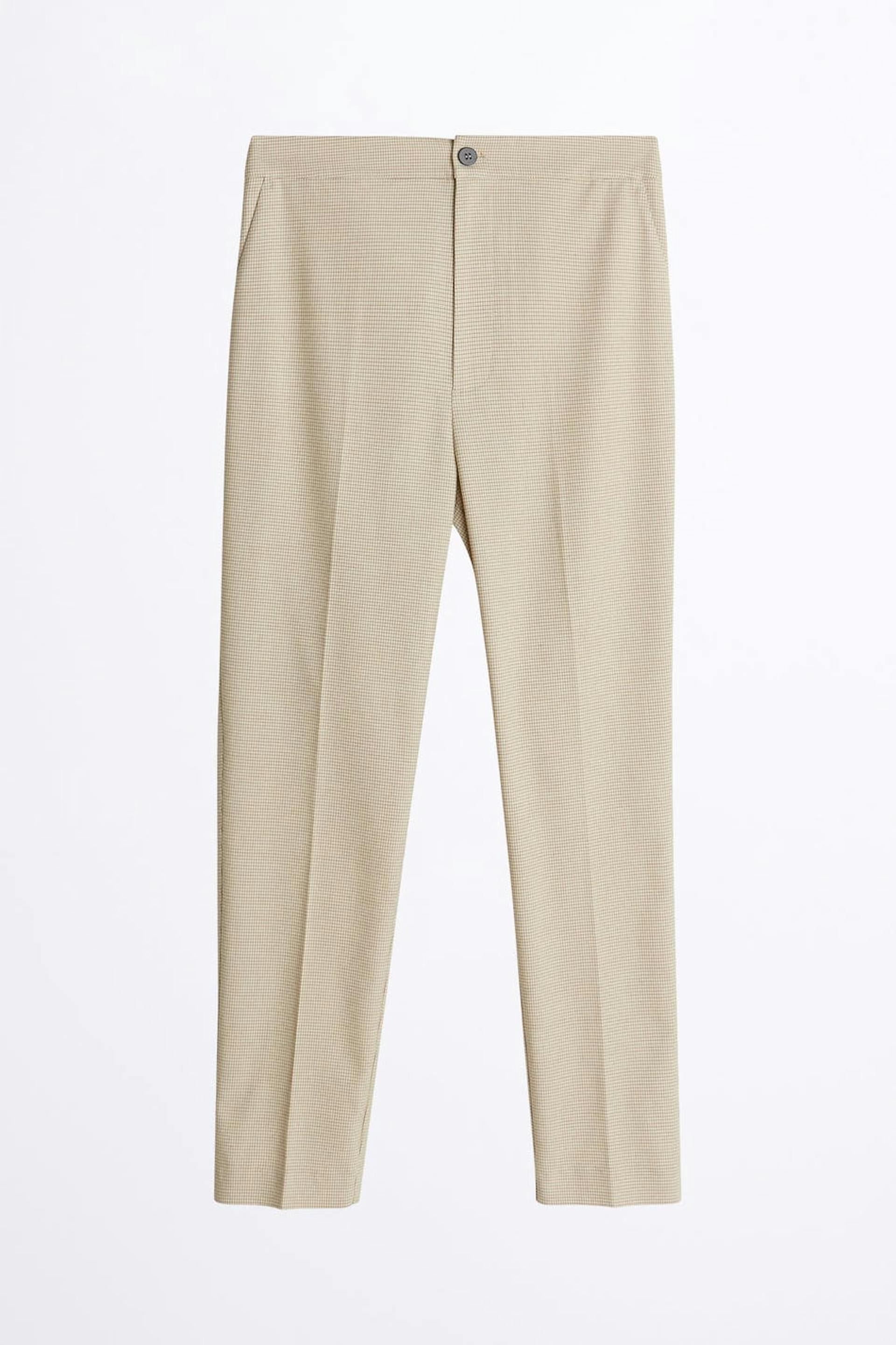 Straight trousers with a slim fit. The trousers are beige and have a high waist. They have shorter legs.