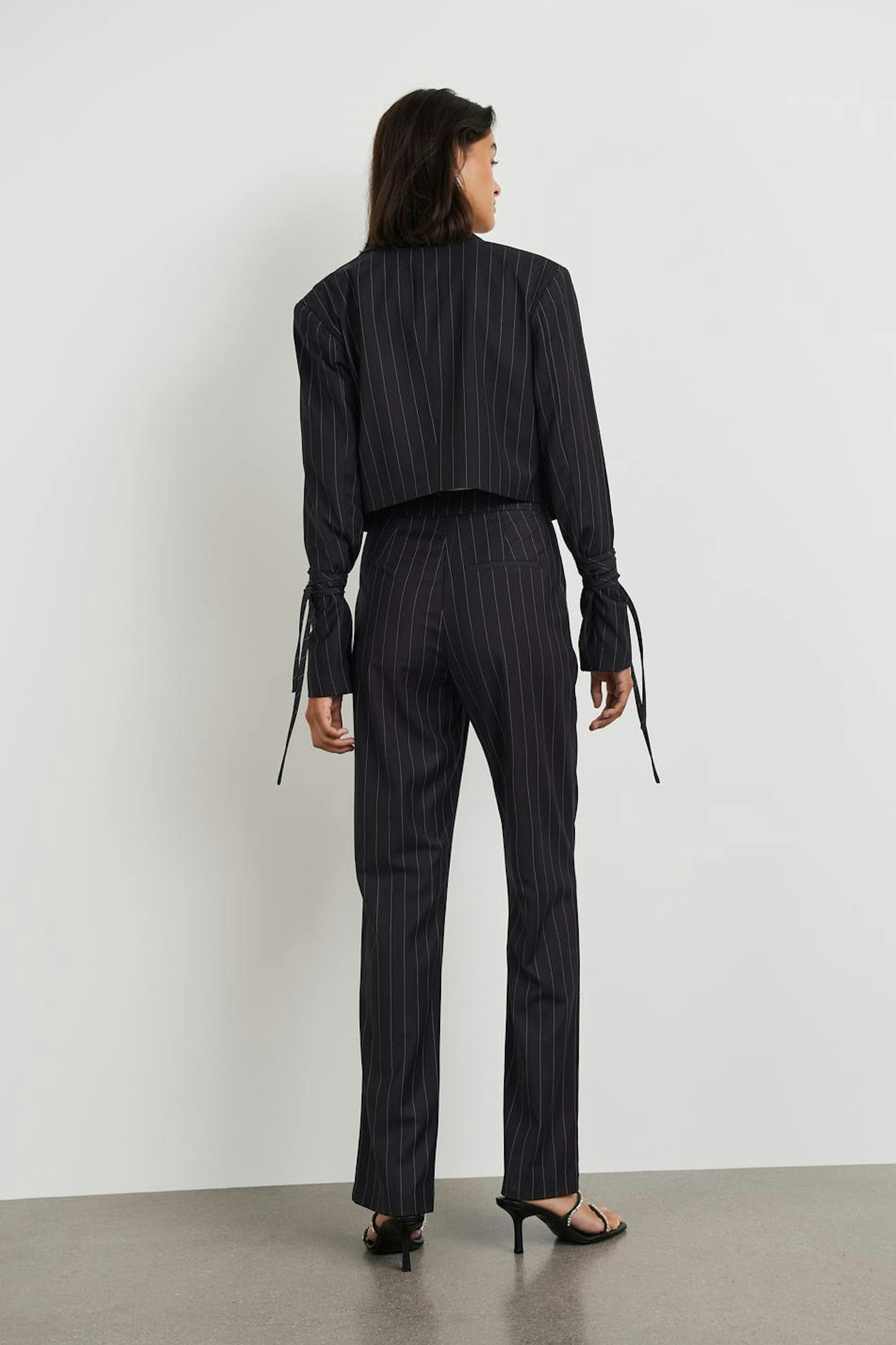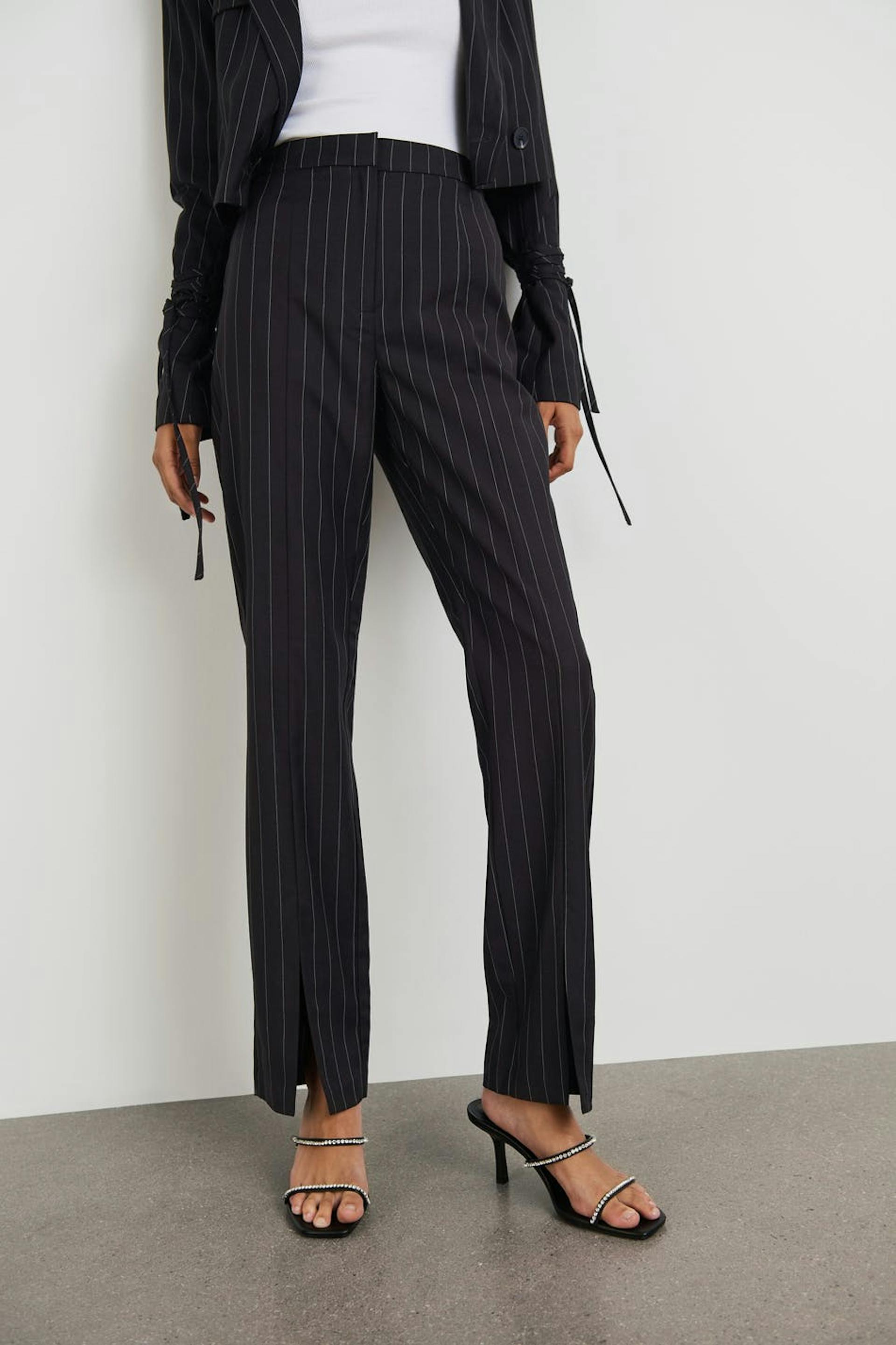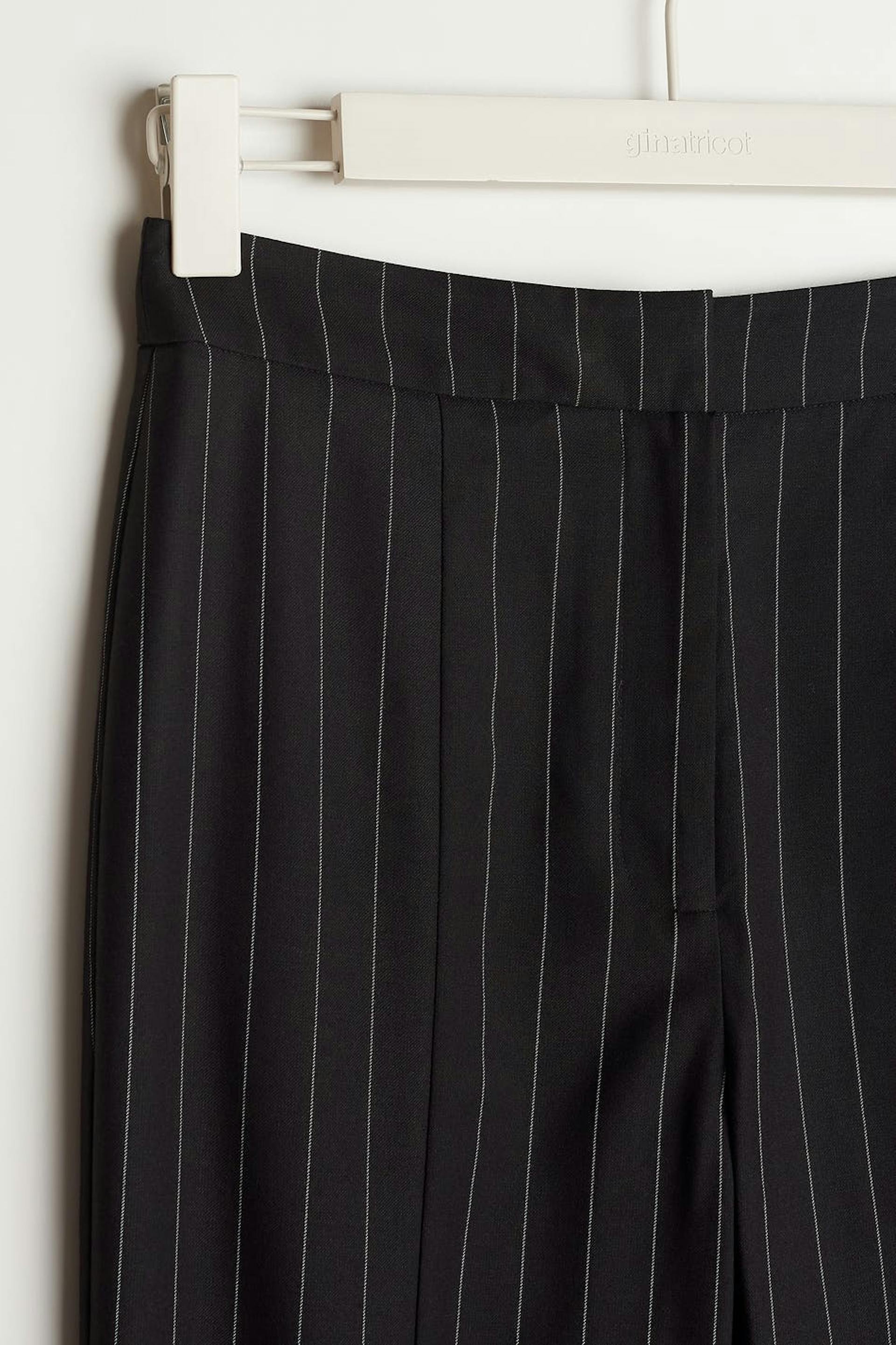Pinstriped suit trousers with high waist. The trousers are perfect for the party and black and have slit at the end of the legs. They have slit pockets at the back.