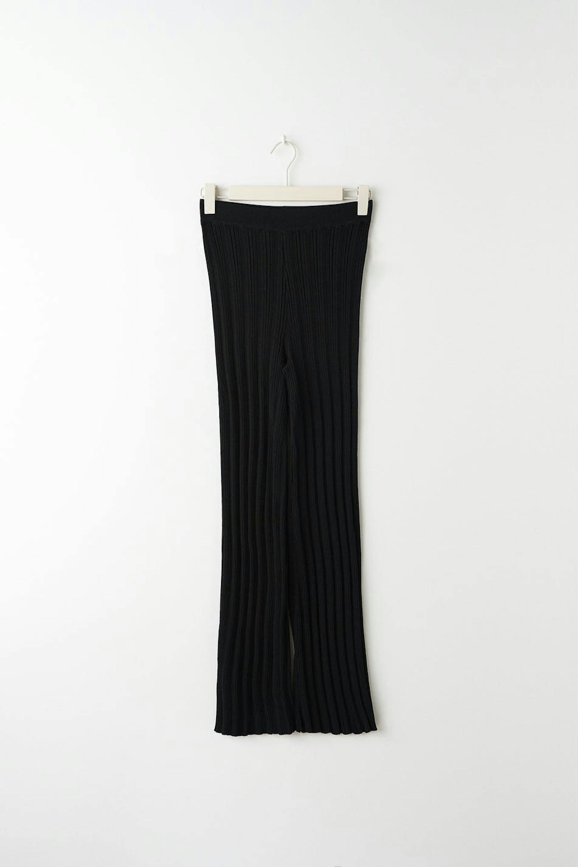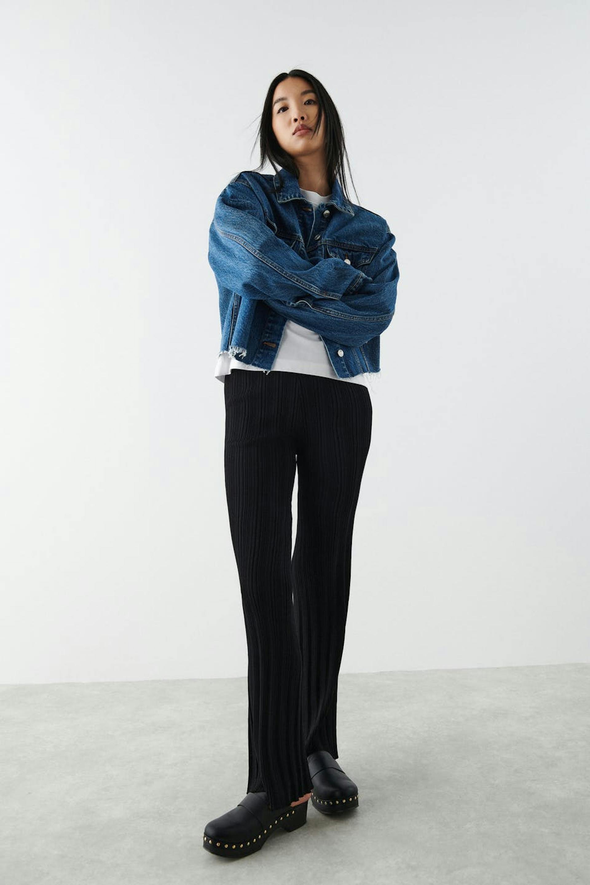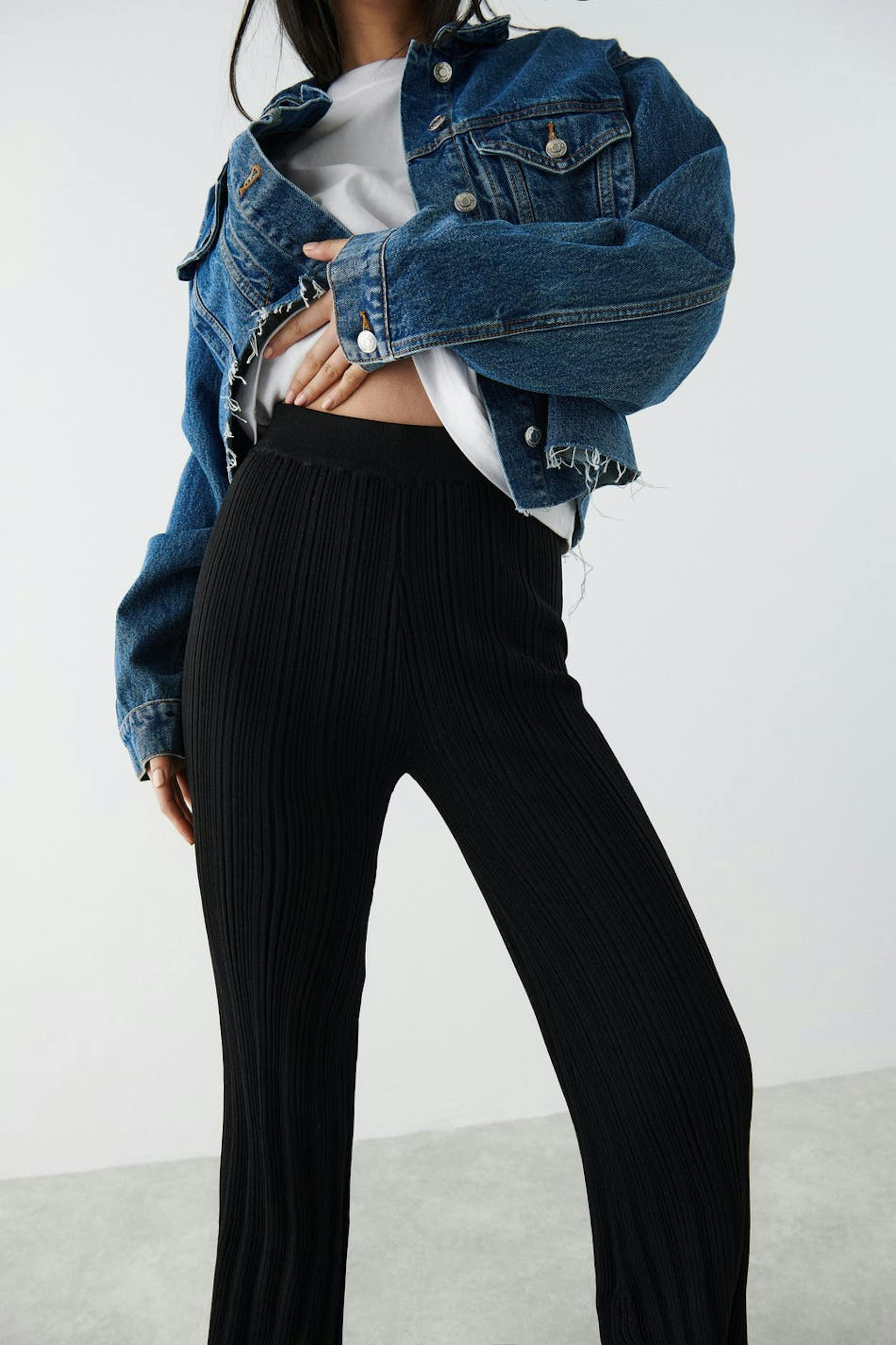 Ribbed trousers with elastic at the waist. The trousers are black and have straight legs with slightly flared leg ends.