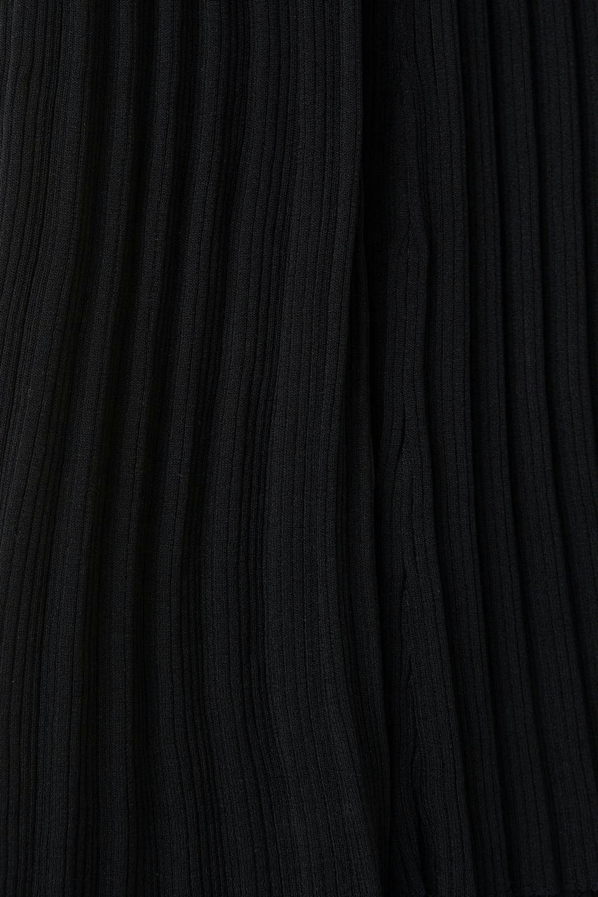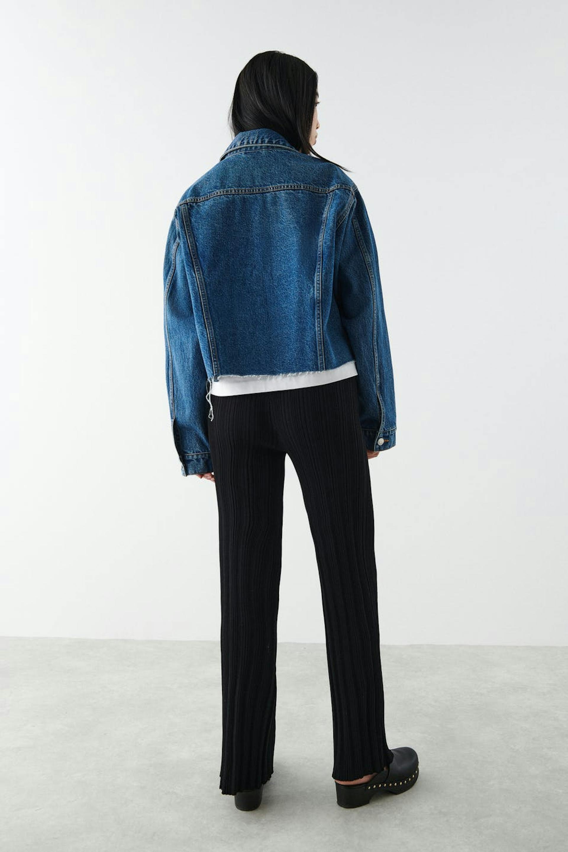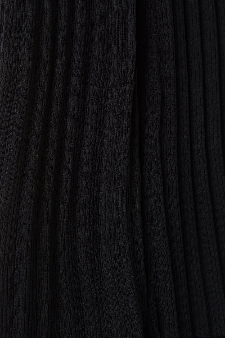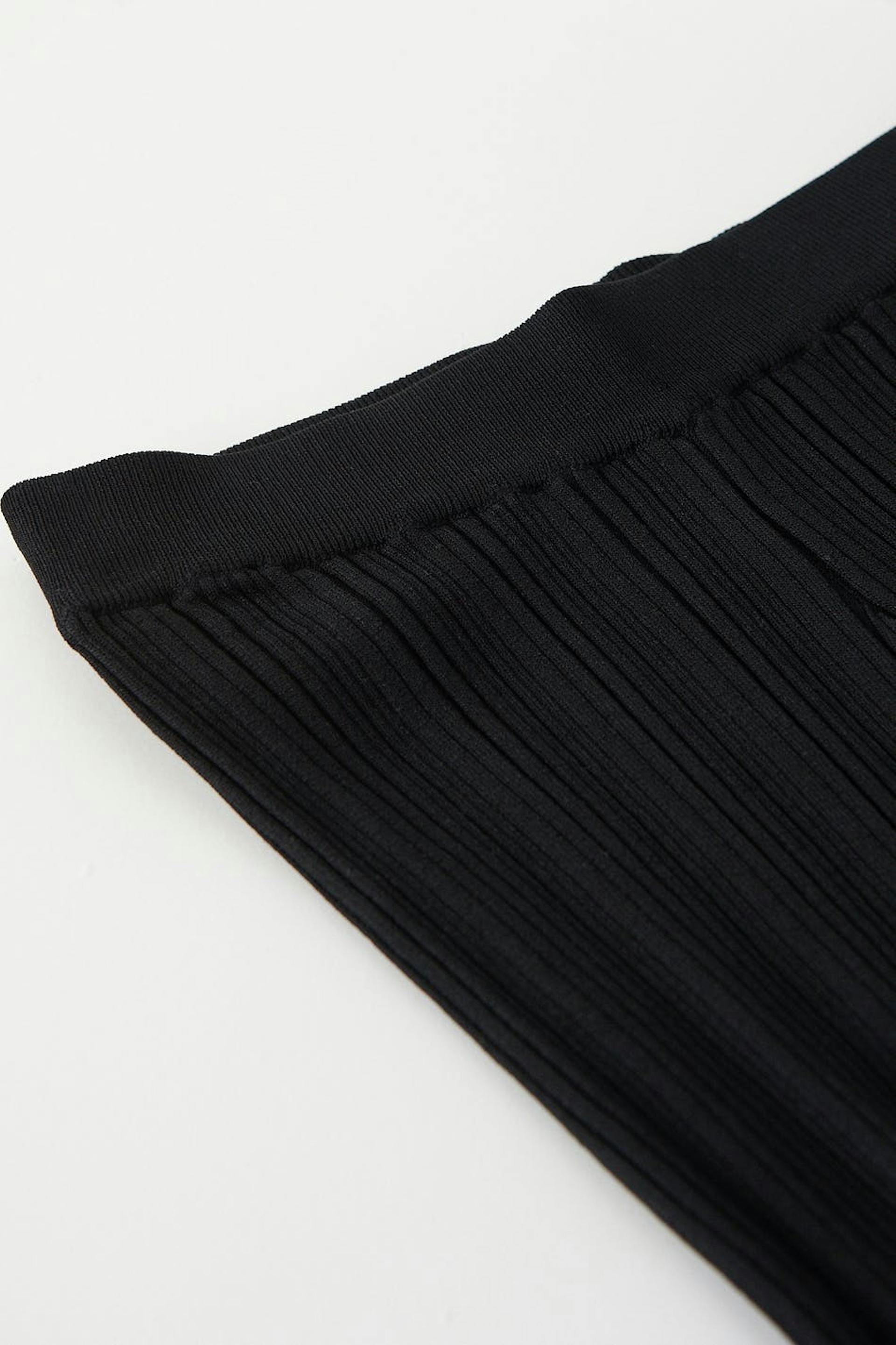 Ribbed trousers with elastic at the waist. The trousers are black and have straight legs with slightly flared leg ends.