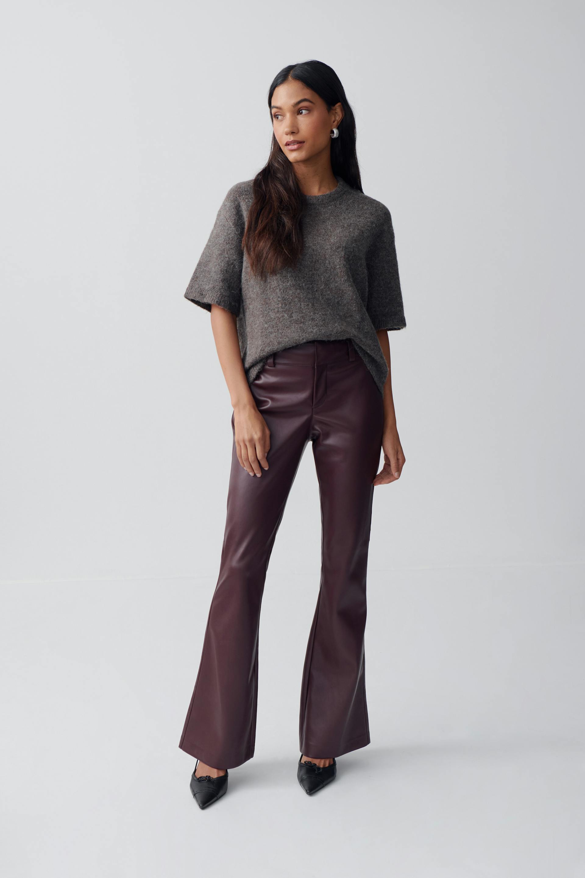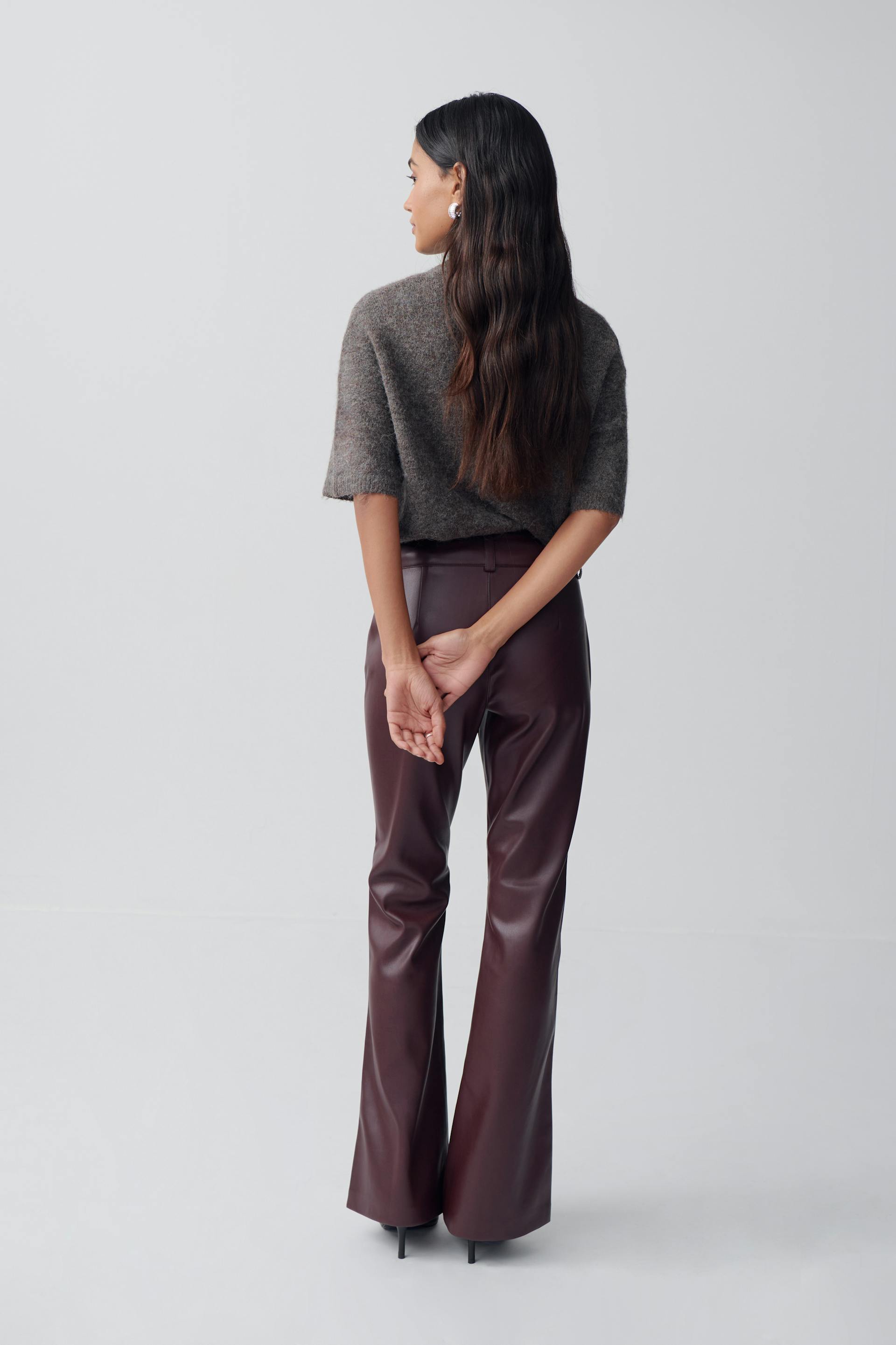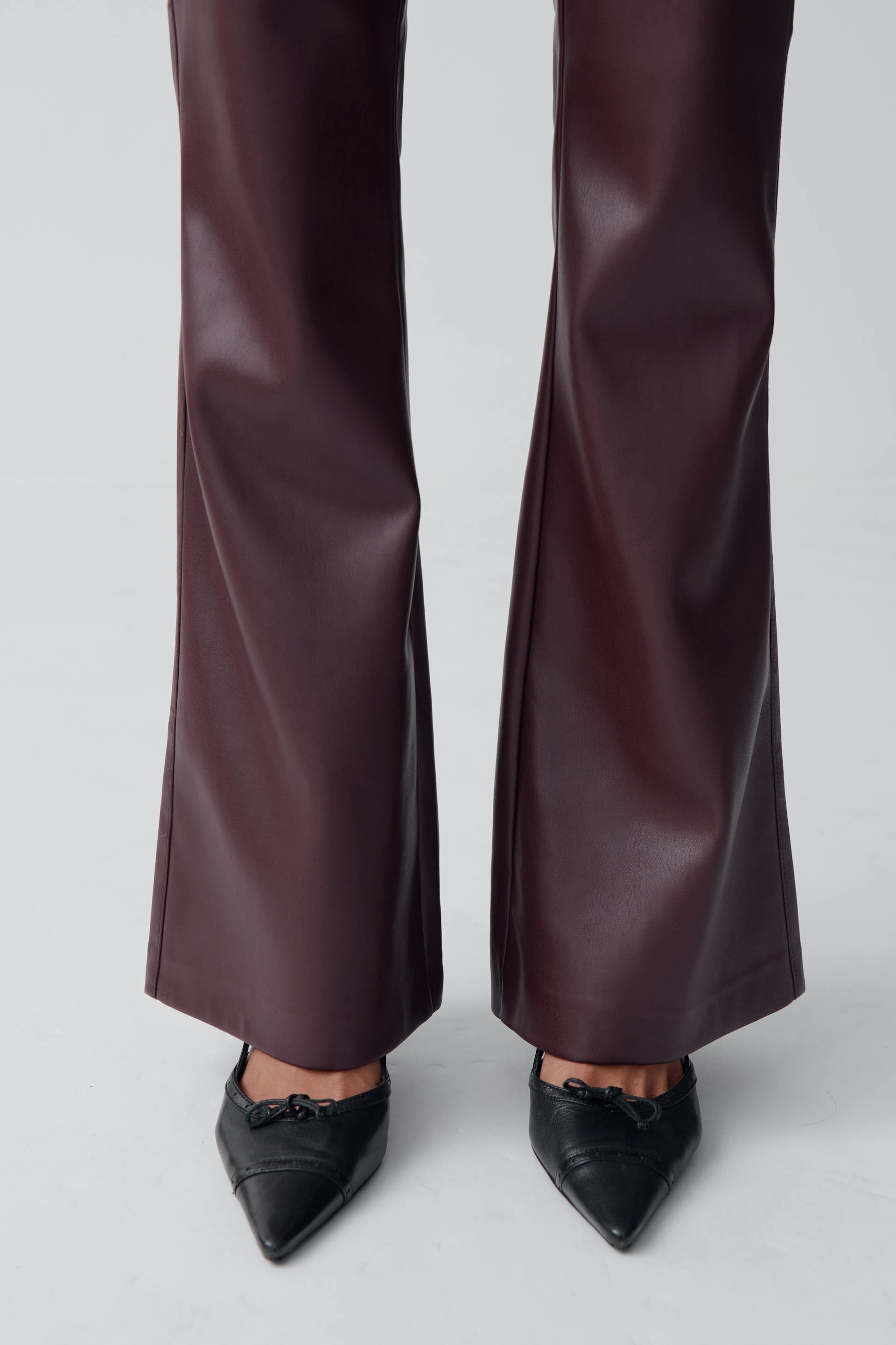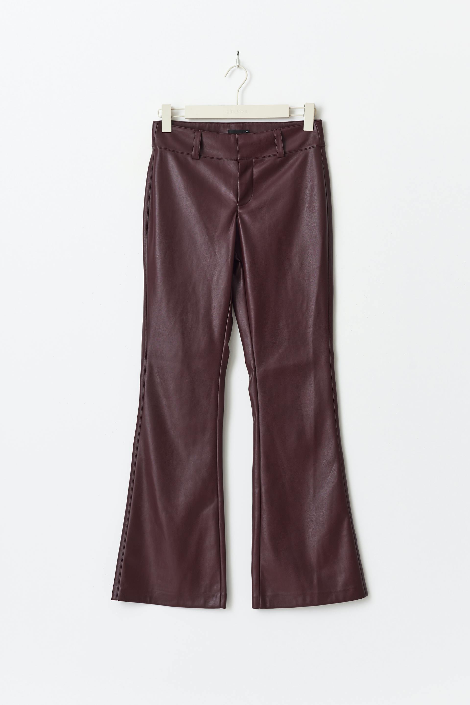 Flared leather trousers in imitation leather with figure-hugging fit. The trousers are wine and have mid waist. They have zip fly and belt loops.