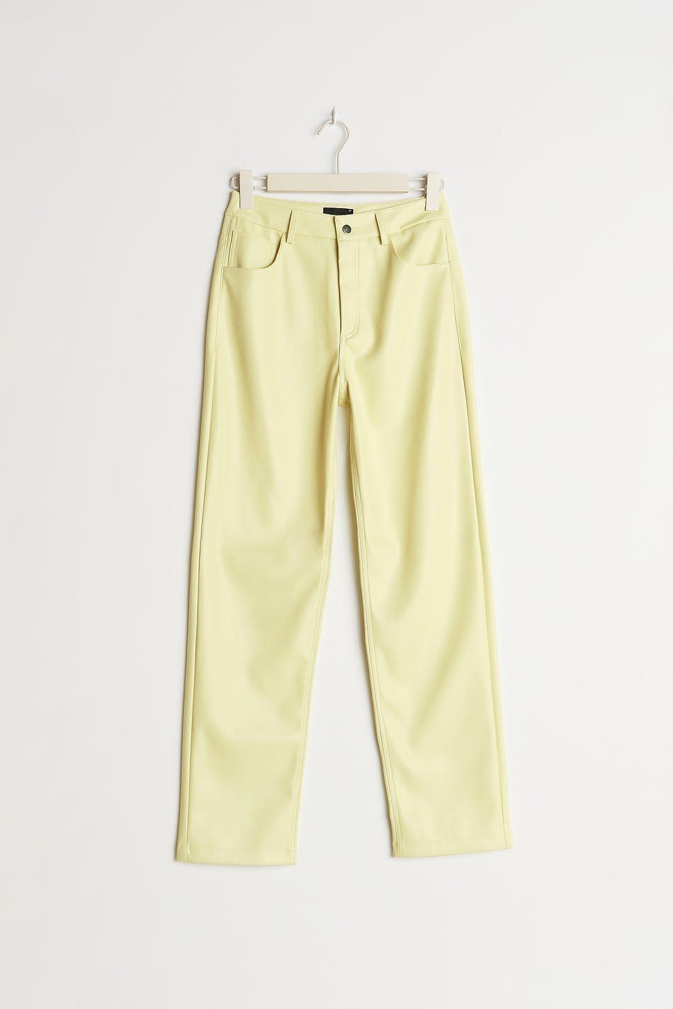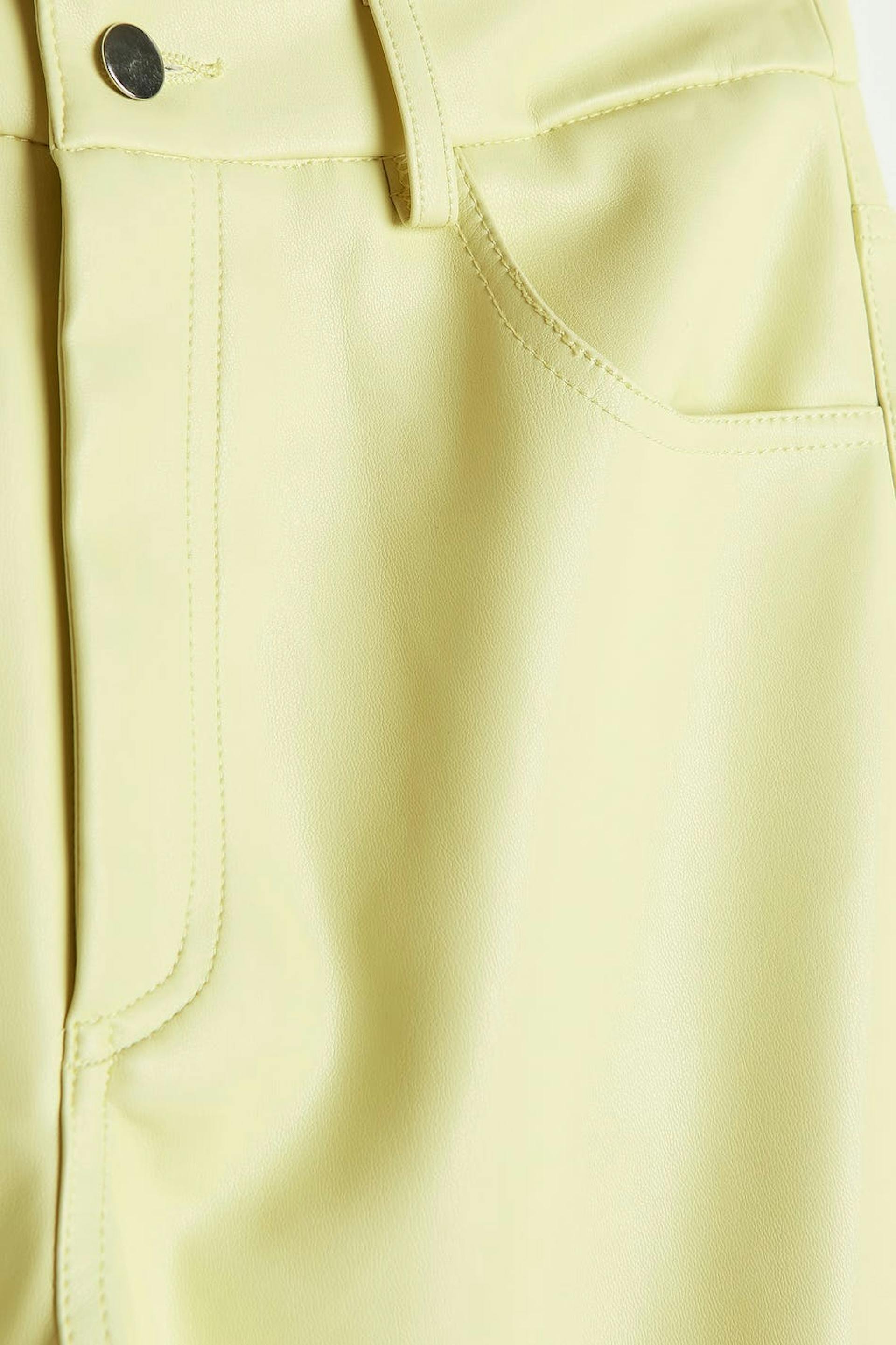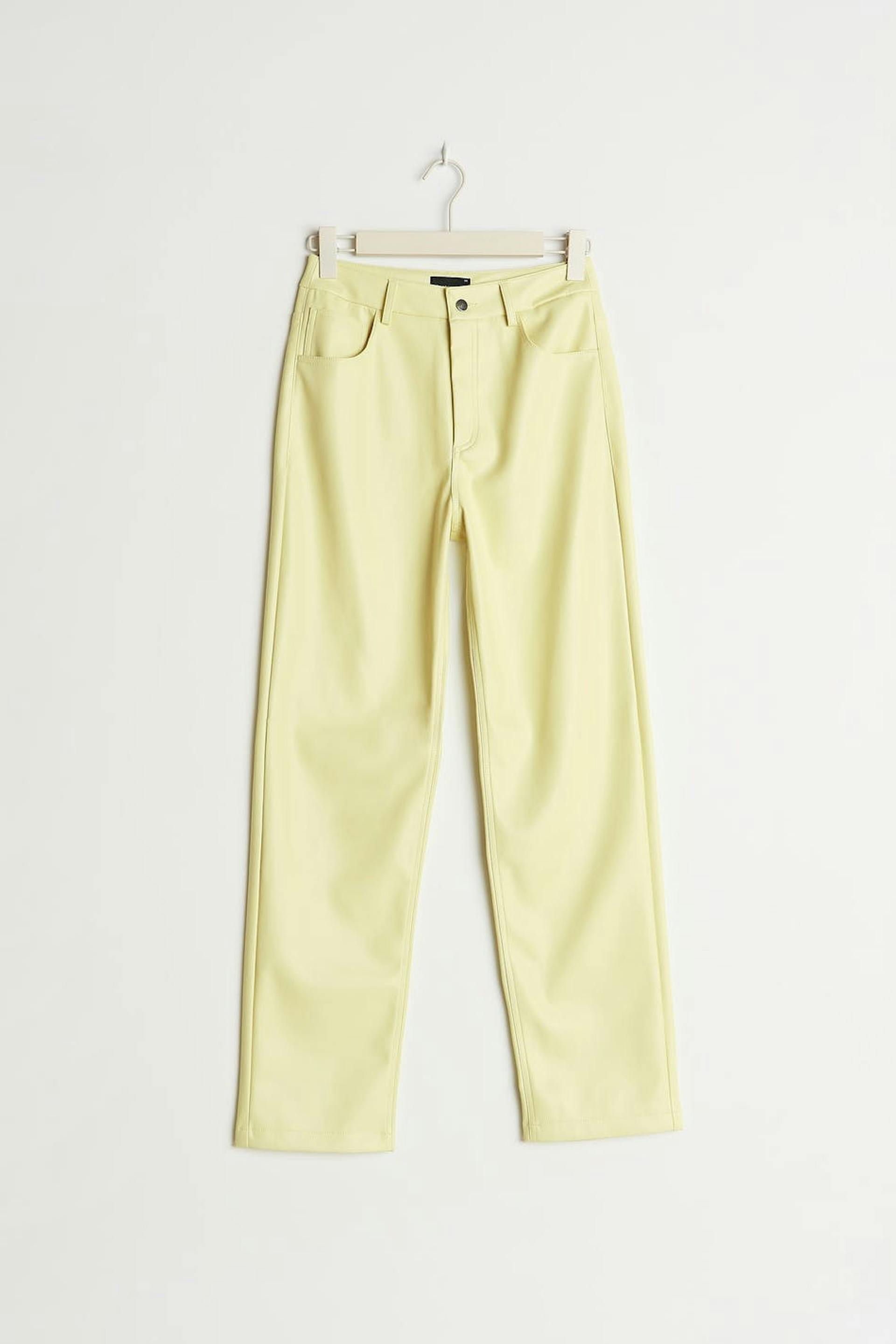 90s inspired trousers with a faux-leather material. The trousers are yellow and have pockets at the front and back. They have straight trouser legs with a full length.