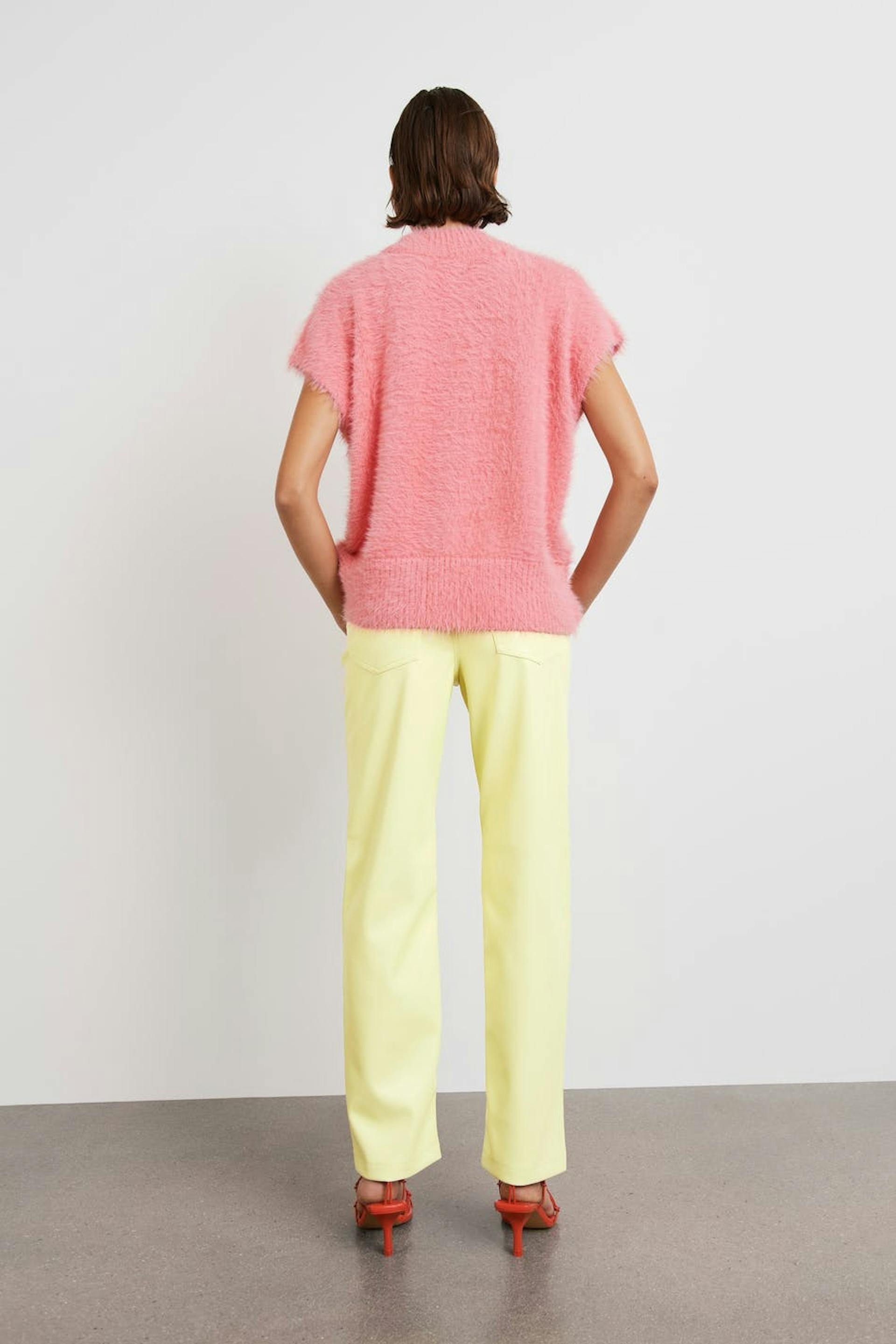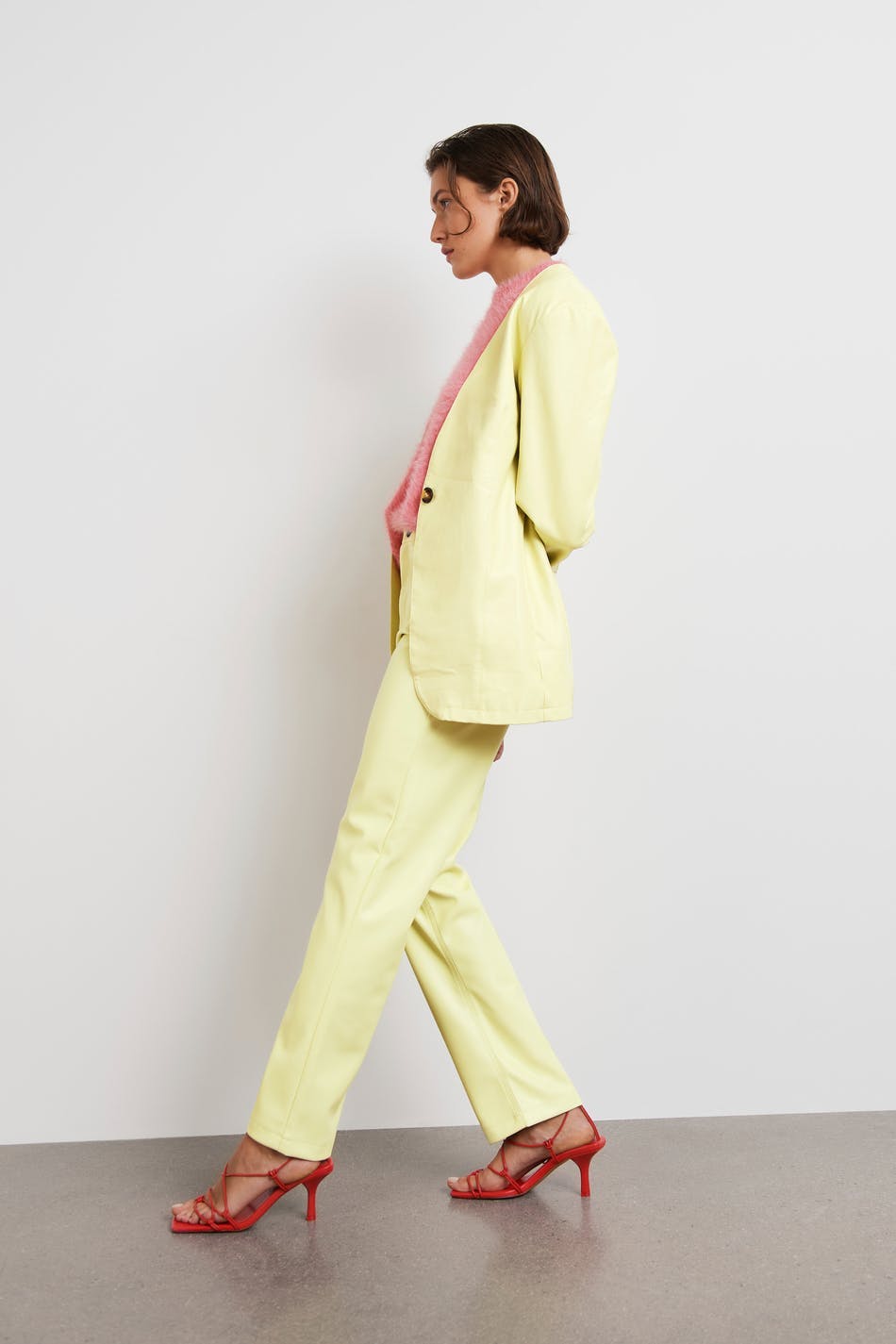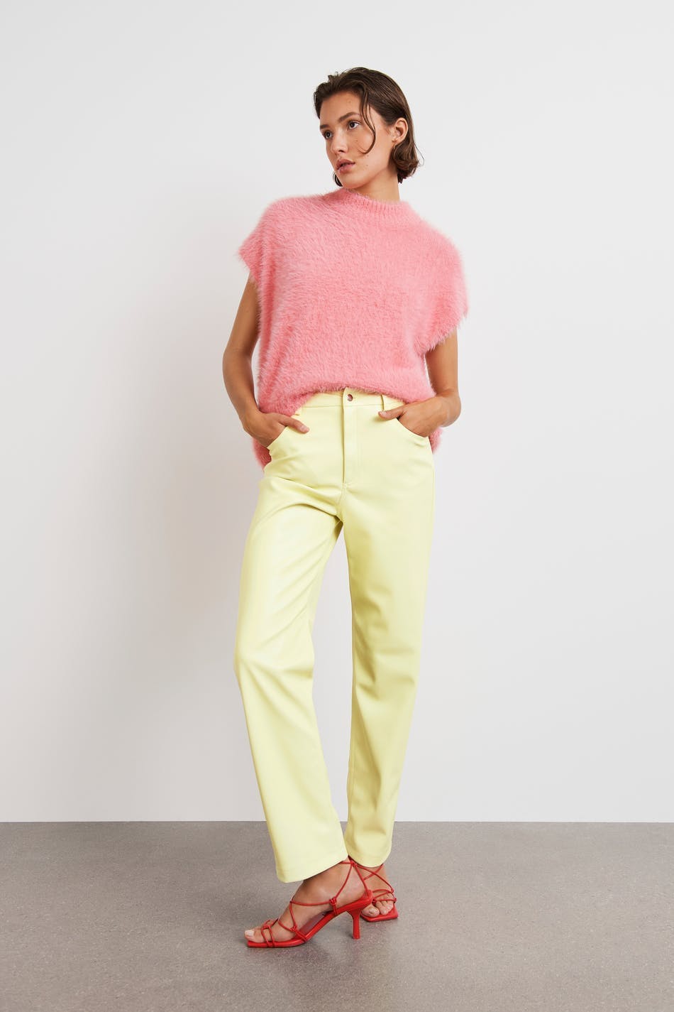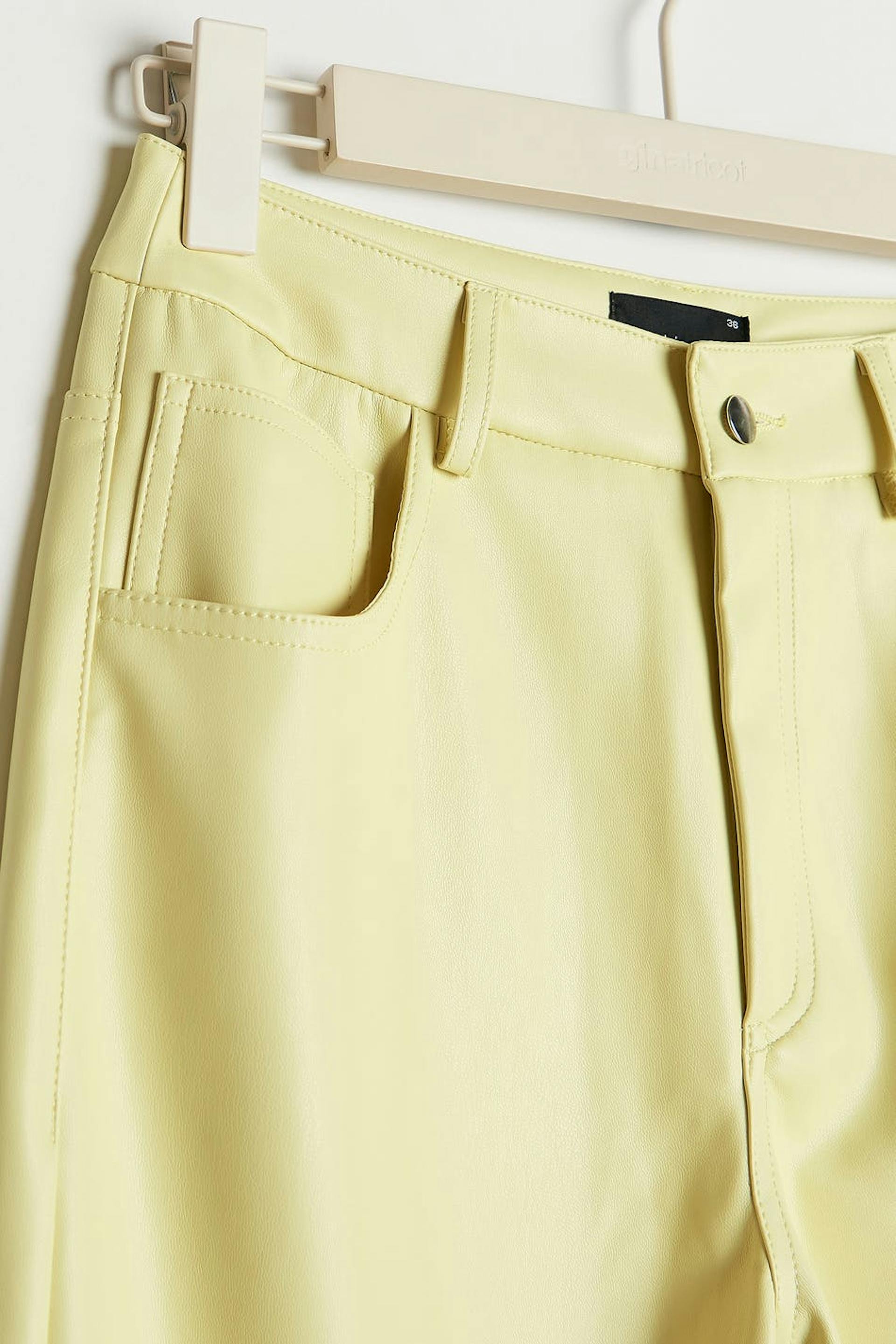 90s inspired trousers with a faux-leather material. The trousers are yellow and have pockets at the front and back. They have straight trouser legs with a full length.
