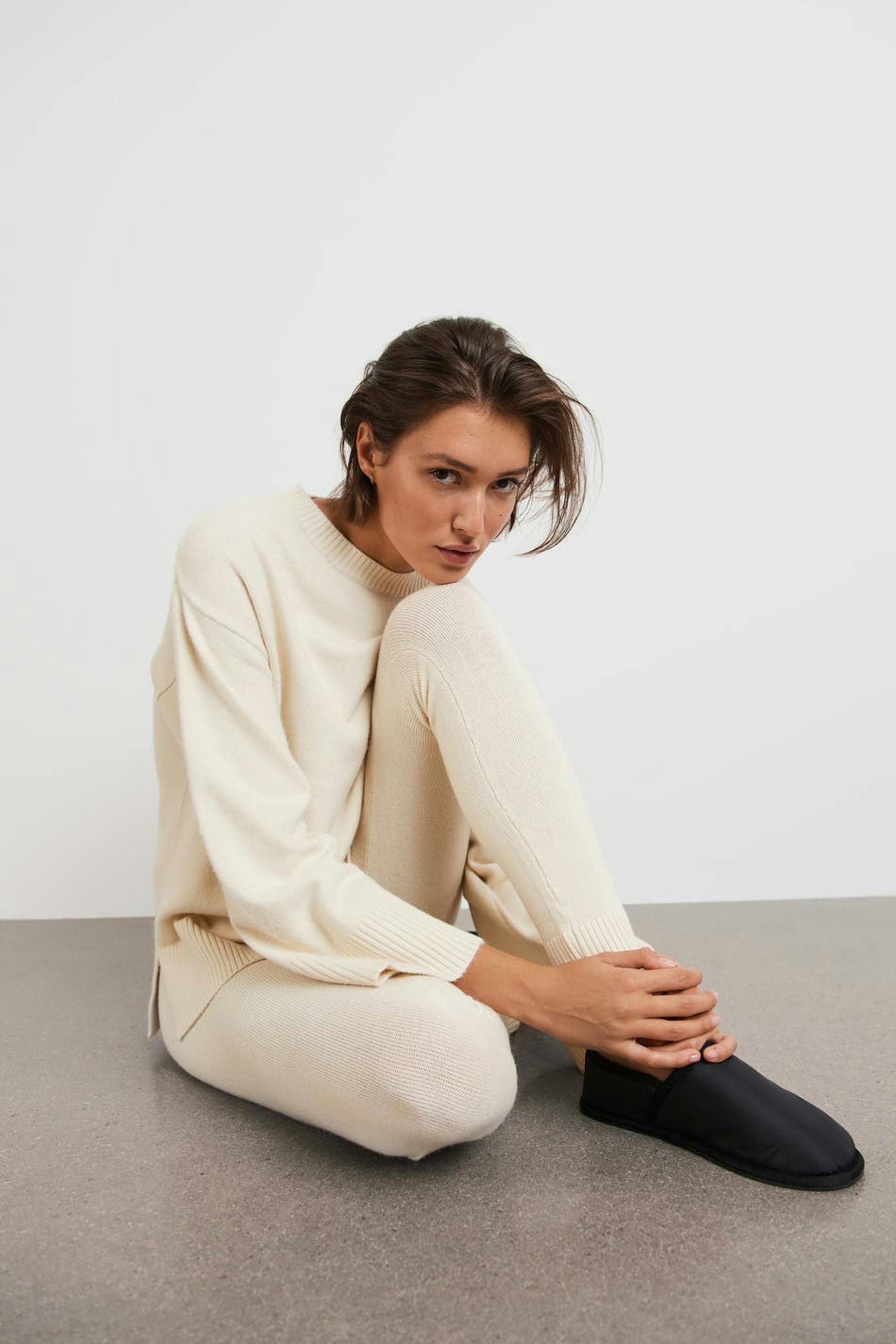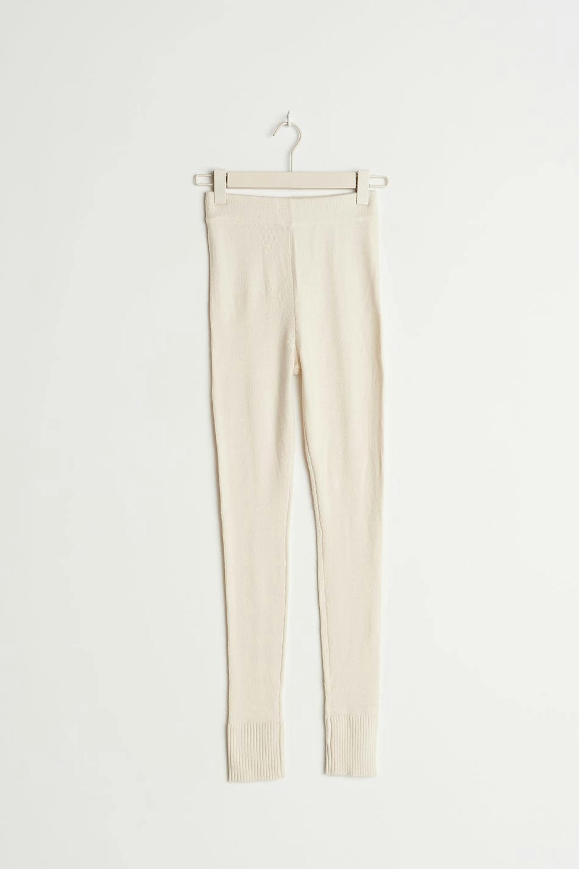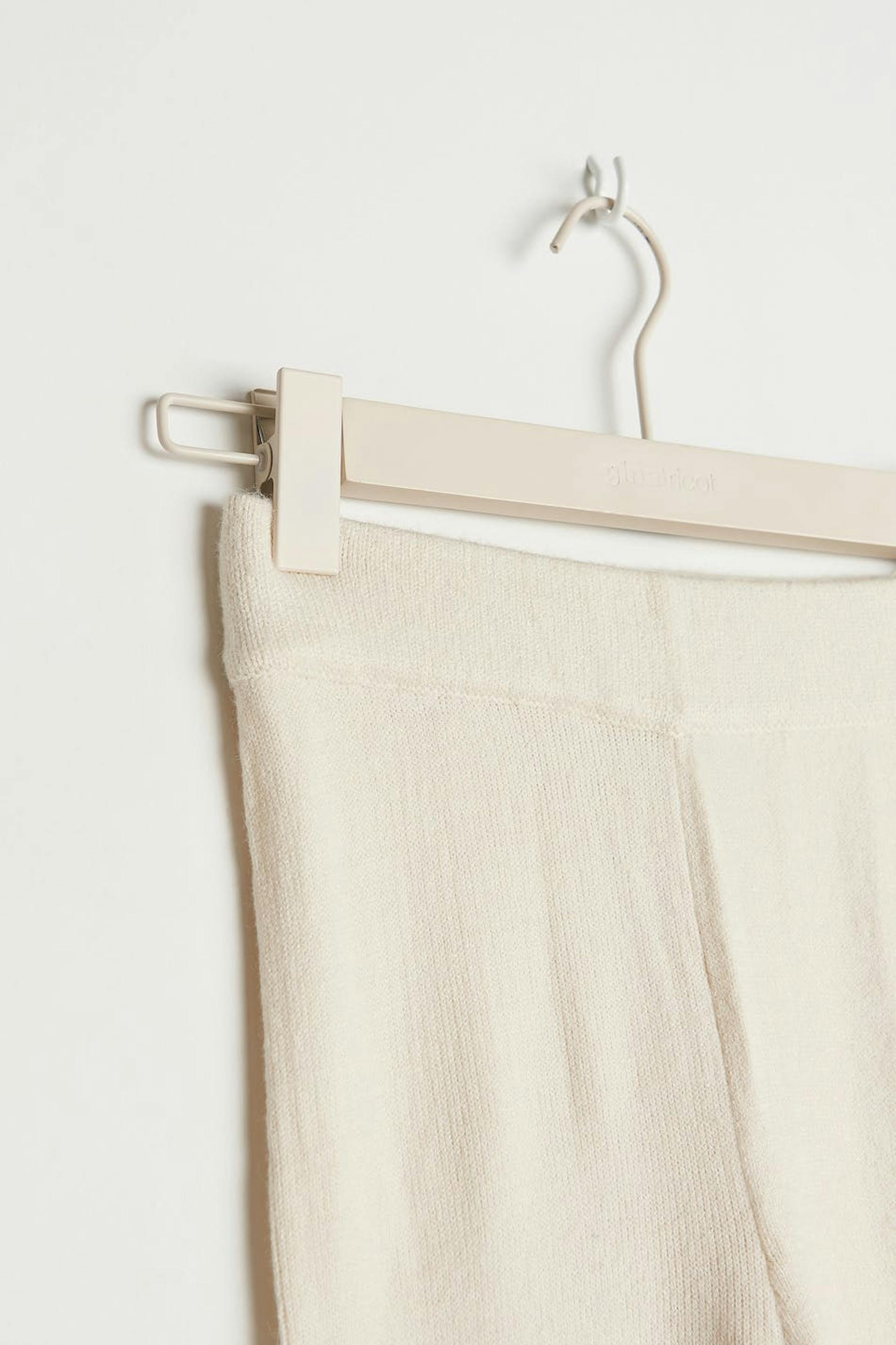 Soft knit trousers with a fitted fit. The trousers are white and have a ribbed hem.
