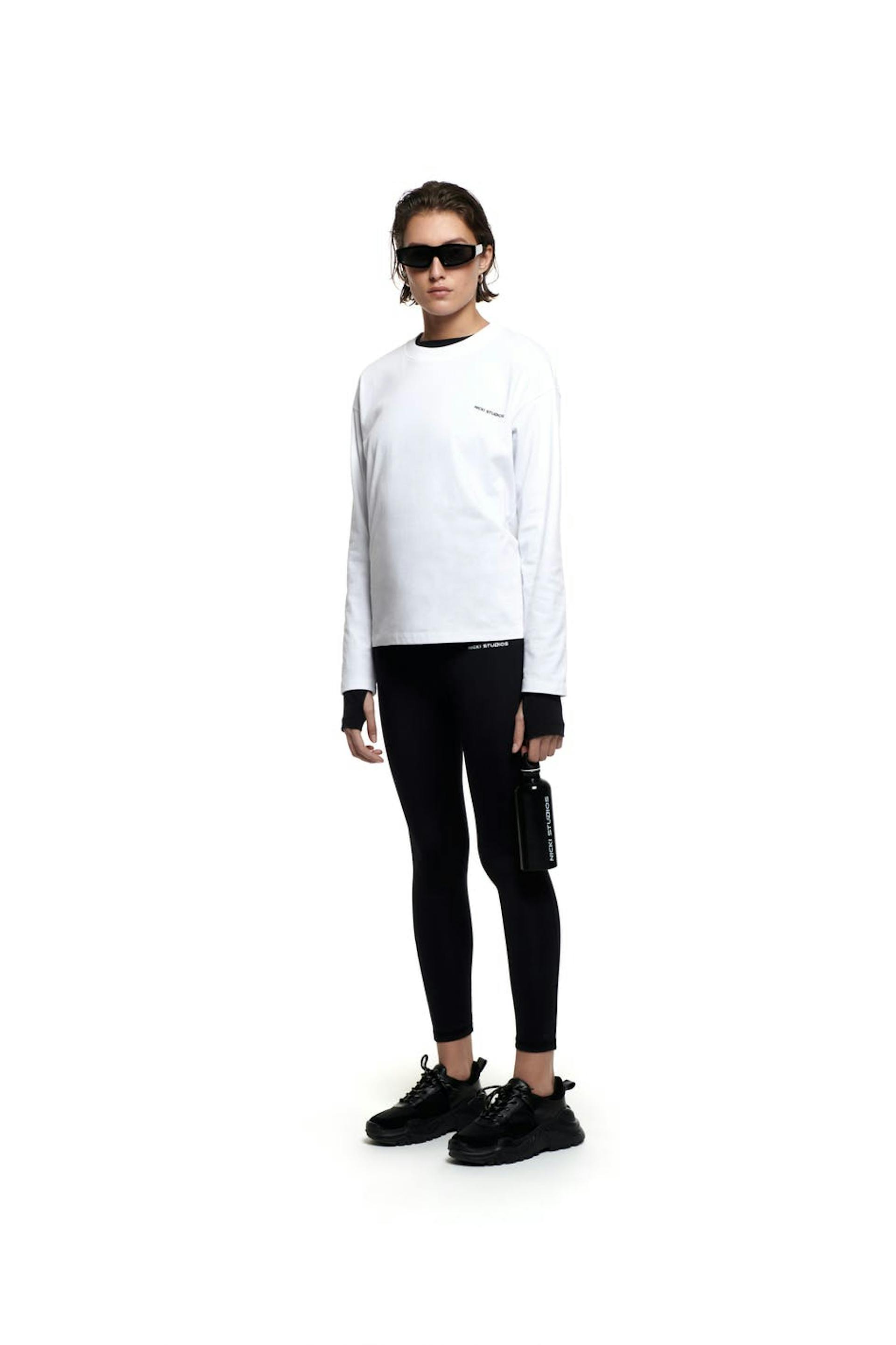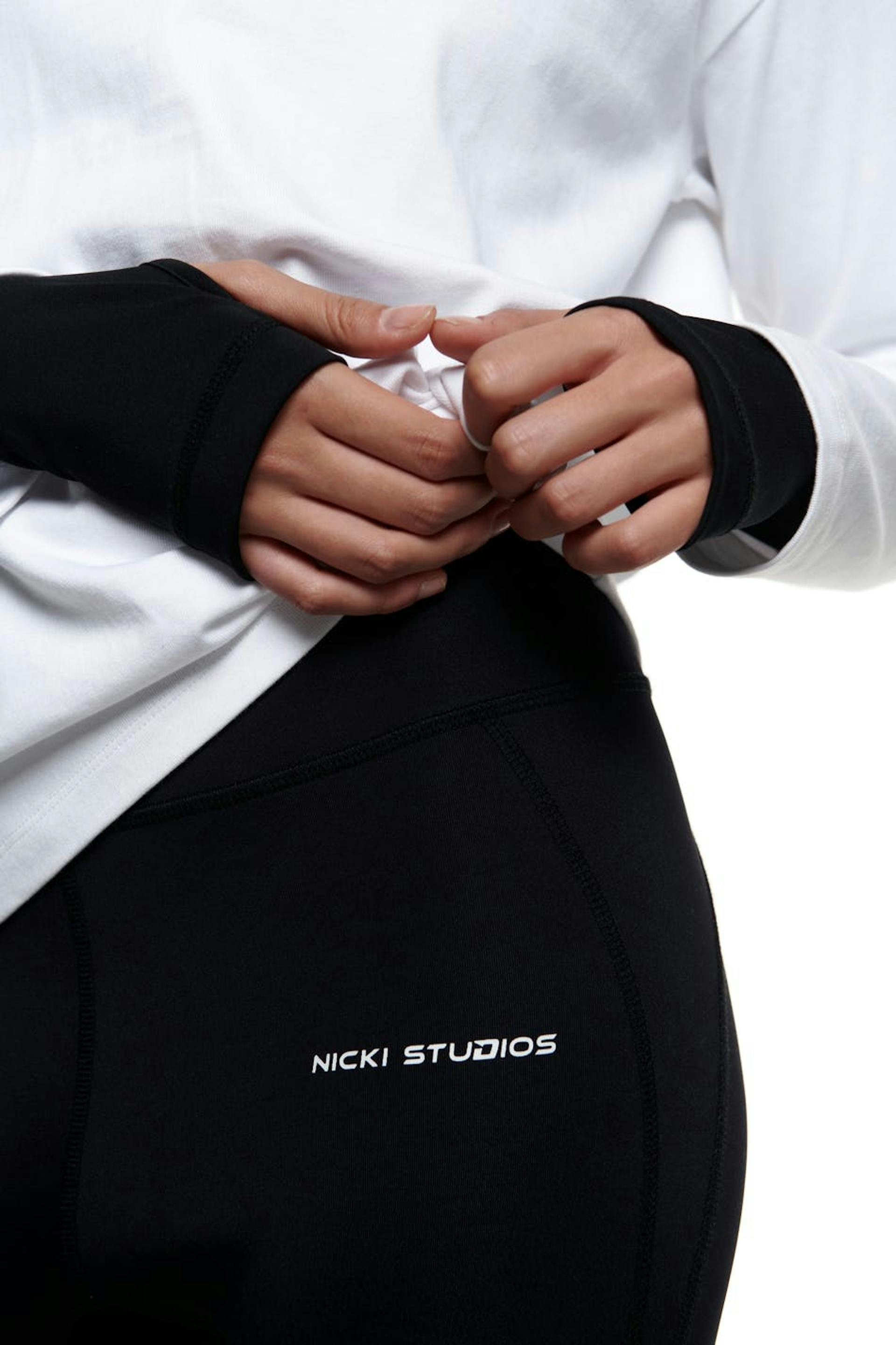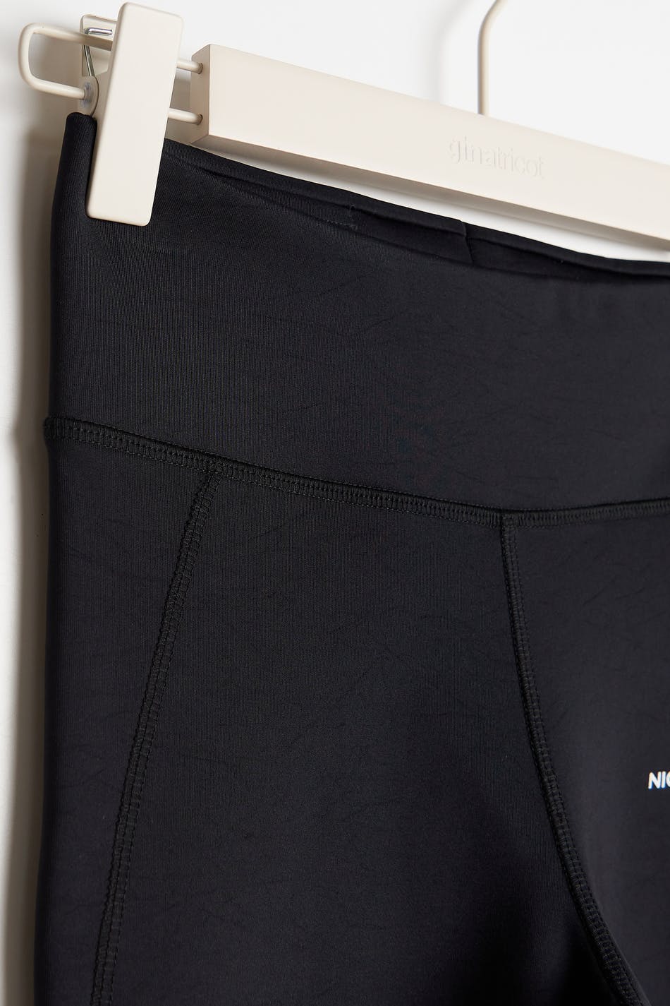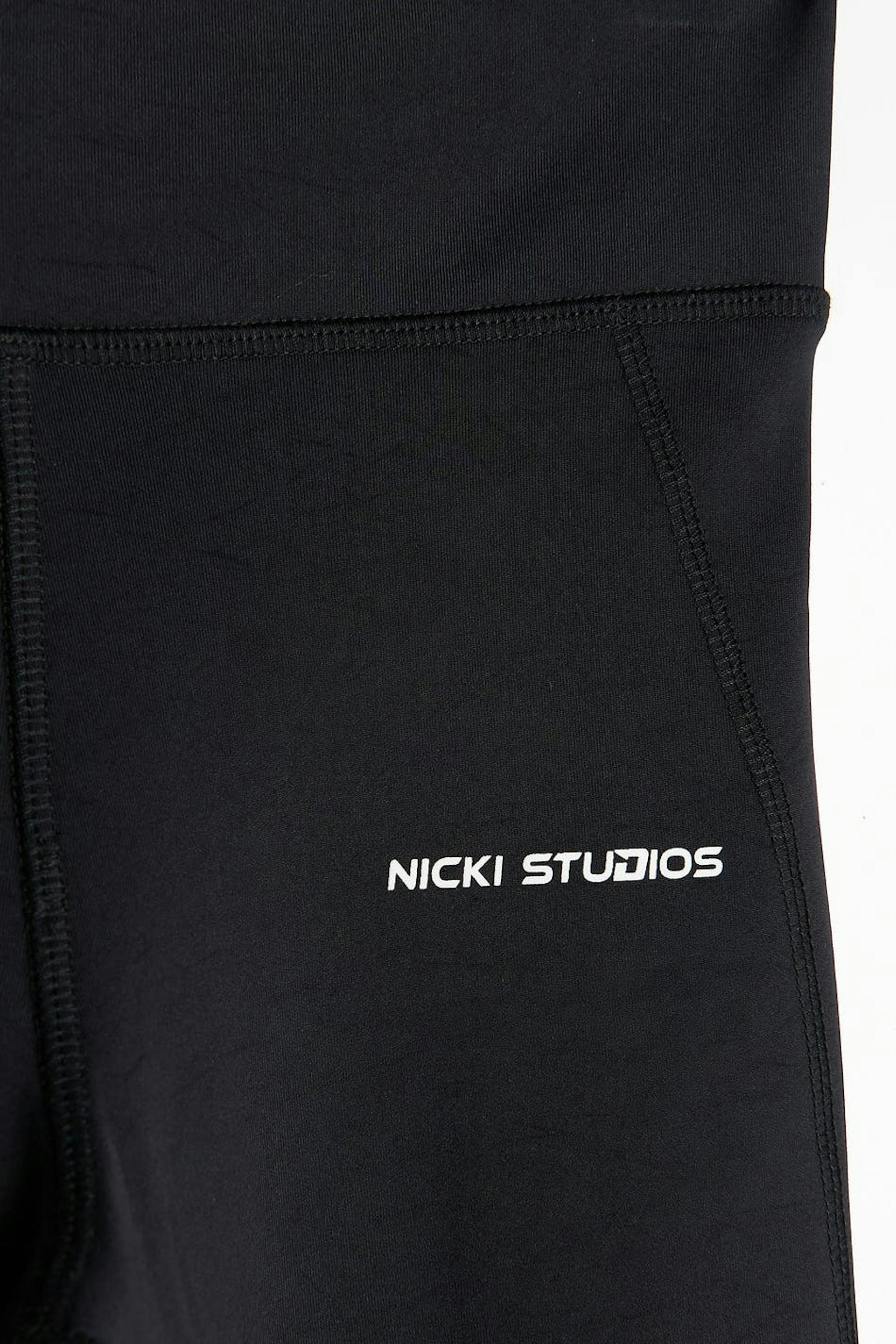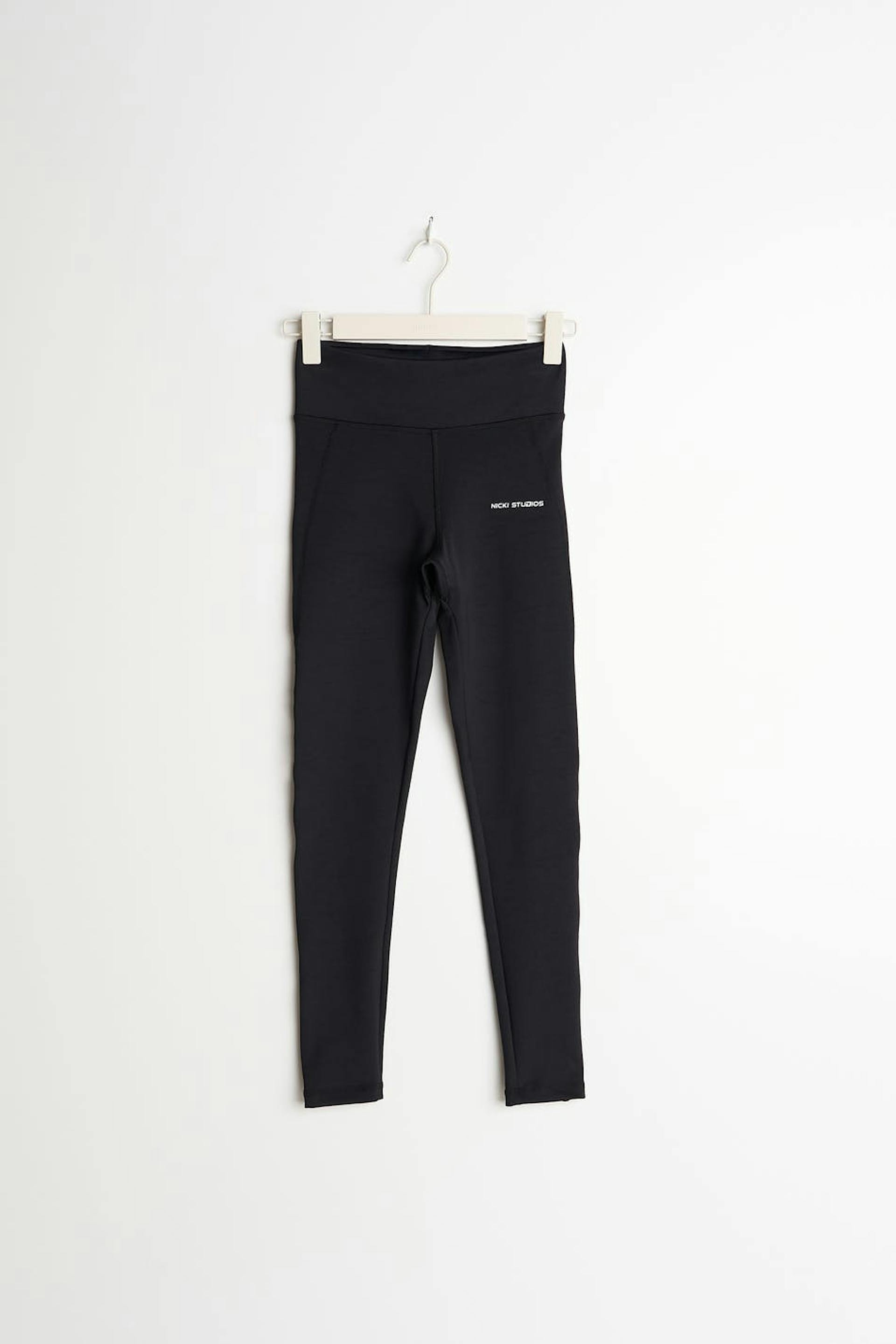 Nicki Studios X Gina Tricot. Workout leggings with a fitted fit. The leggings are black and have a logo print at the front. They have a high waistband with a hidden pocket.