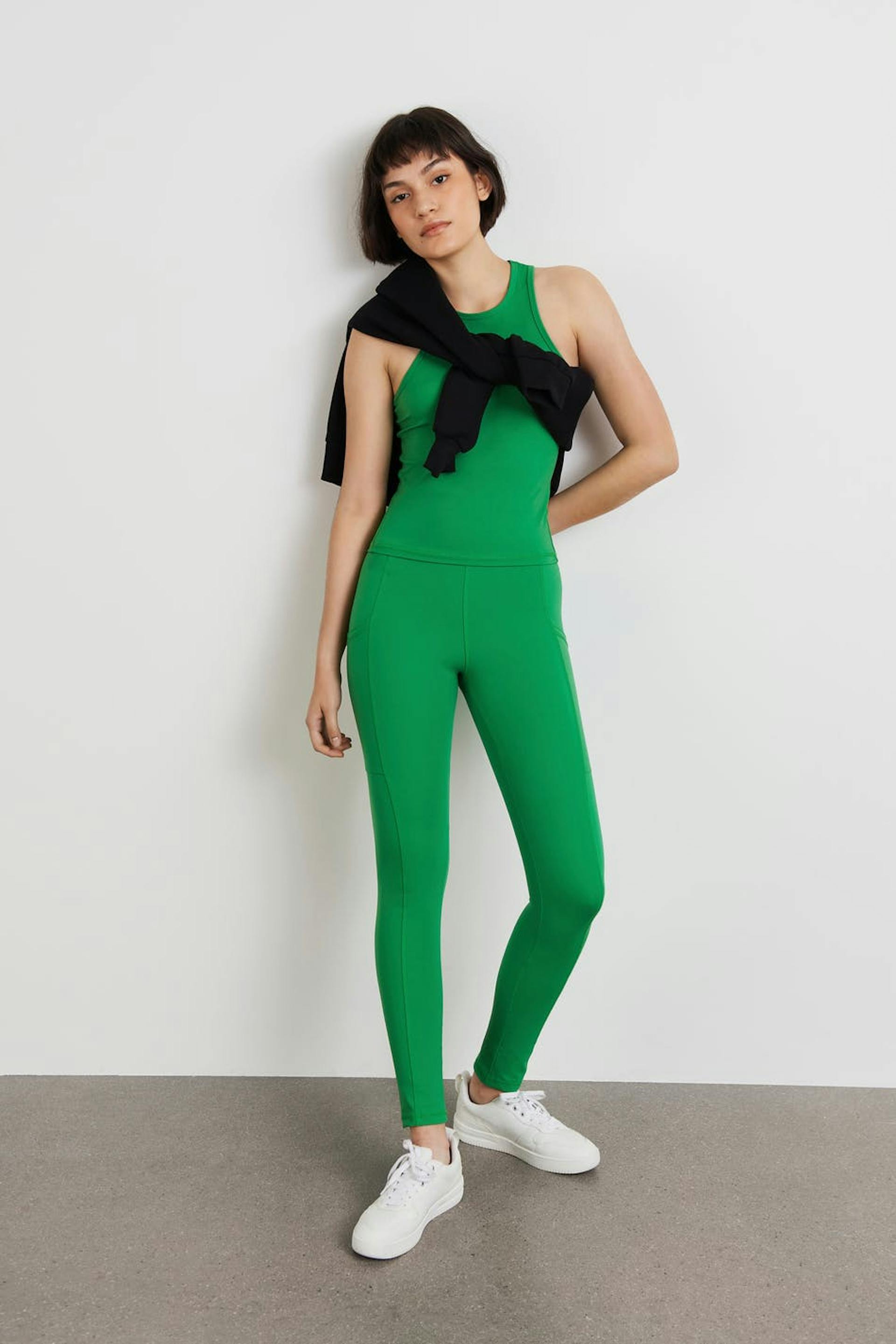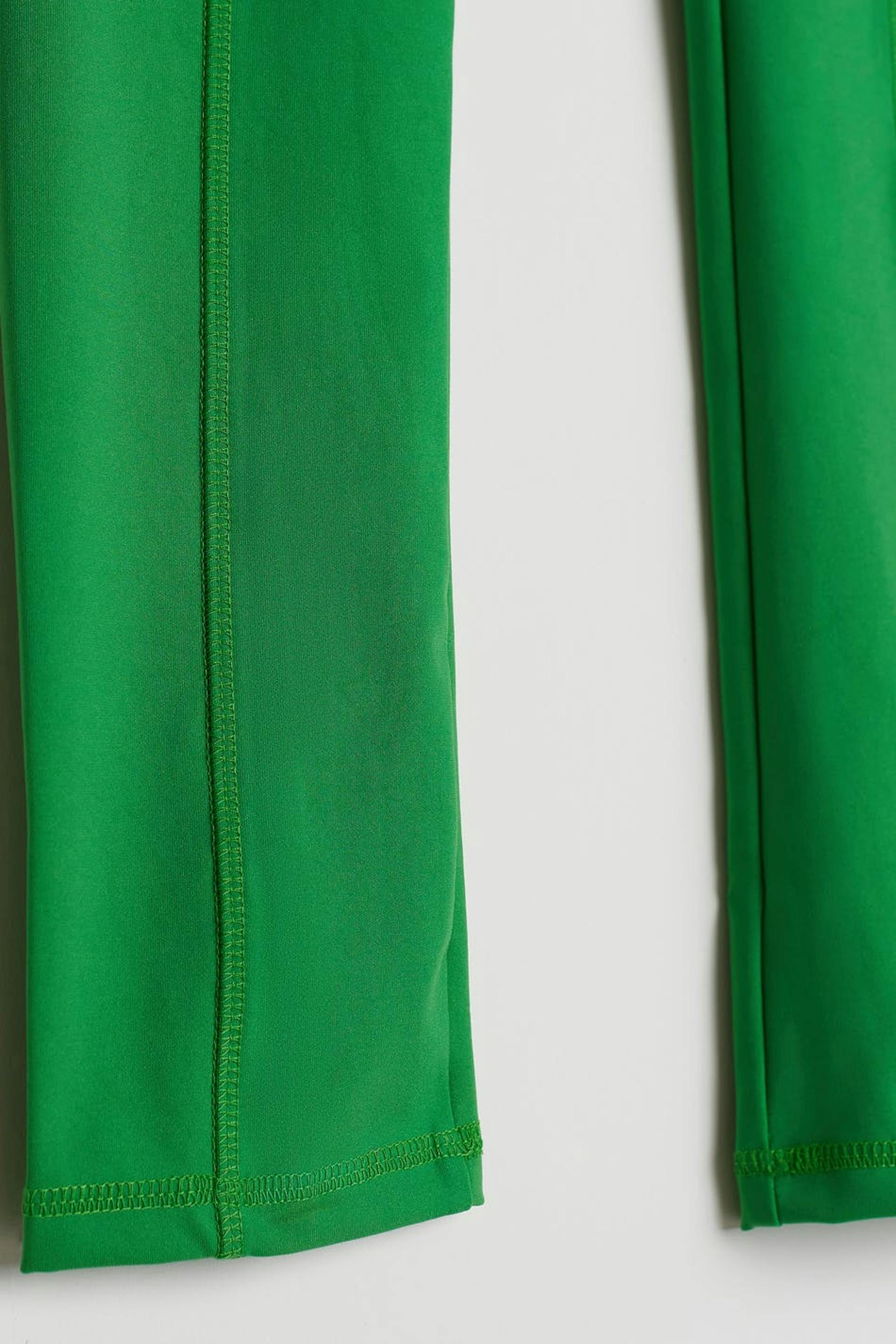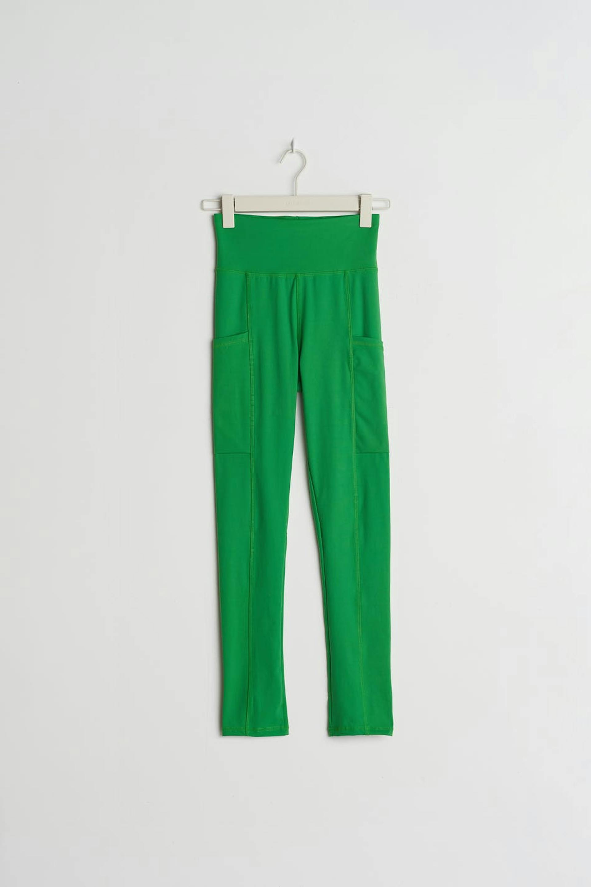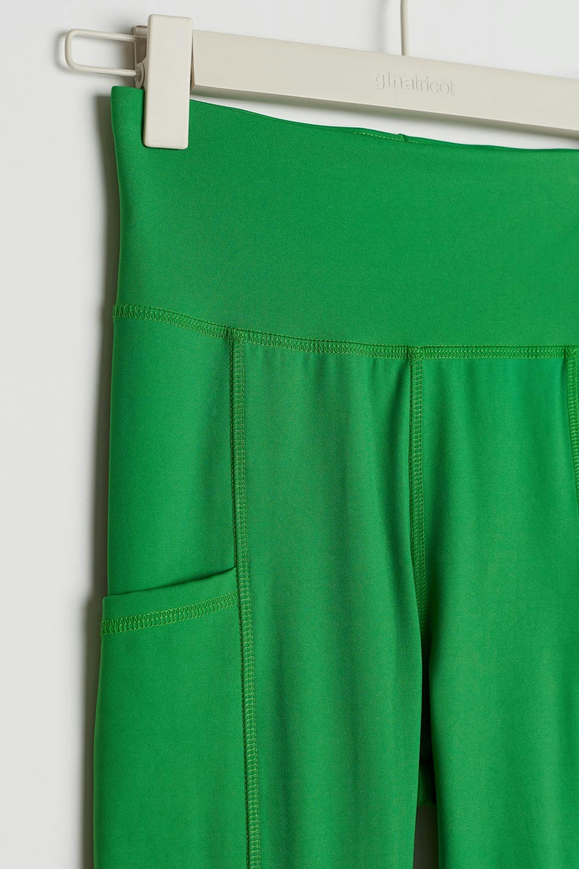 RS X Gina Tricot. Stretchy workout leggings with a fitted fit. The leggings are green and have a soft quality. They have an elastic at the waist and pockets on the sides.