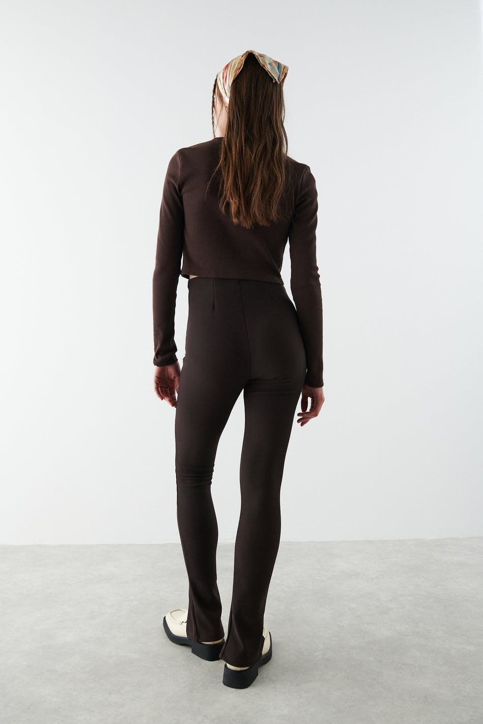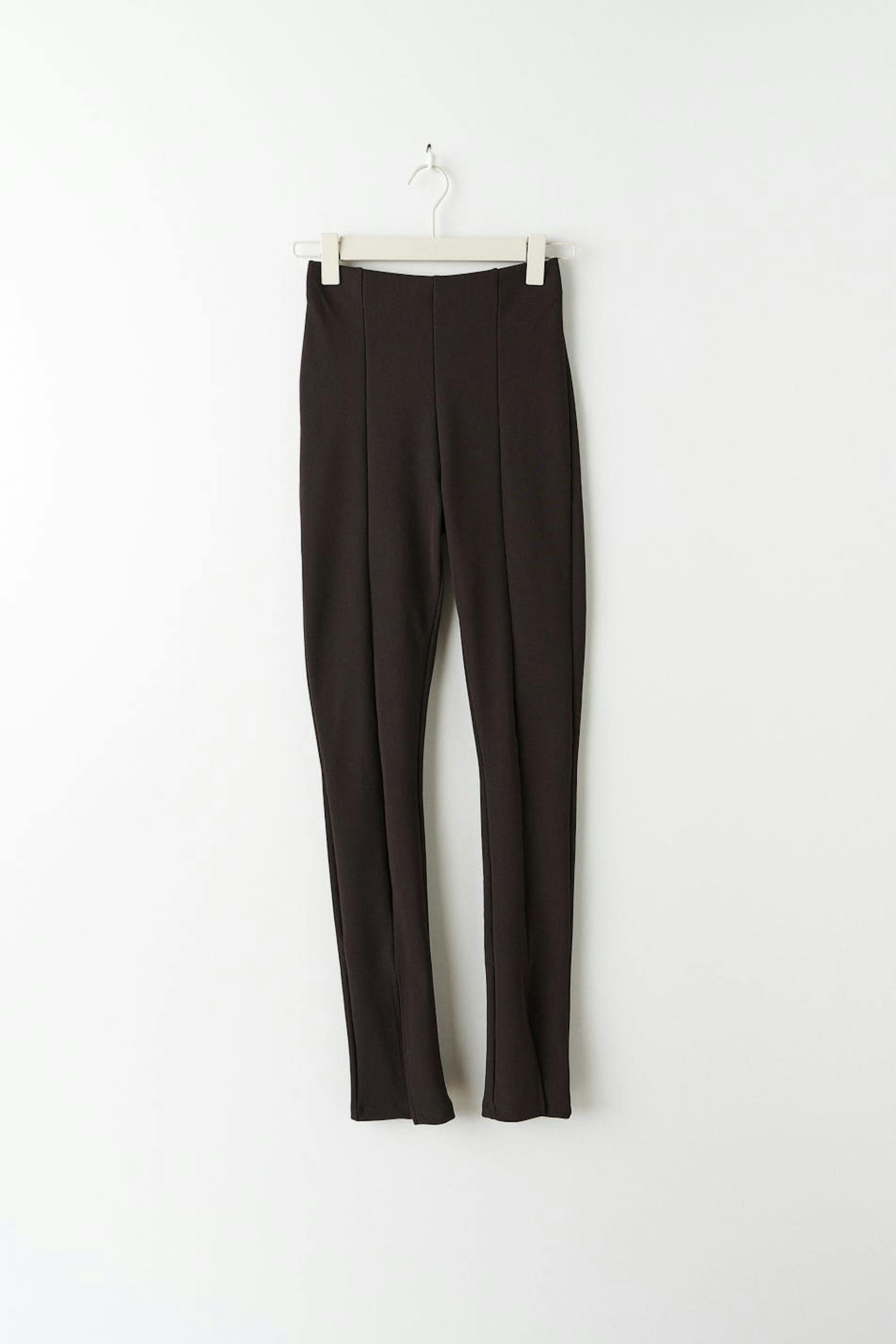 Leggings with slit. The leggings are brown and have a treaded fabric in jersey. They have an elastic at the waist and a fitted fit.
