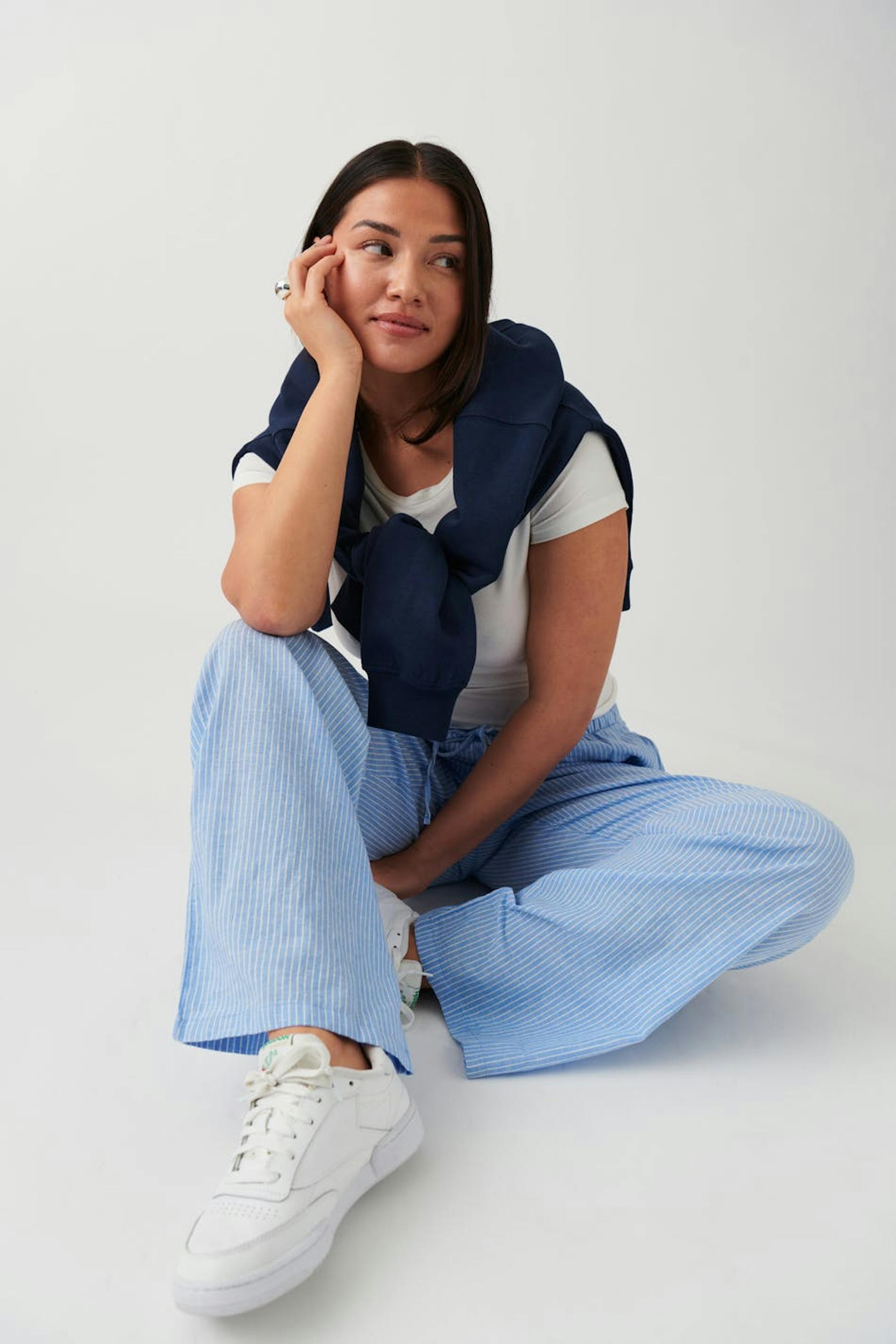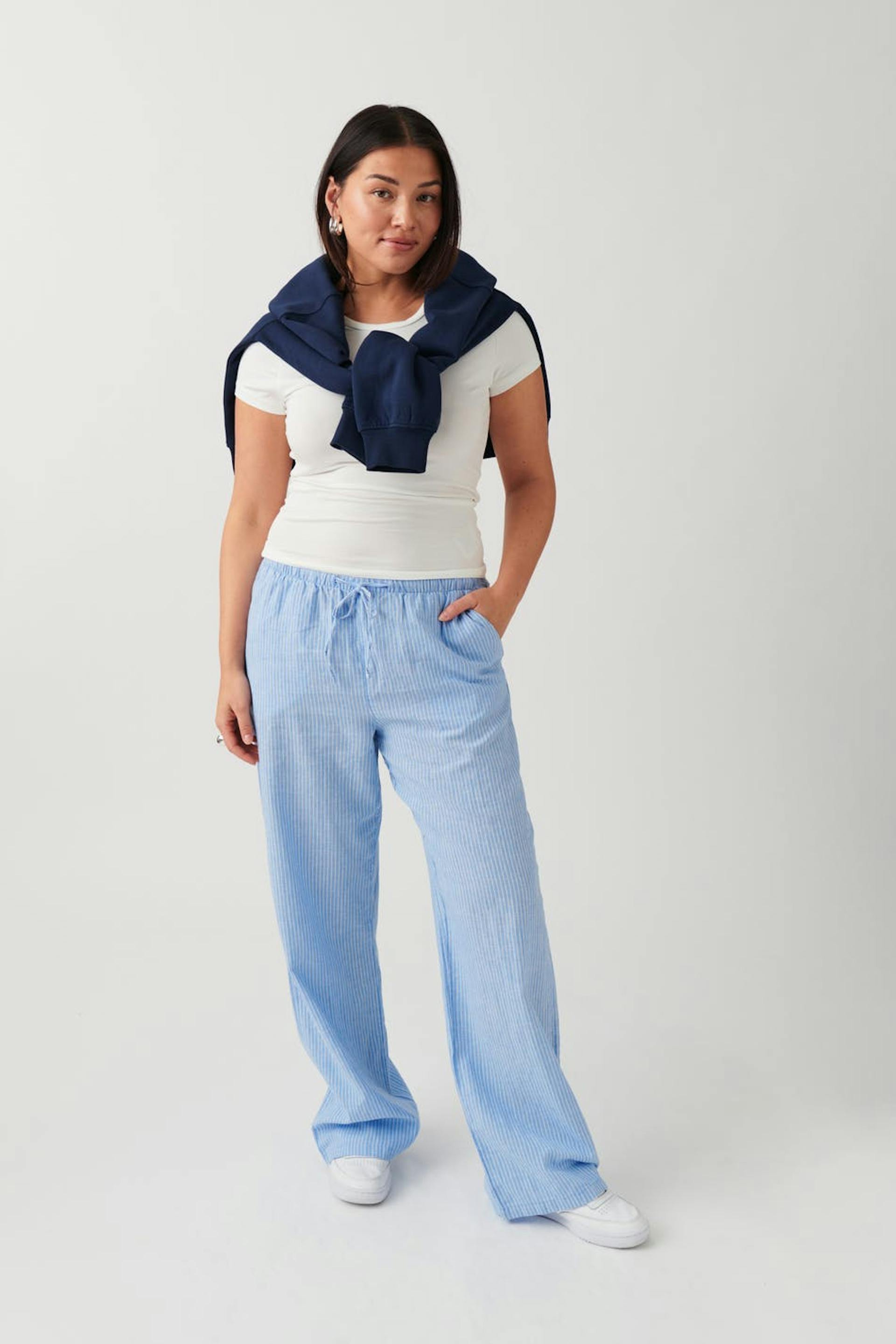 Striped linen trousers with wide legs. The linen trousers are blue and have mid waist. They have side pockets and elastic at the waist with self-tie drawstring at the front.
